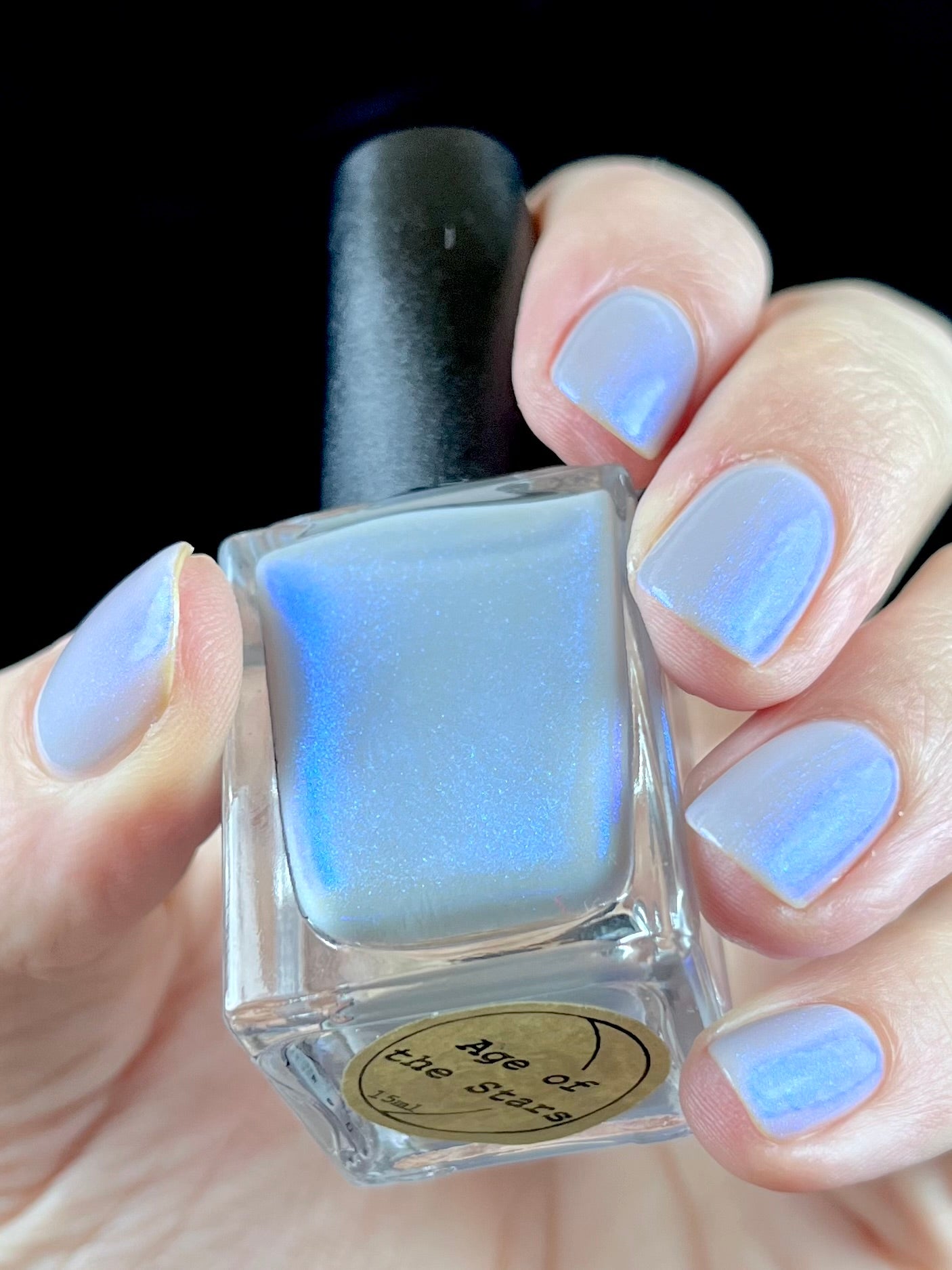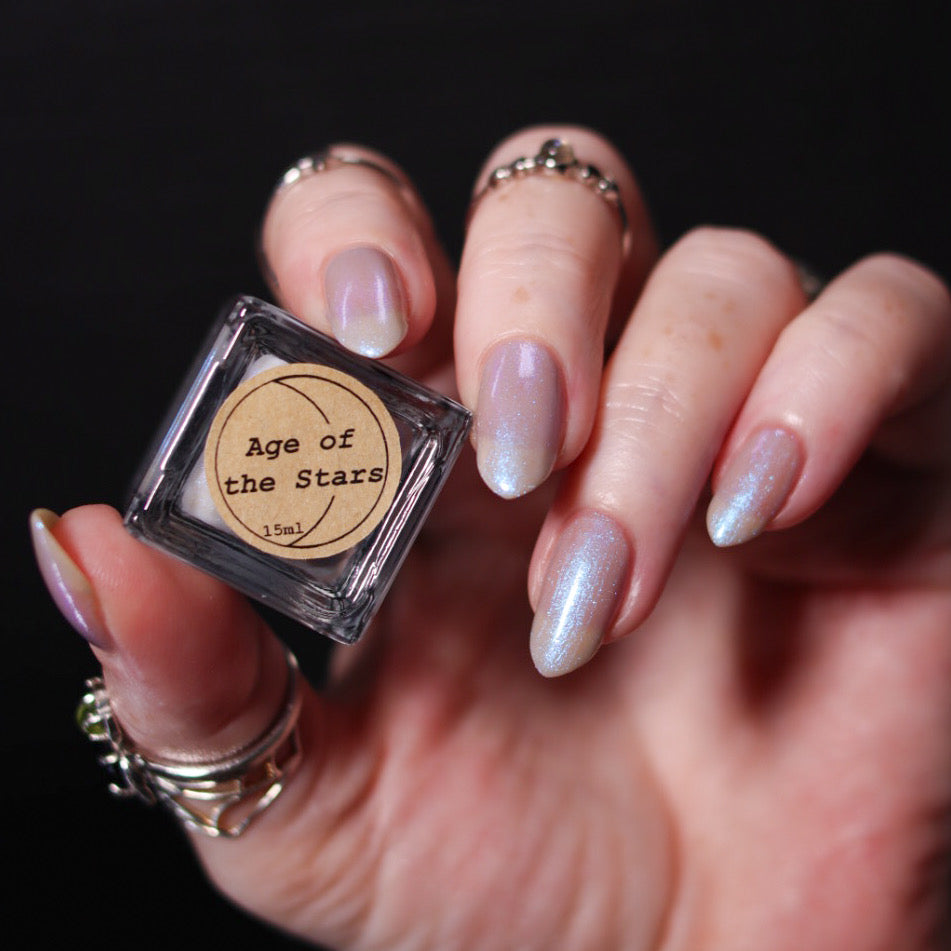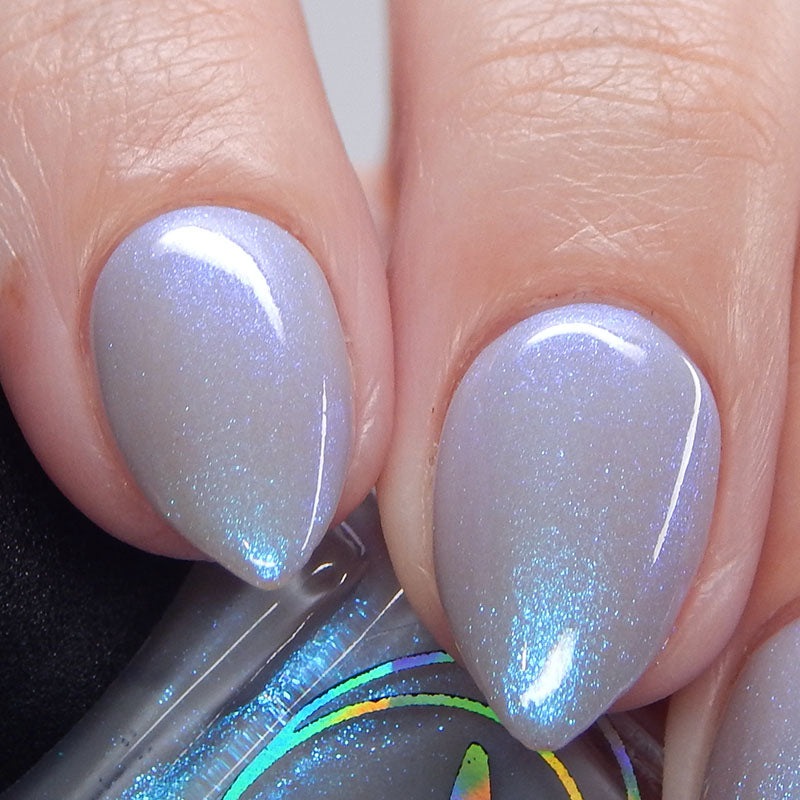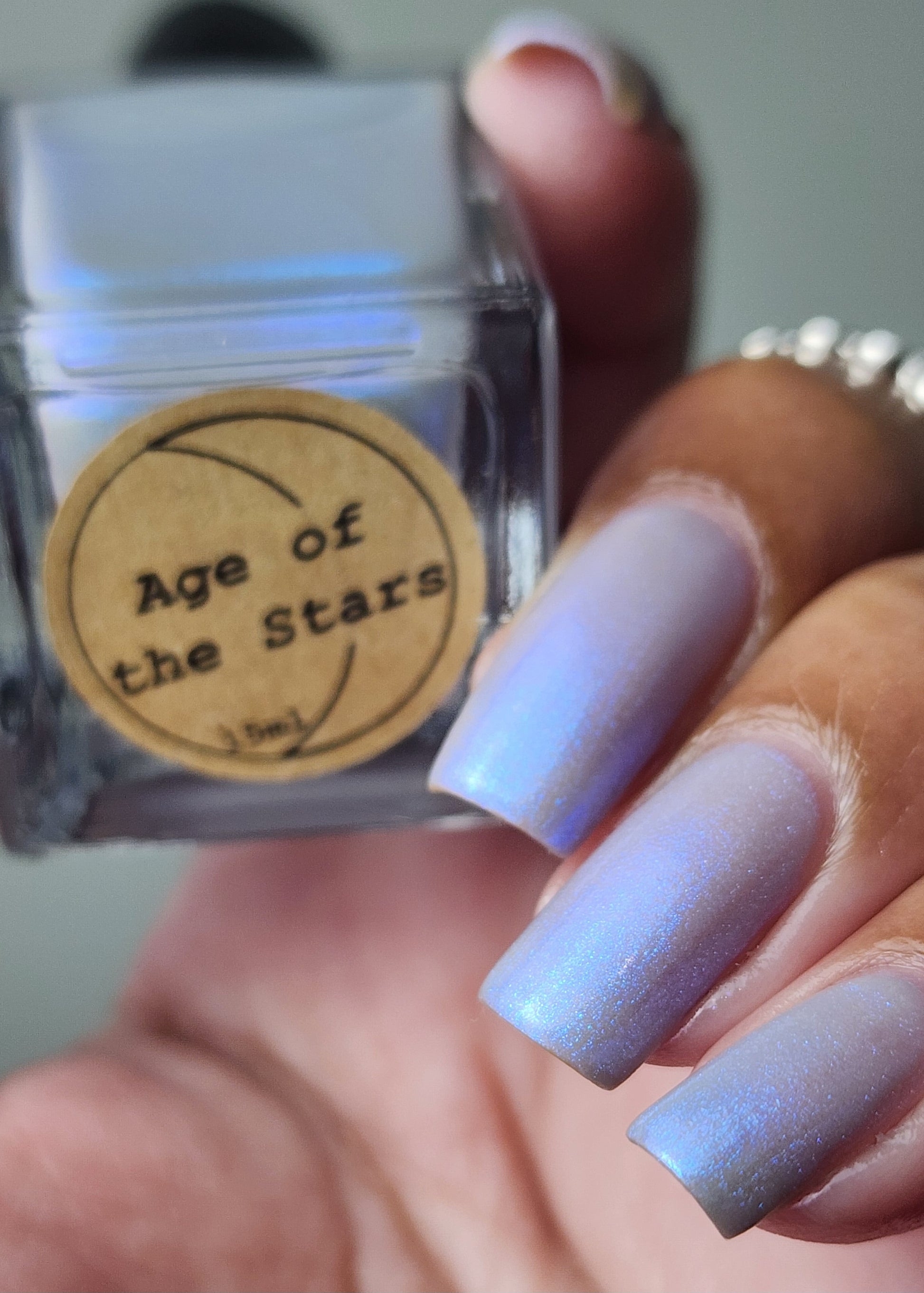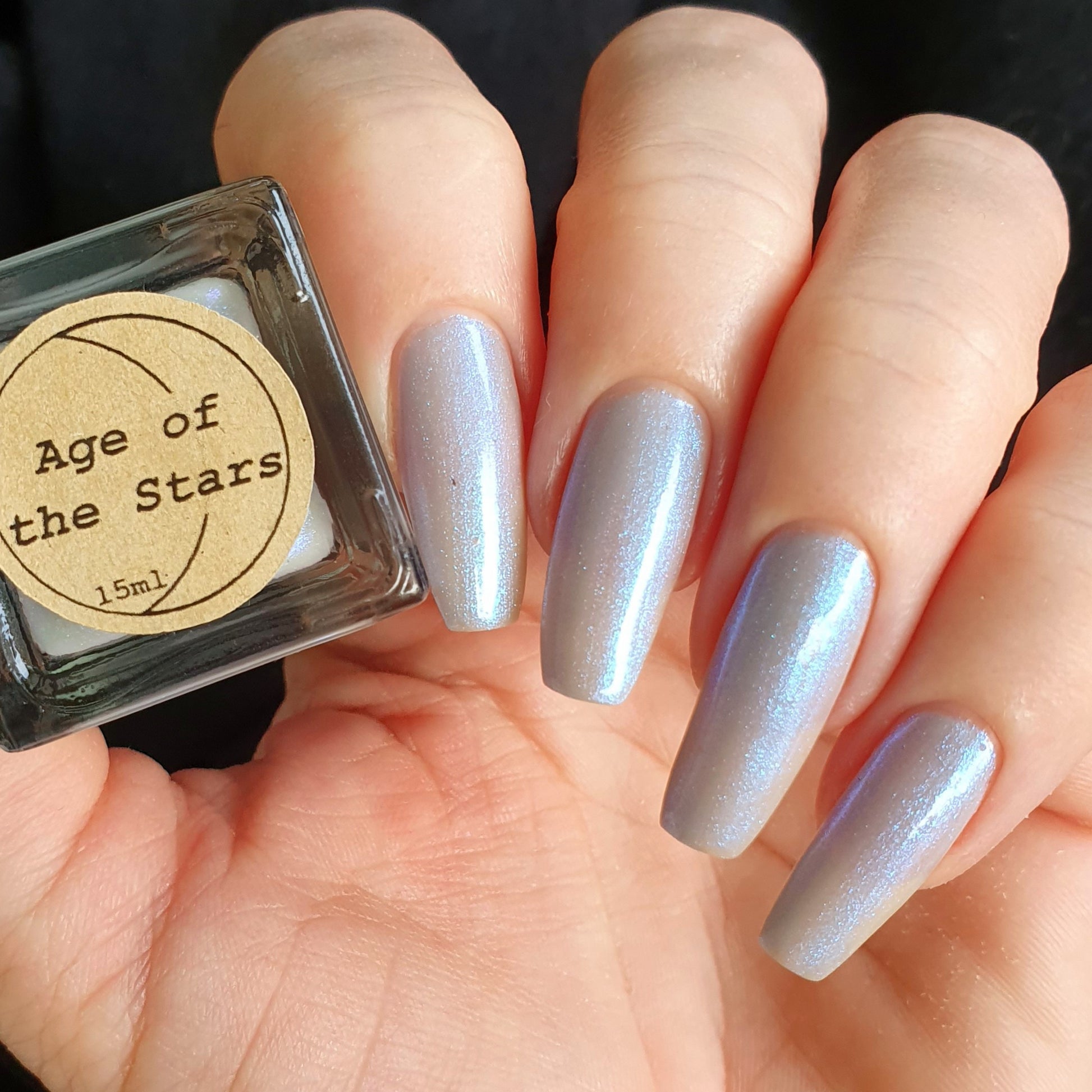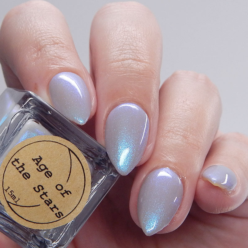 Age of the Stars has a light gray crelly base with bright blue aurora shimmer. It allows a bit of nail line to show after two coats and reaches complete opacity in three.