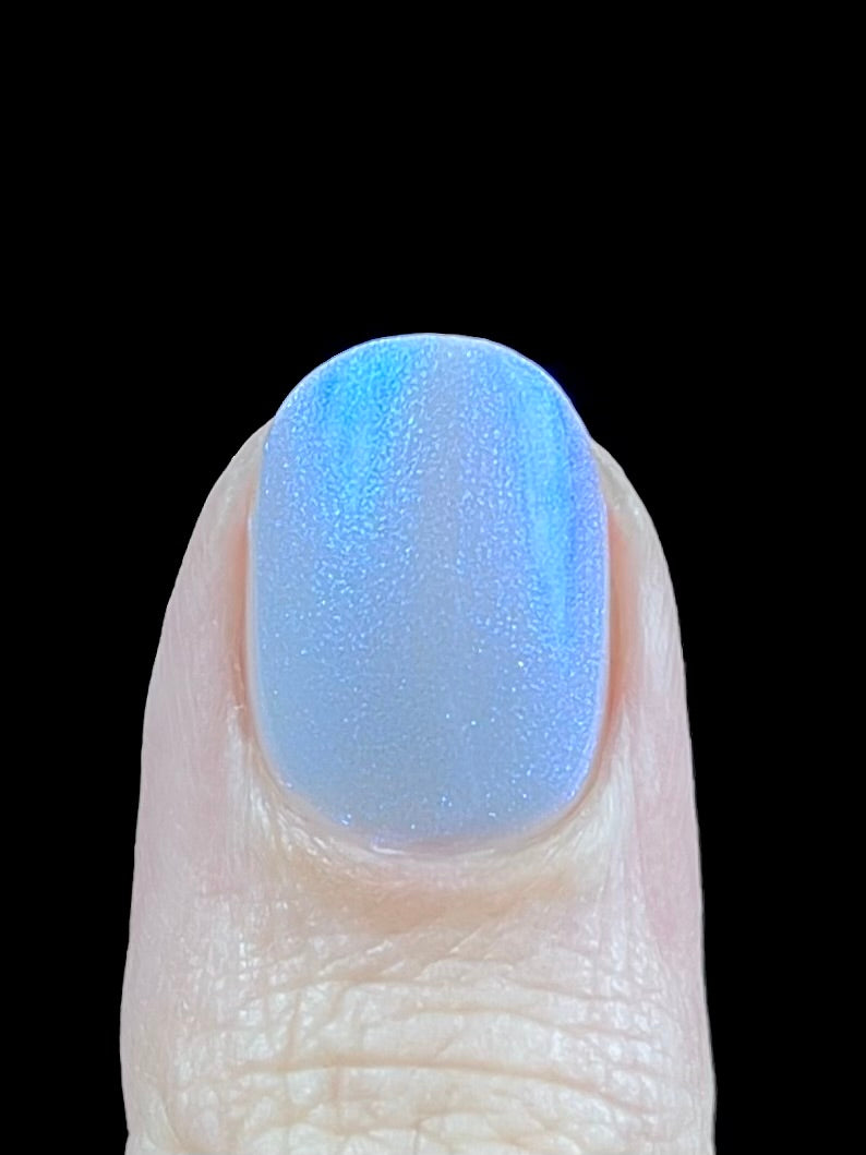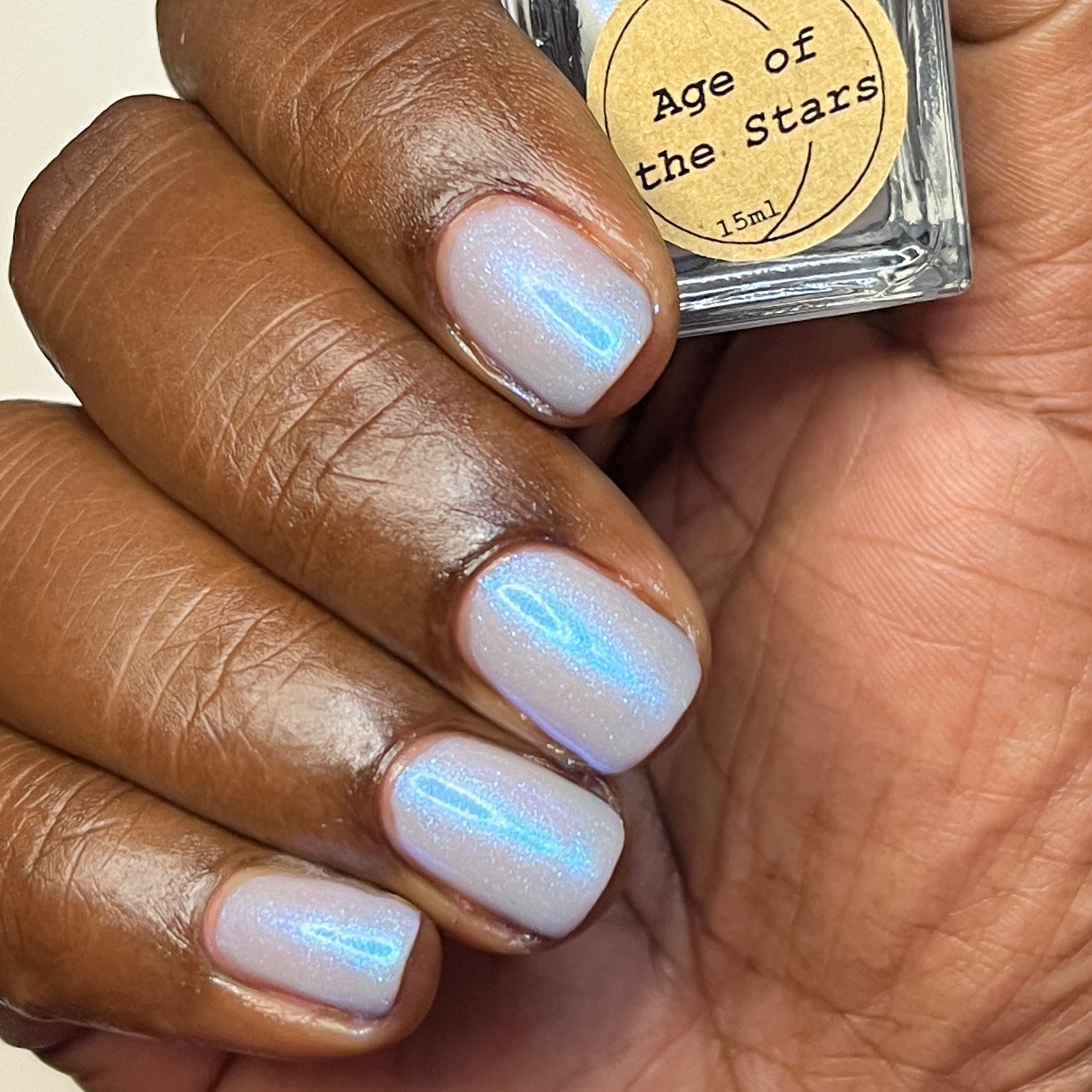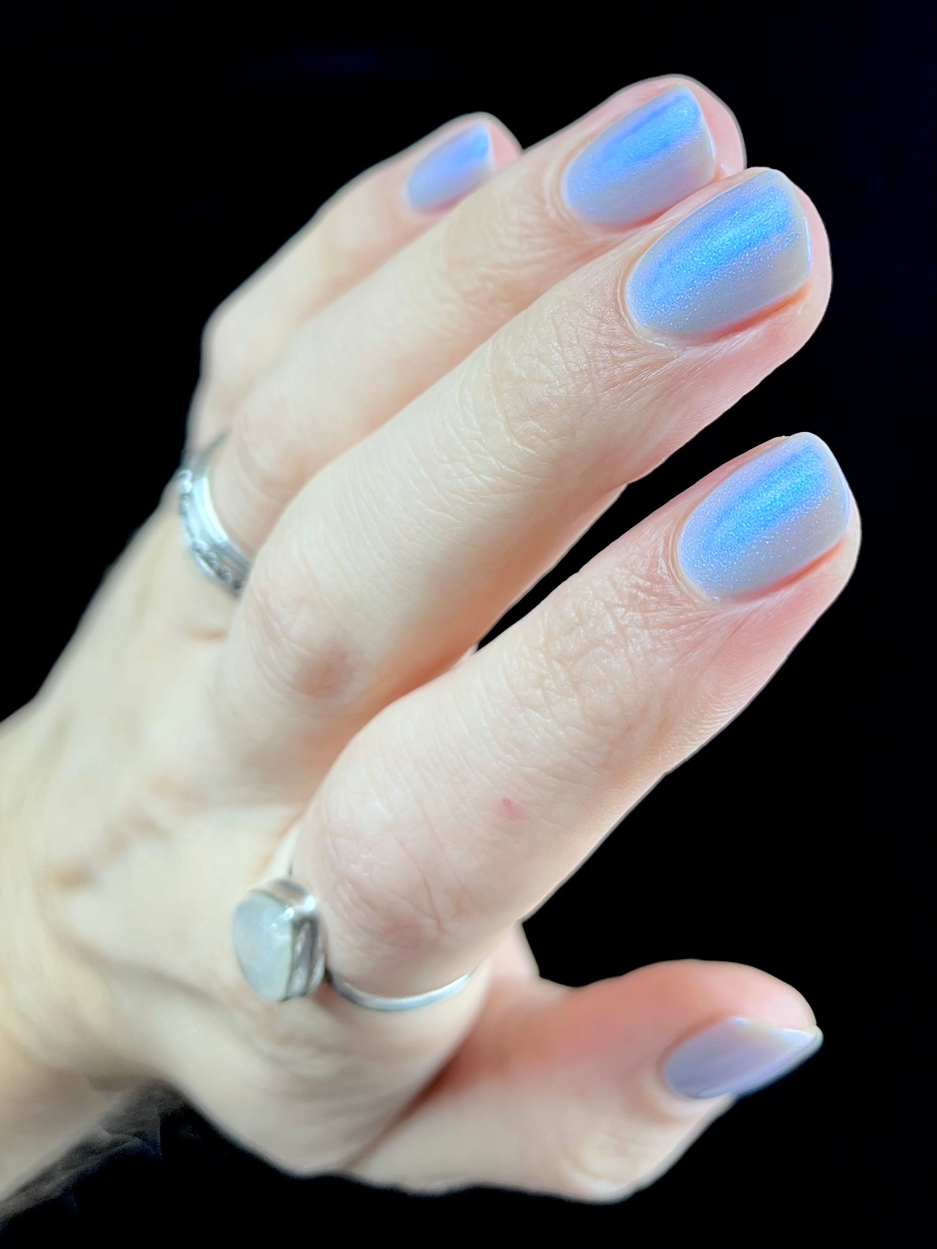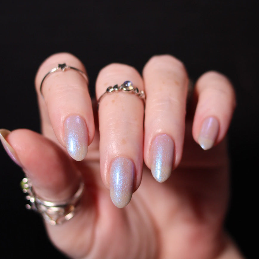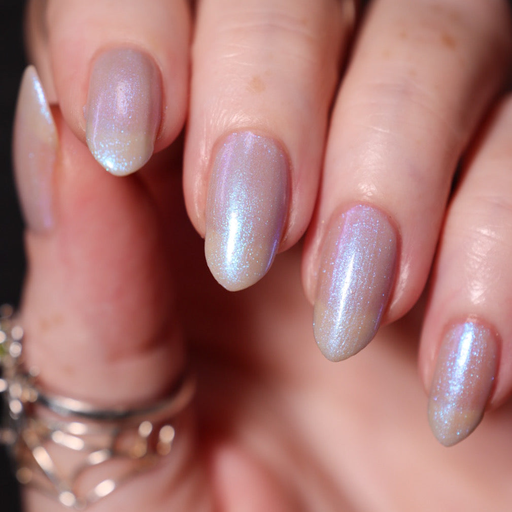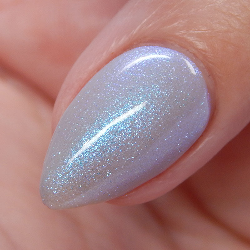 Age of the Stars has a light gray crelly base with bright blue aurora shimmer. It allows a bit of nail line to show after two coats and reaches complete opacity in three.