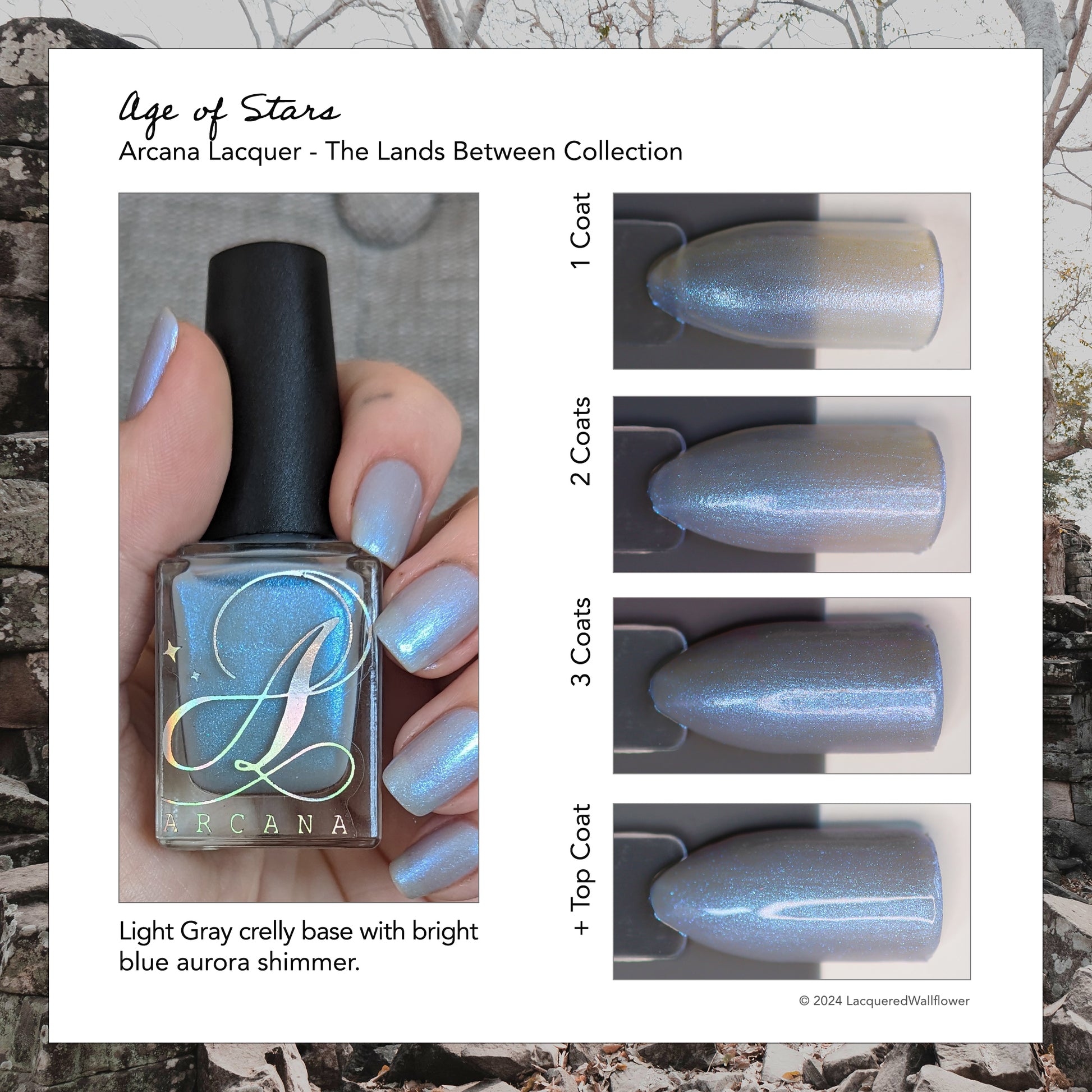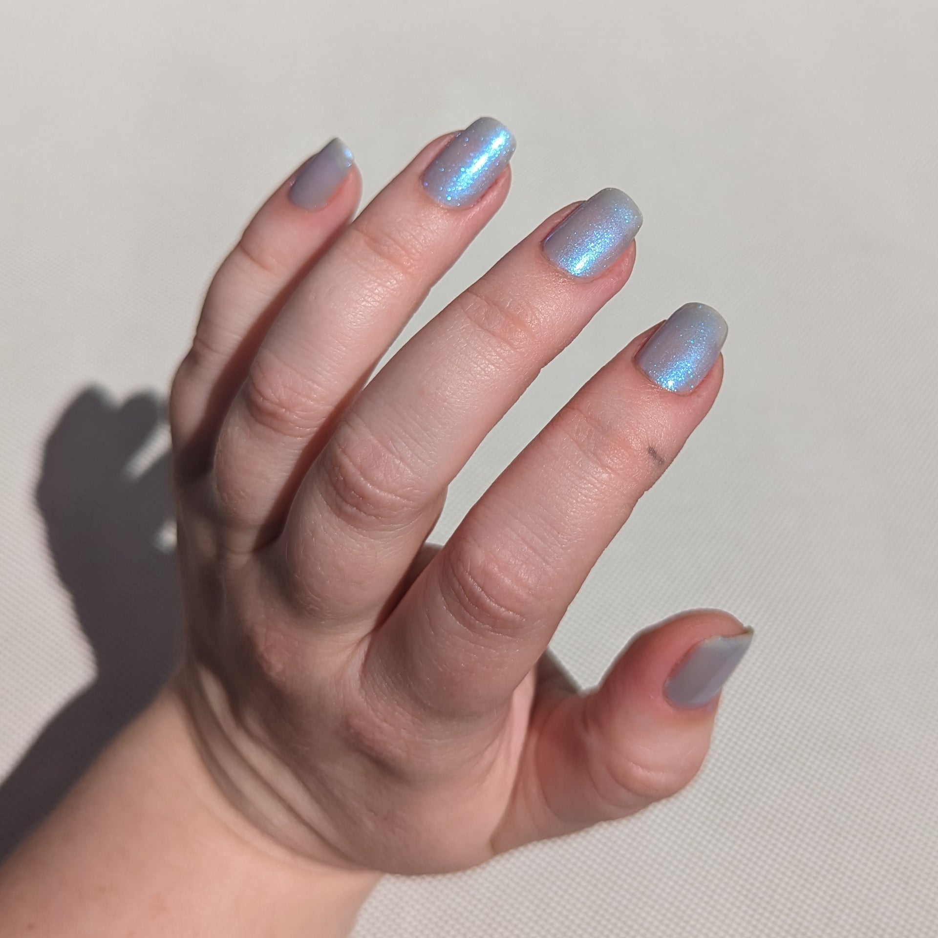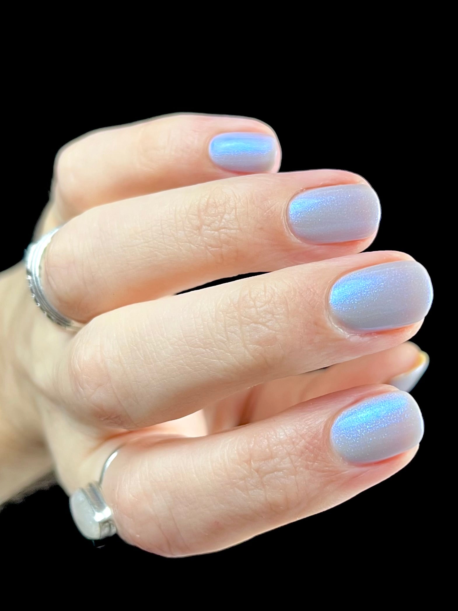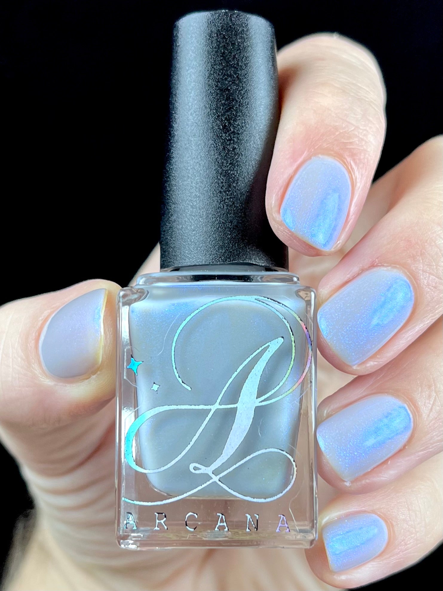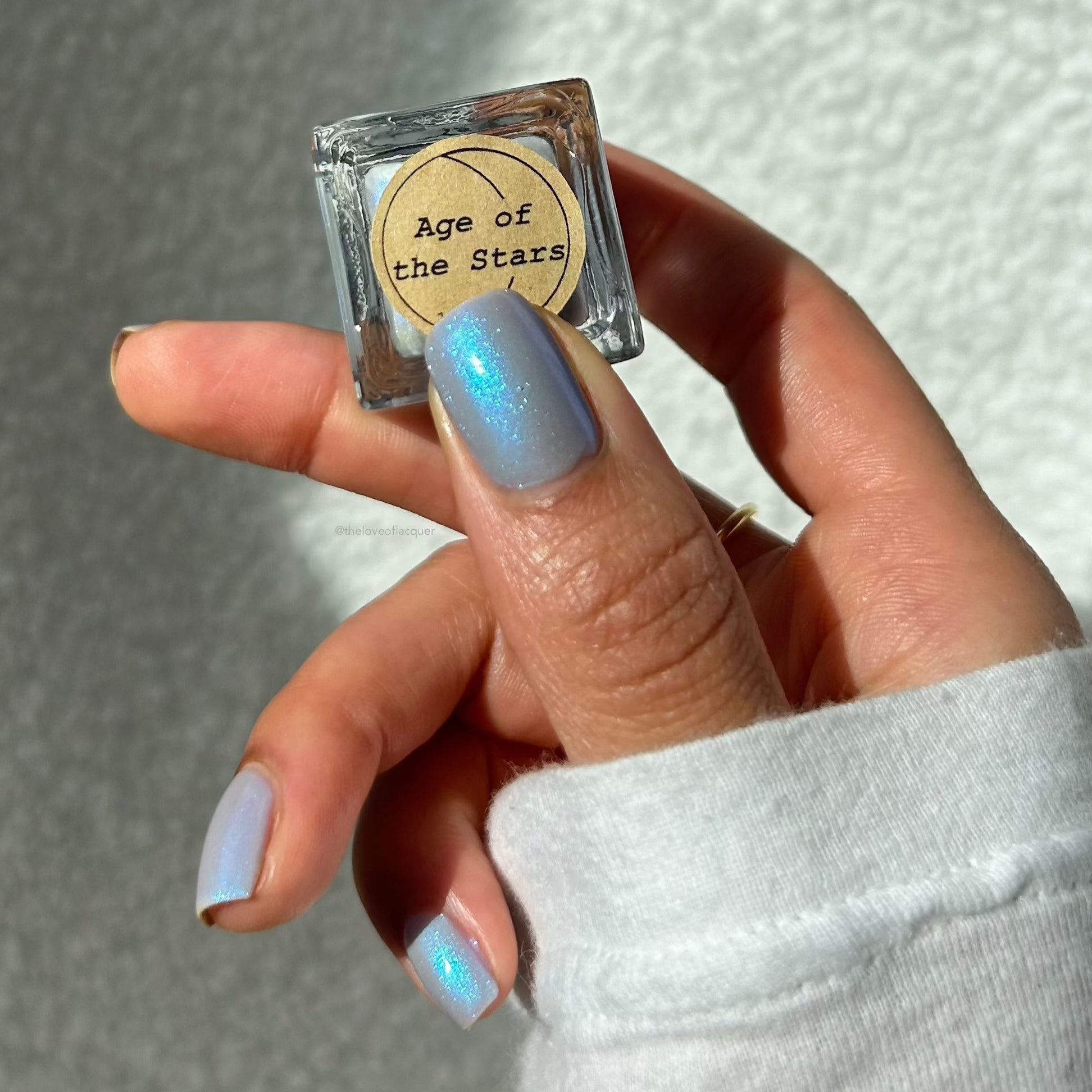 Age of the Stars has a light gray crelly base with bright blue aurora shimmer. It allows a bit of nail line to show after two coats and reaches complete opacity in three.