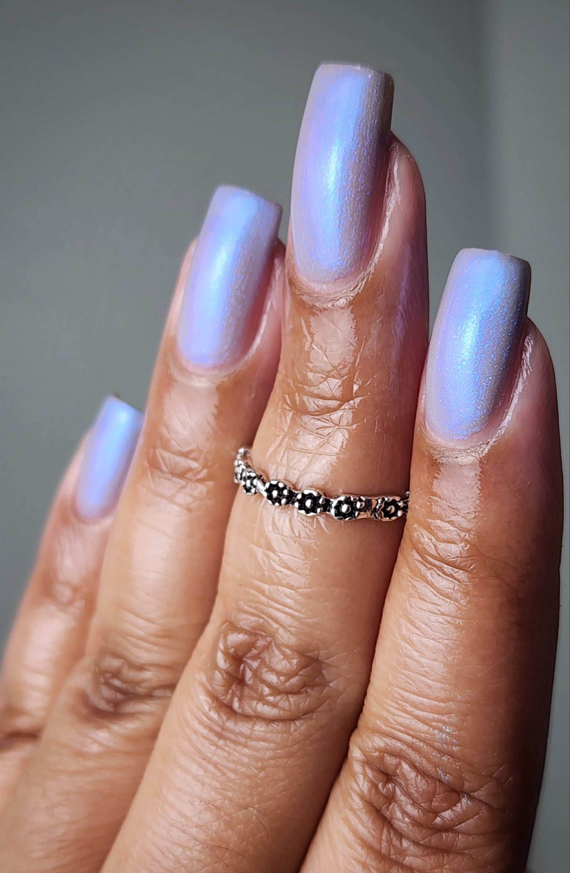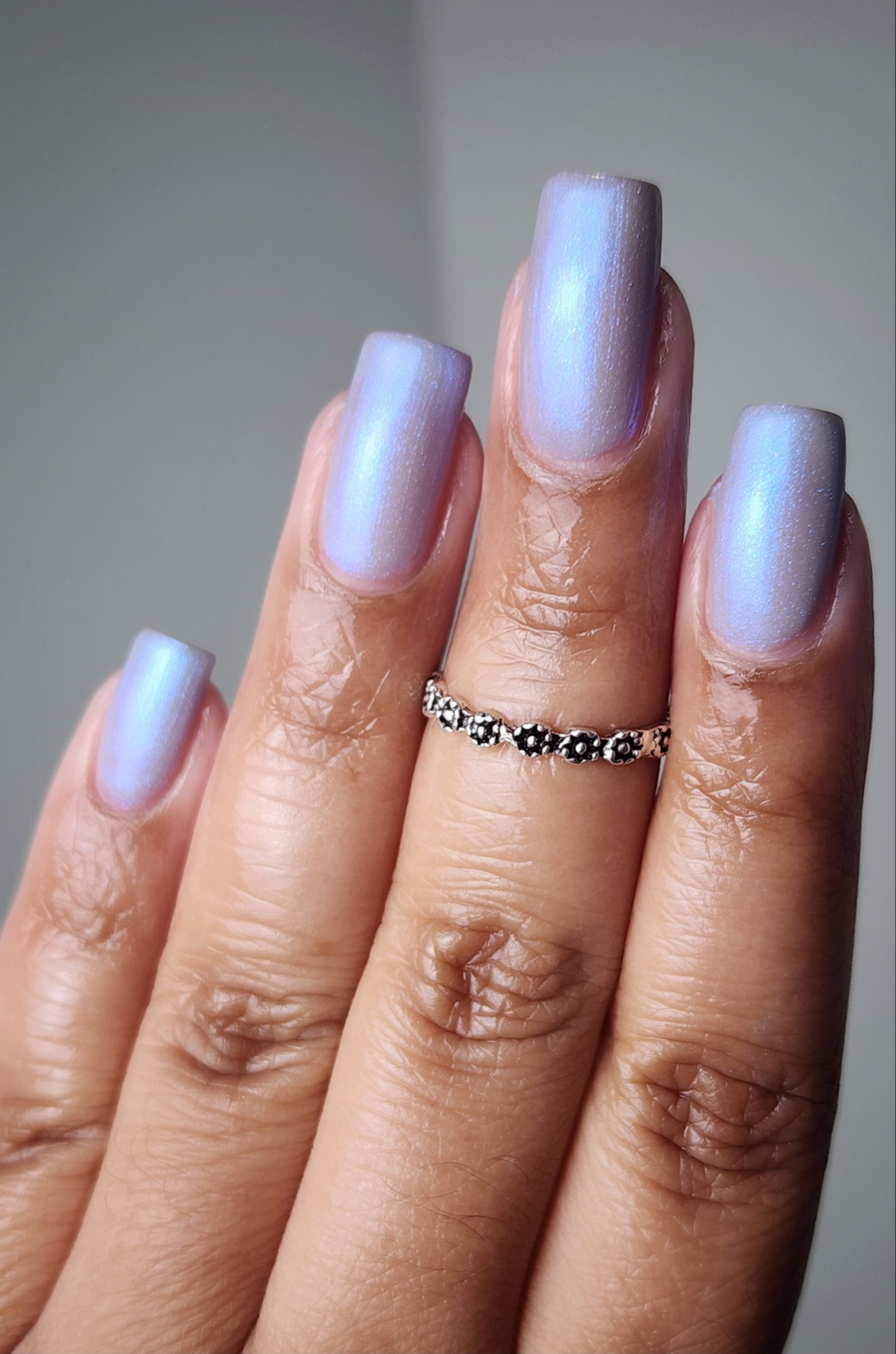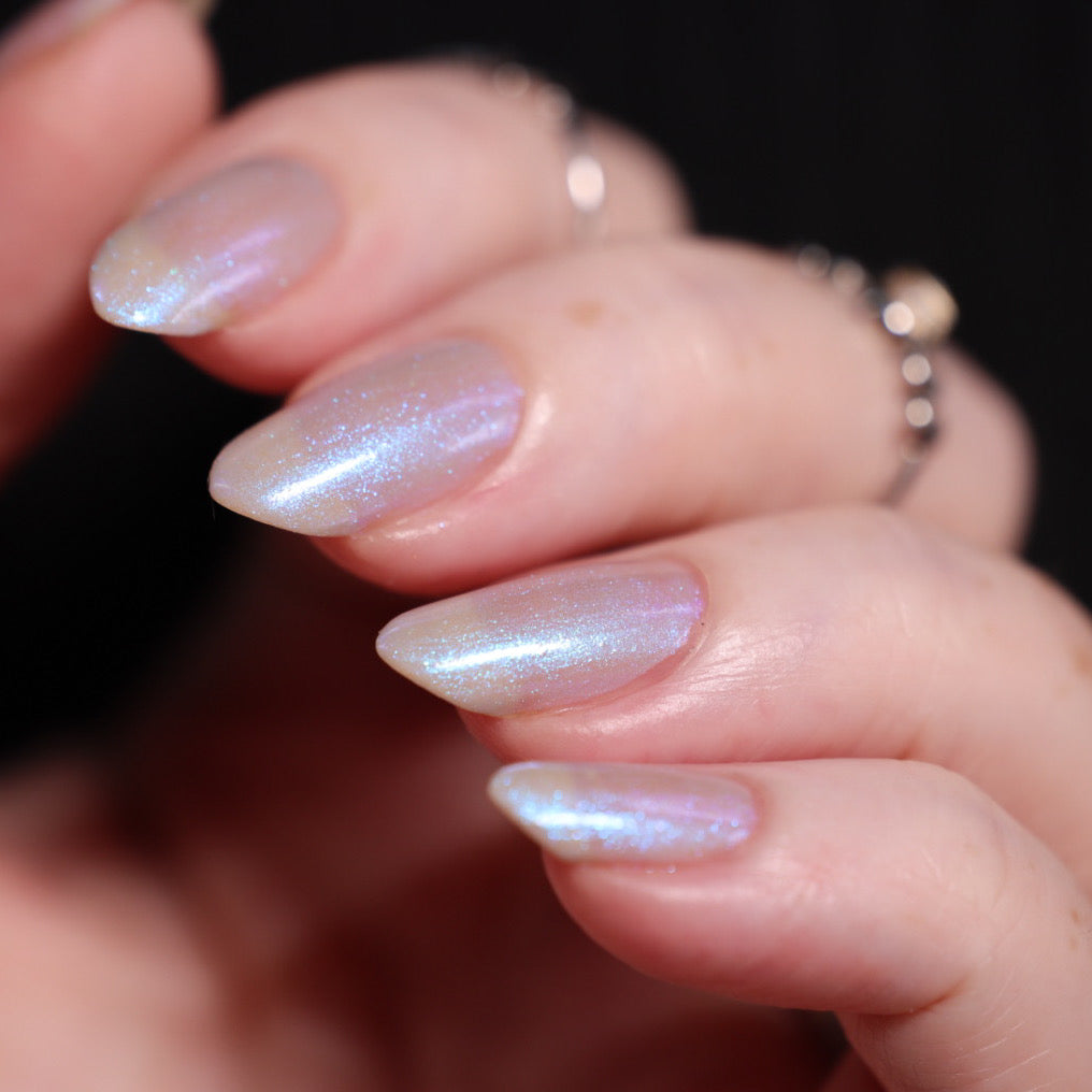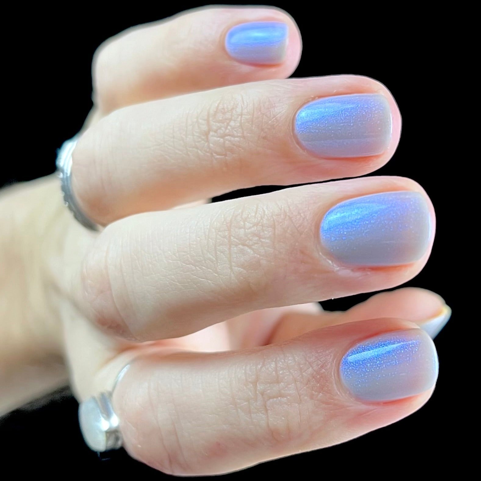 Age of the Stars has a light gray crelly base with bright blue aurora shimmer. It allows a bit of nail line to show after two coats and reaches complete opacity in three.