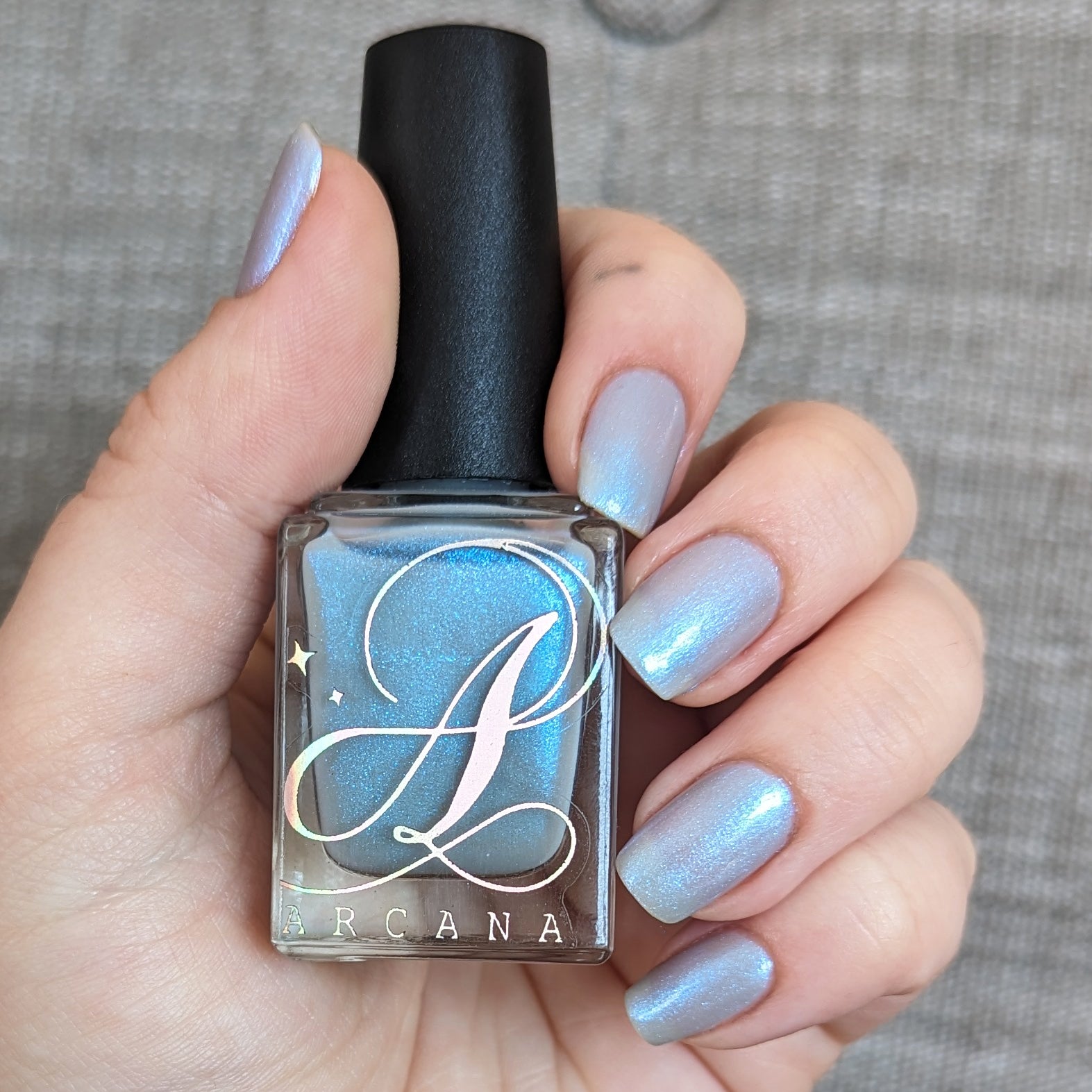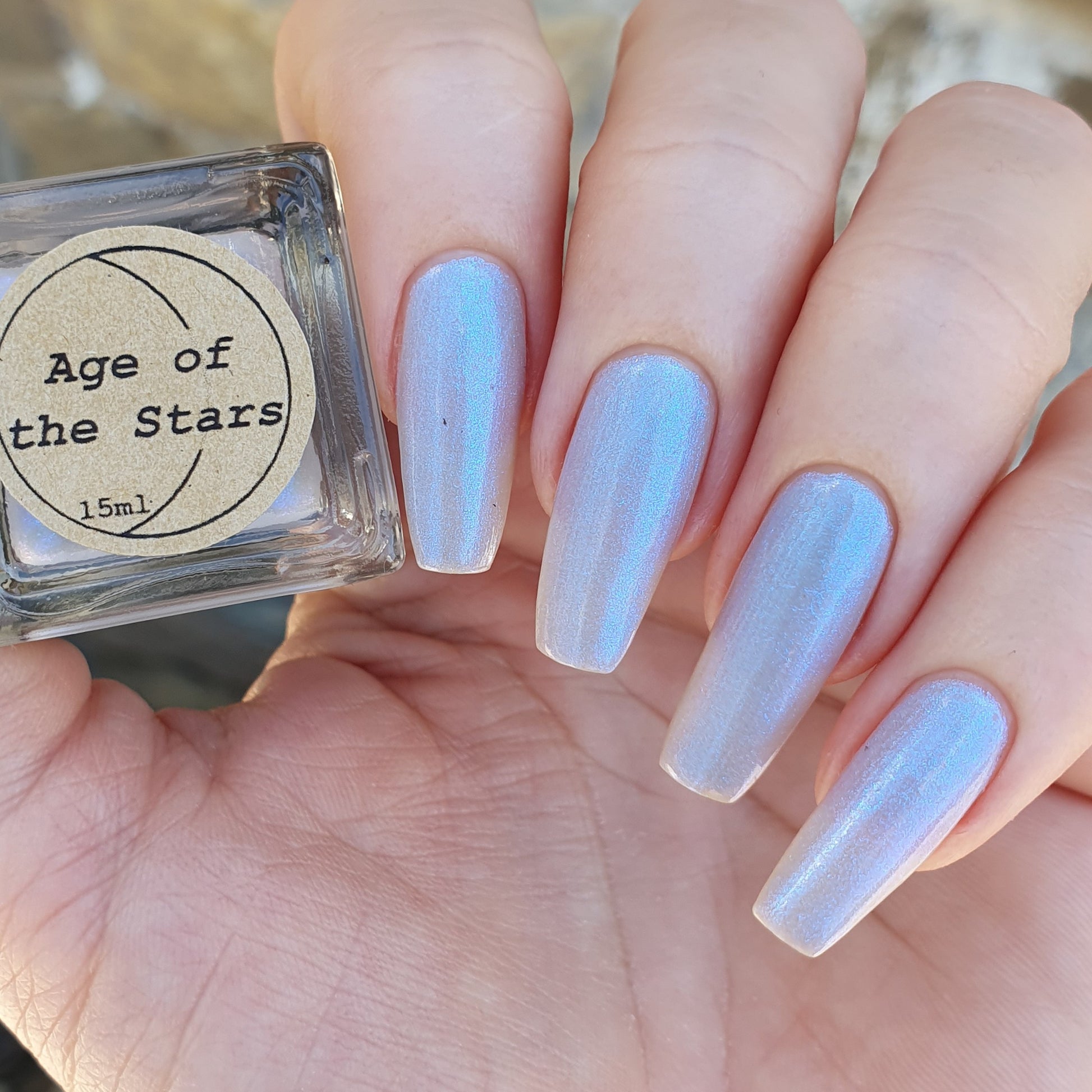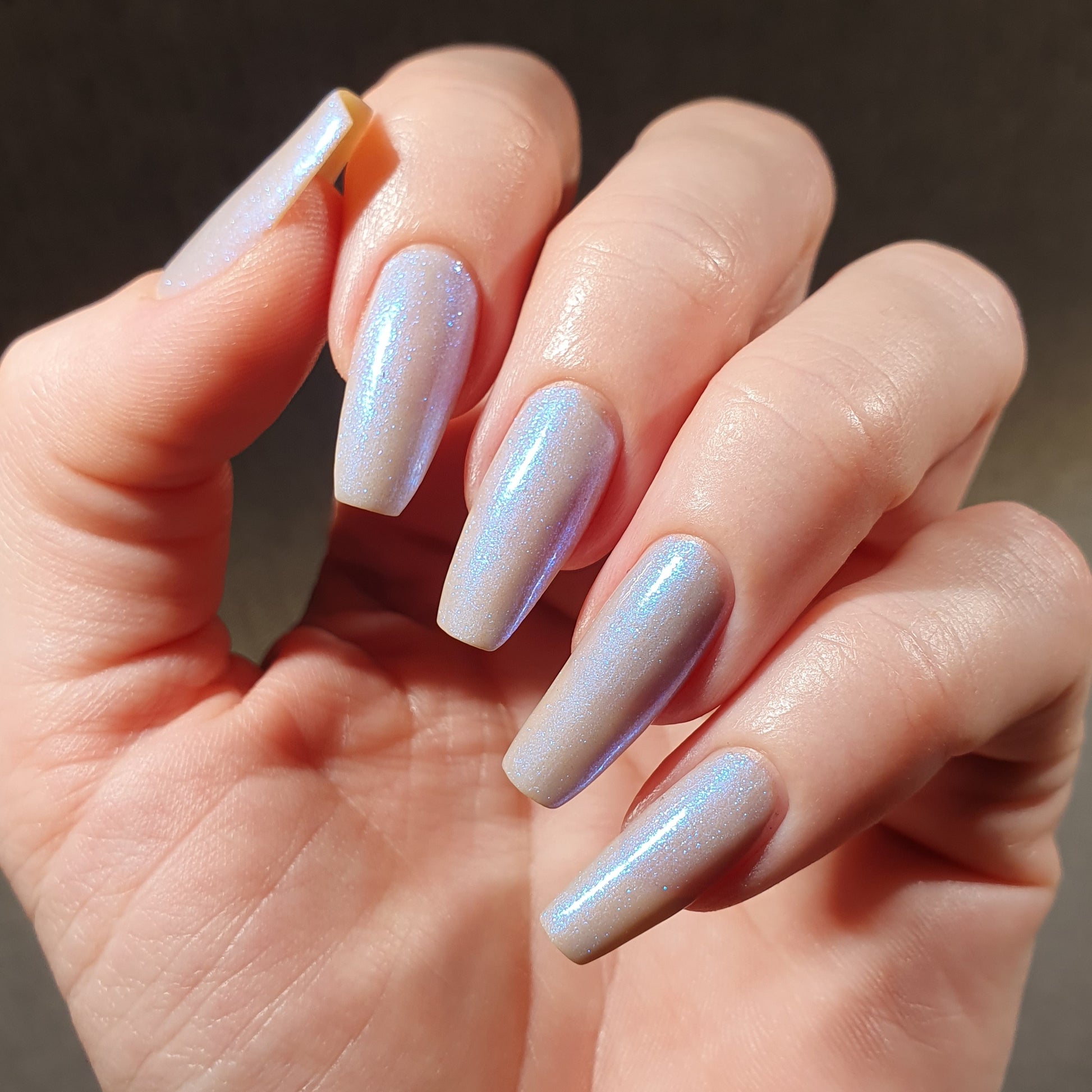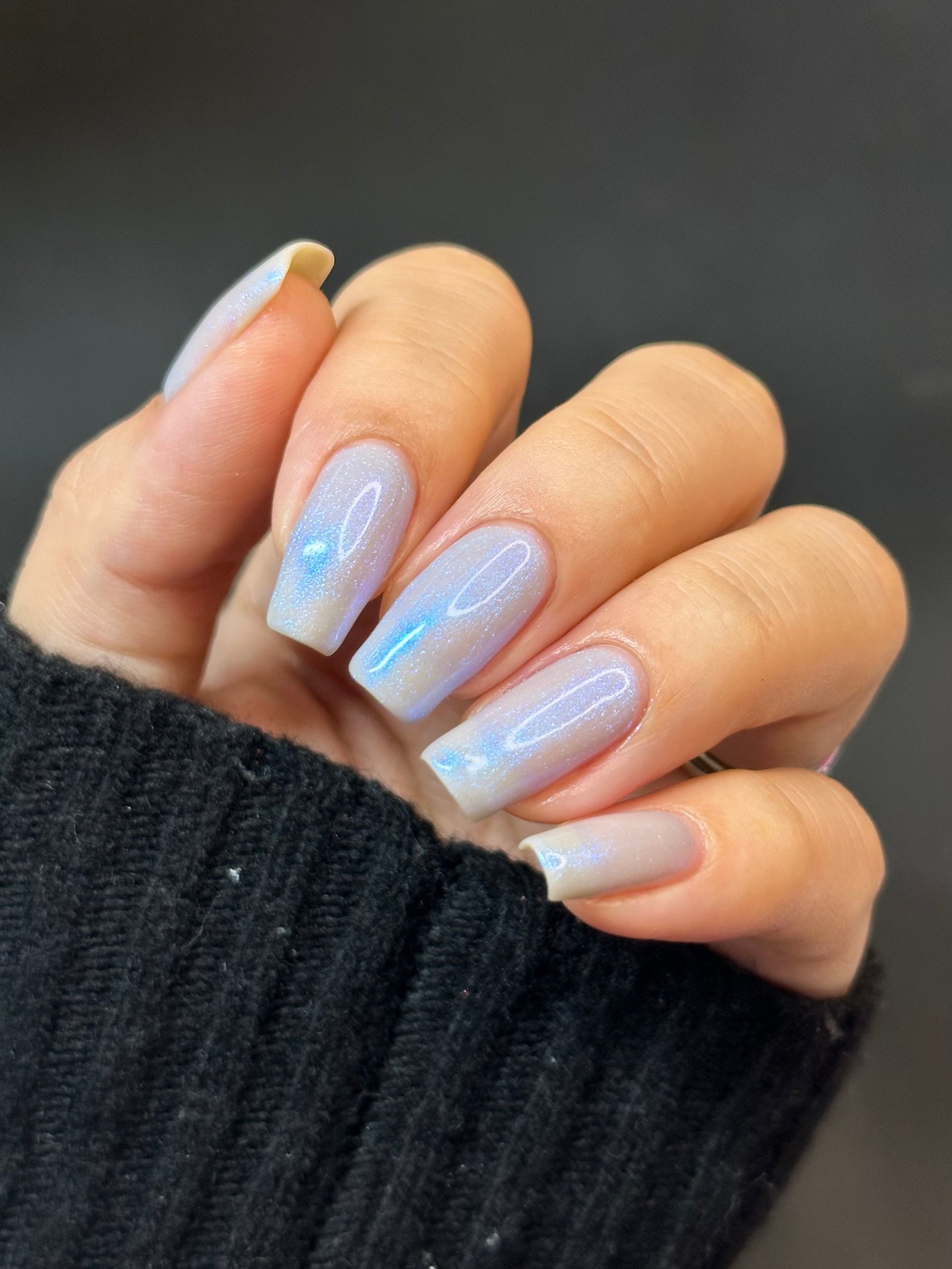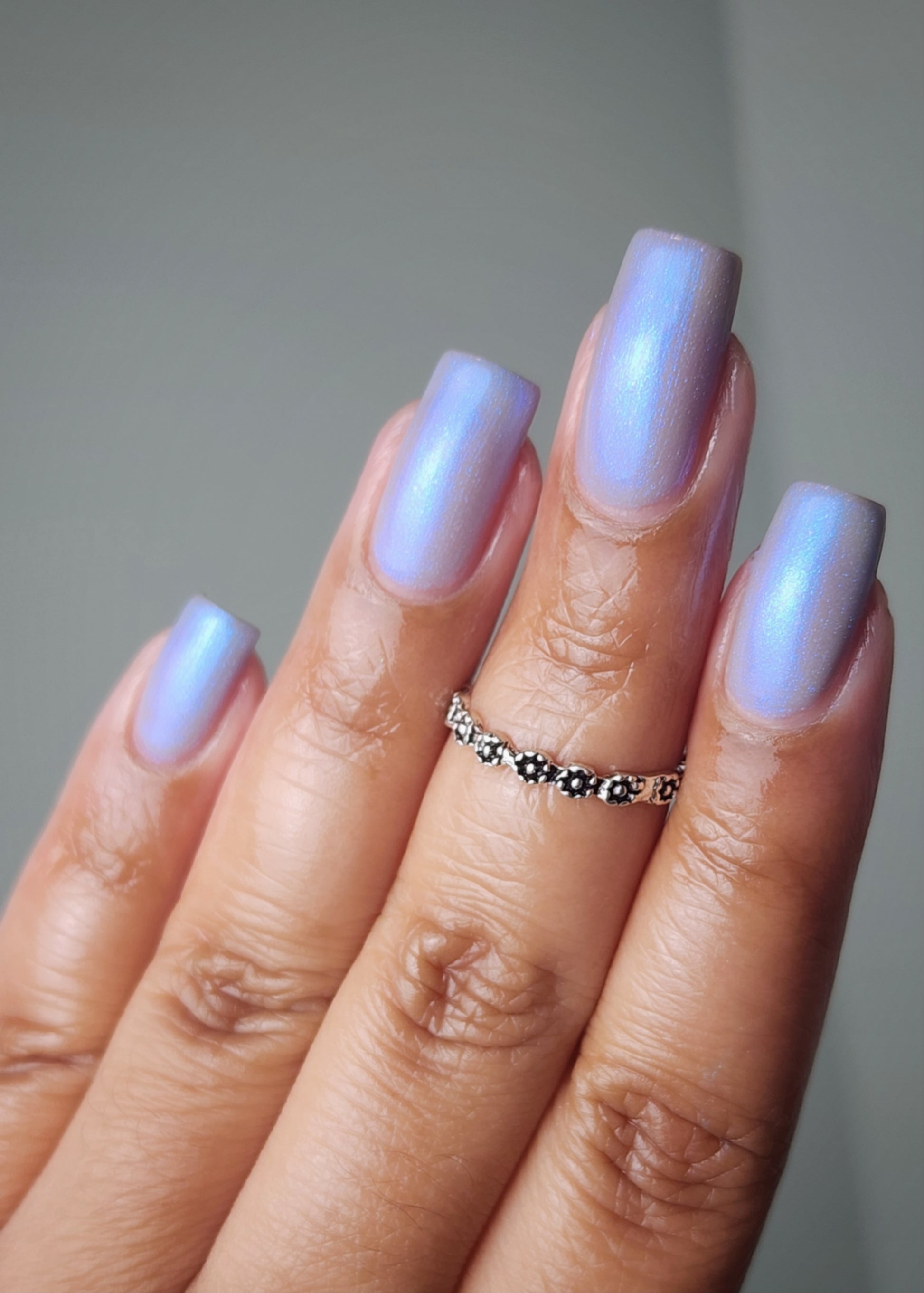 Age of the Stars has a light gray crelly base with bright blue aurora shimmer. It allows a bit of nail line to show after two coats and reaches complete opacity in three.