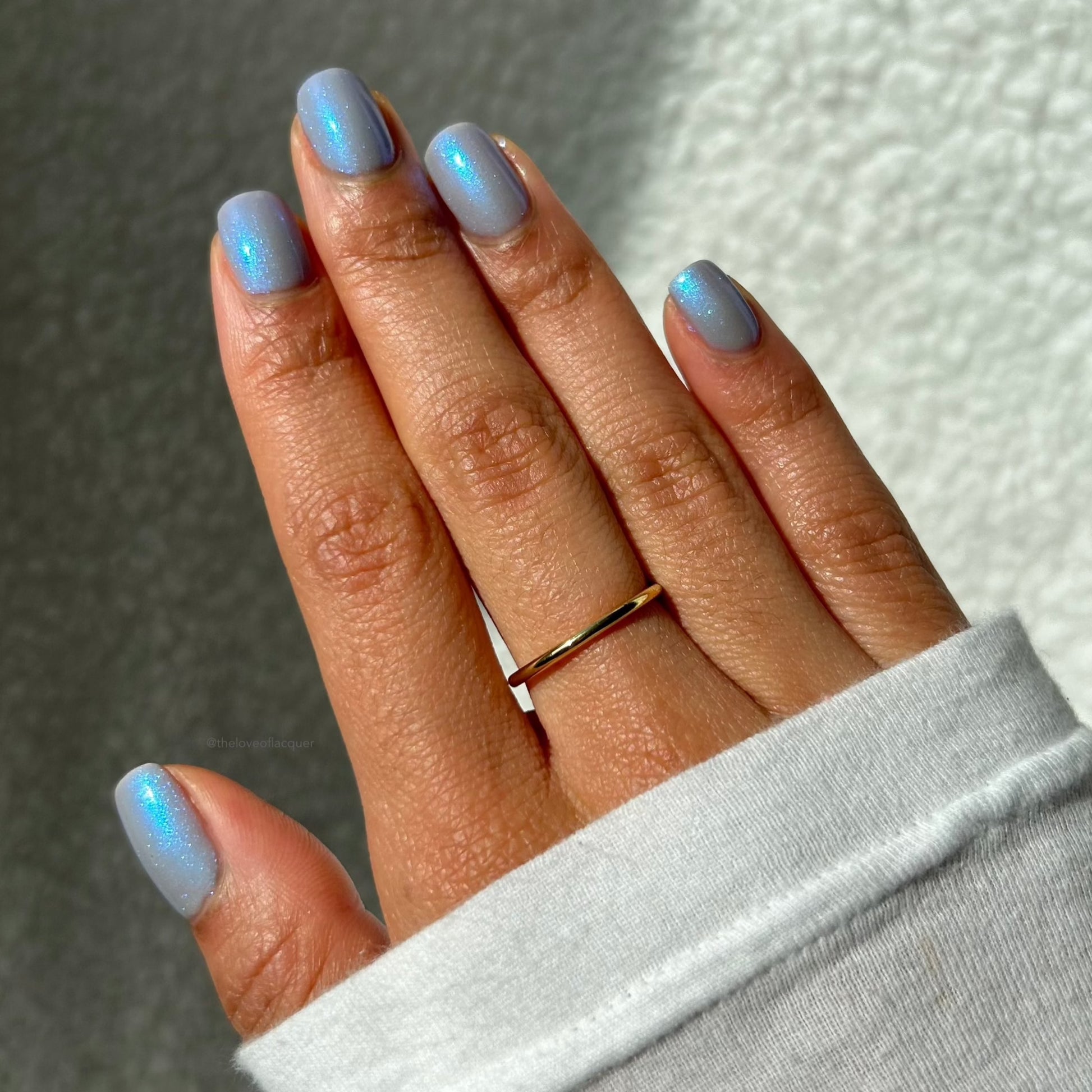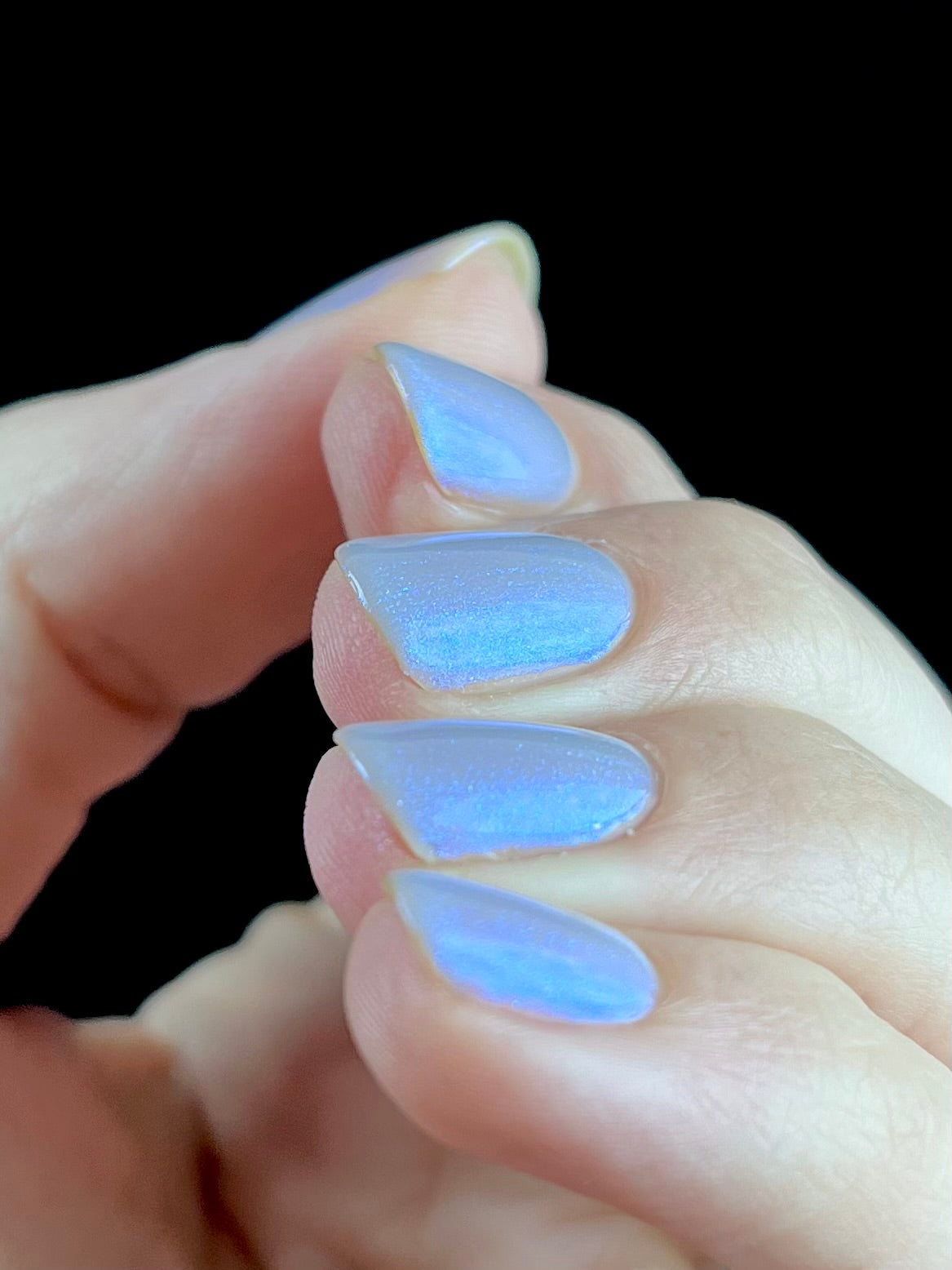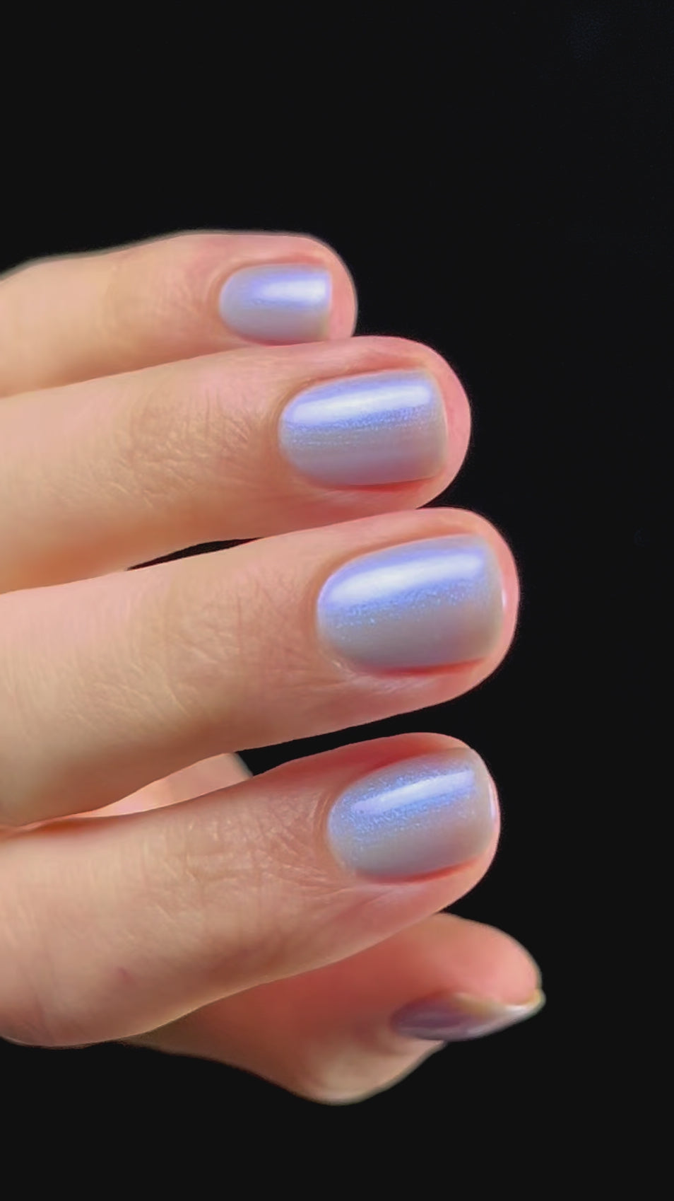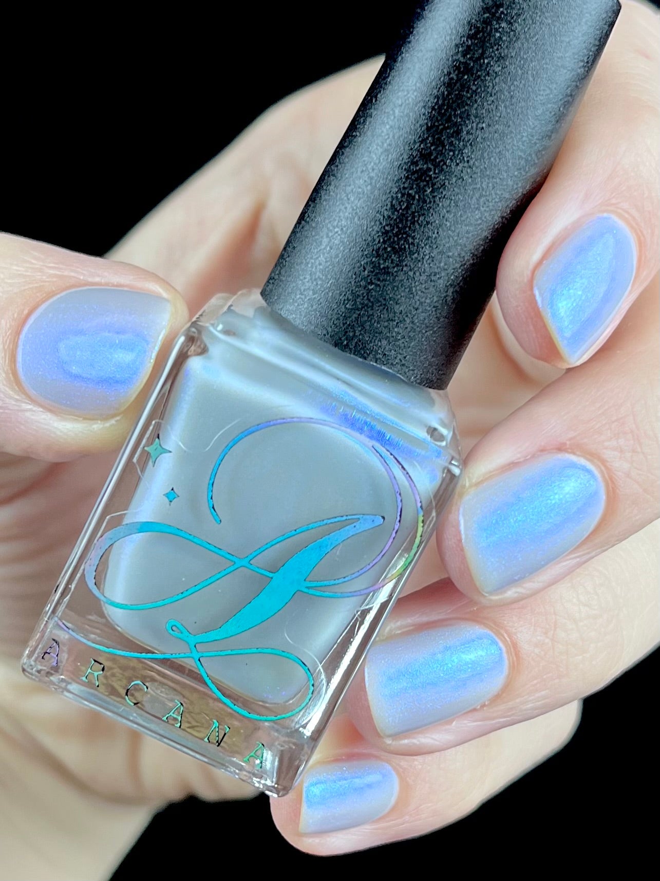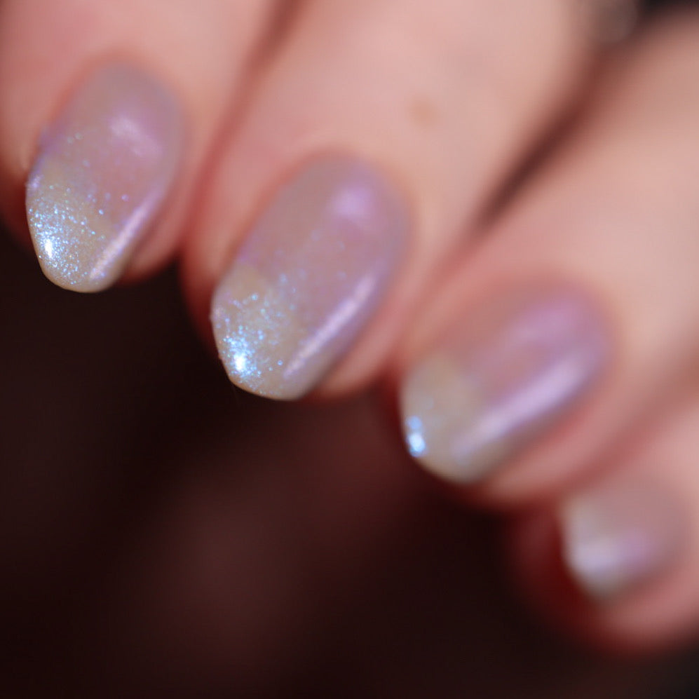 Age of the Stars has a light gray crelly base with bright blue aurora shimmer. It allows a bit of nail line to show after two coats and reaches complete opacity in three.