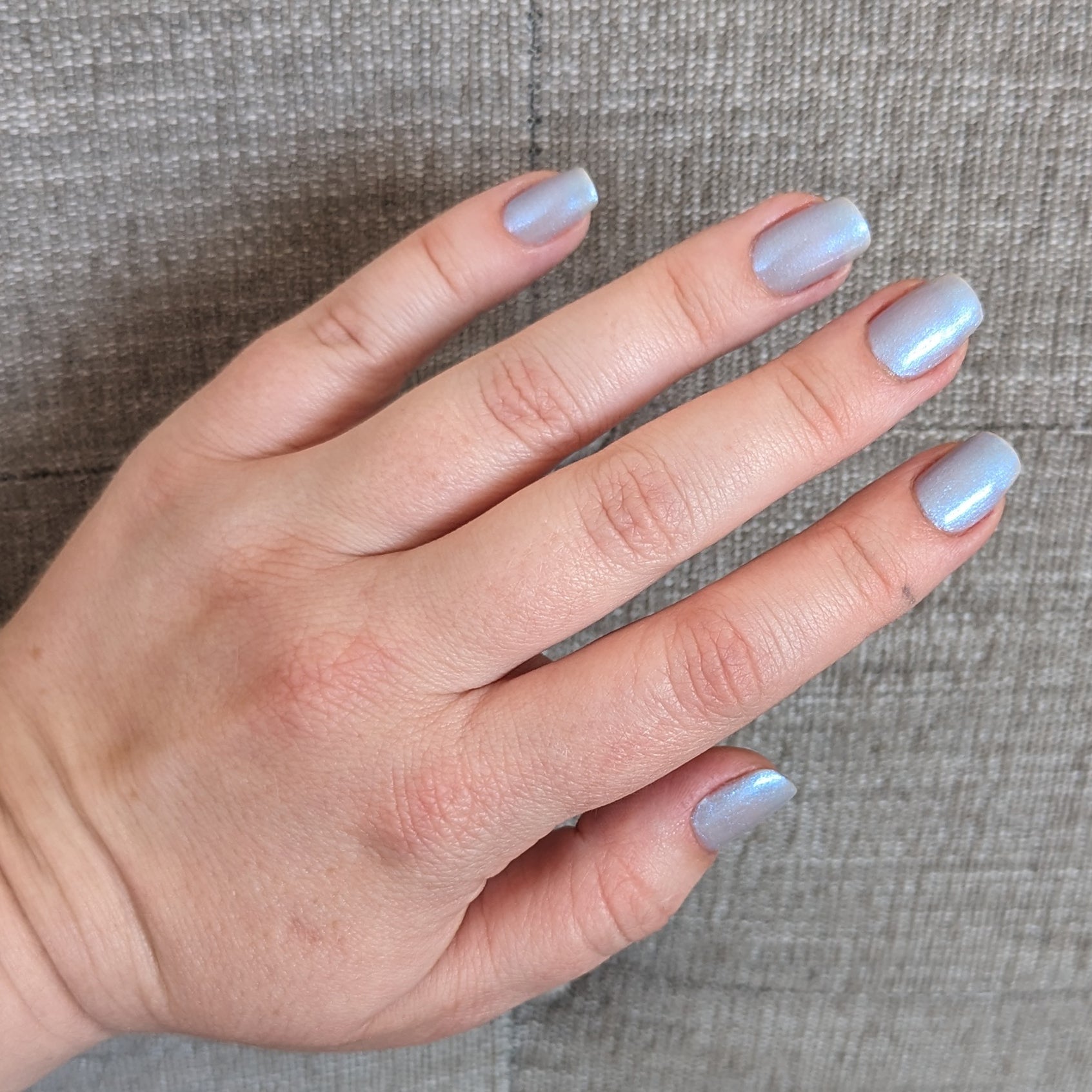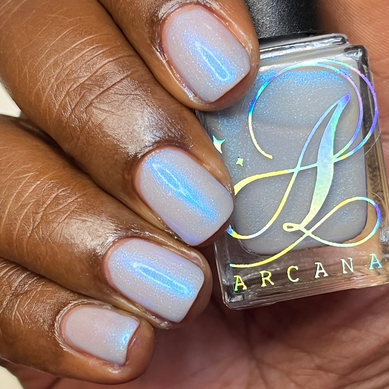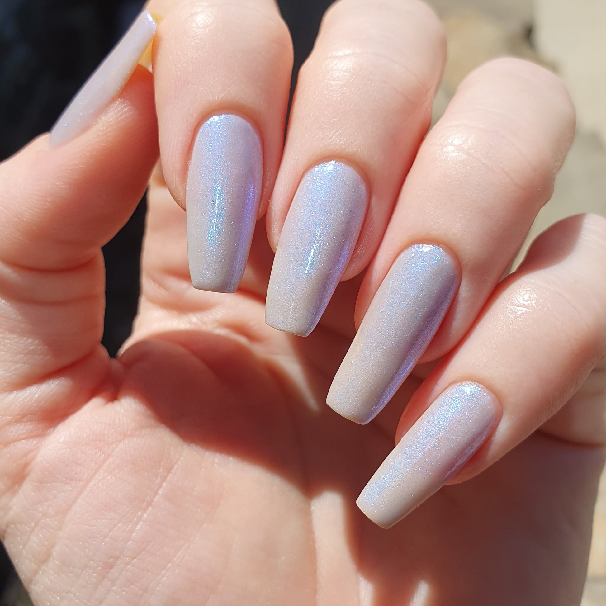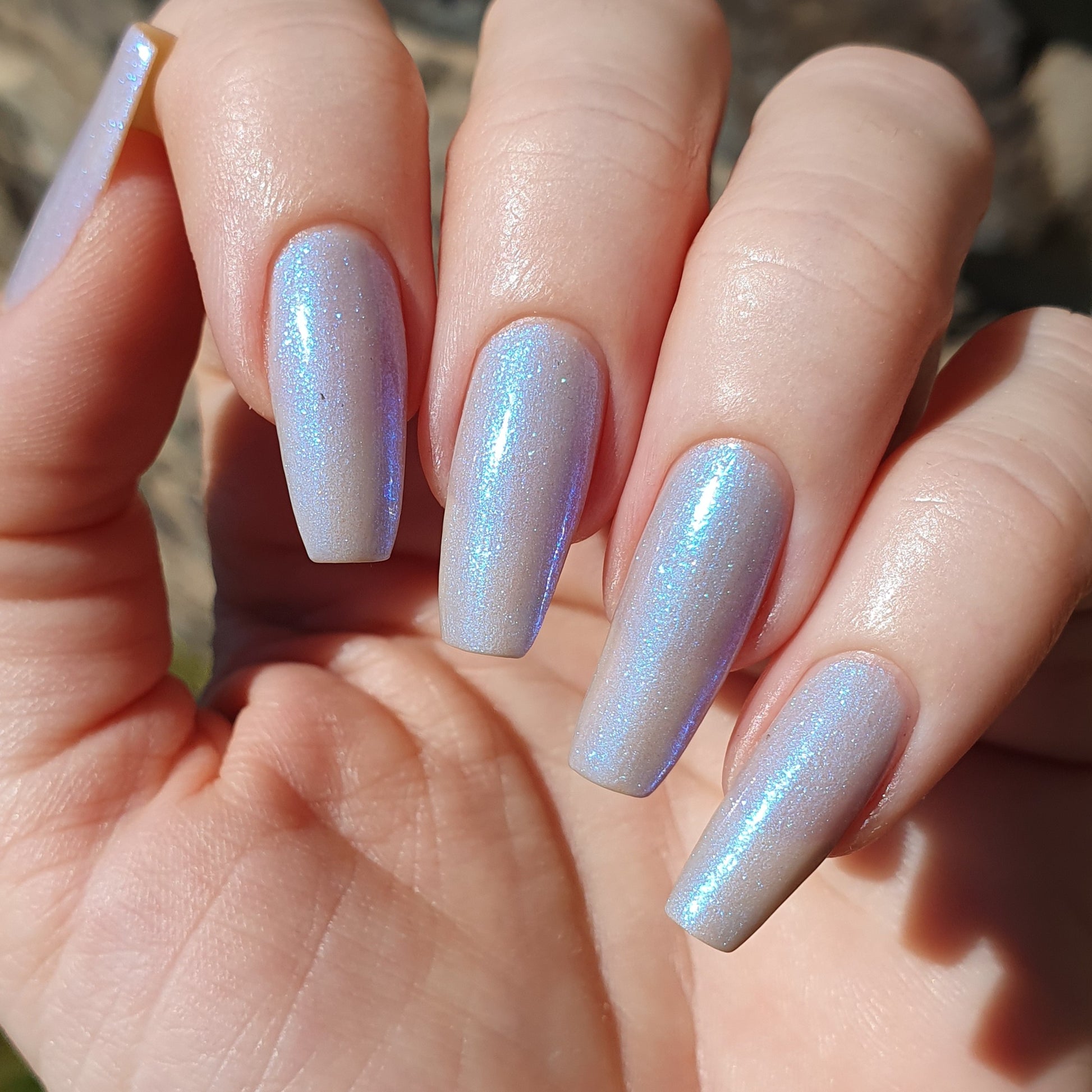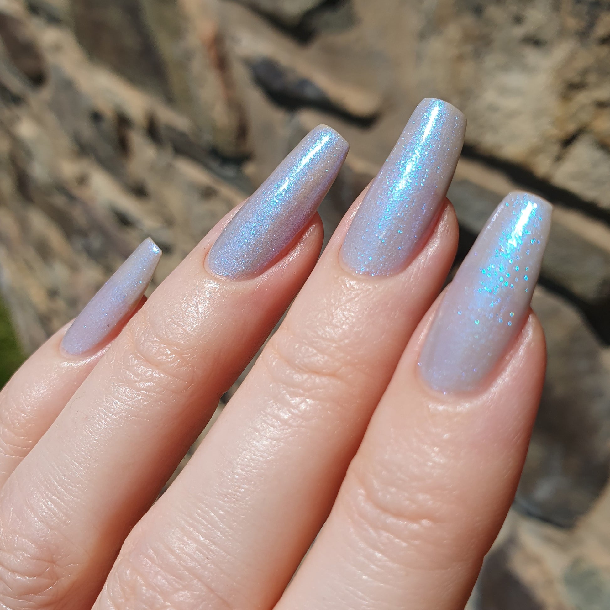 Age of the Stars has a light gray crelly base with bright blue aurora shimmer. It allows a bit of nail line to show after two coats and reaches complete opacity in three.