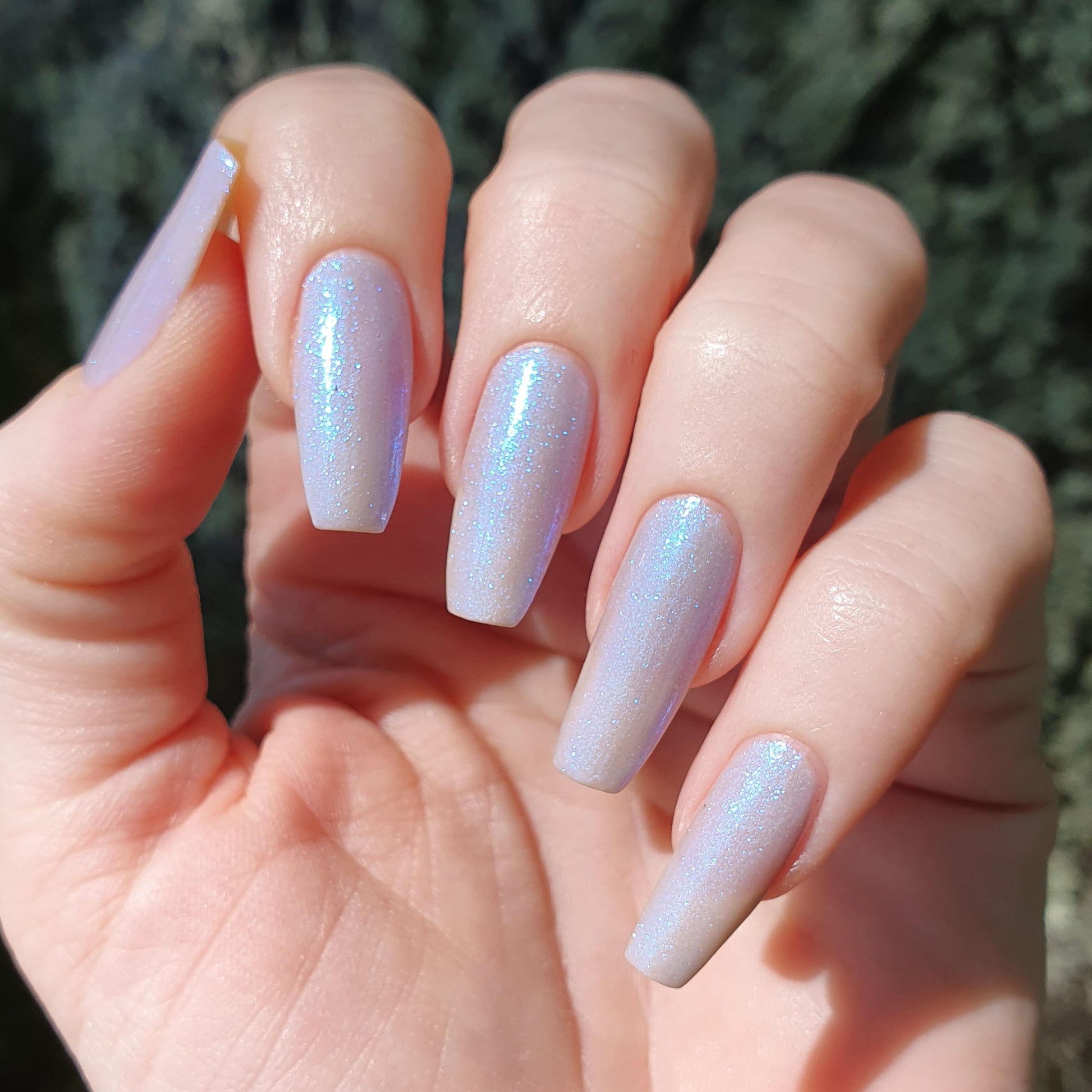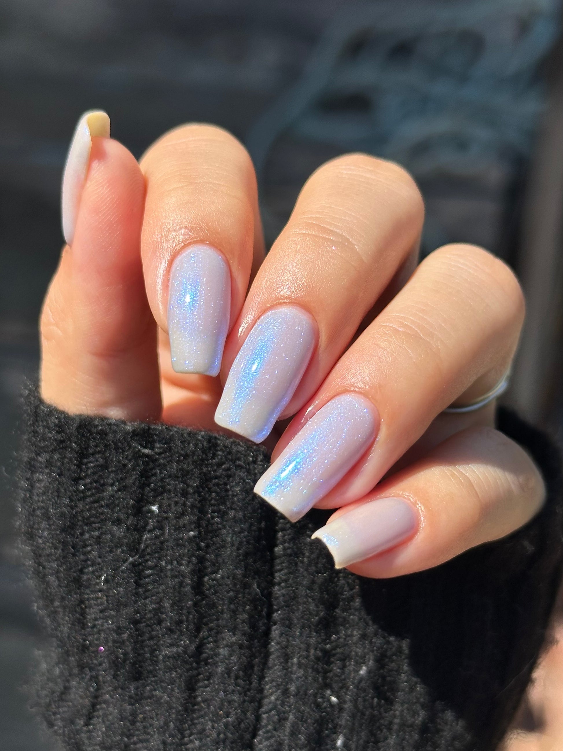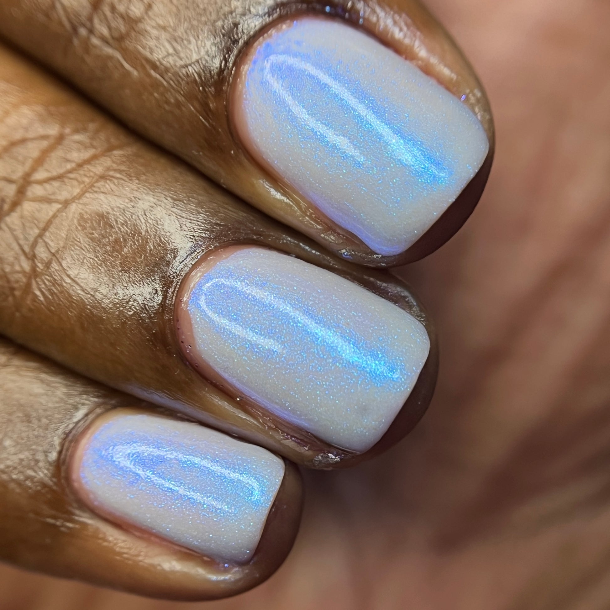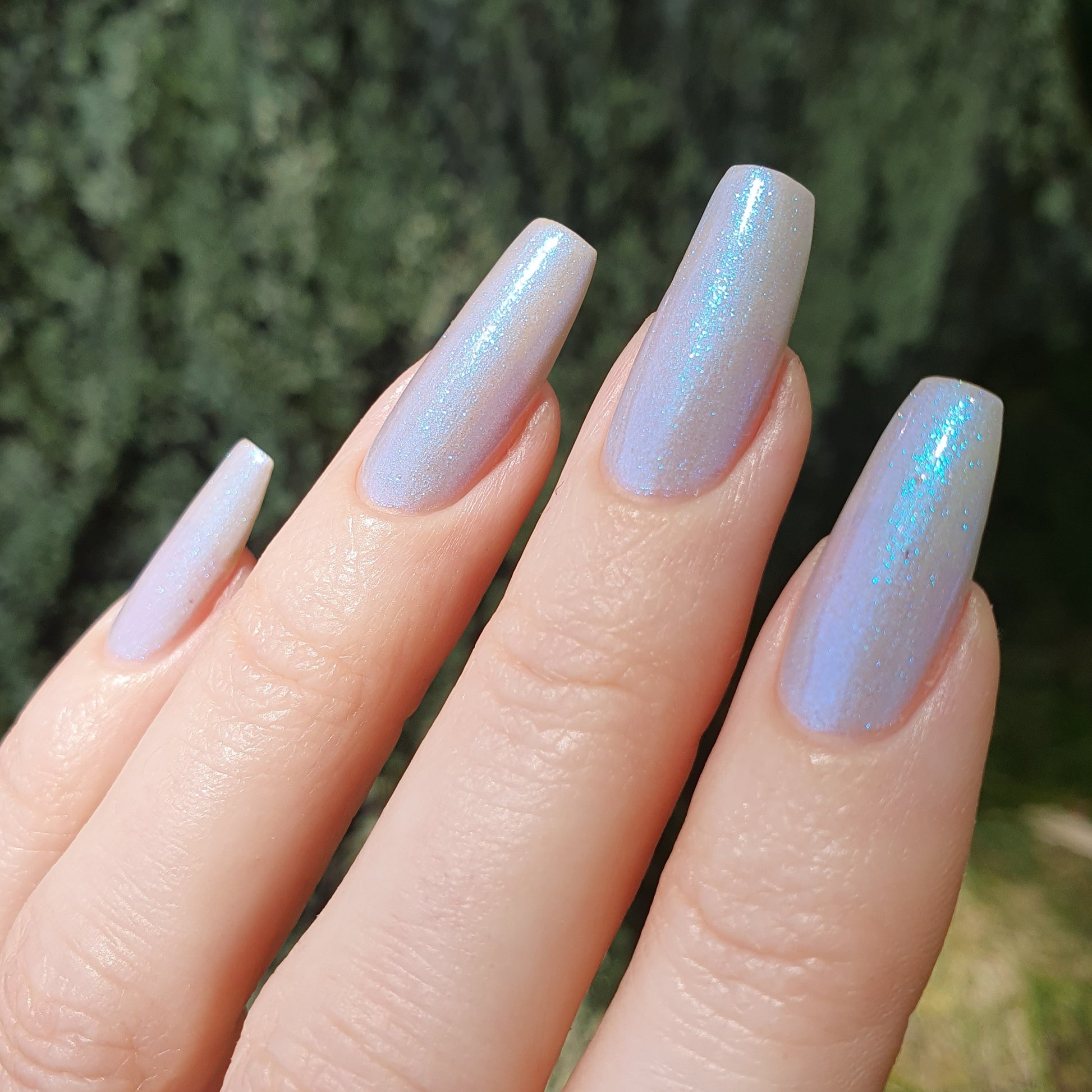 Age of the Stars has a light gray crelly base with bright blue aurora shimmer. It allows a bit of nail line to show after two coats and reaches complete opacity in three.