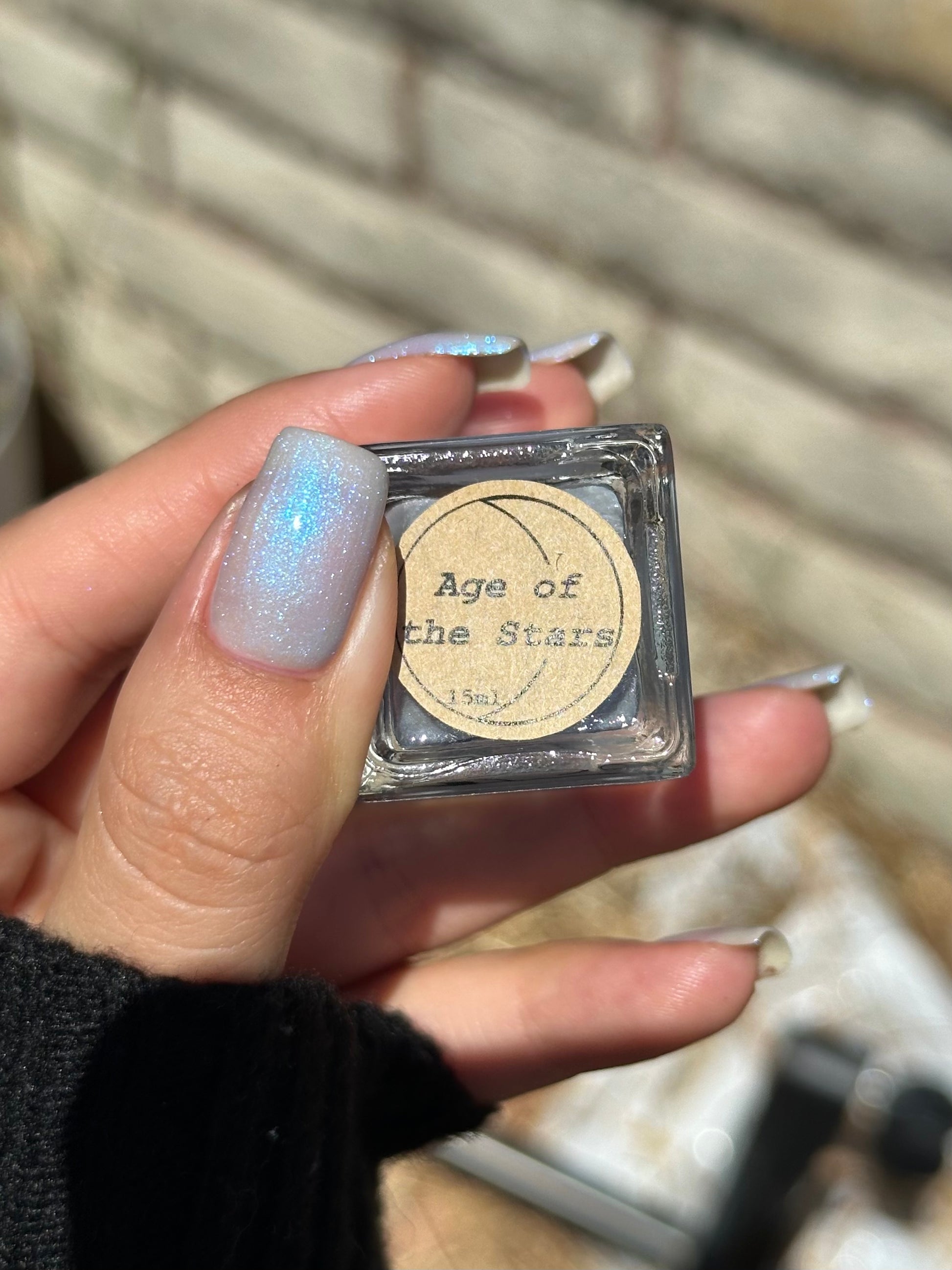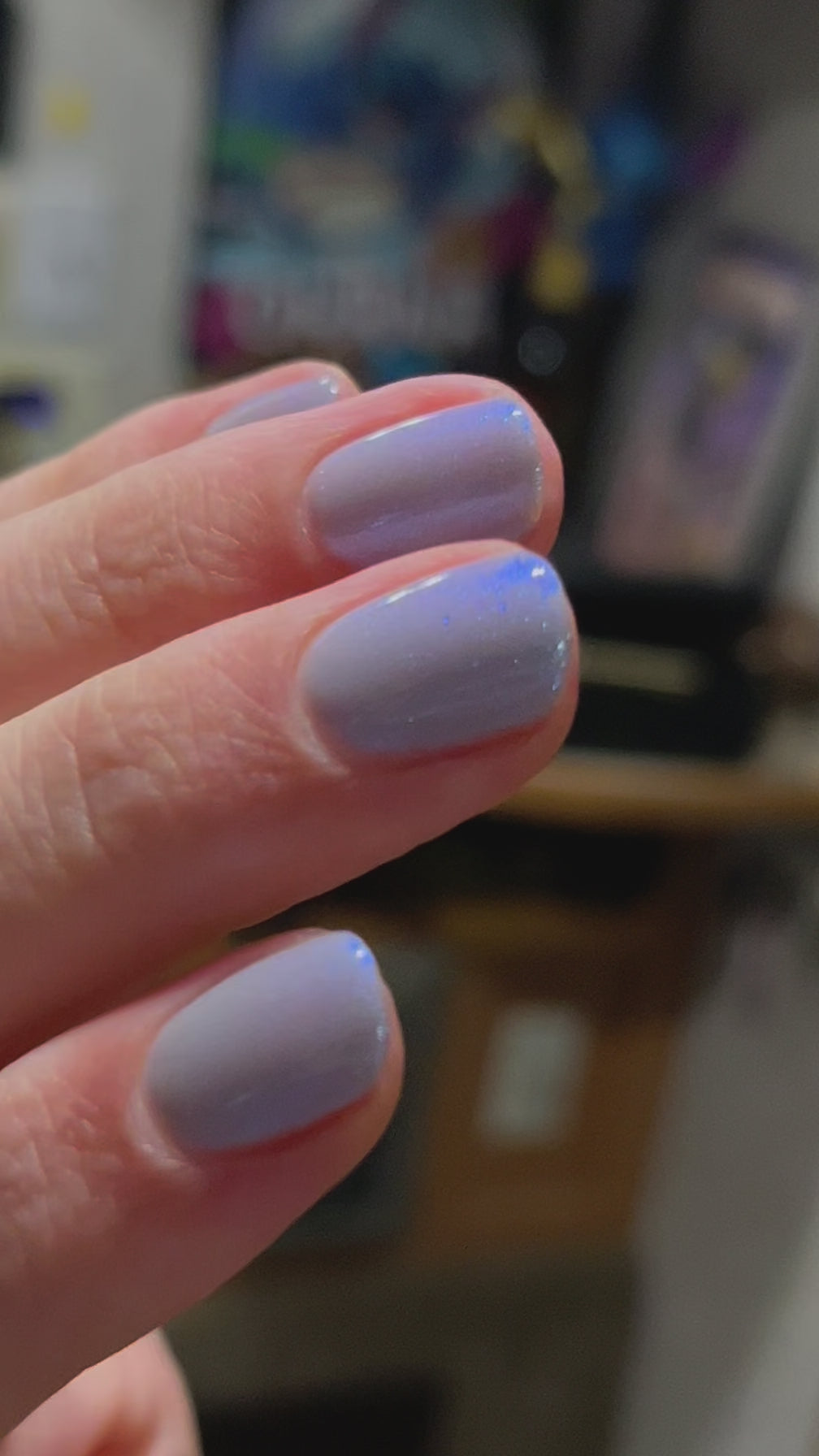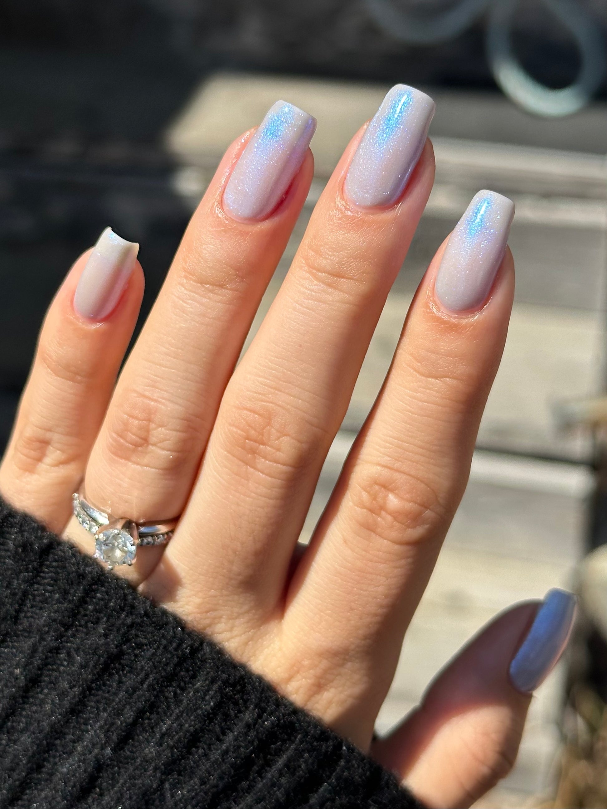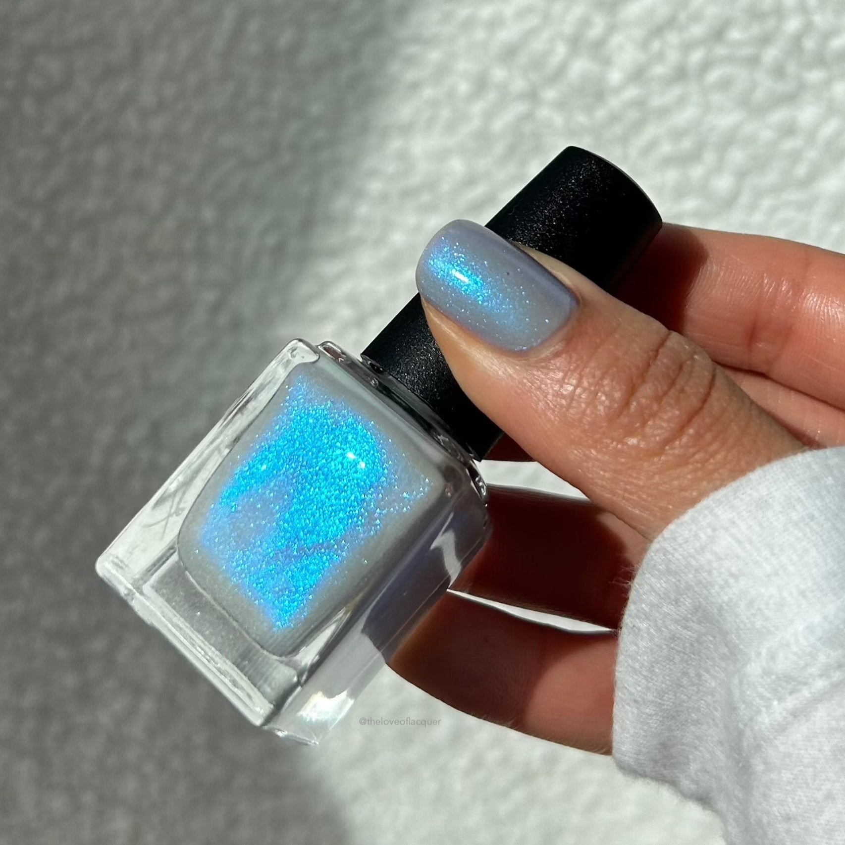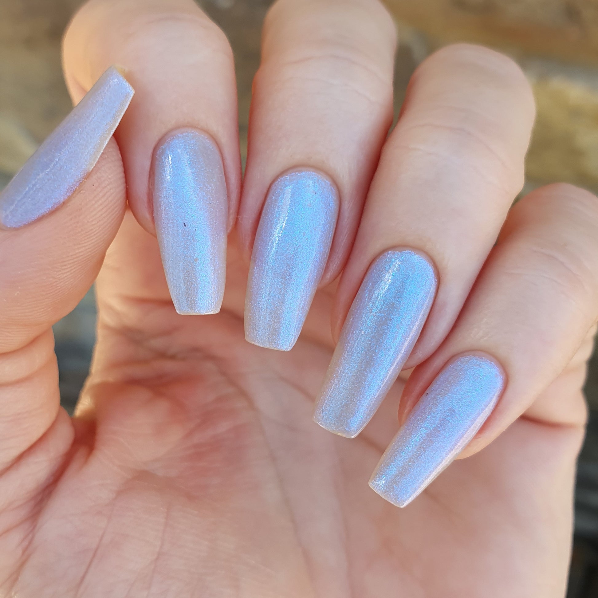 Age of the Stars has a light gray crelly base with bright blue aurora shimmer. It allows a bit of nail line to show after two coats and reaches complete opacity in three.
