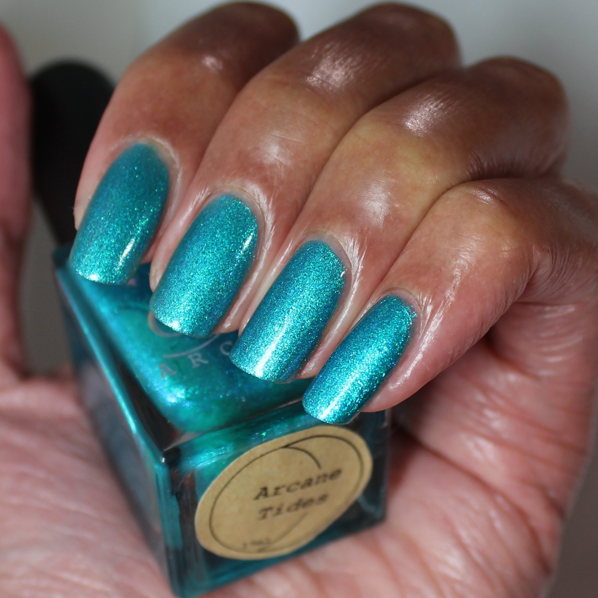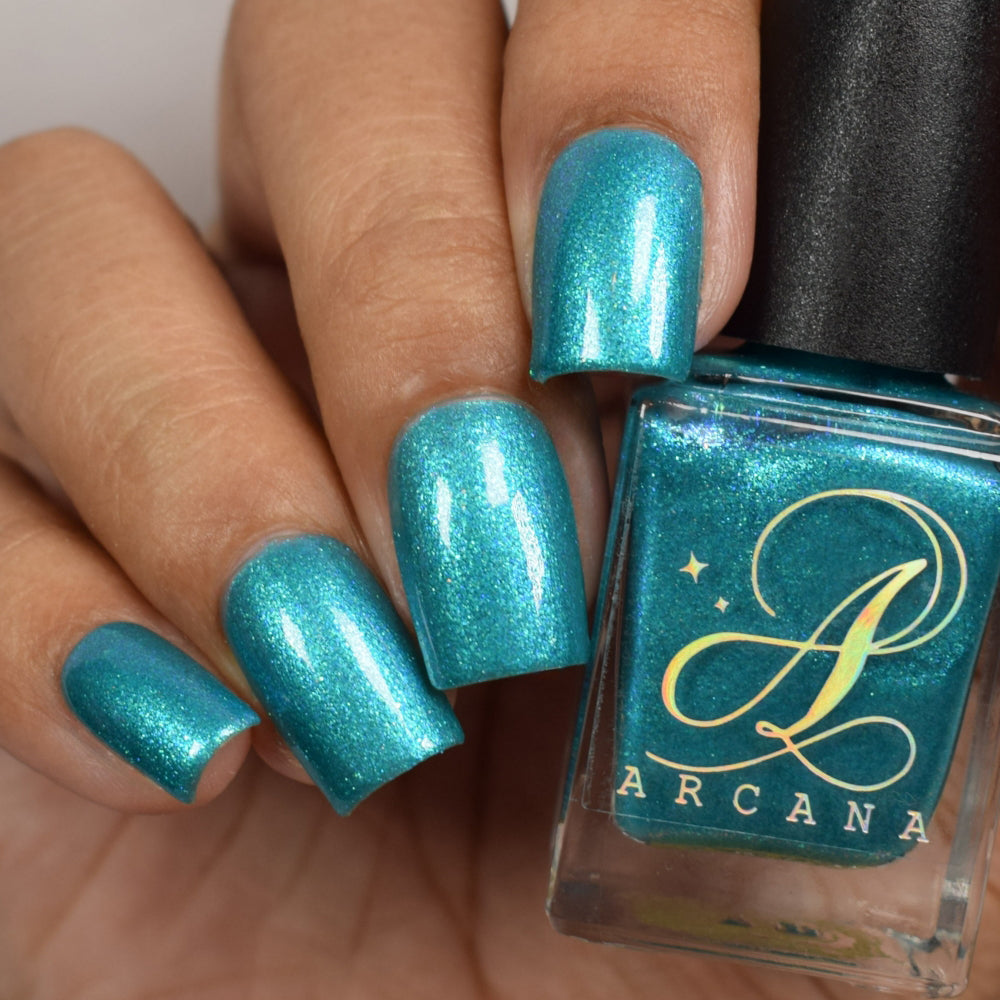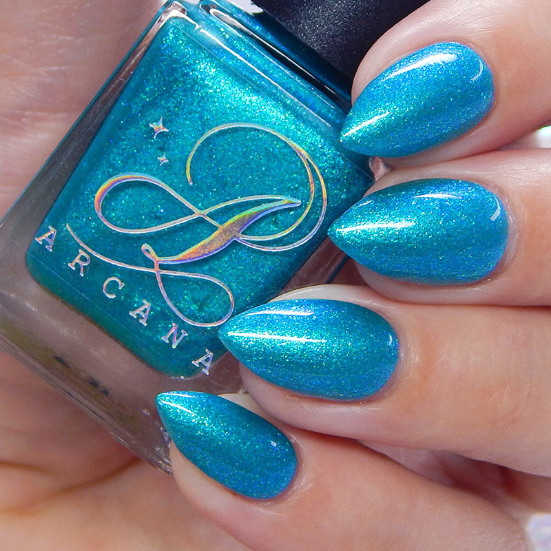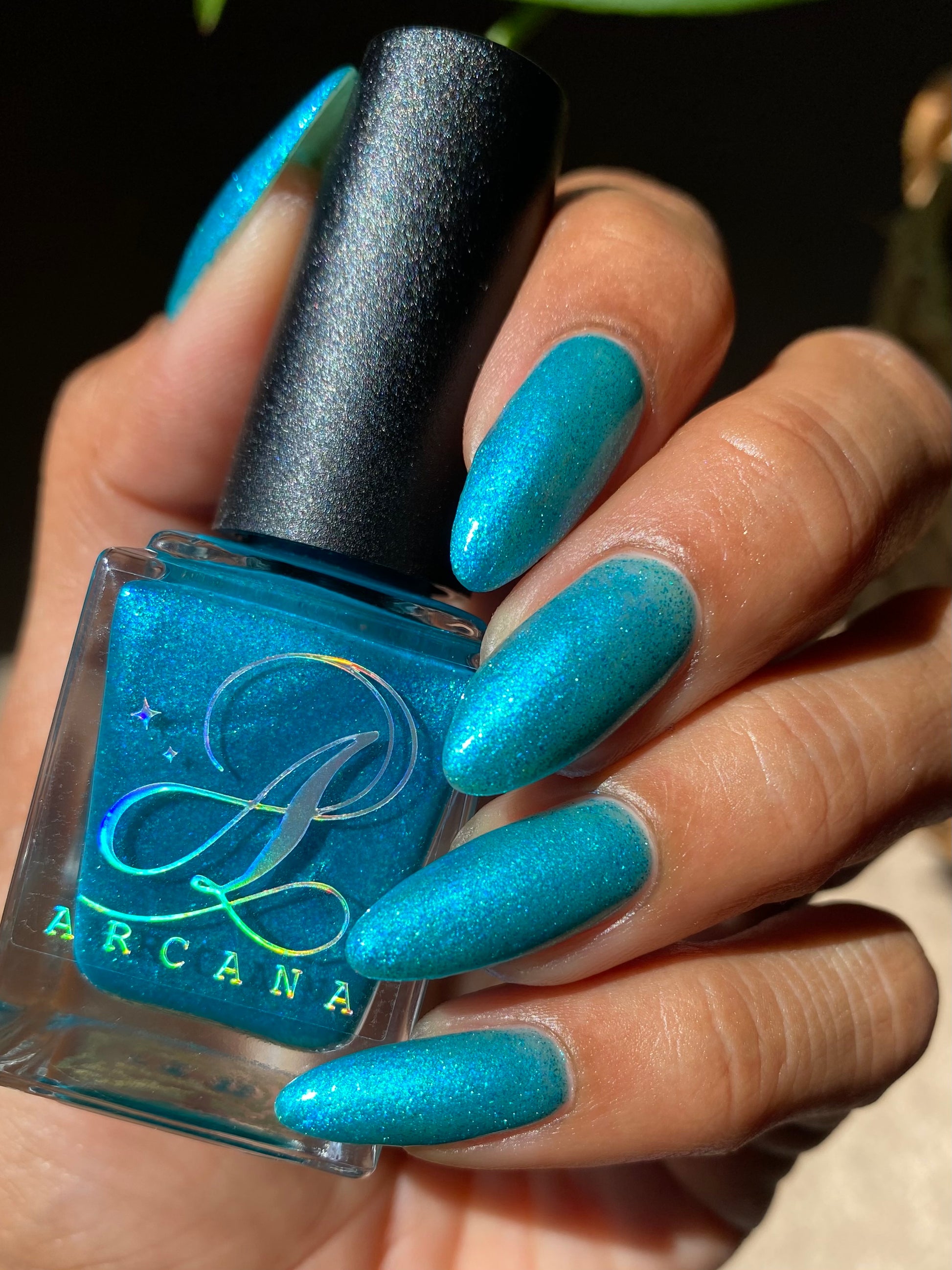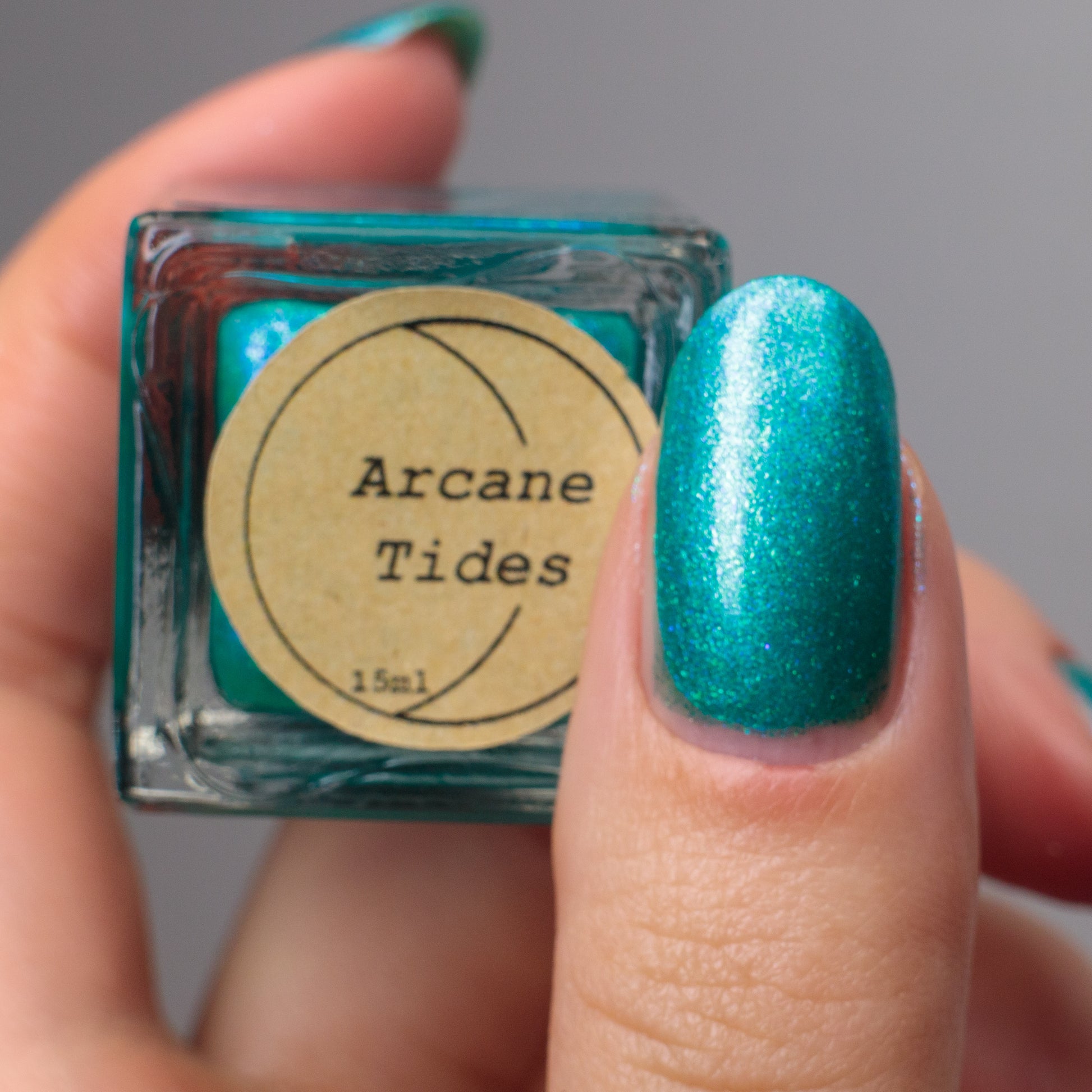 Arcane Tides is inspired by bright blue sparkling ocean water. This polish has a teal base with a teal to blue shimmer and teal metallic glitter!