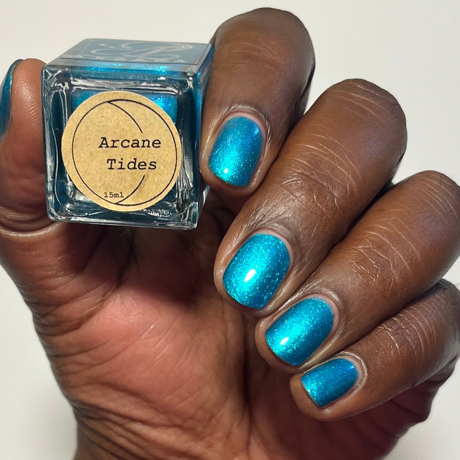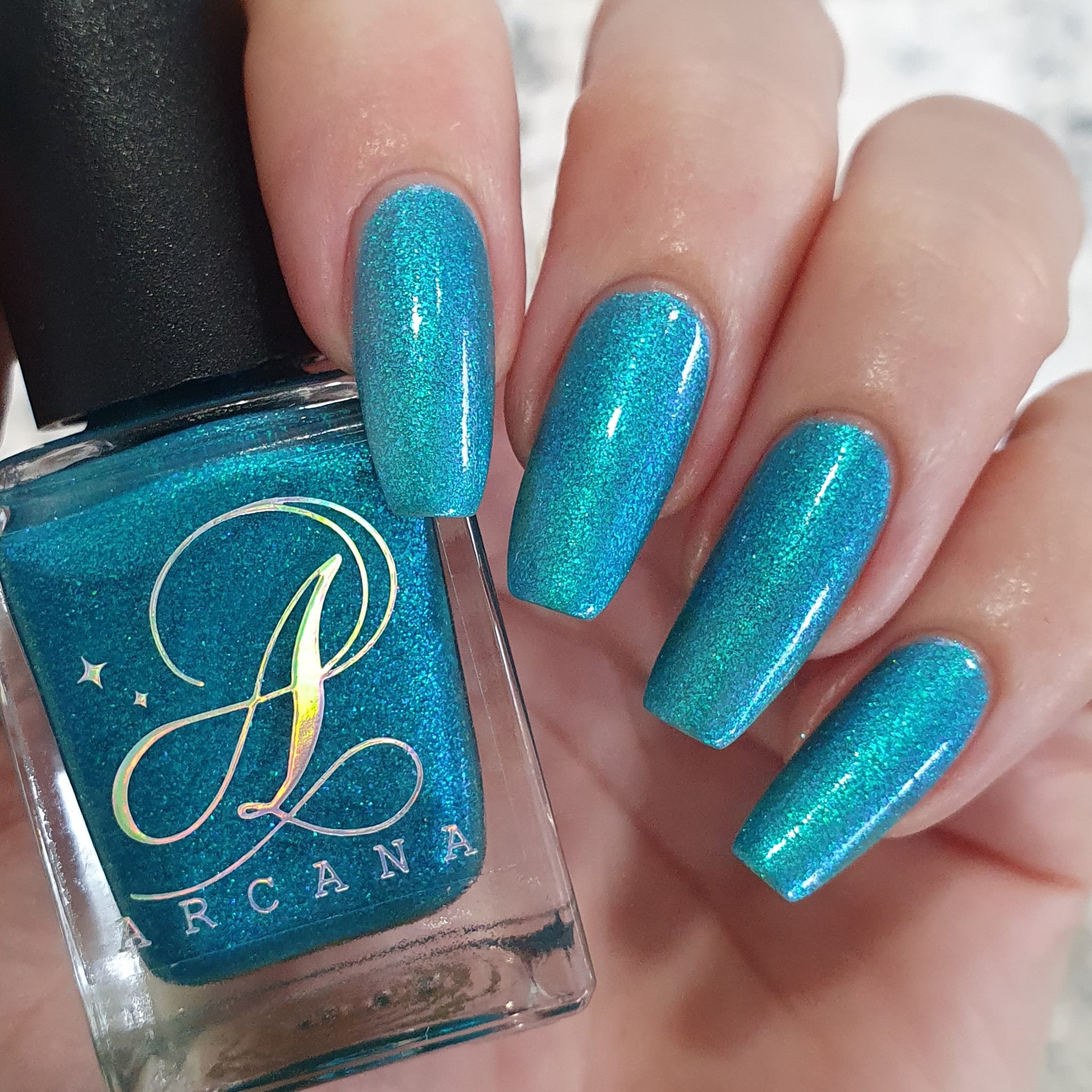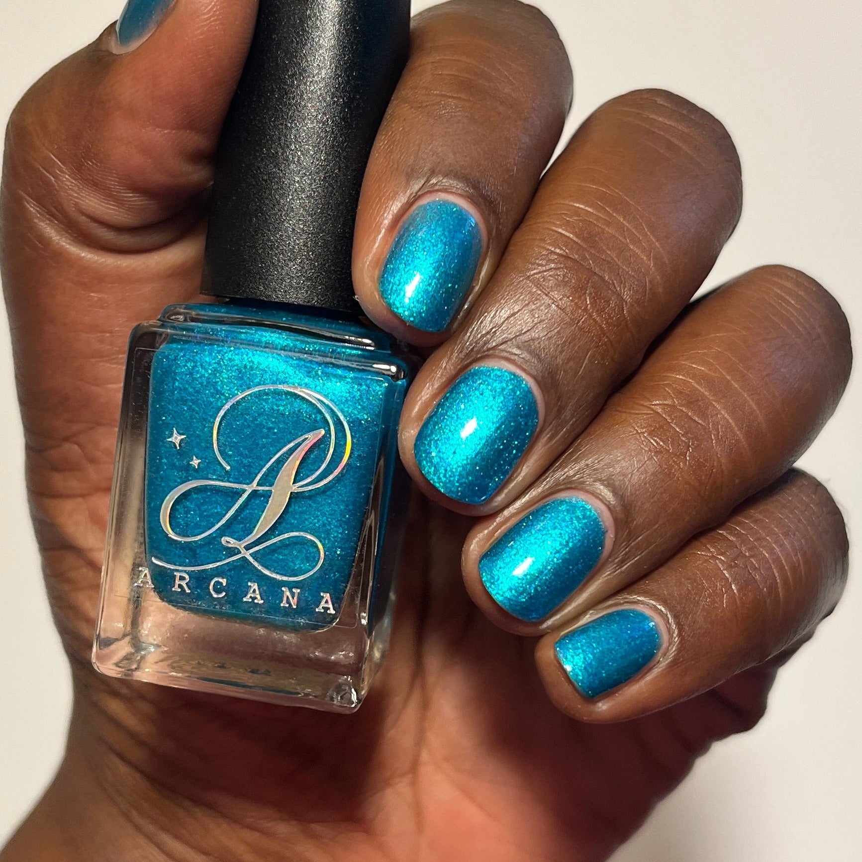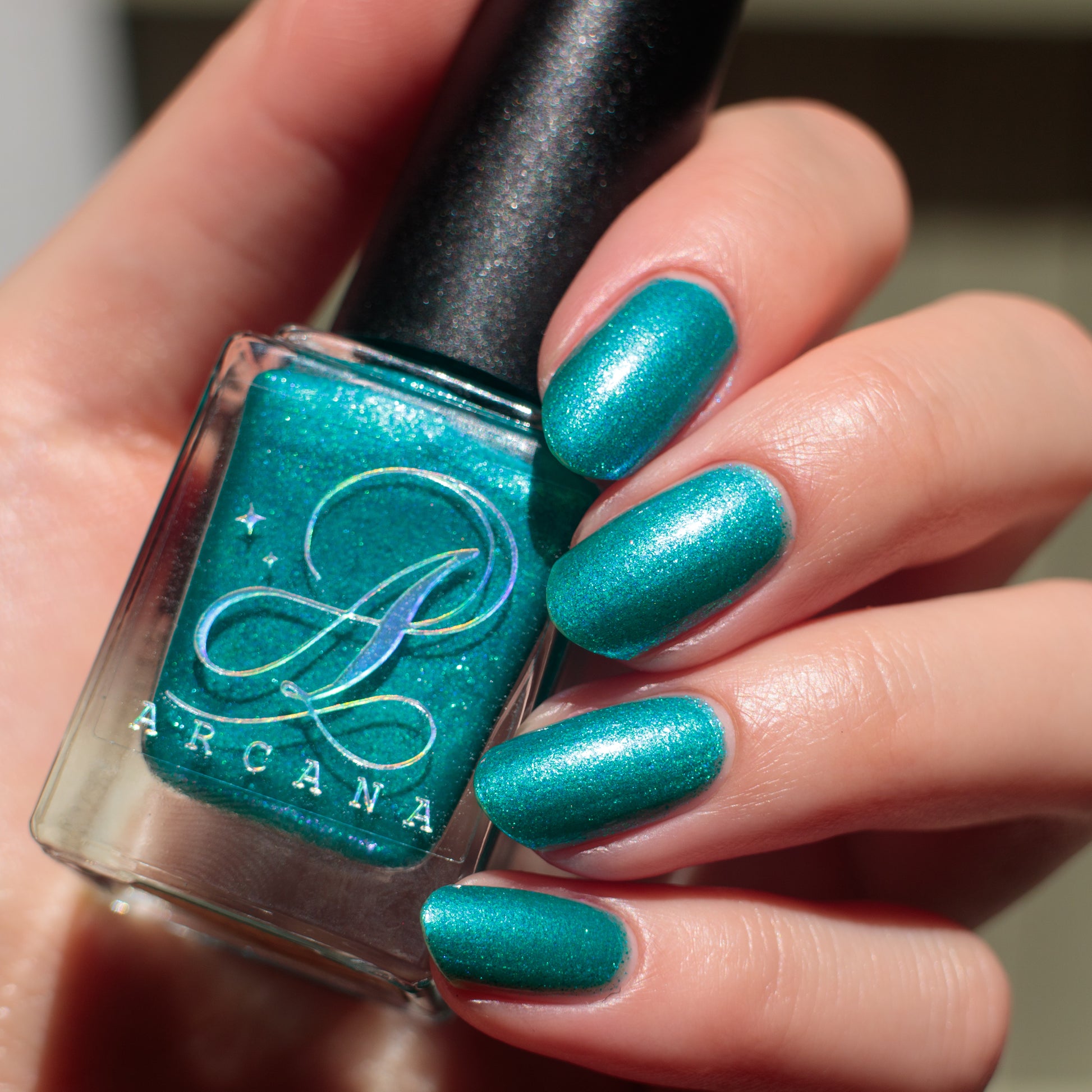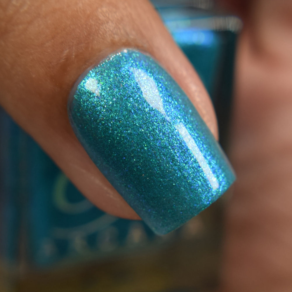 Arcane Tides is inspired by bright blue sparkling ocean water. This polish has a teal base with a teal to blue shimmer and teal metallic glitter!