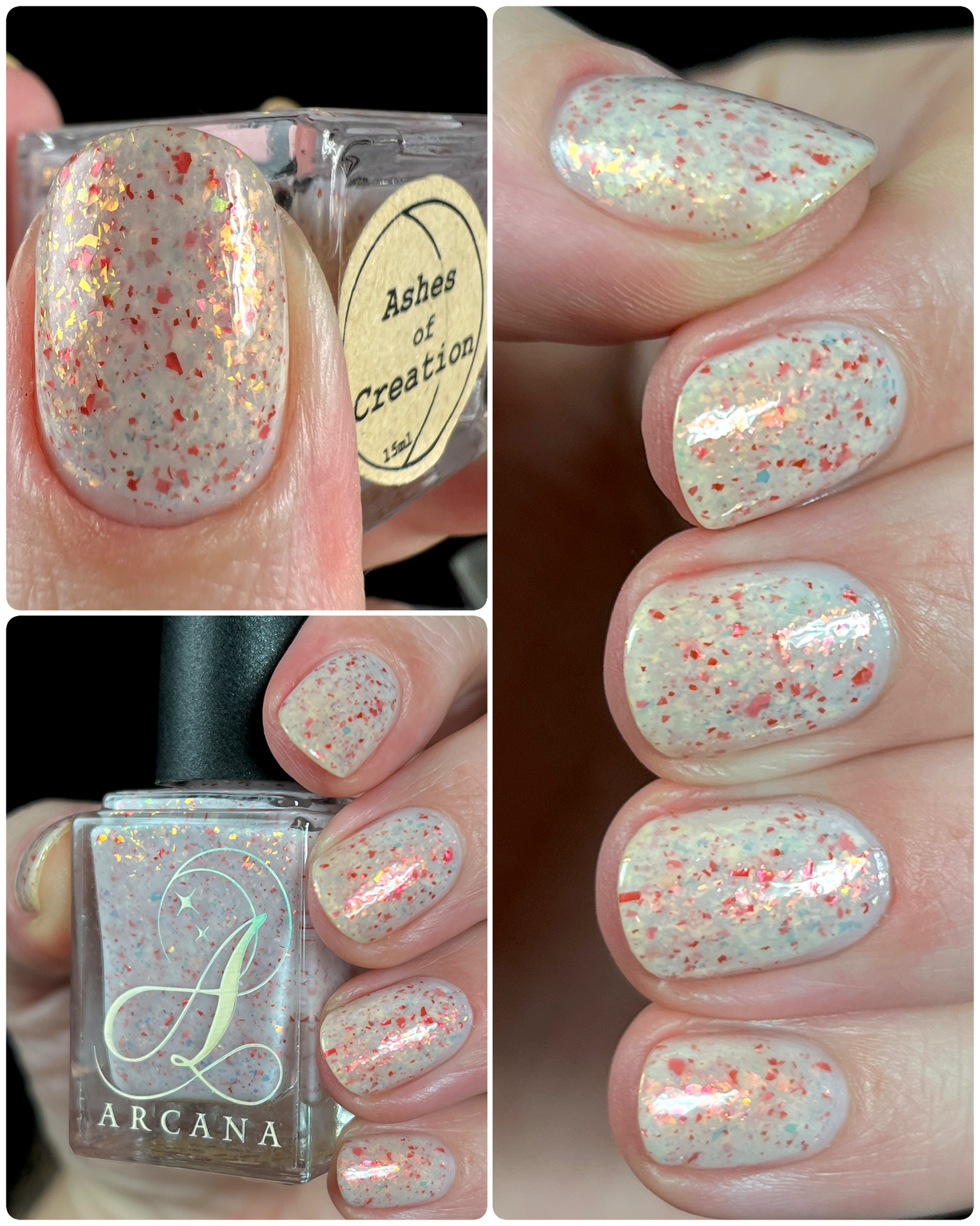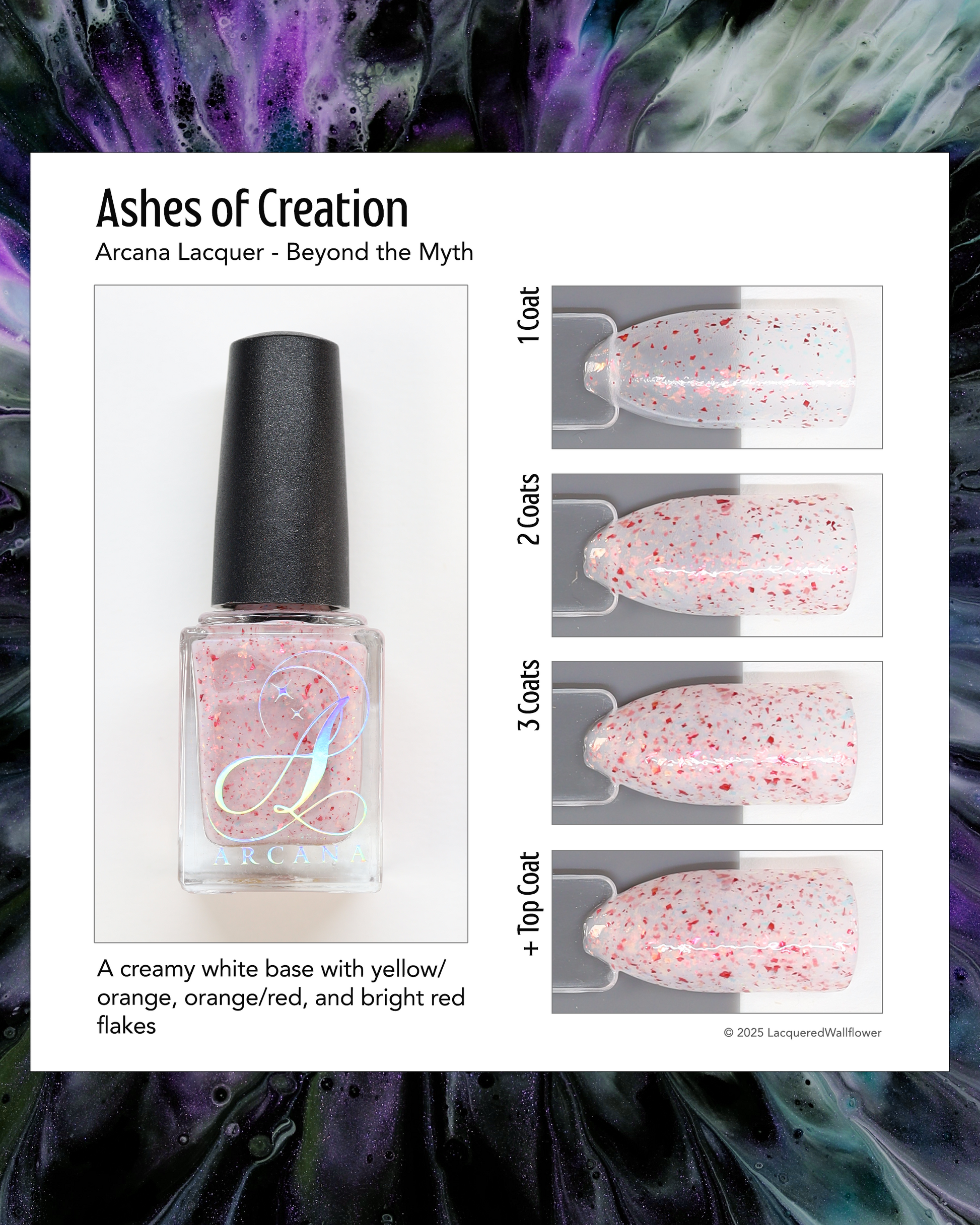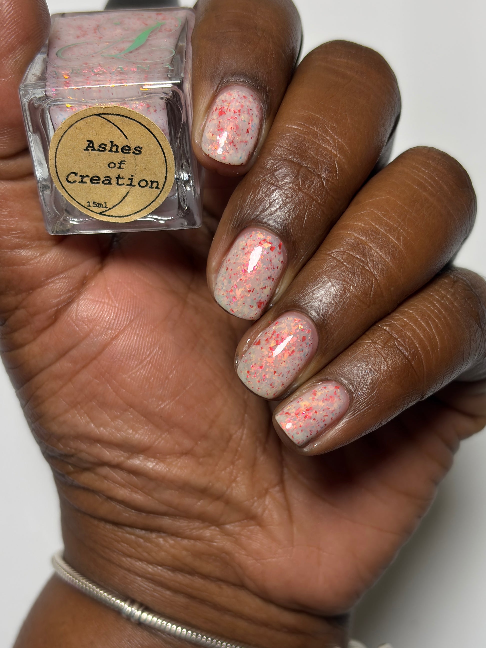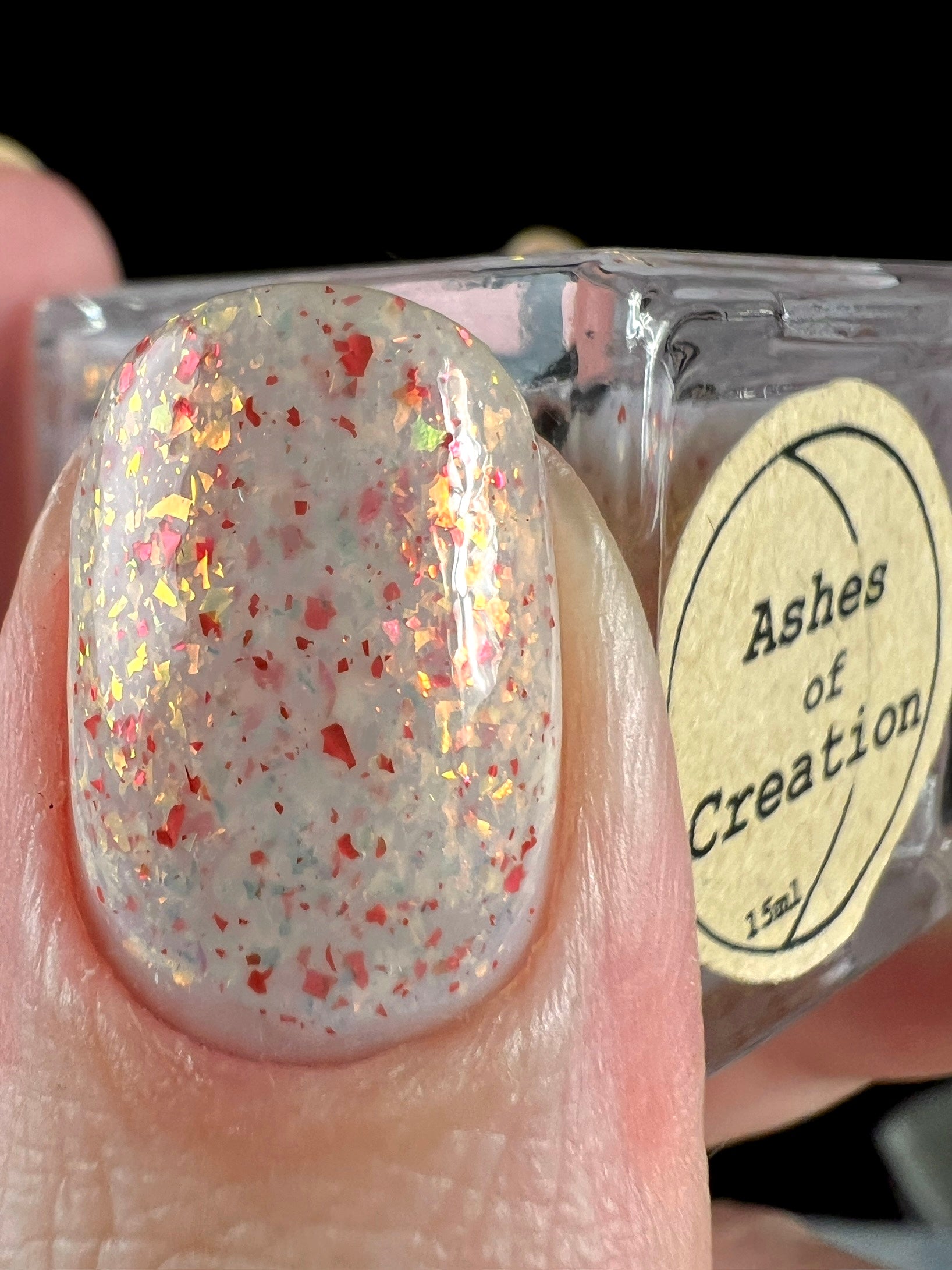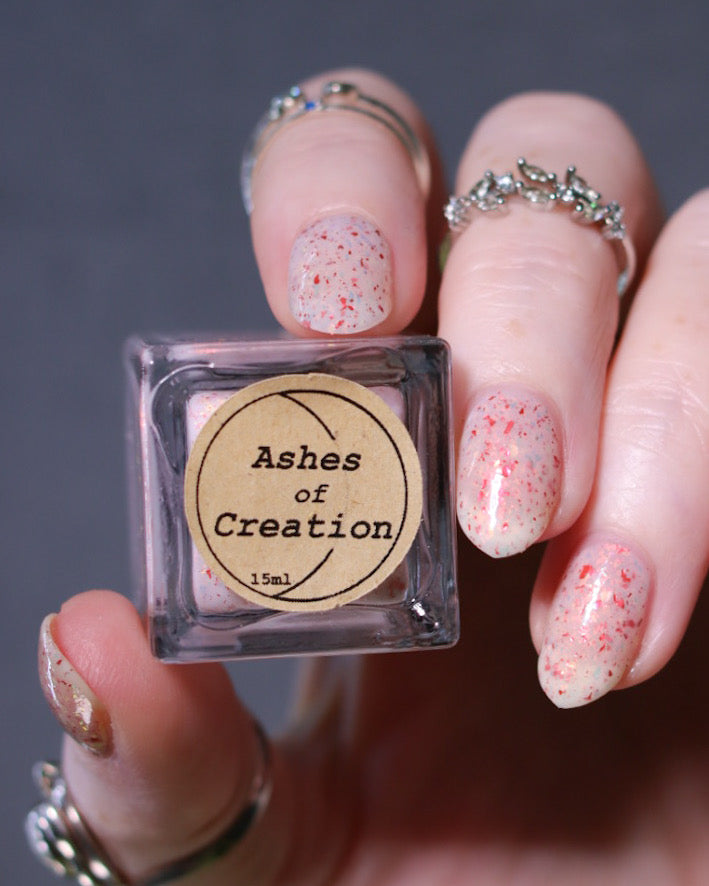 Ashes of Creation has a white crelly base with yellow/orange, orange/red, and bright red metallic flakes!