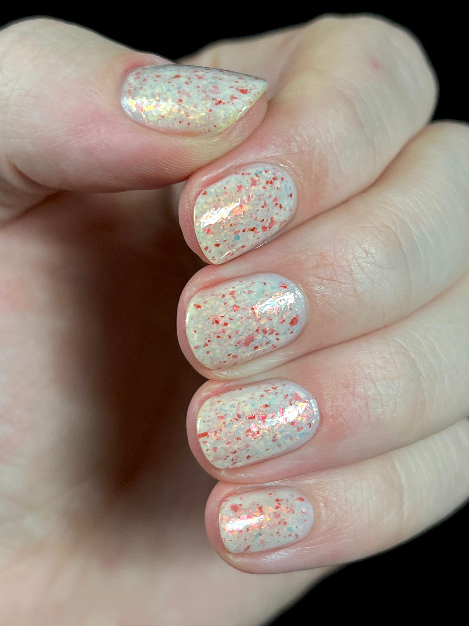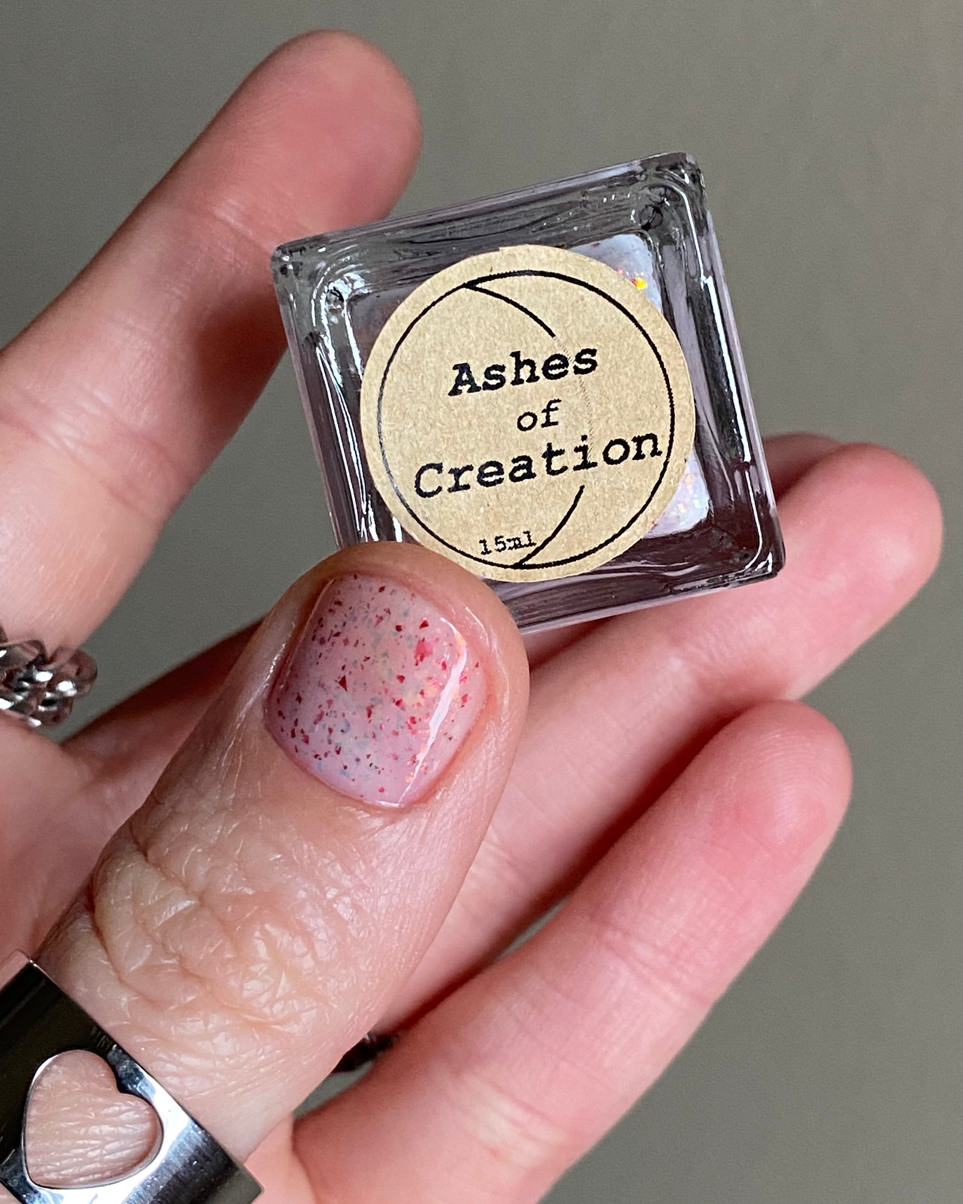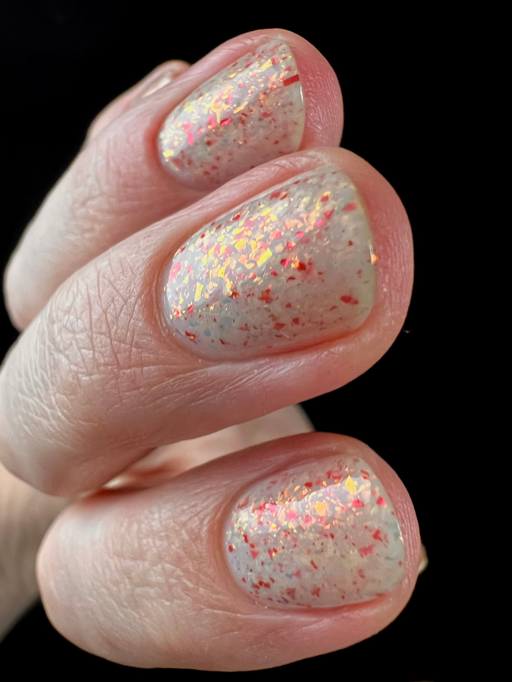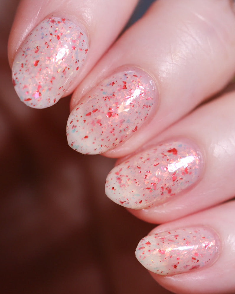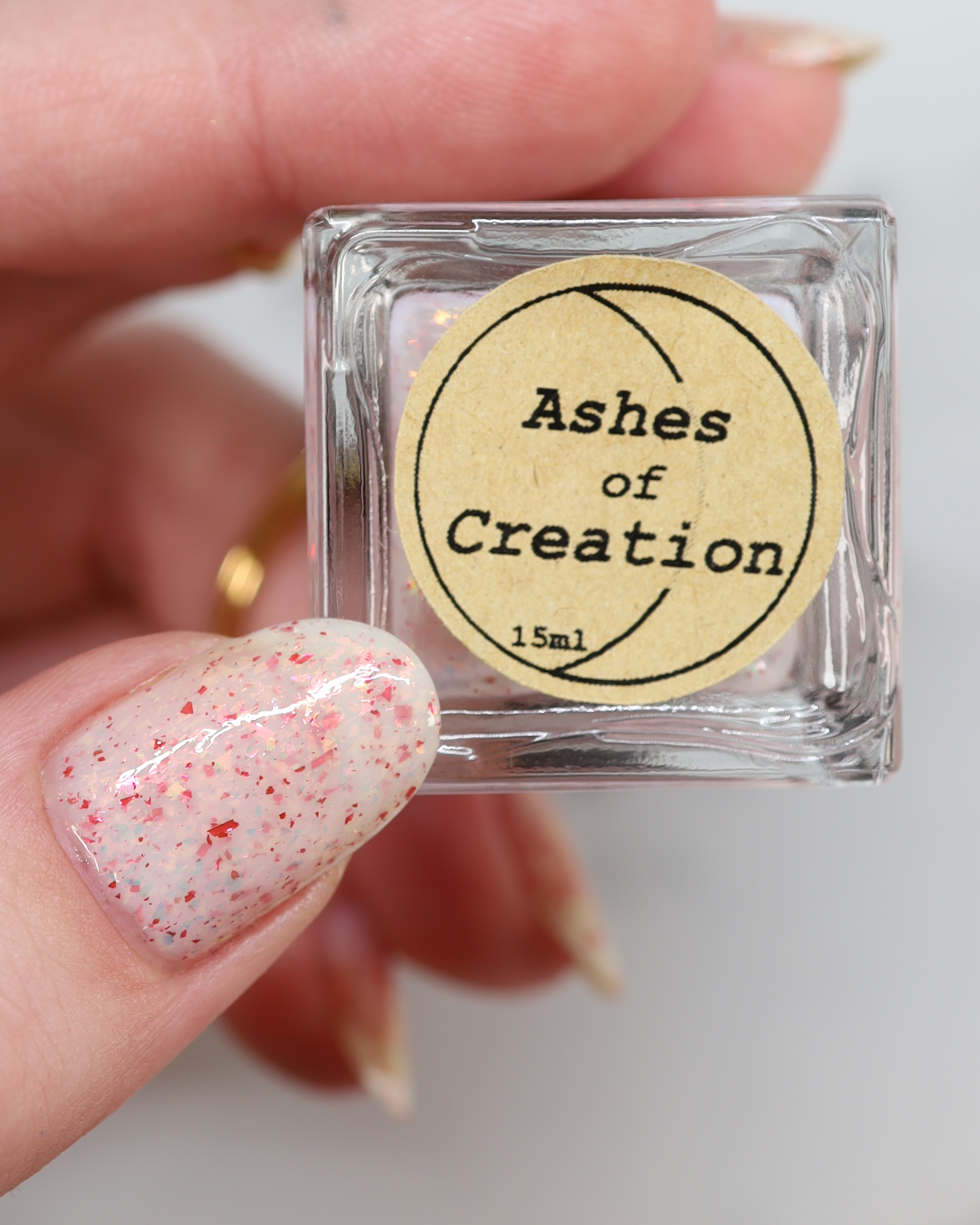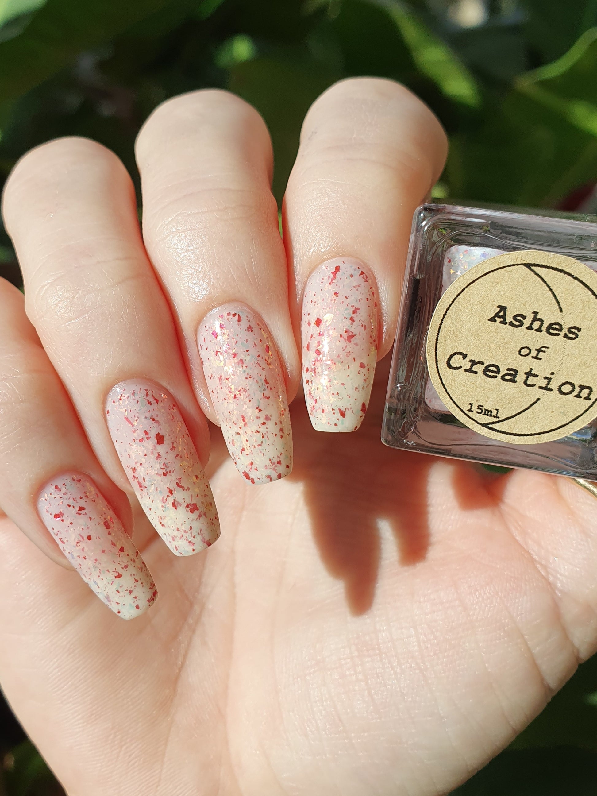 Ashes of Creation has a white crelly base with yellow/orange, orange/red, and bright red metallic flakes!