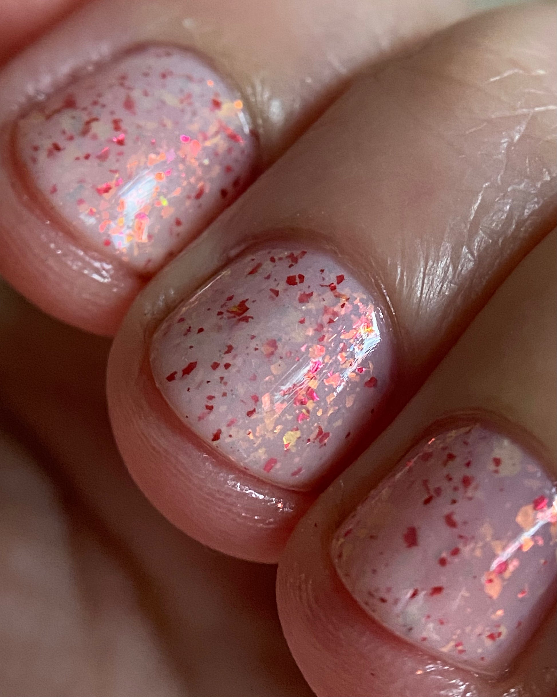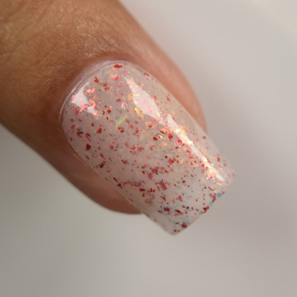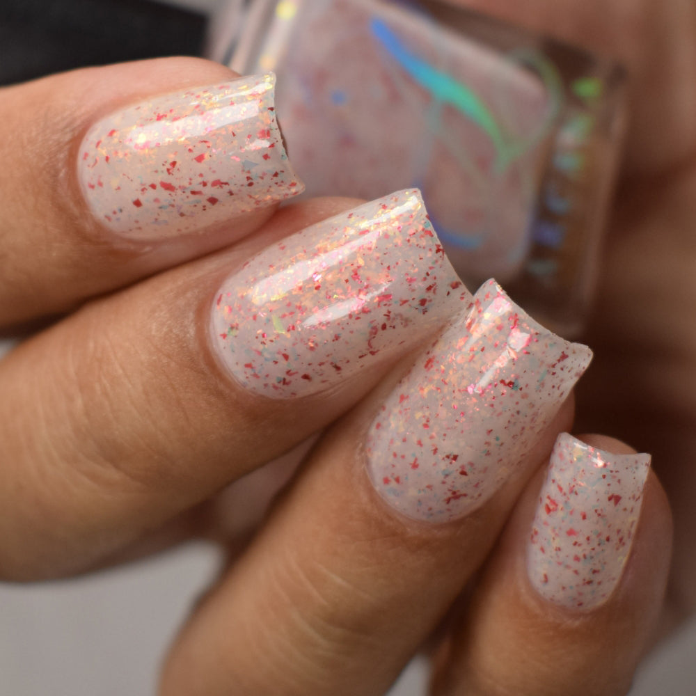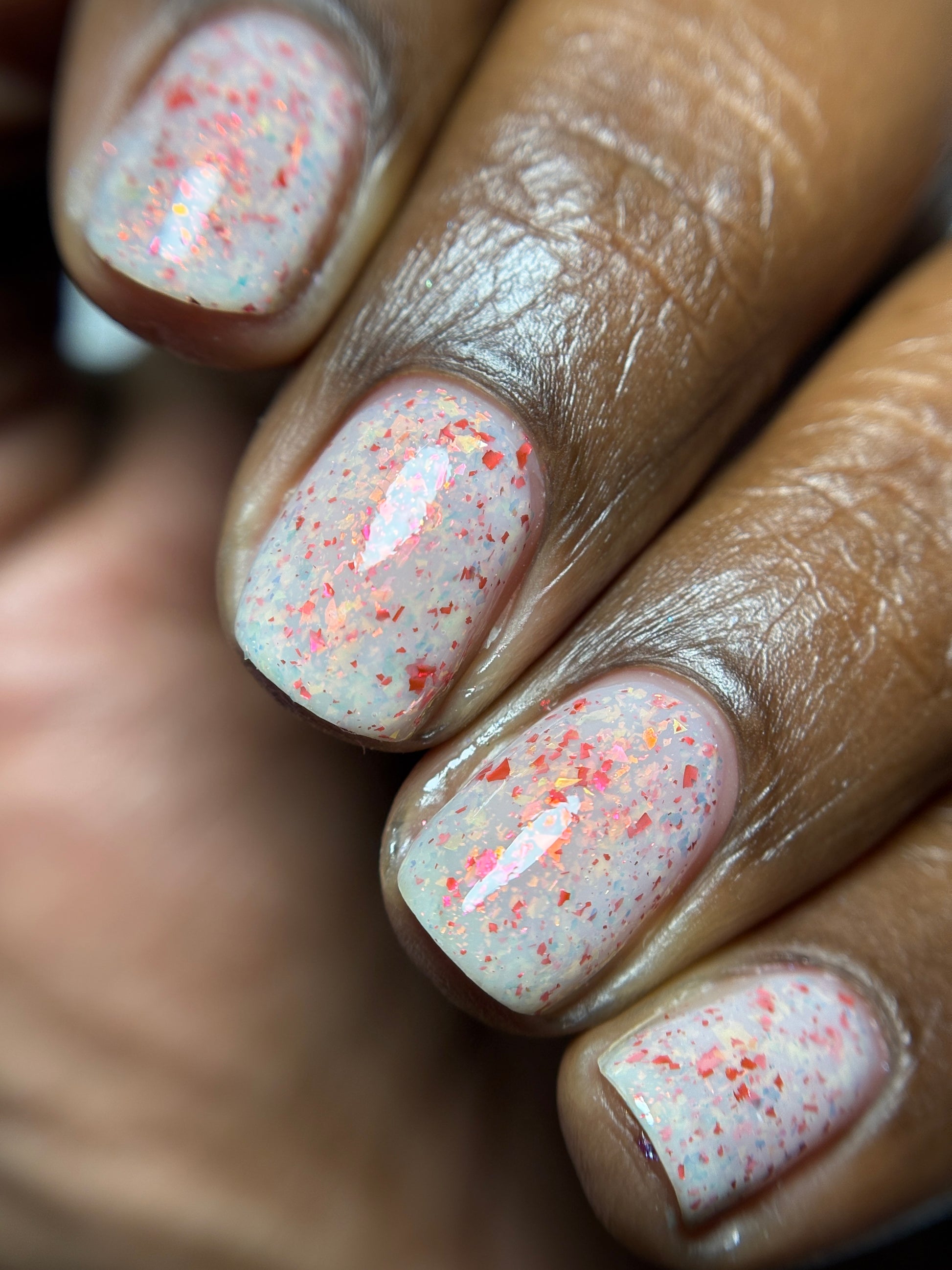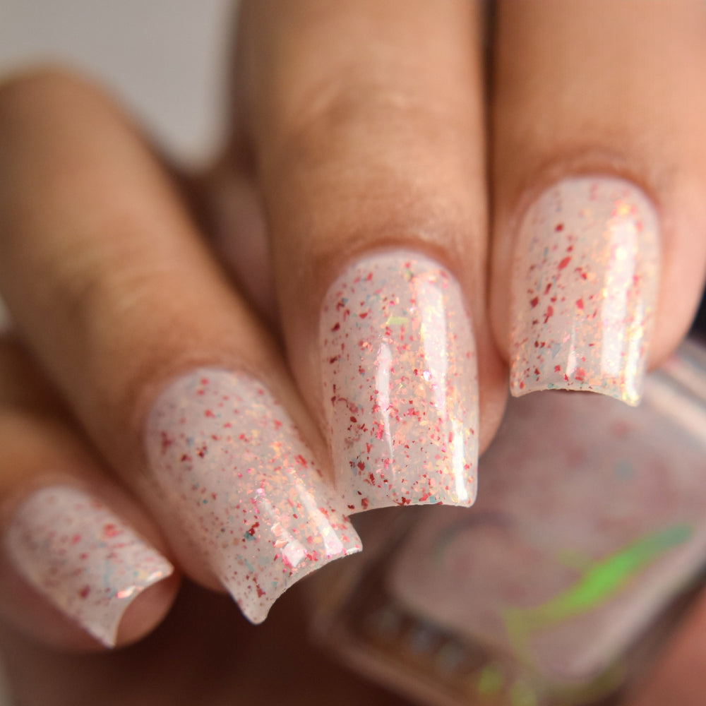 Ashes of Creation has a white crelly base with yellow/orange, orange/red, and bright red metallic flakes!