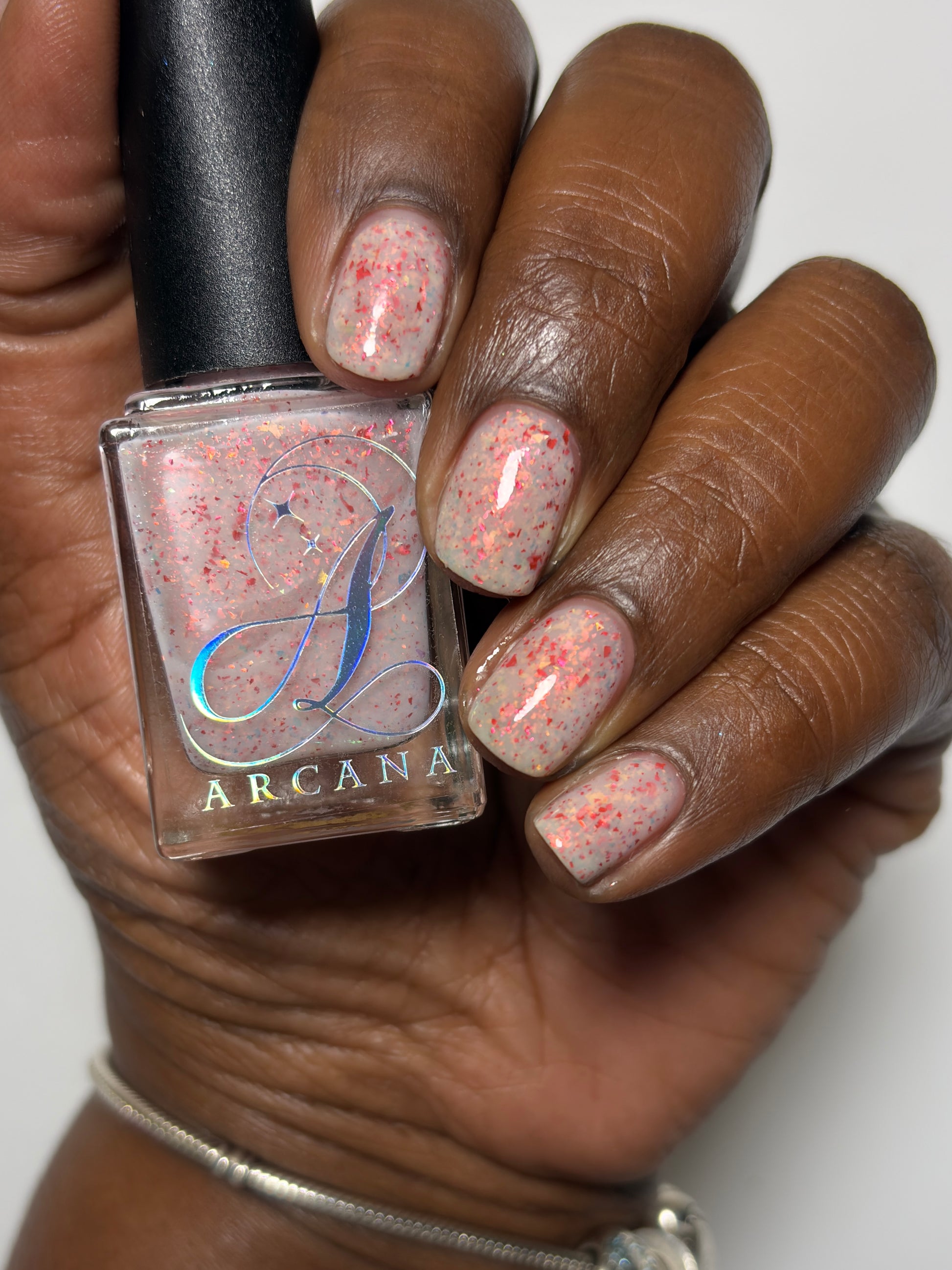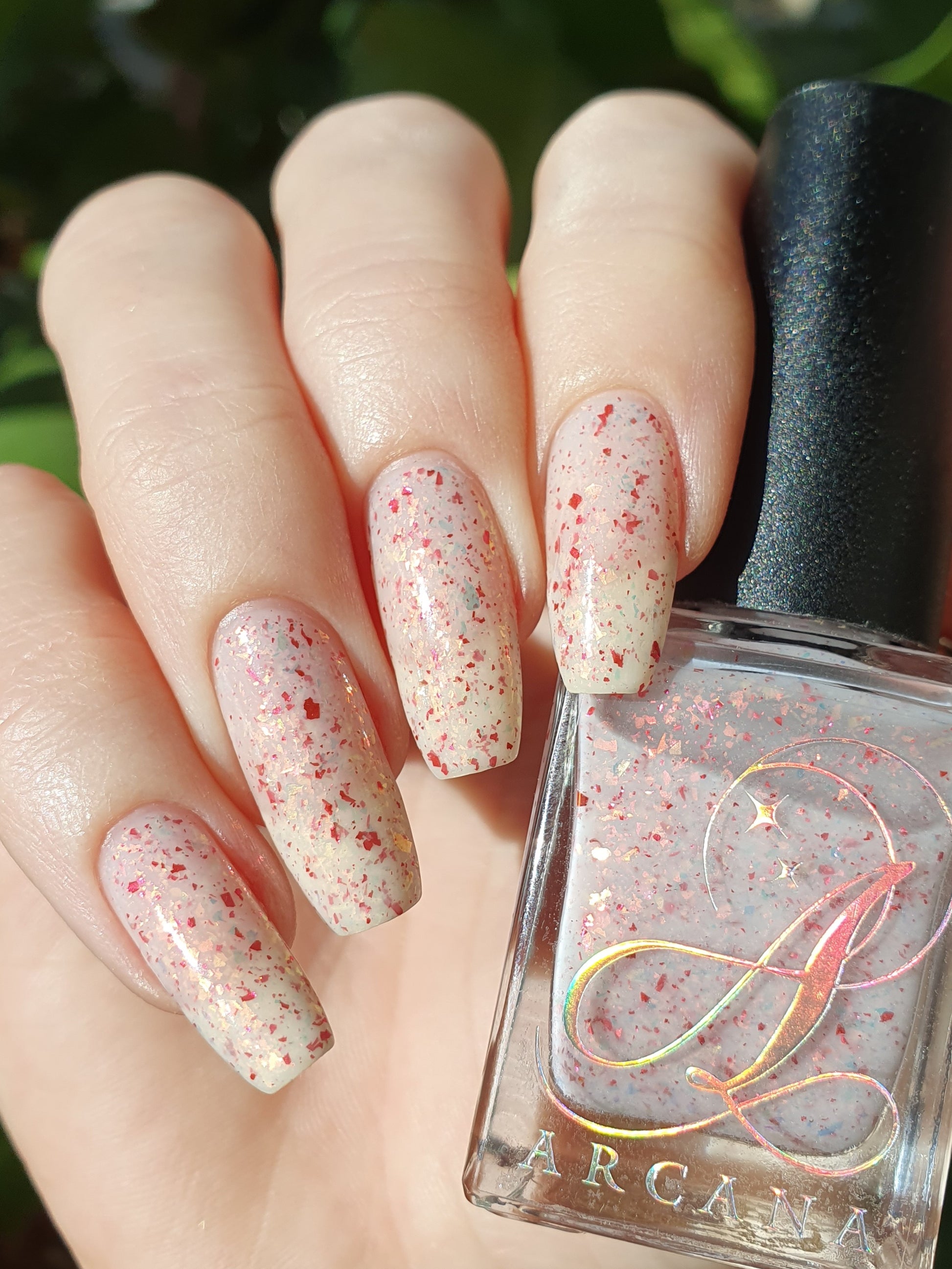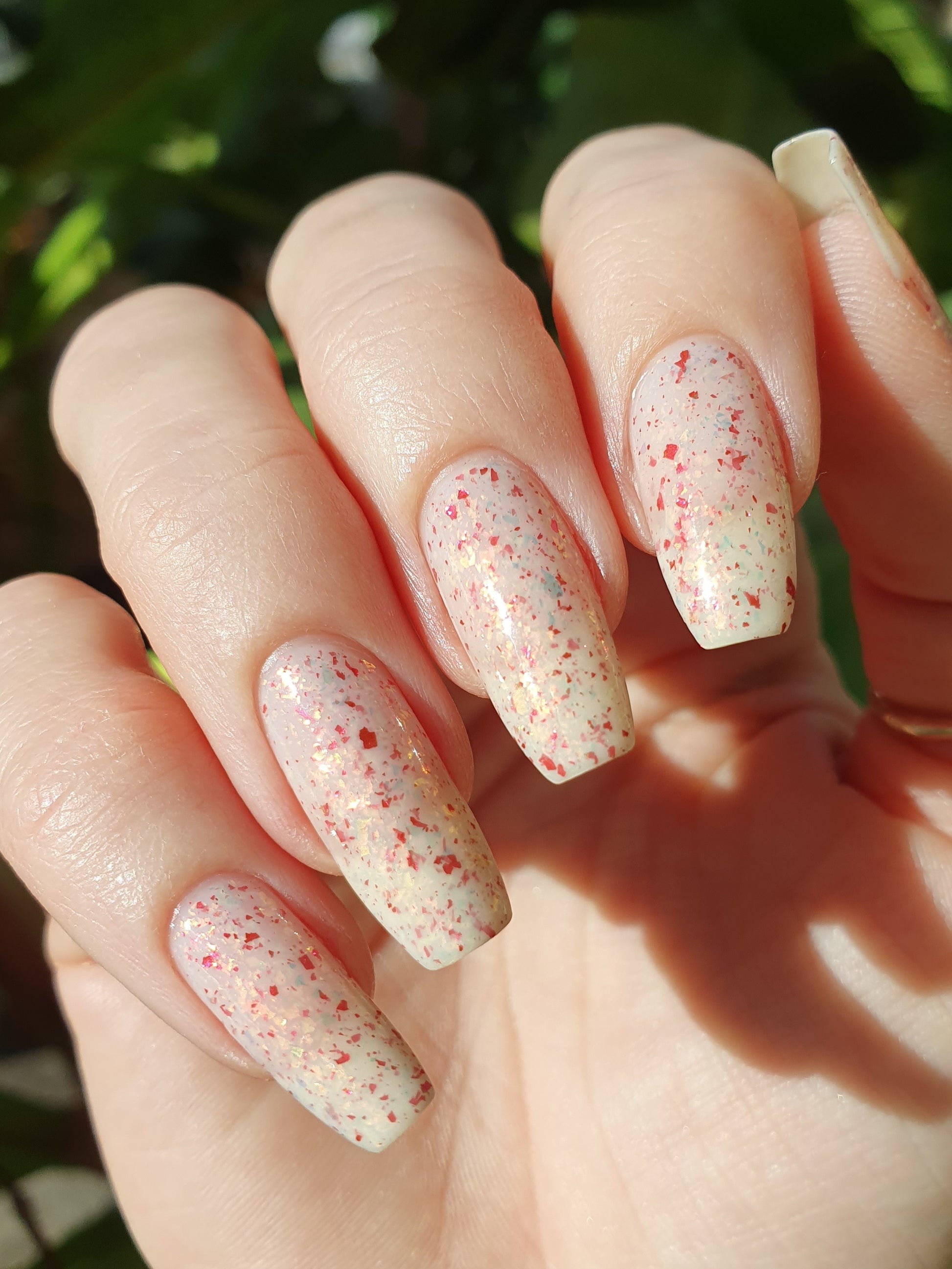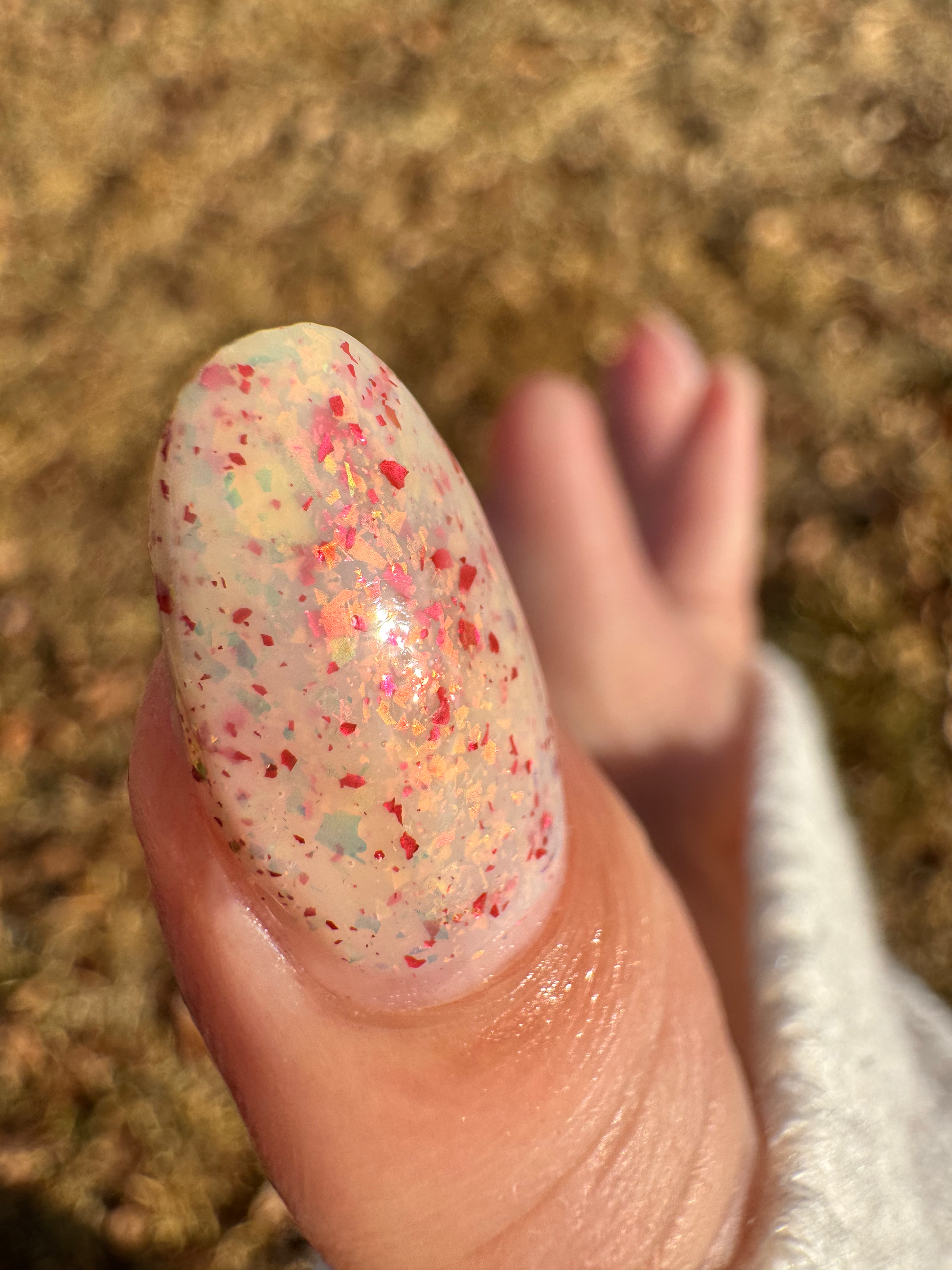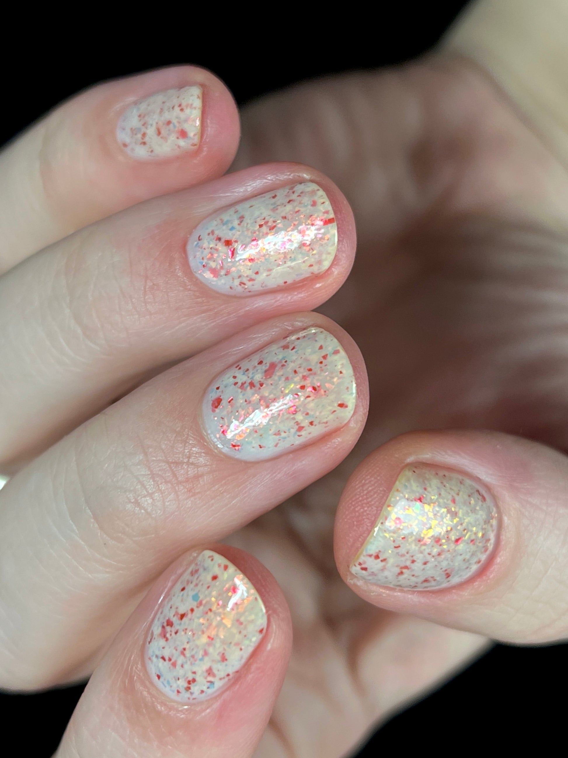 Ashes of Creation has a white crelly base with yellow/orange, orange/red, and bright red metallic flakes!