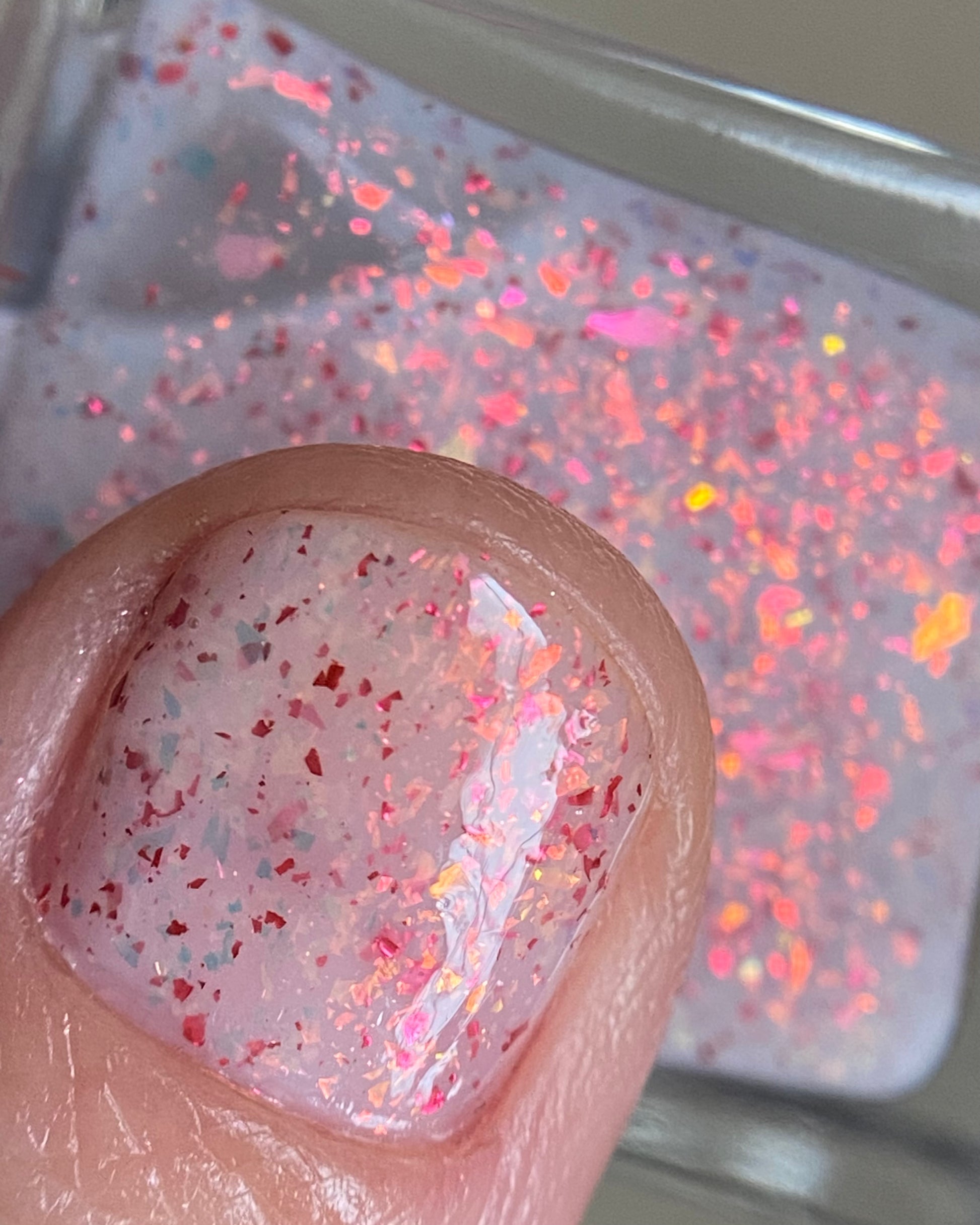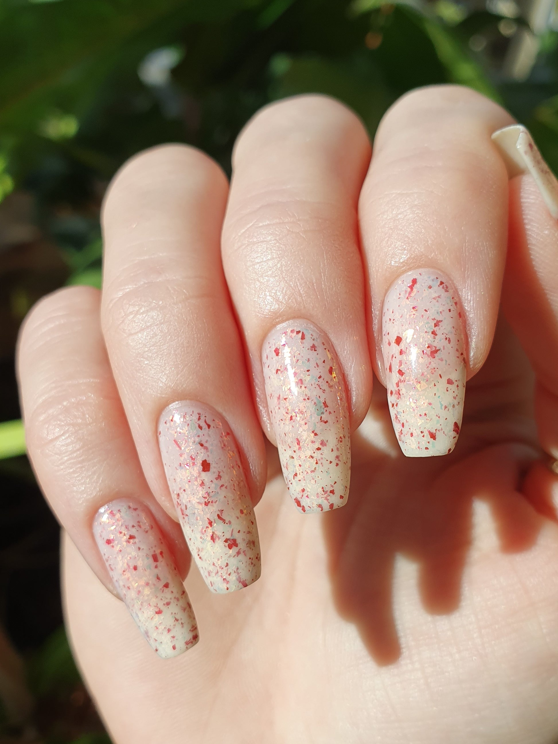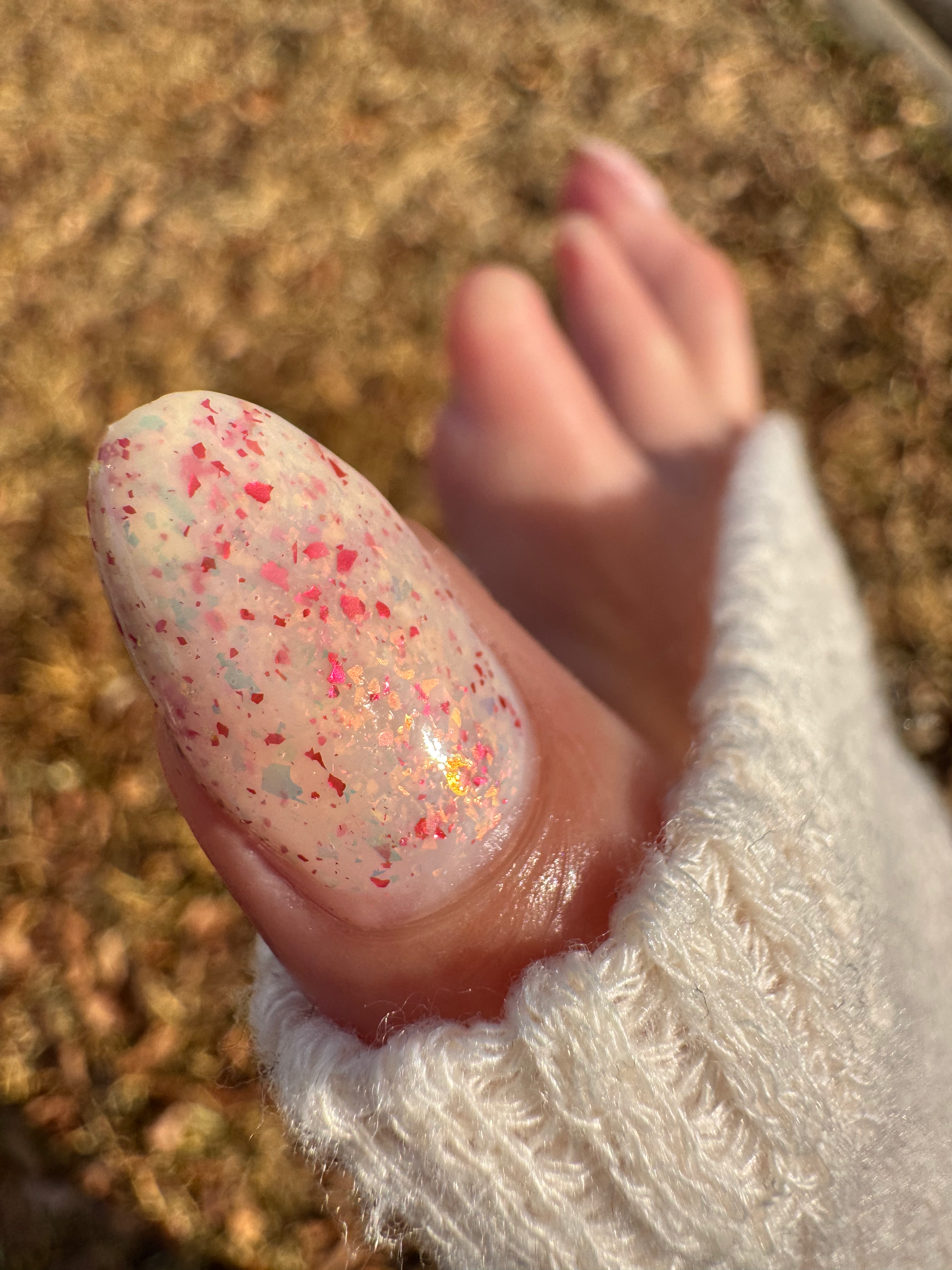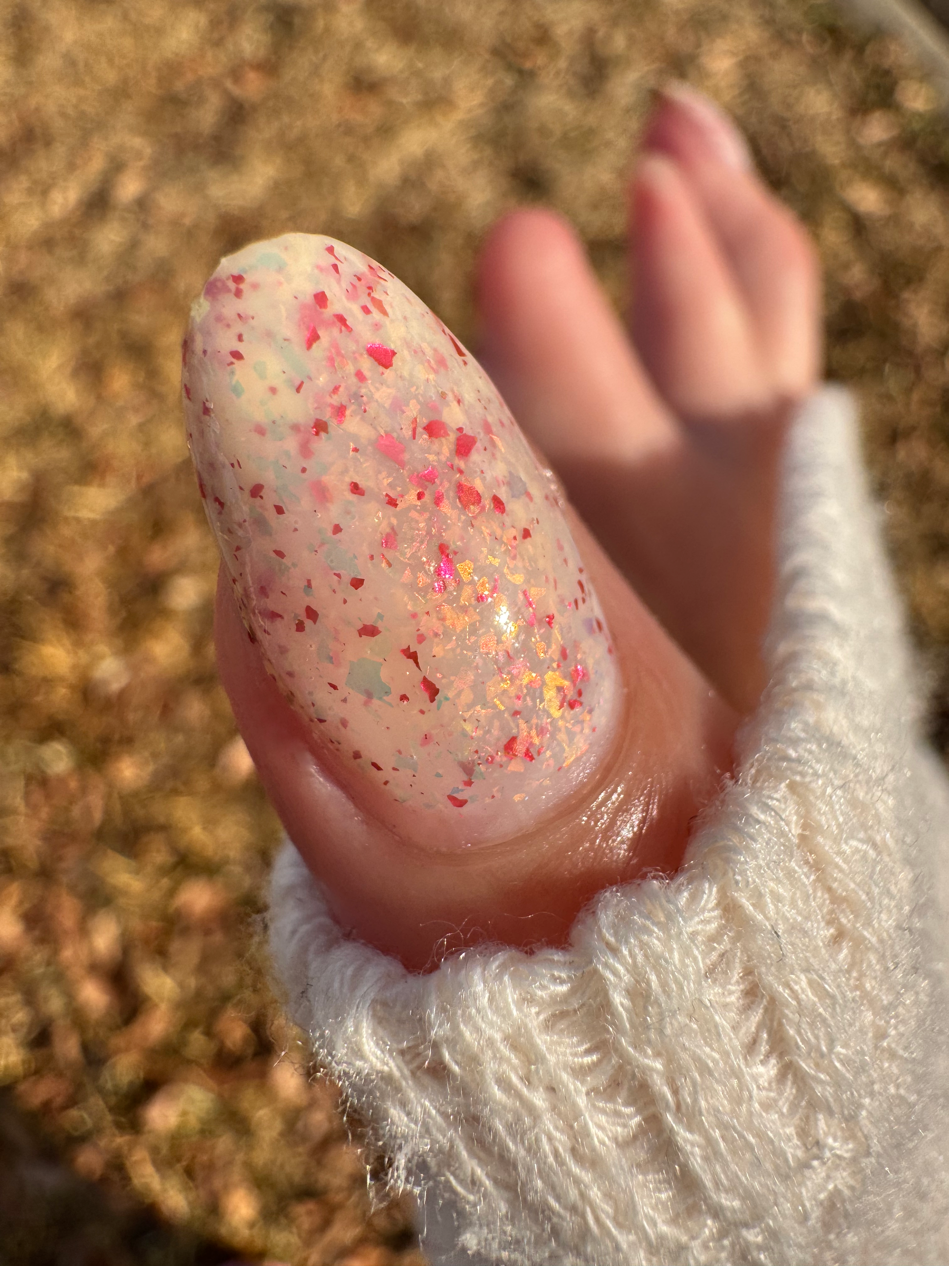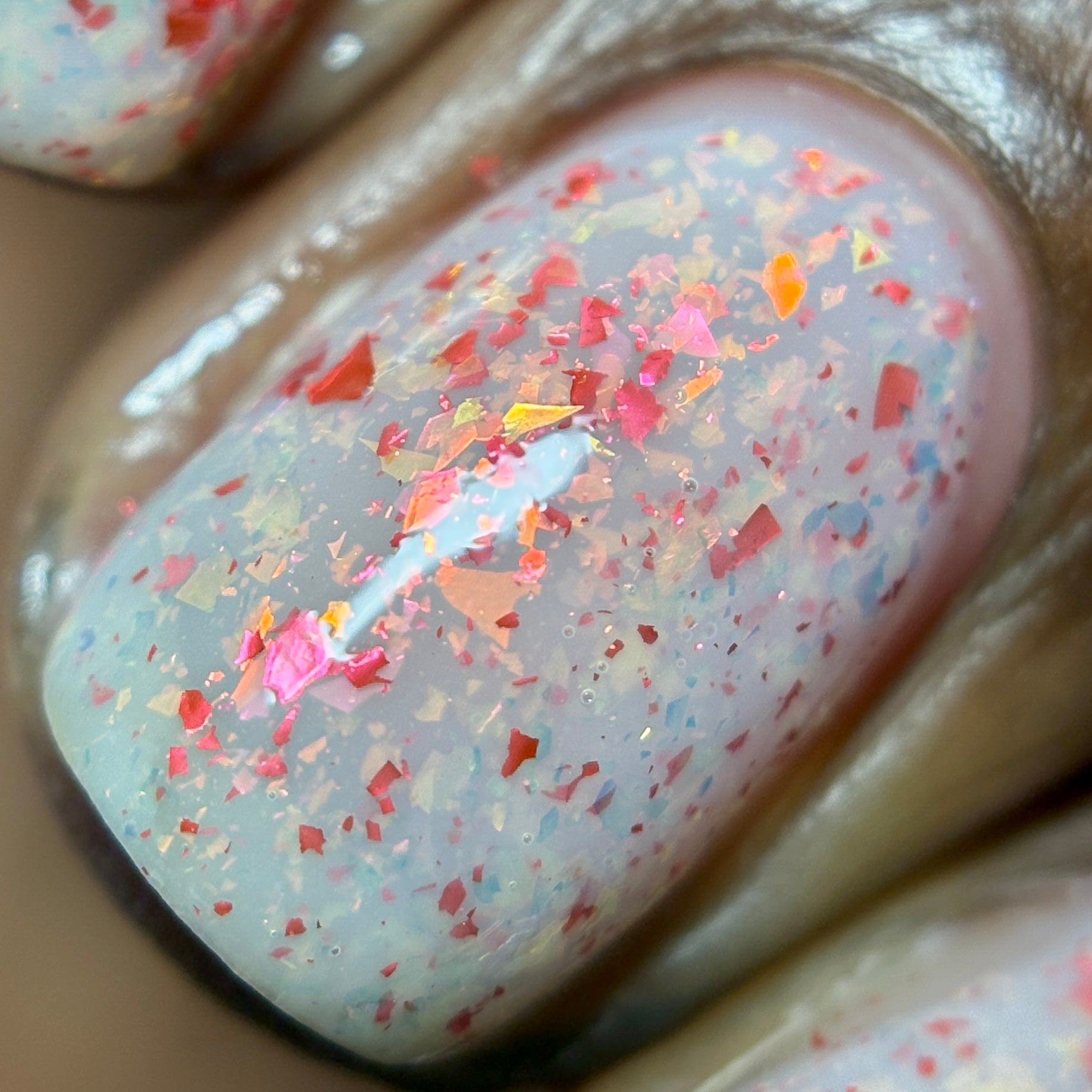 Ashes of Creation has a white crelly base with yellow/orange, orange/red, and bright red metallic flakes!
