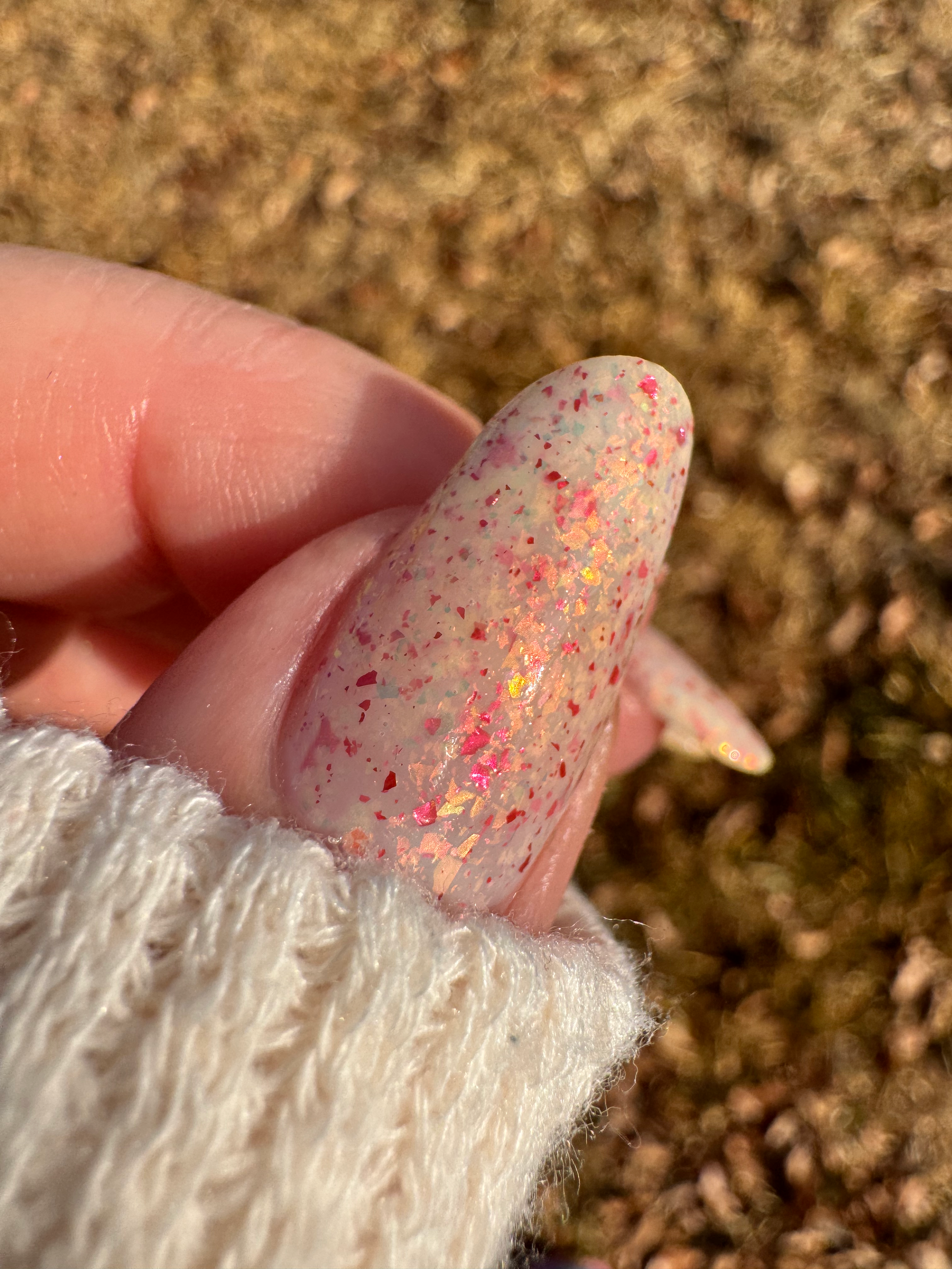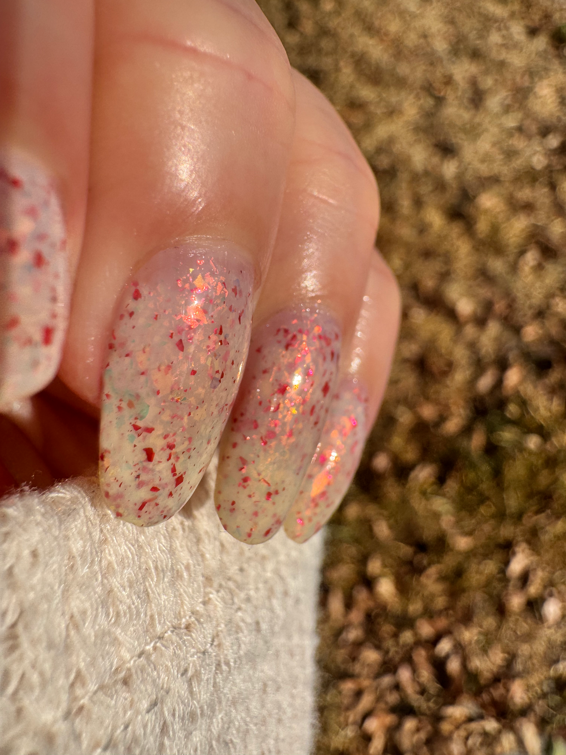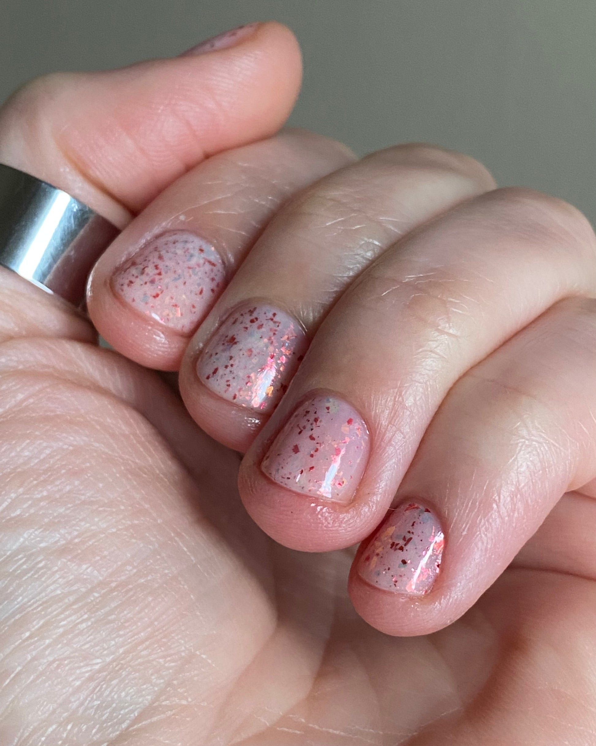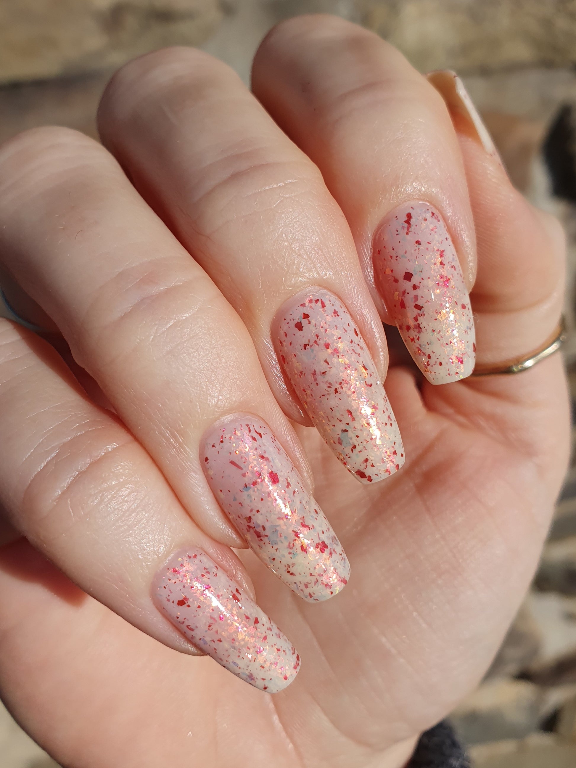 Ashes of Creation has a white crelly base with yellow/orange, orange/red, and bright red metallic flakes!