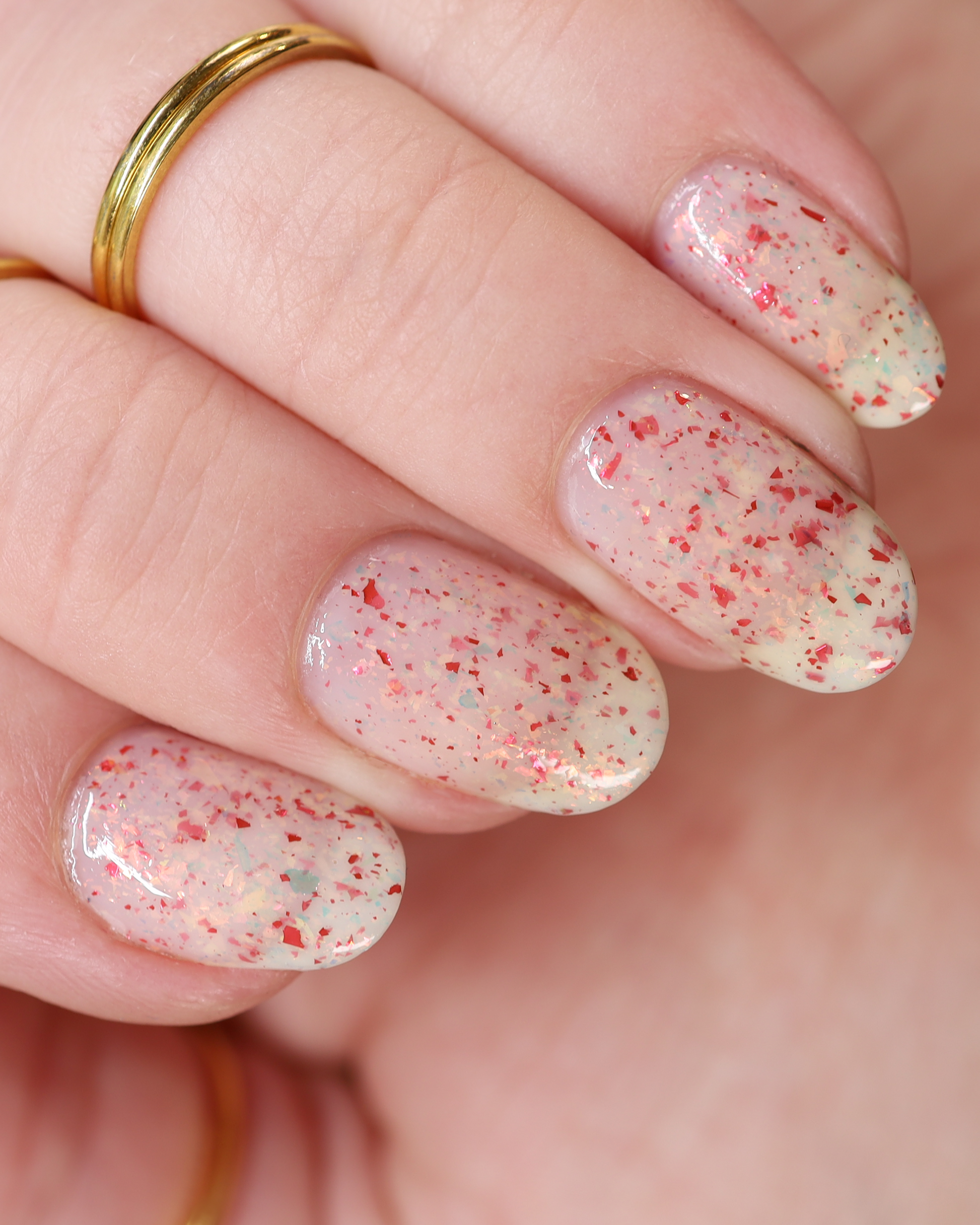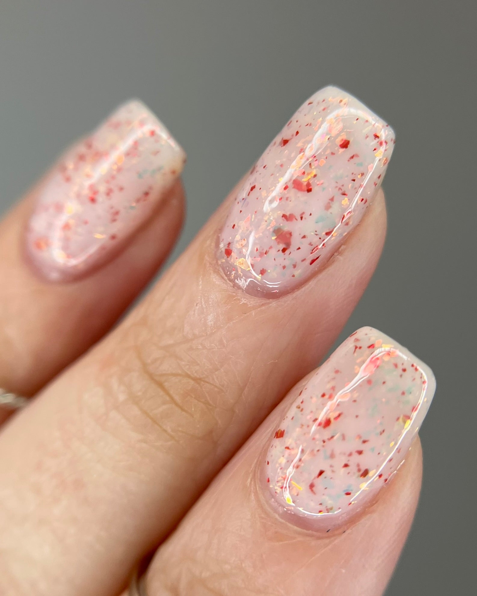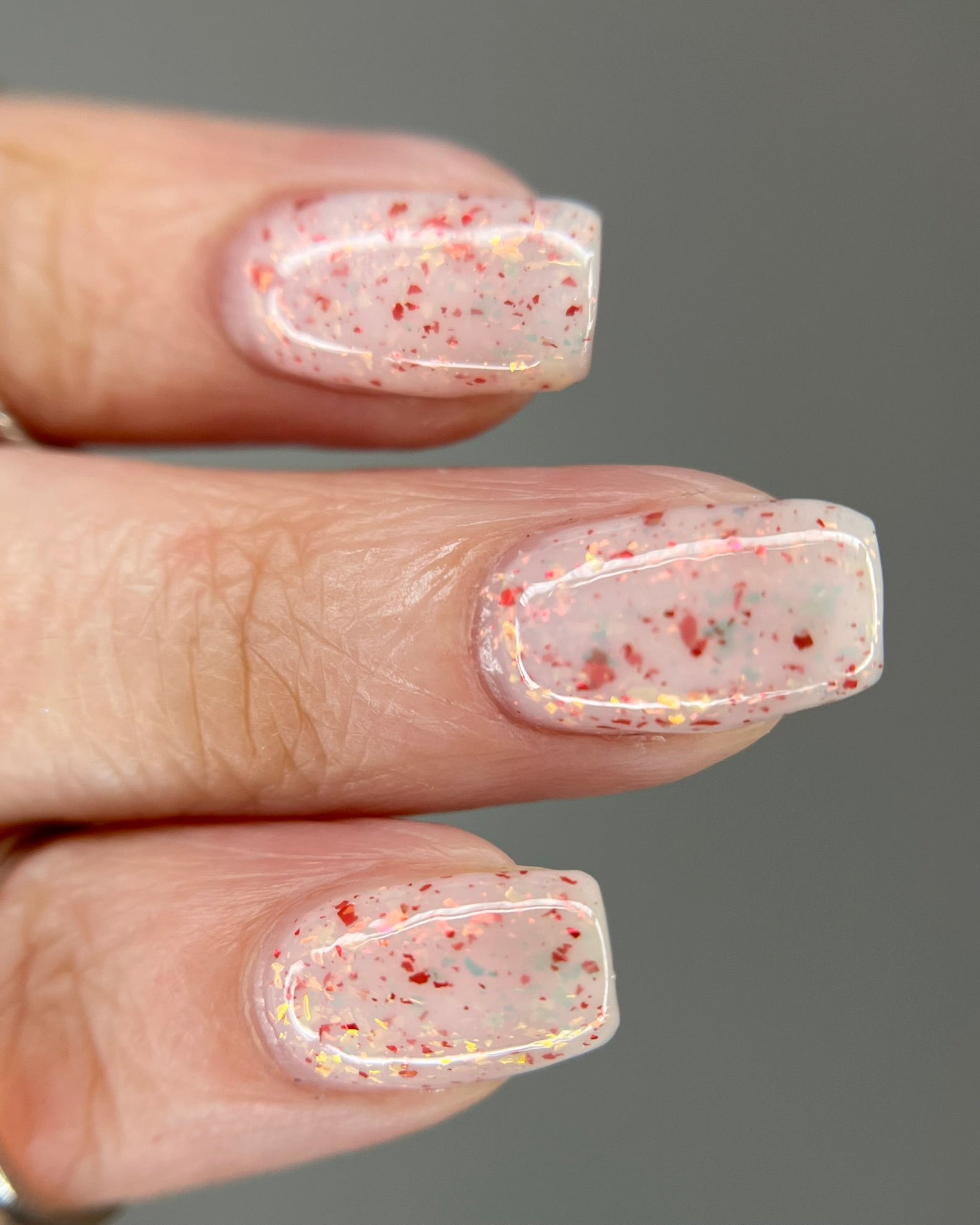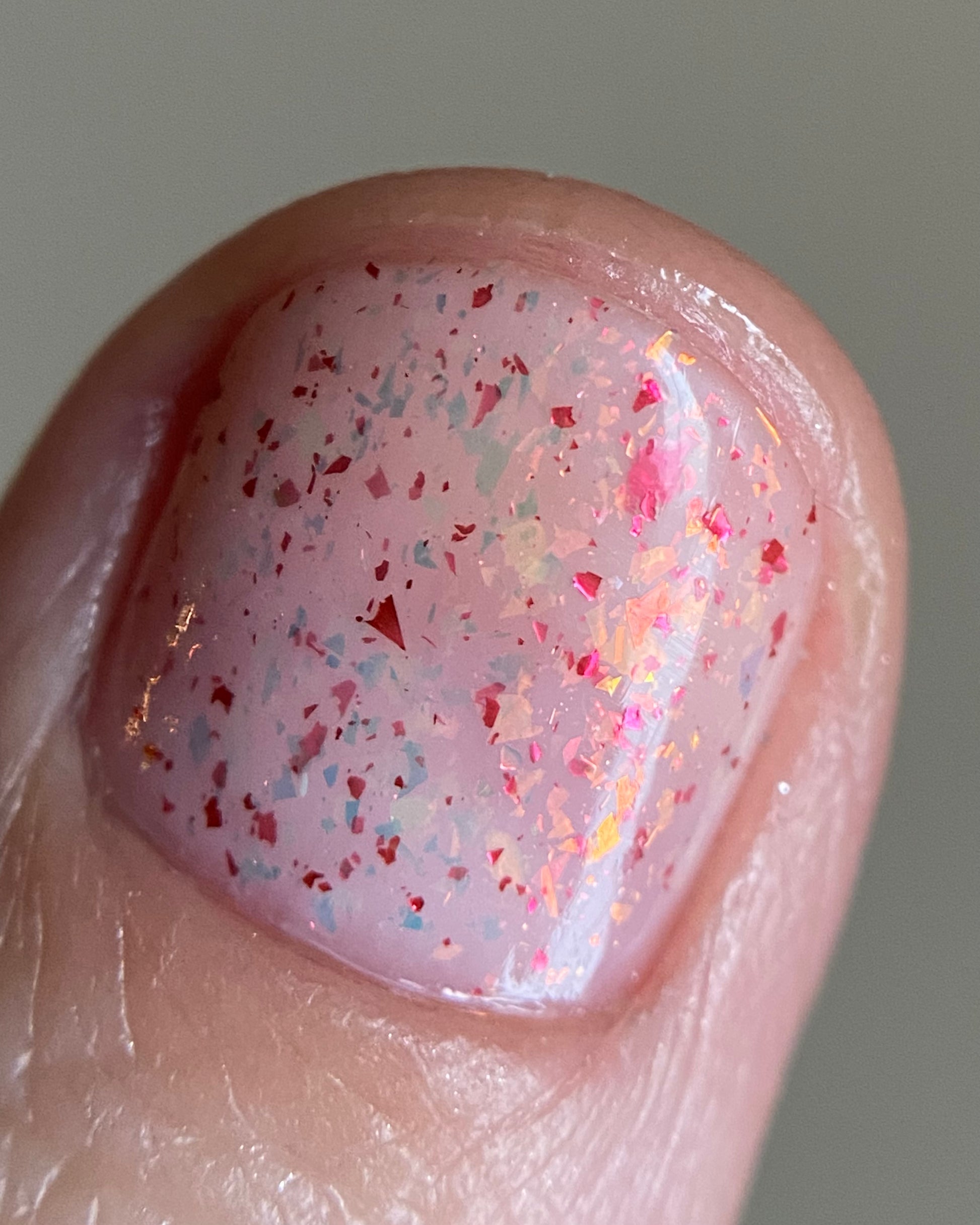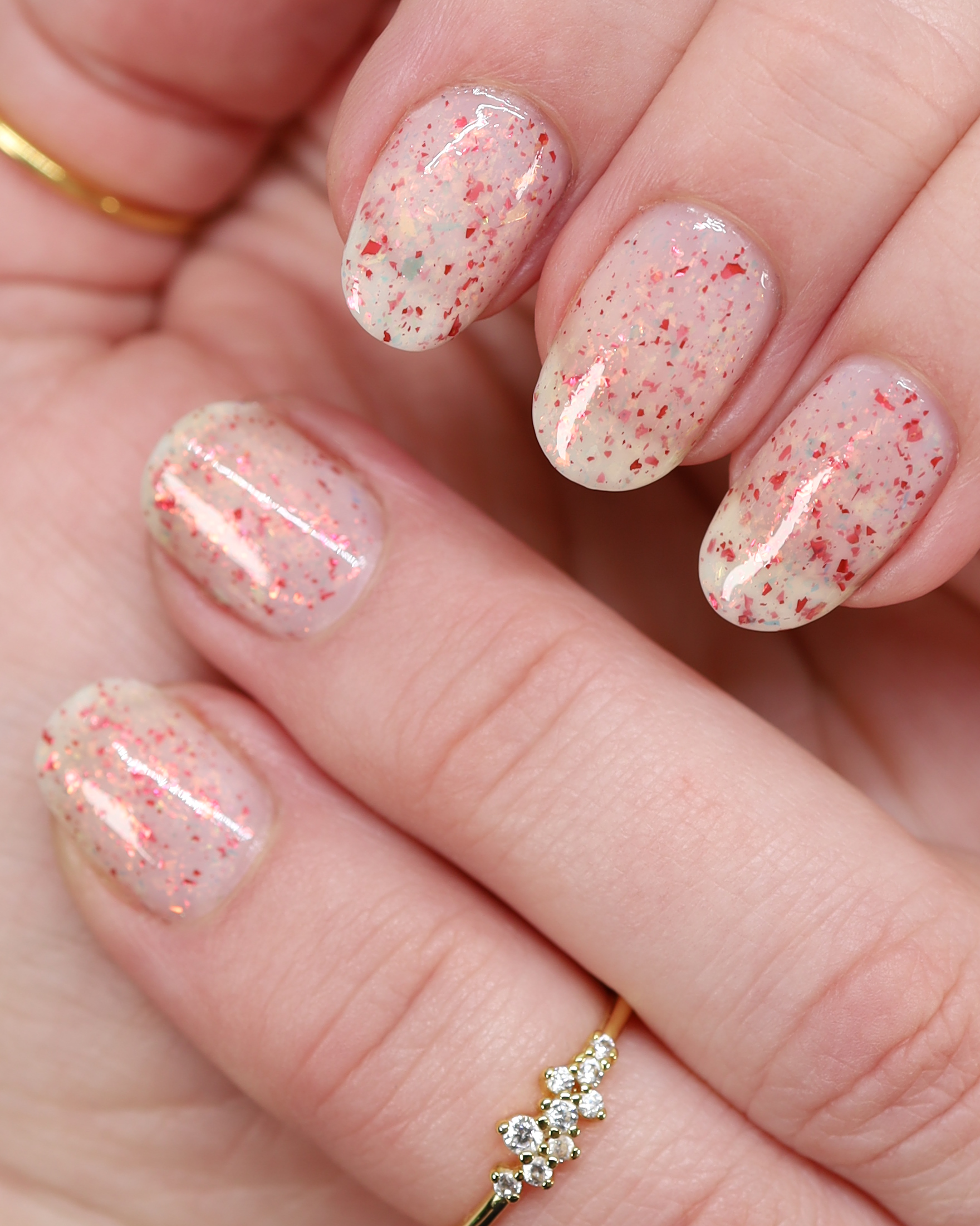 Ashes of Creation has a white crelly base with yellow/orange, orange/red, and bright red metallic flakes!