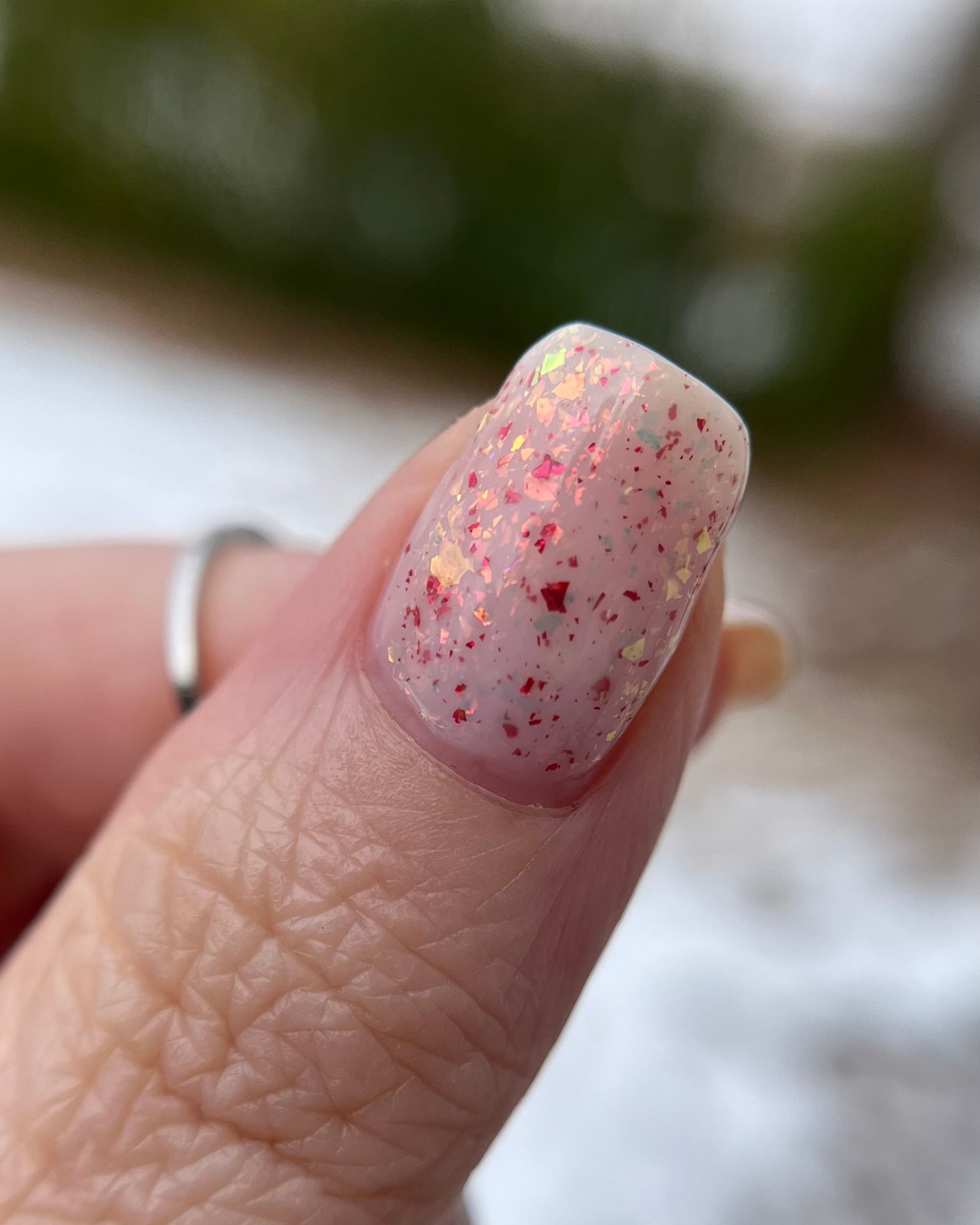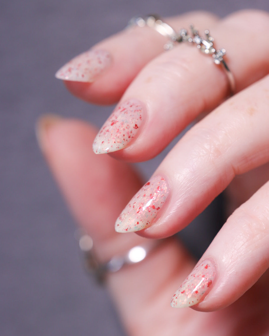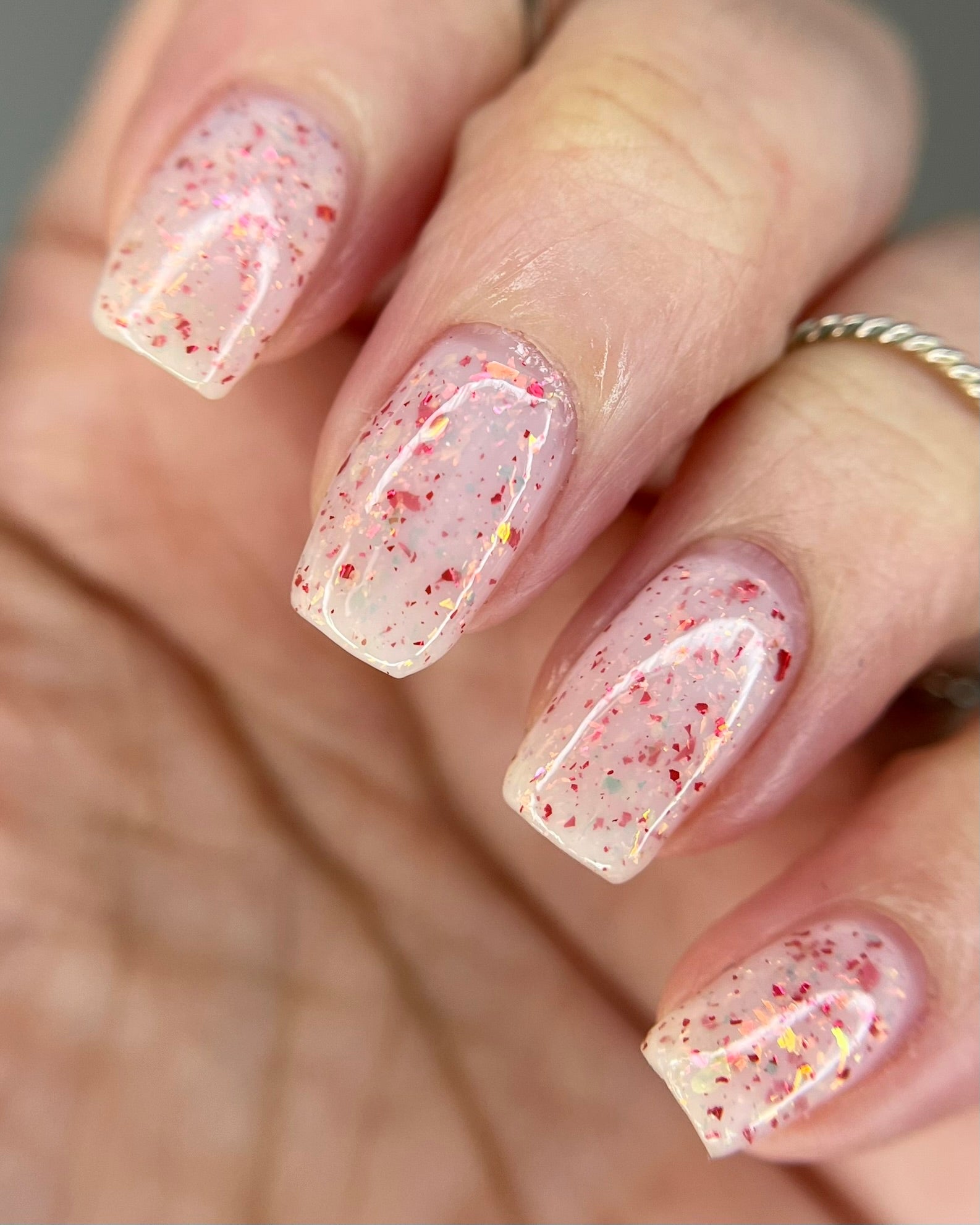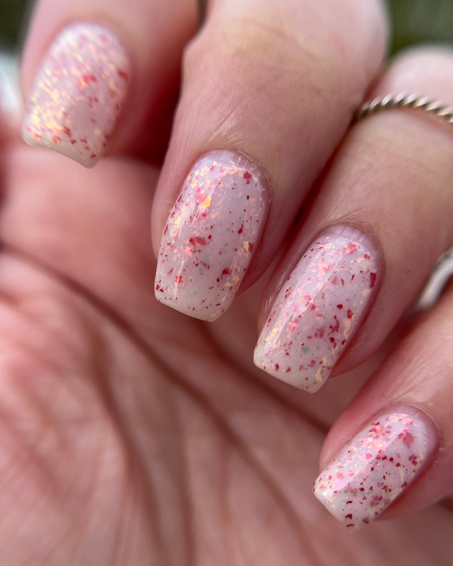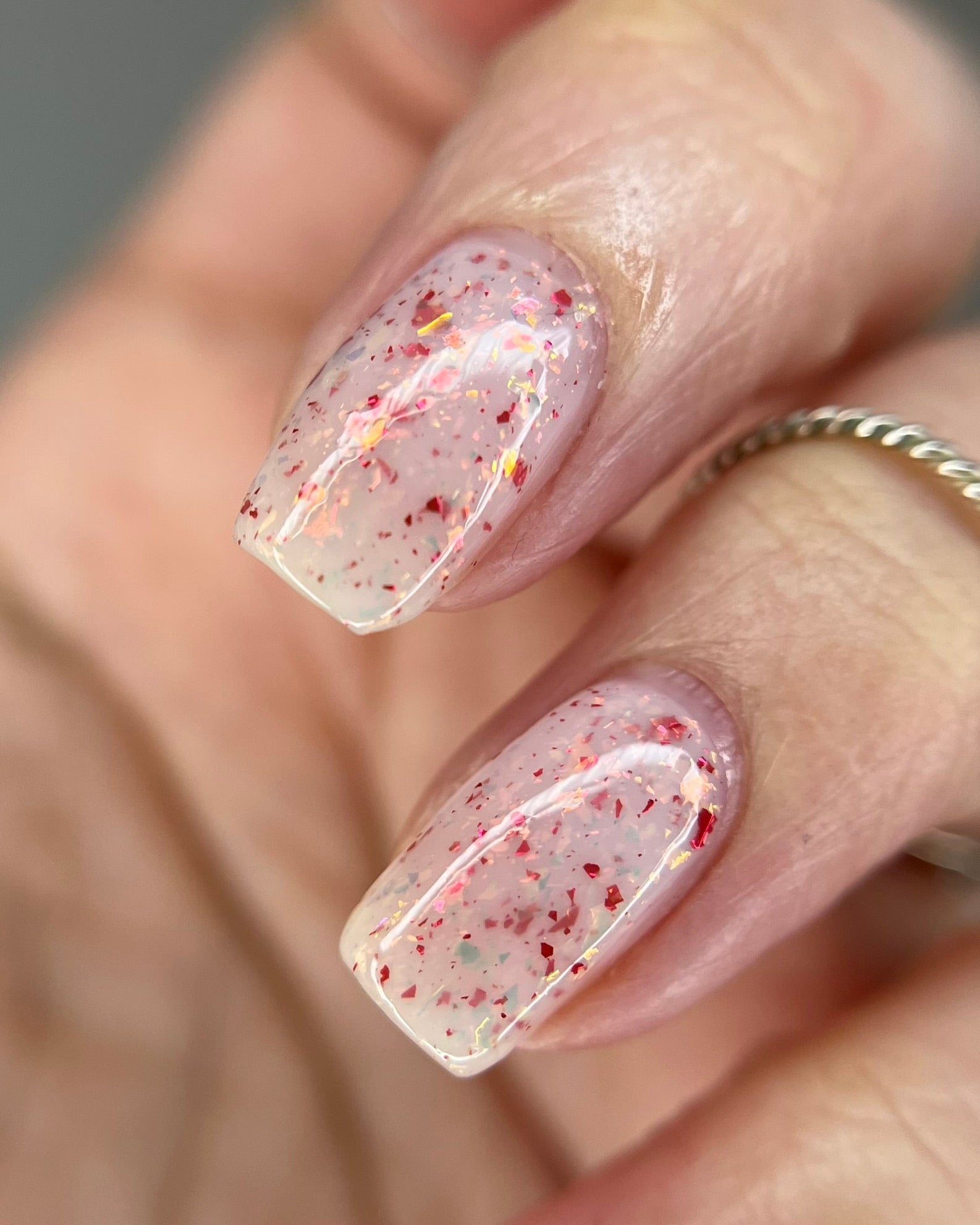Ashes of Creation has a white crelly base with yellow/orange, orange/red, and bright red metallic flakes!
