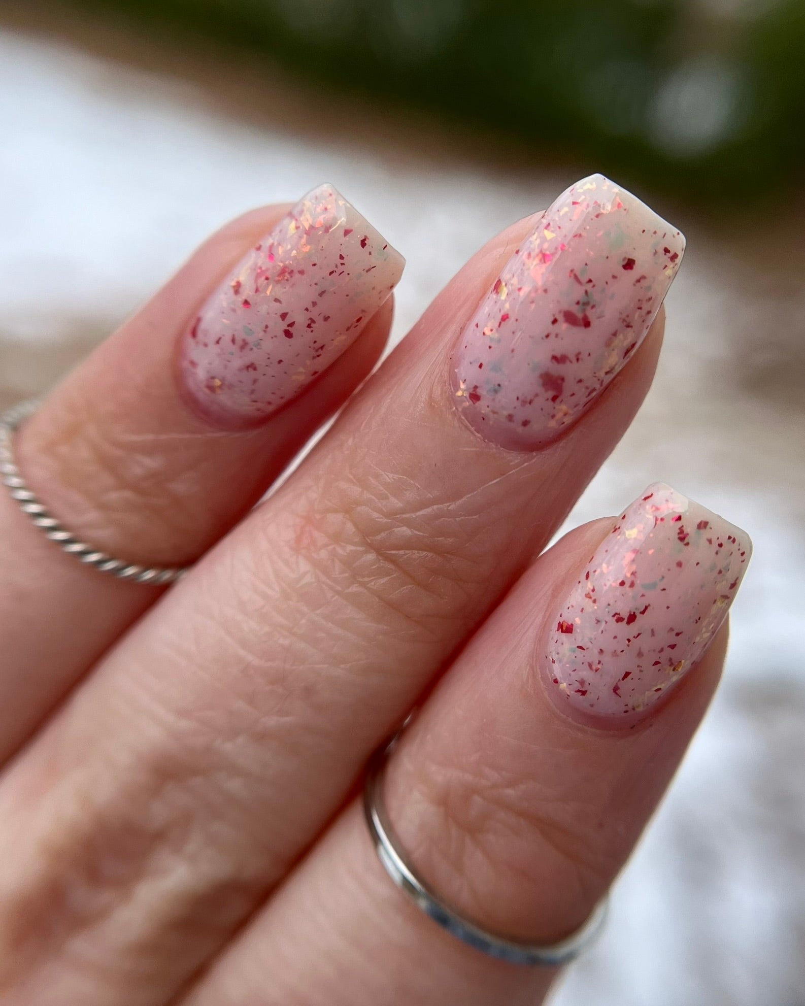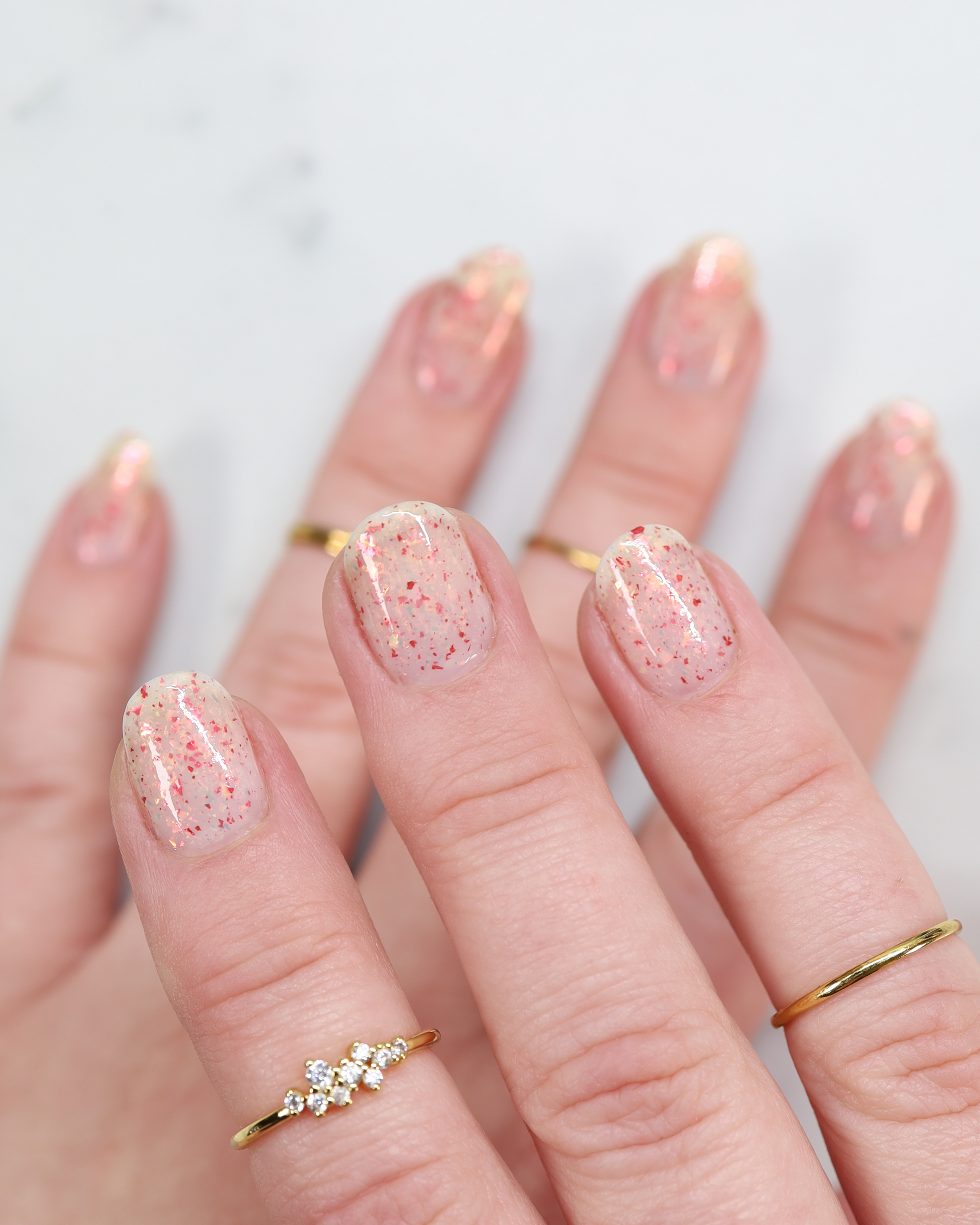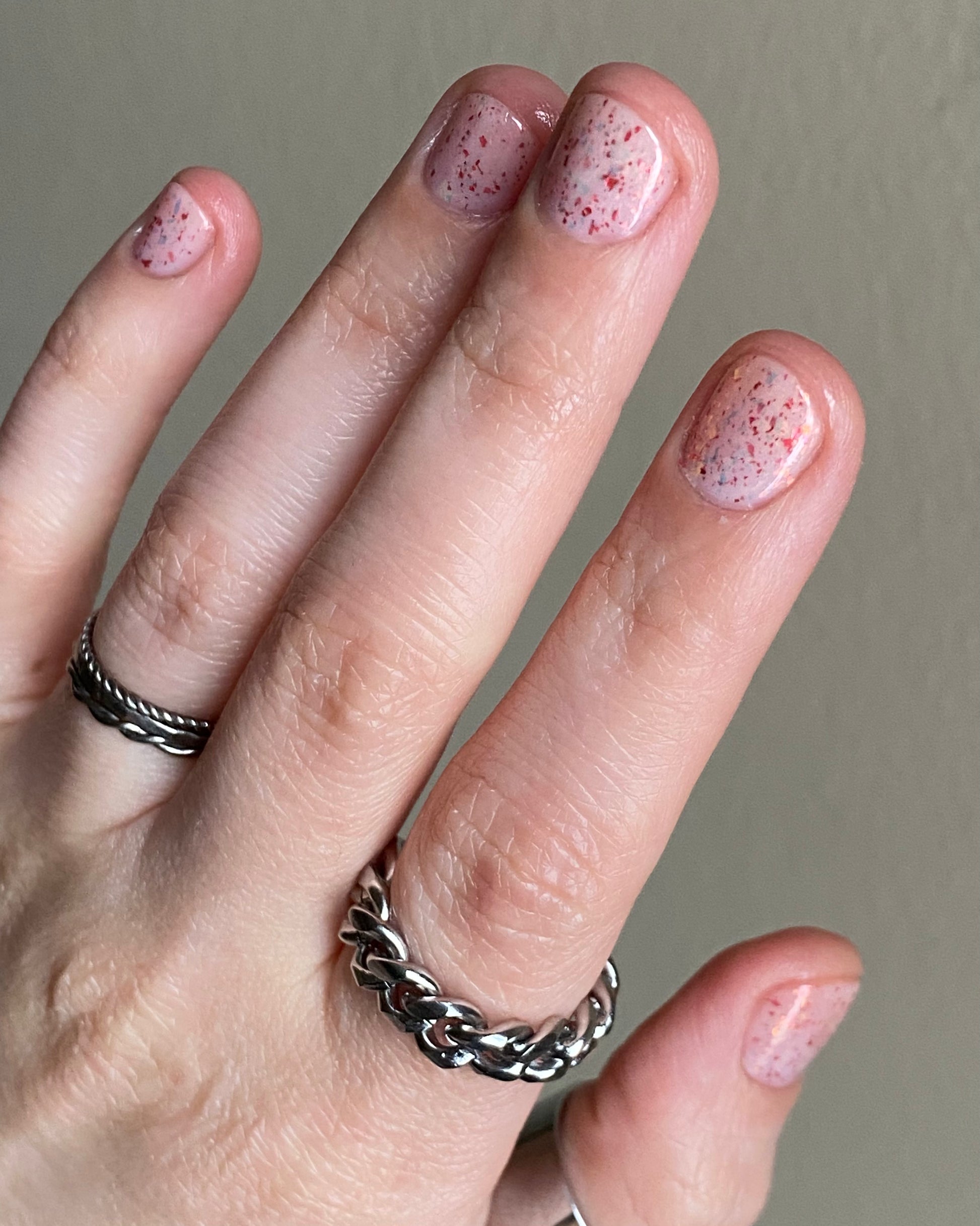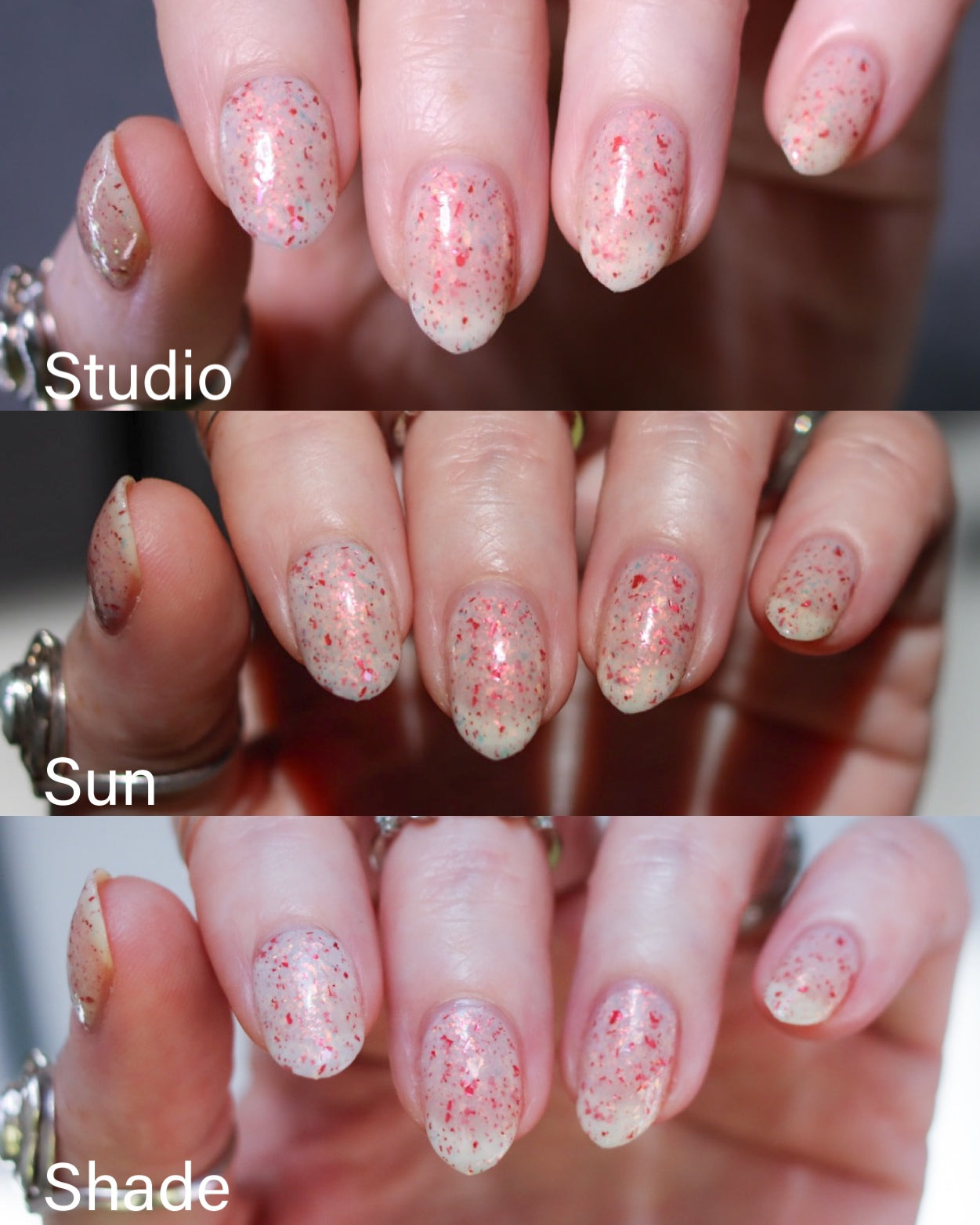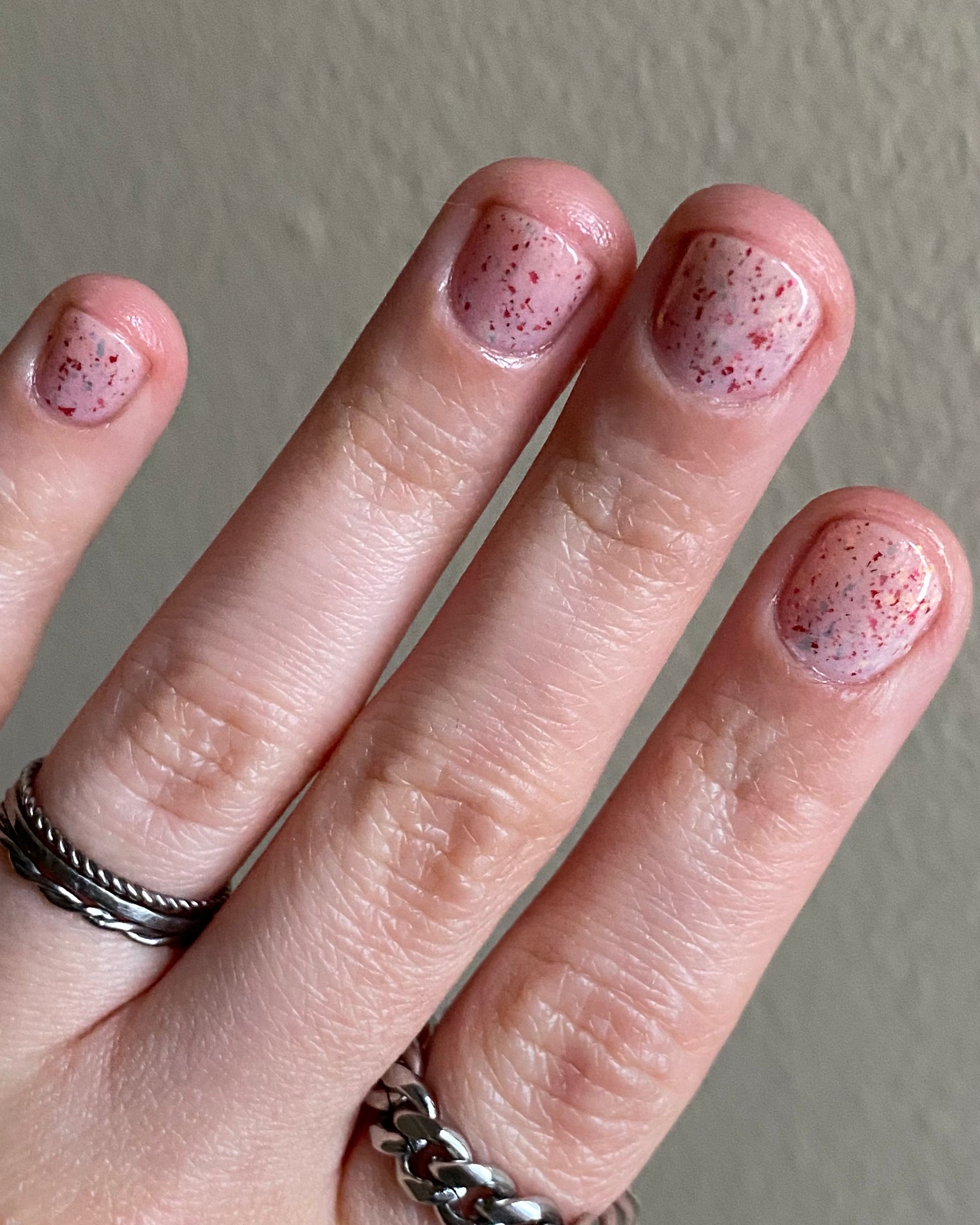 Ashes of Creation has a white crelly base with yellow/orange, orange/red, and bright red metallic flakes!