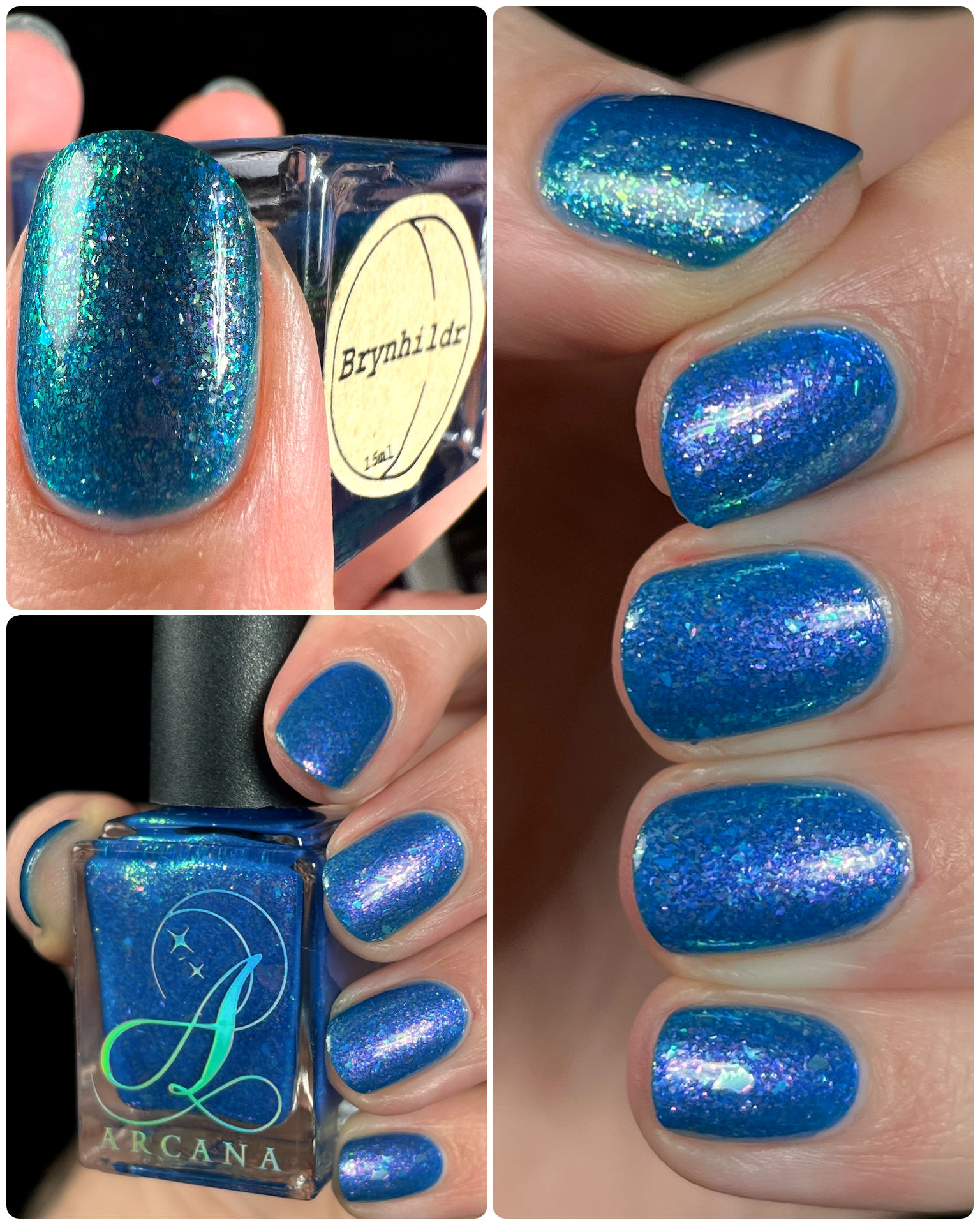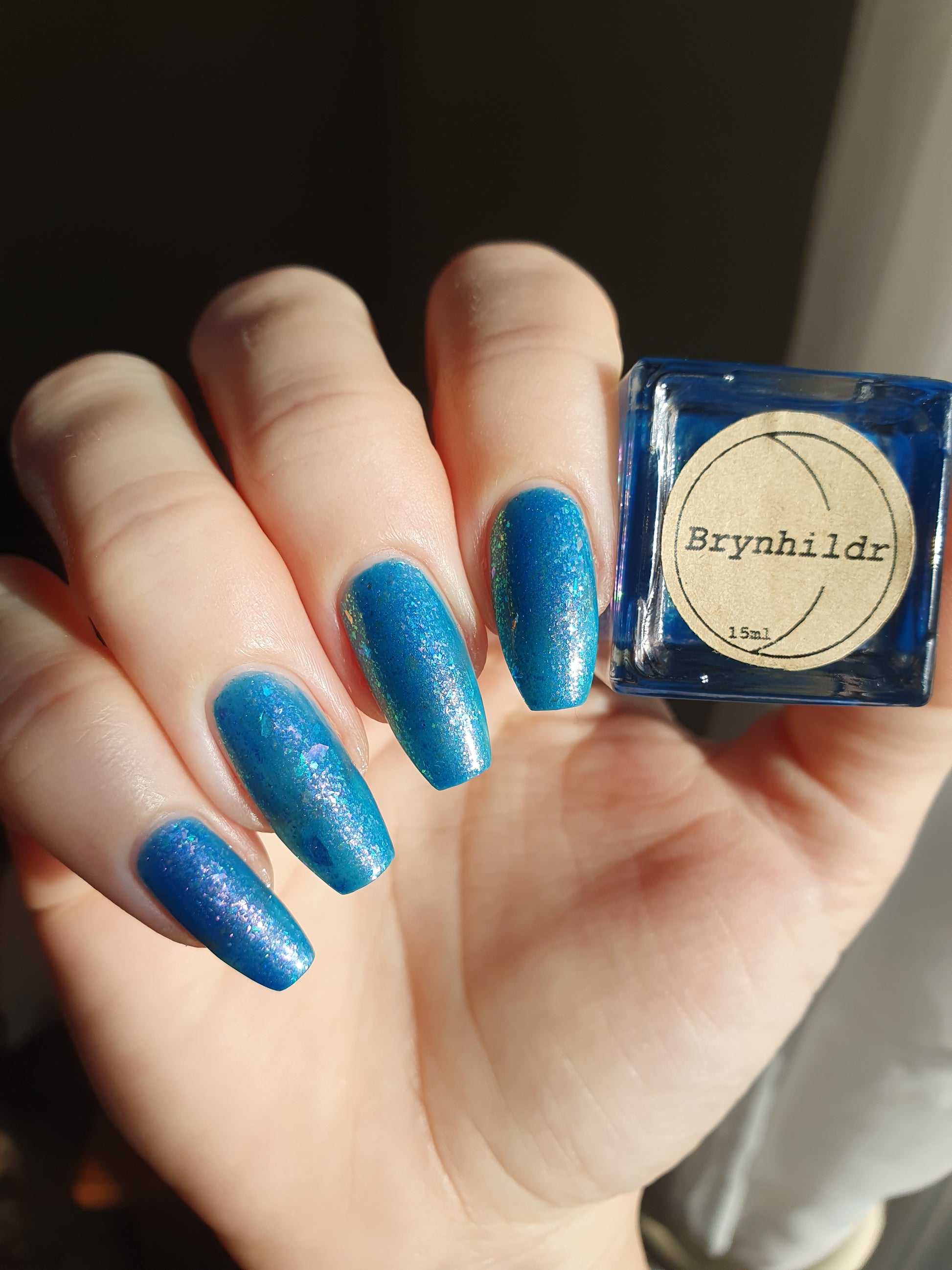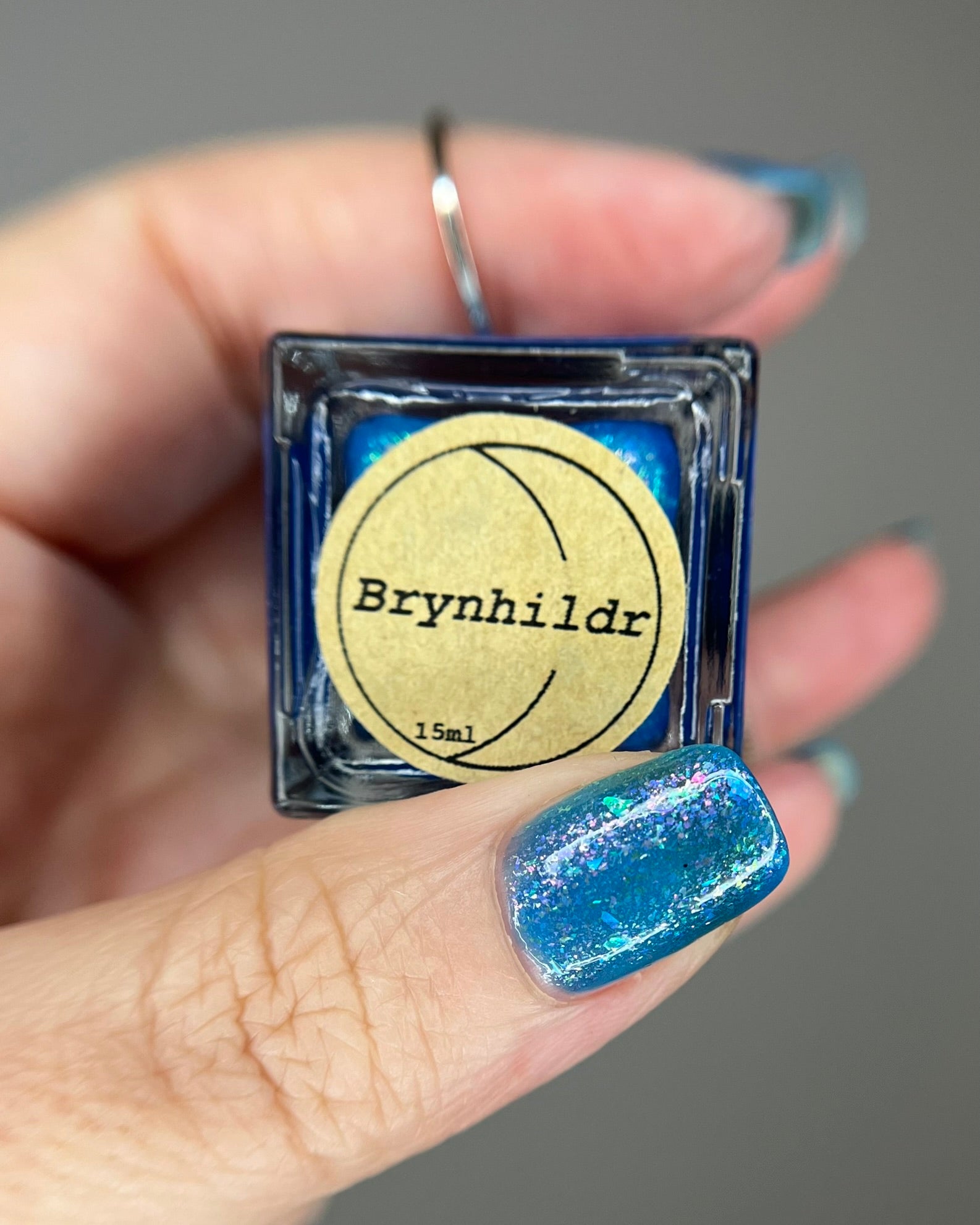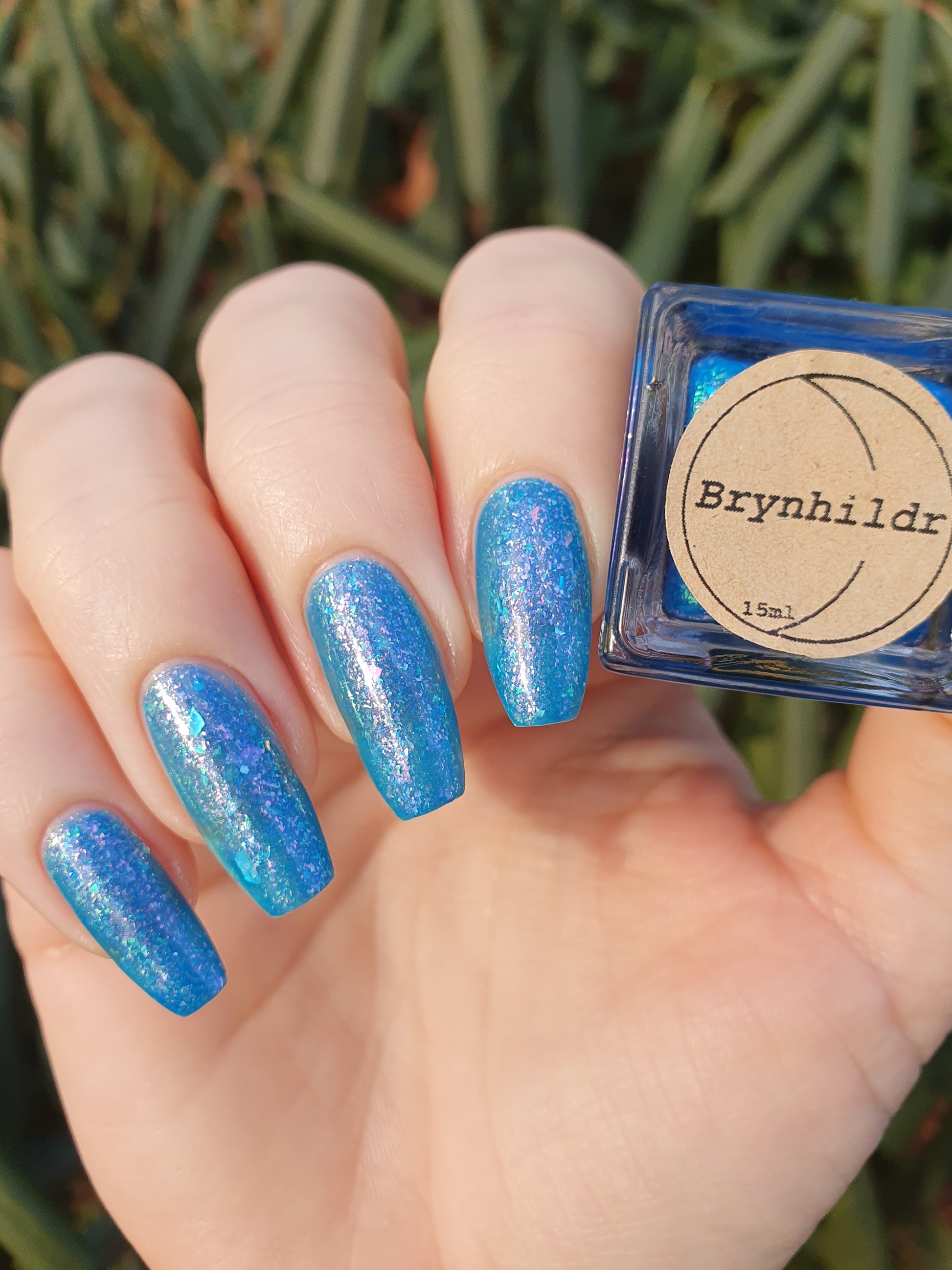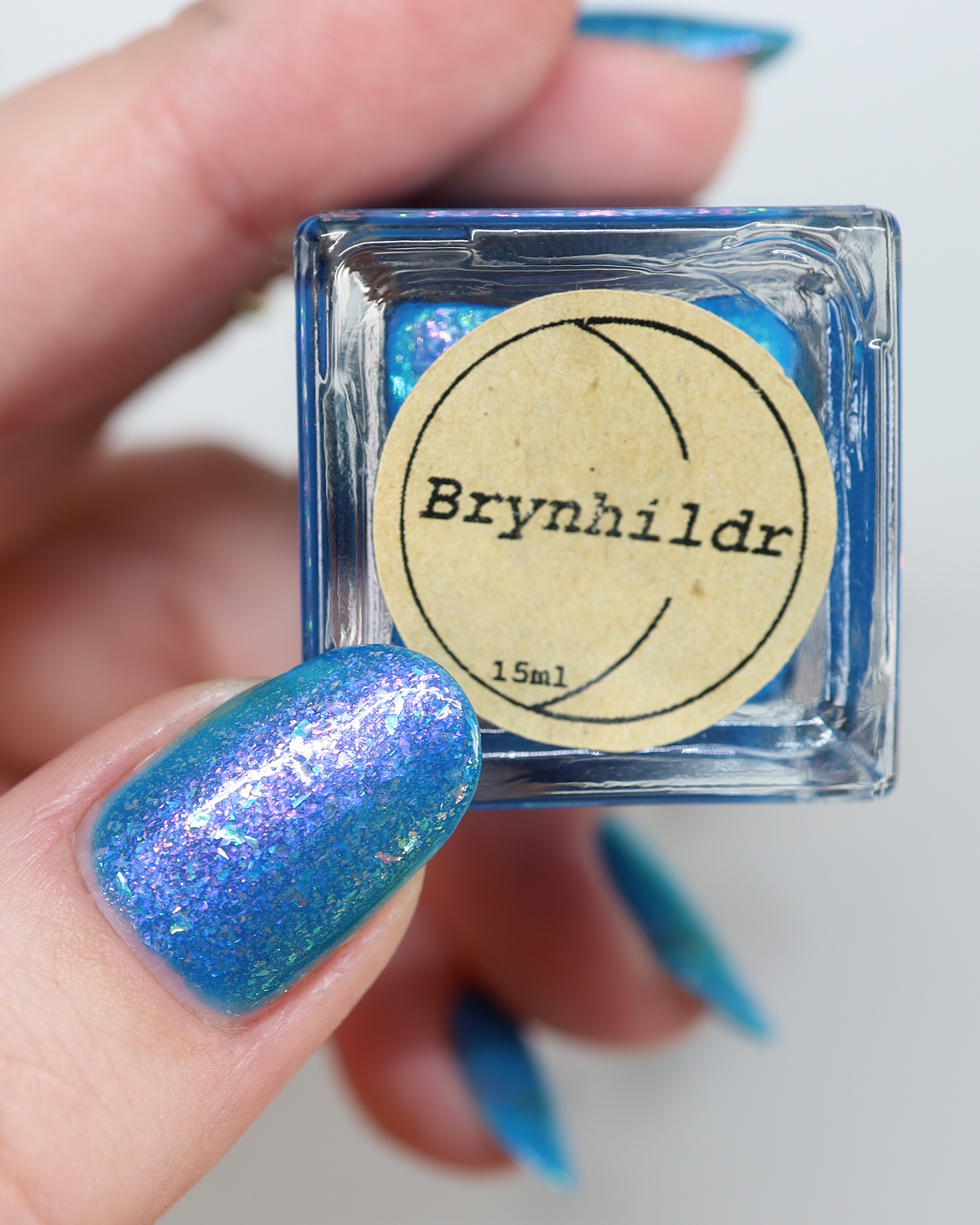 Brynhildr has a bright blue base with pink to yellow large particle shimmer and green/purple, pink/green, and silver/blue flakes. This one is a flakie bomb!