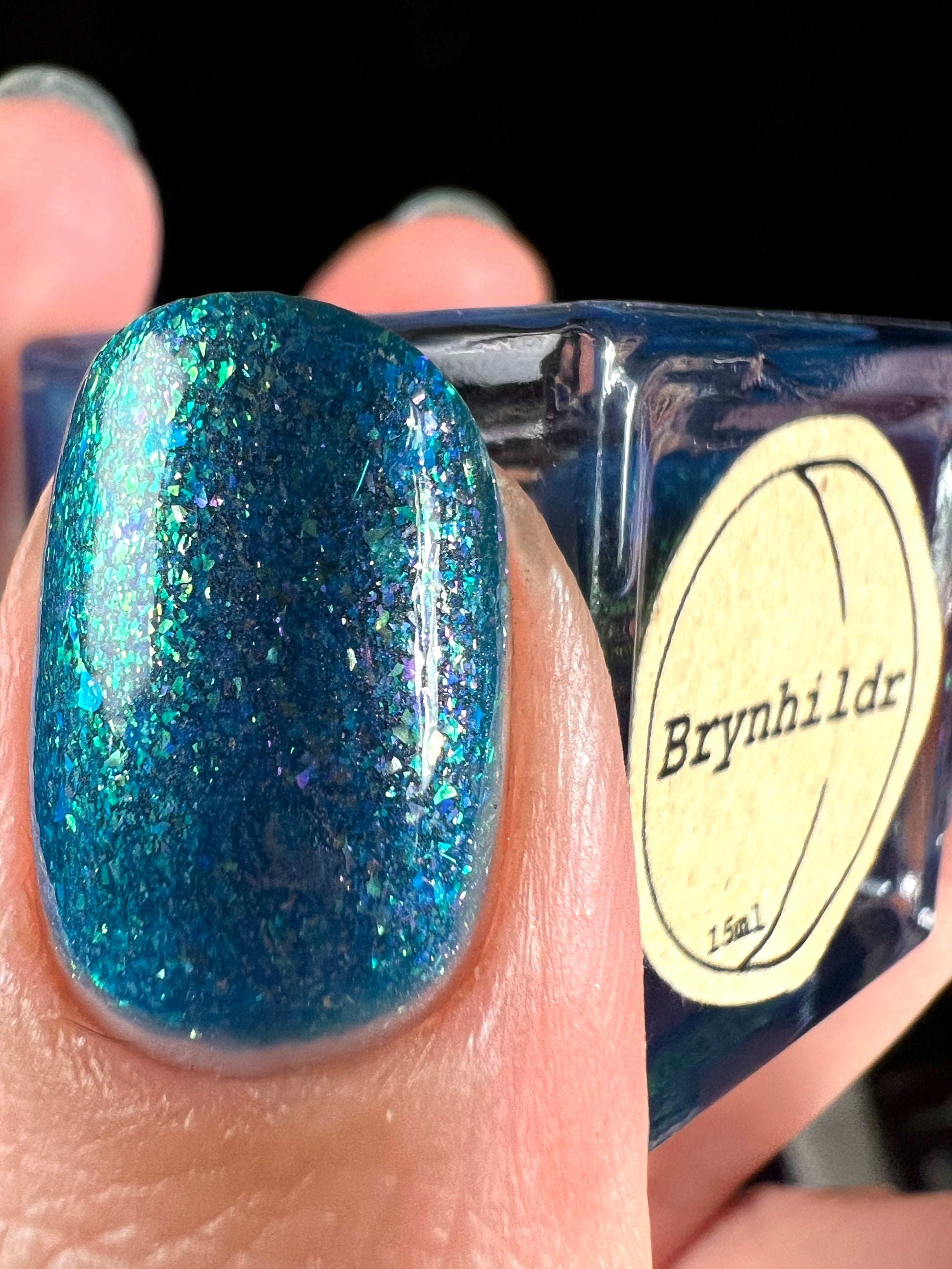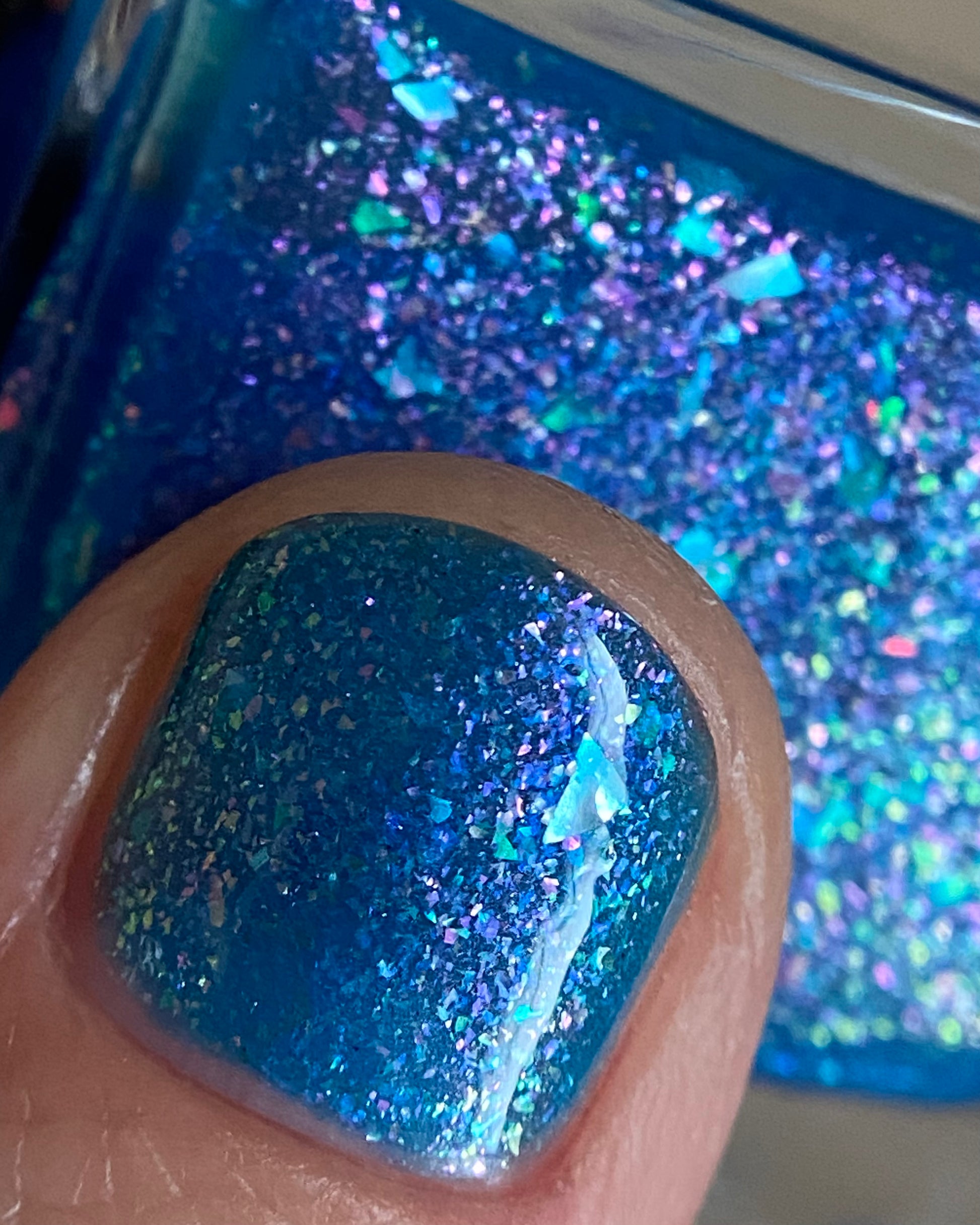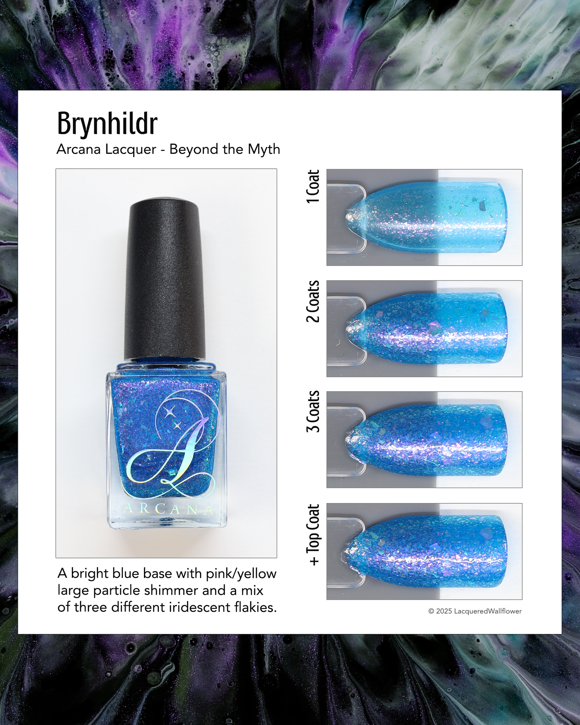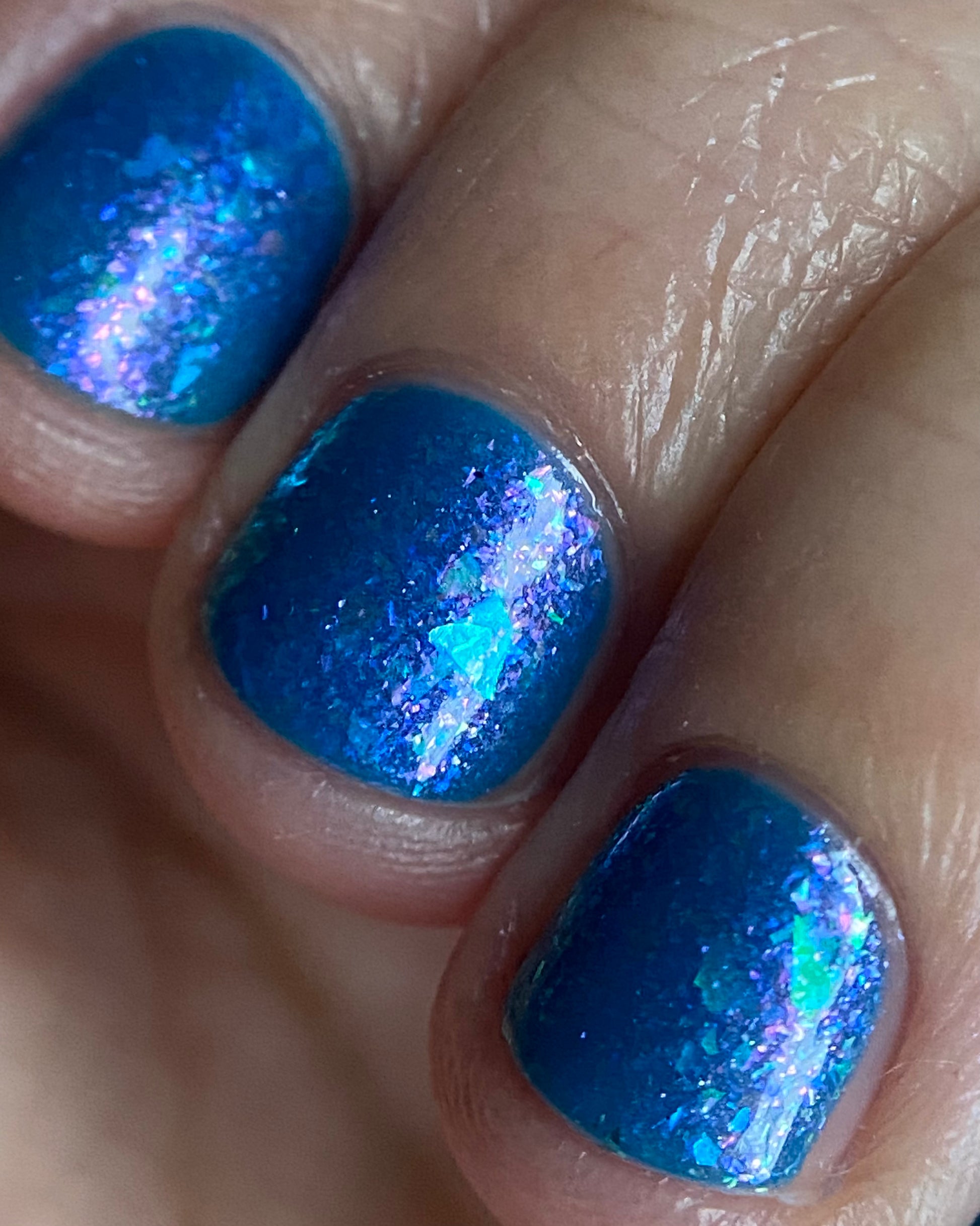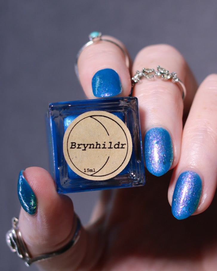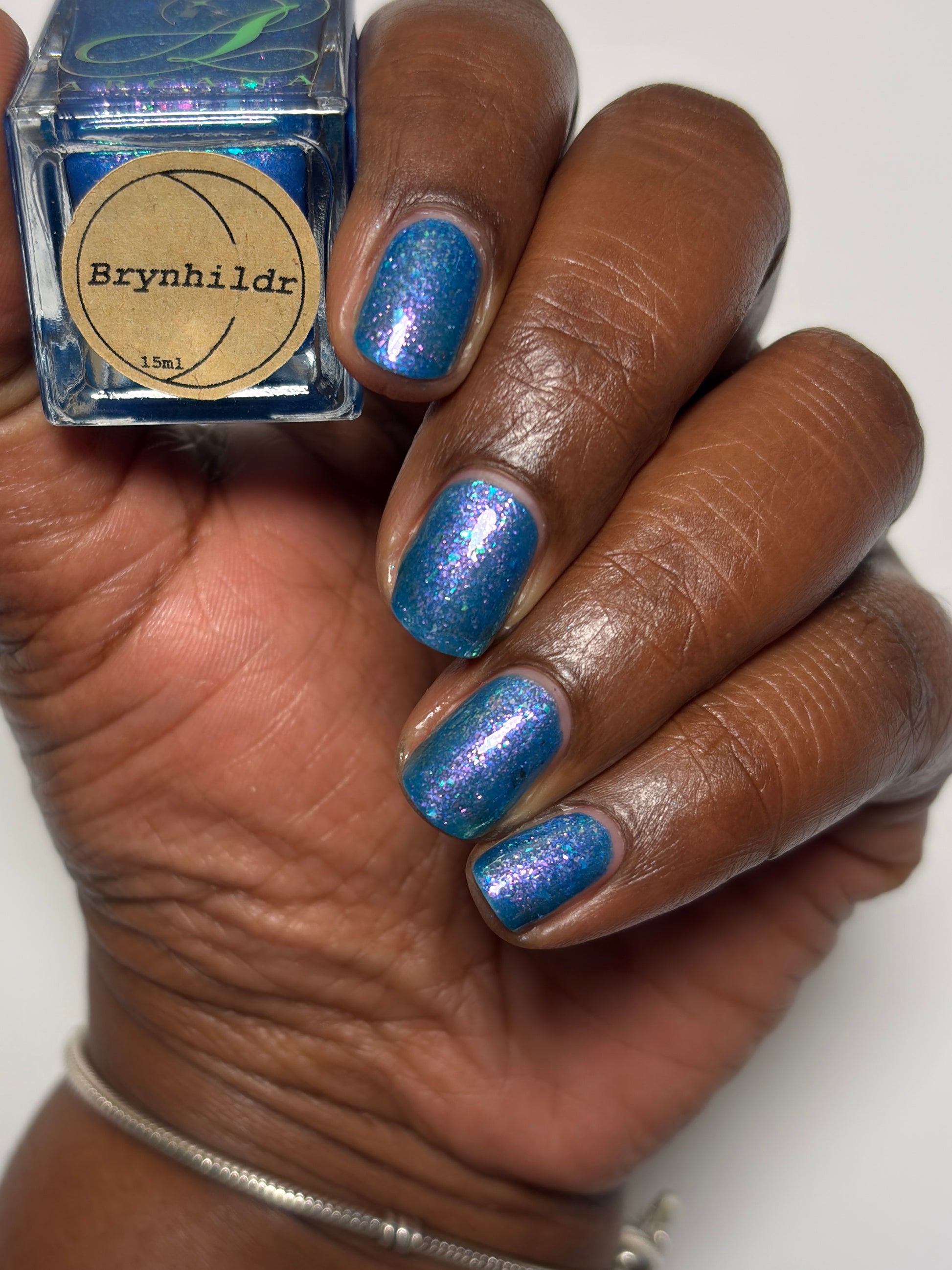 Brynhildr has a bright blue base with pink to yellow large particle shimmer and green/purple, pink/green, and silver/blue flakes. This one is a flakie bomb!