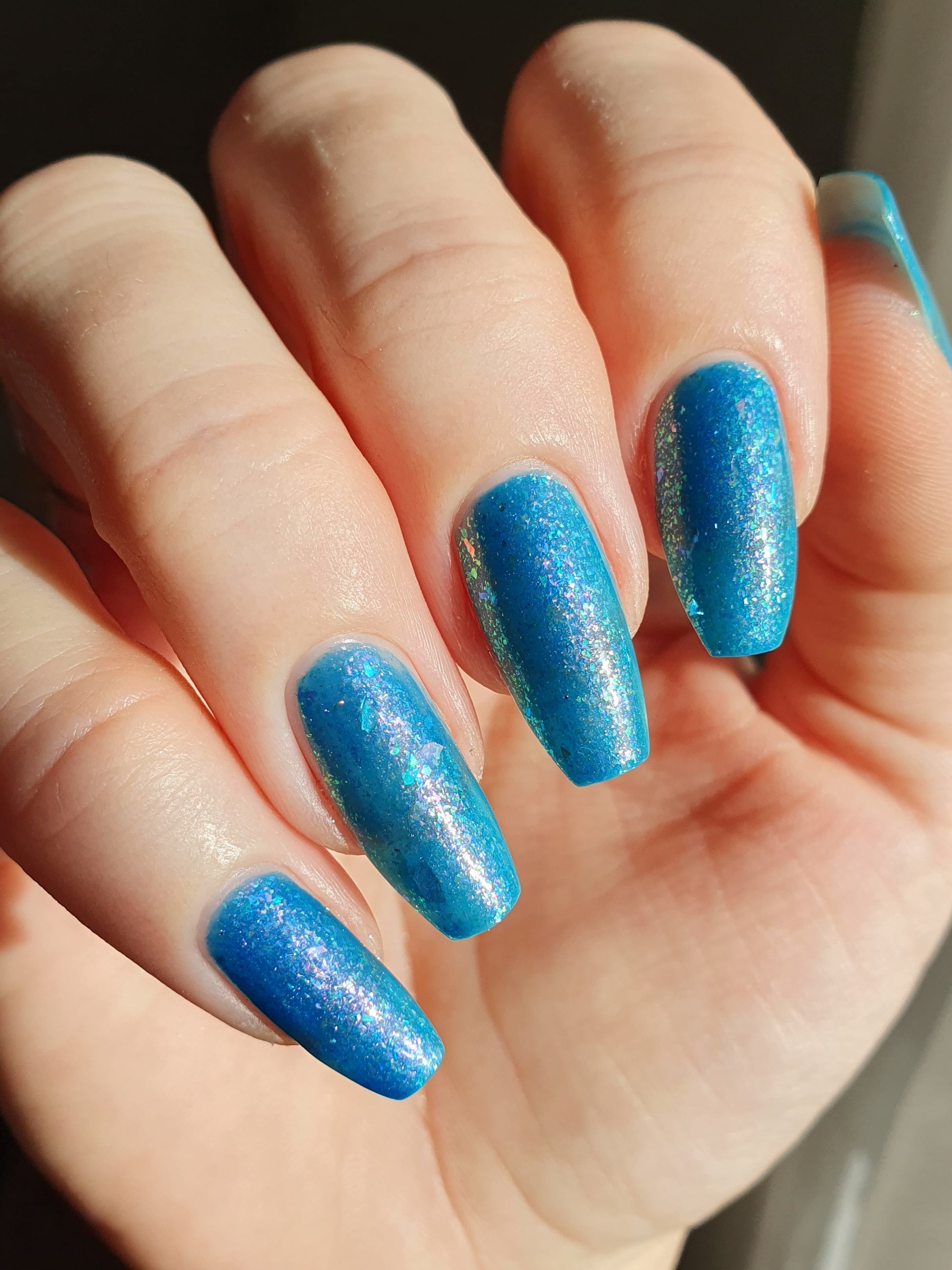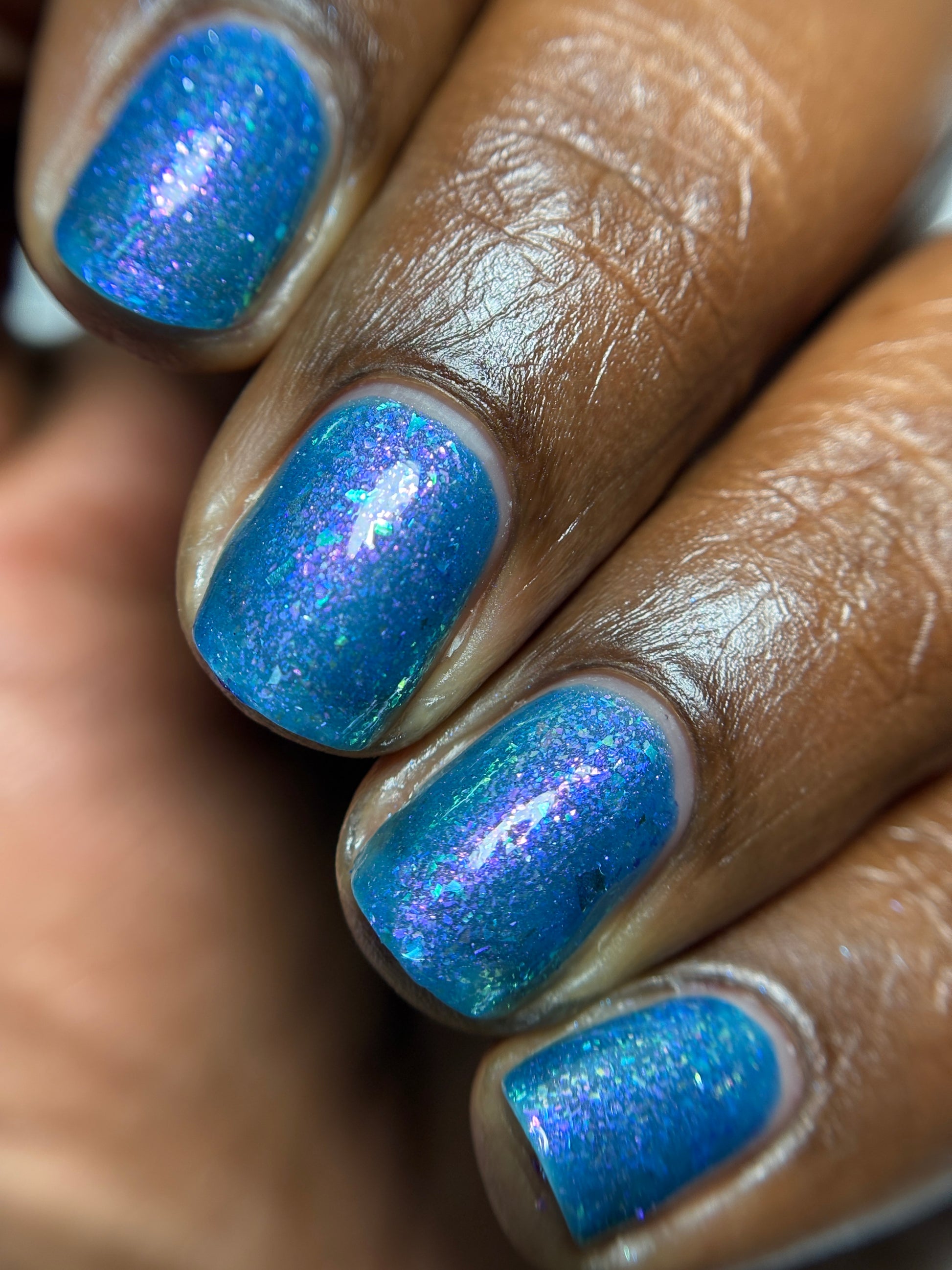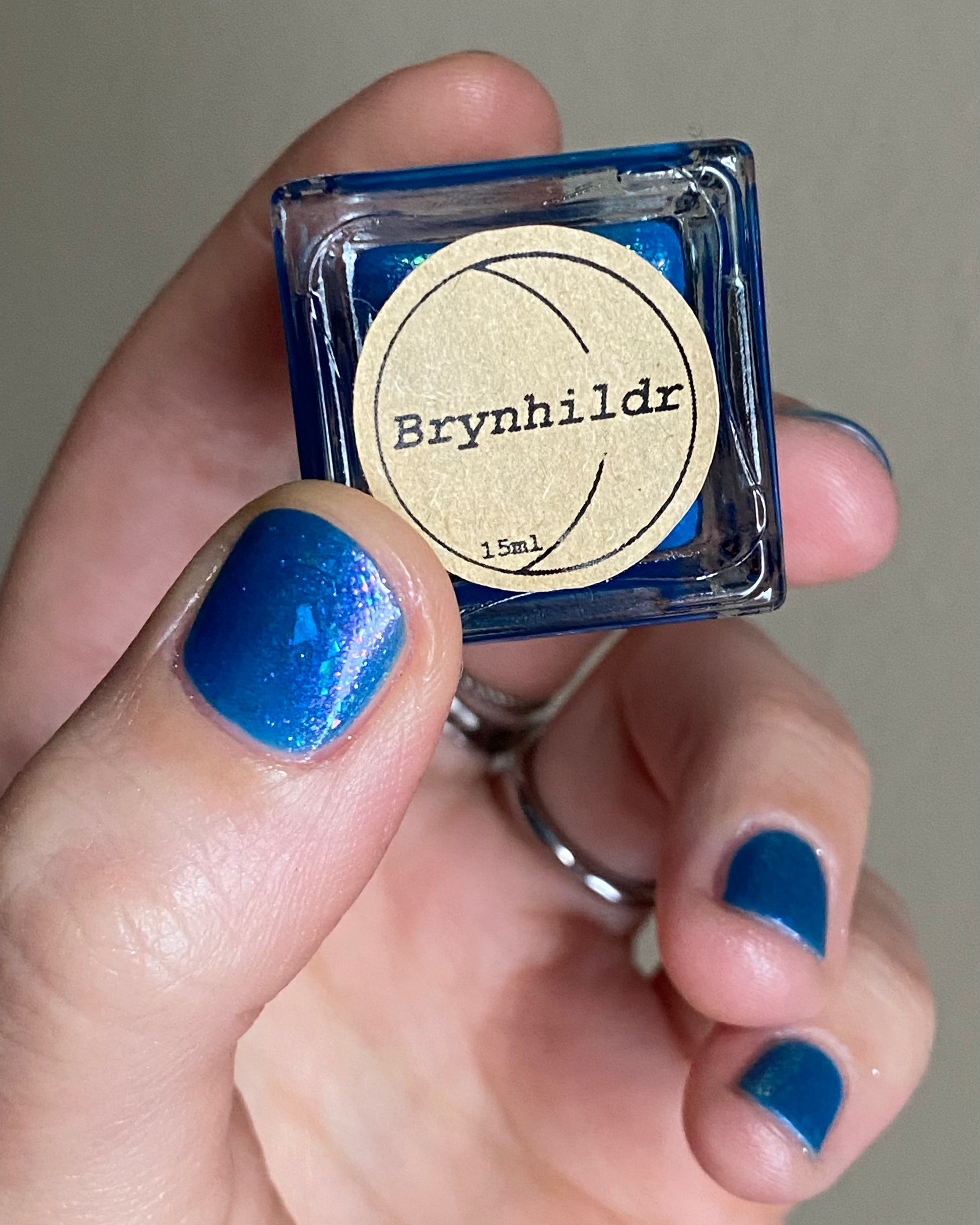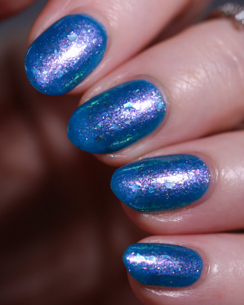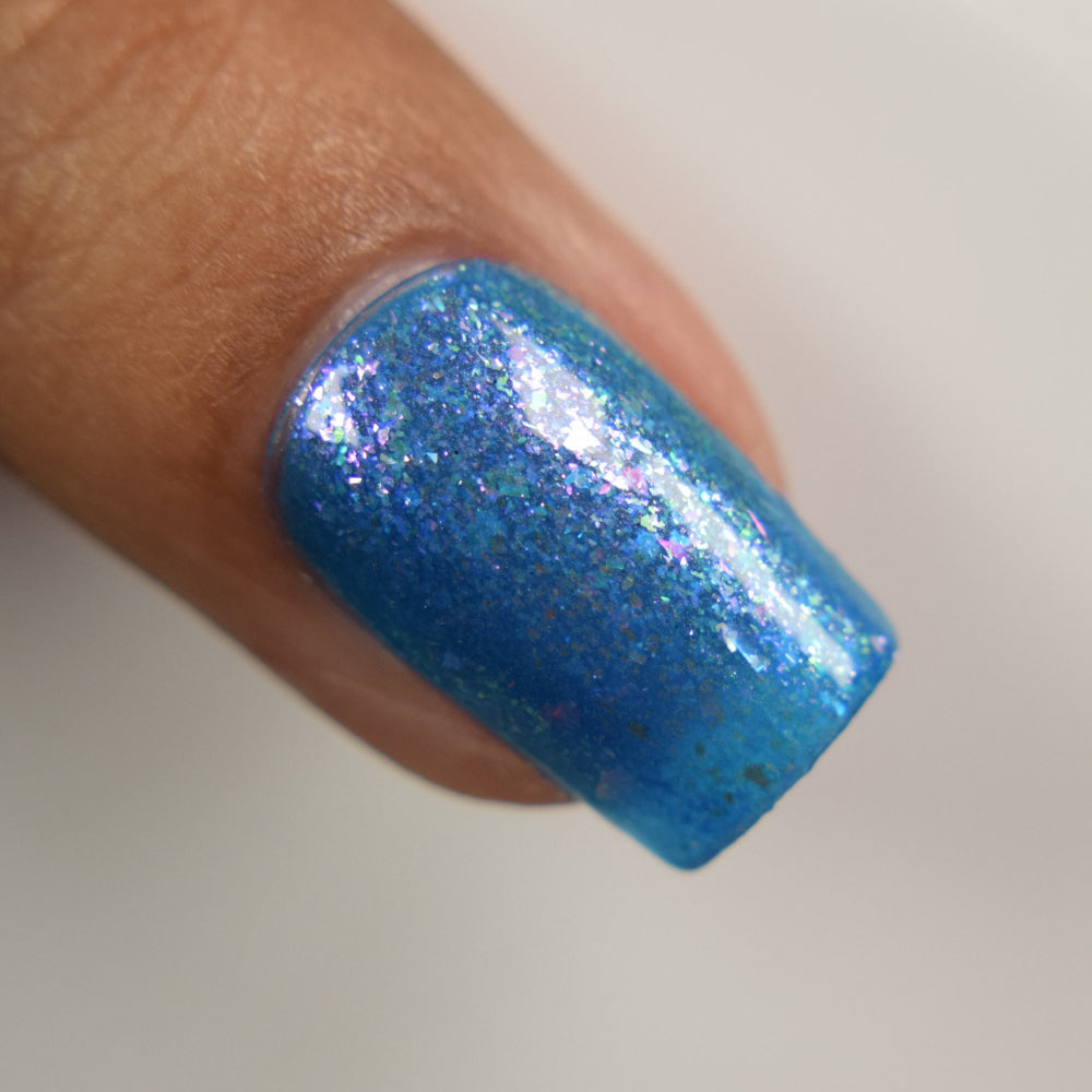 Brynhildr has a bright blue base with pink to yellow large particle shimmer and green/purple, pink/green, and silver/blue flakes. This one is a flakie bomb!