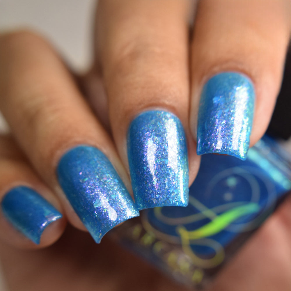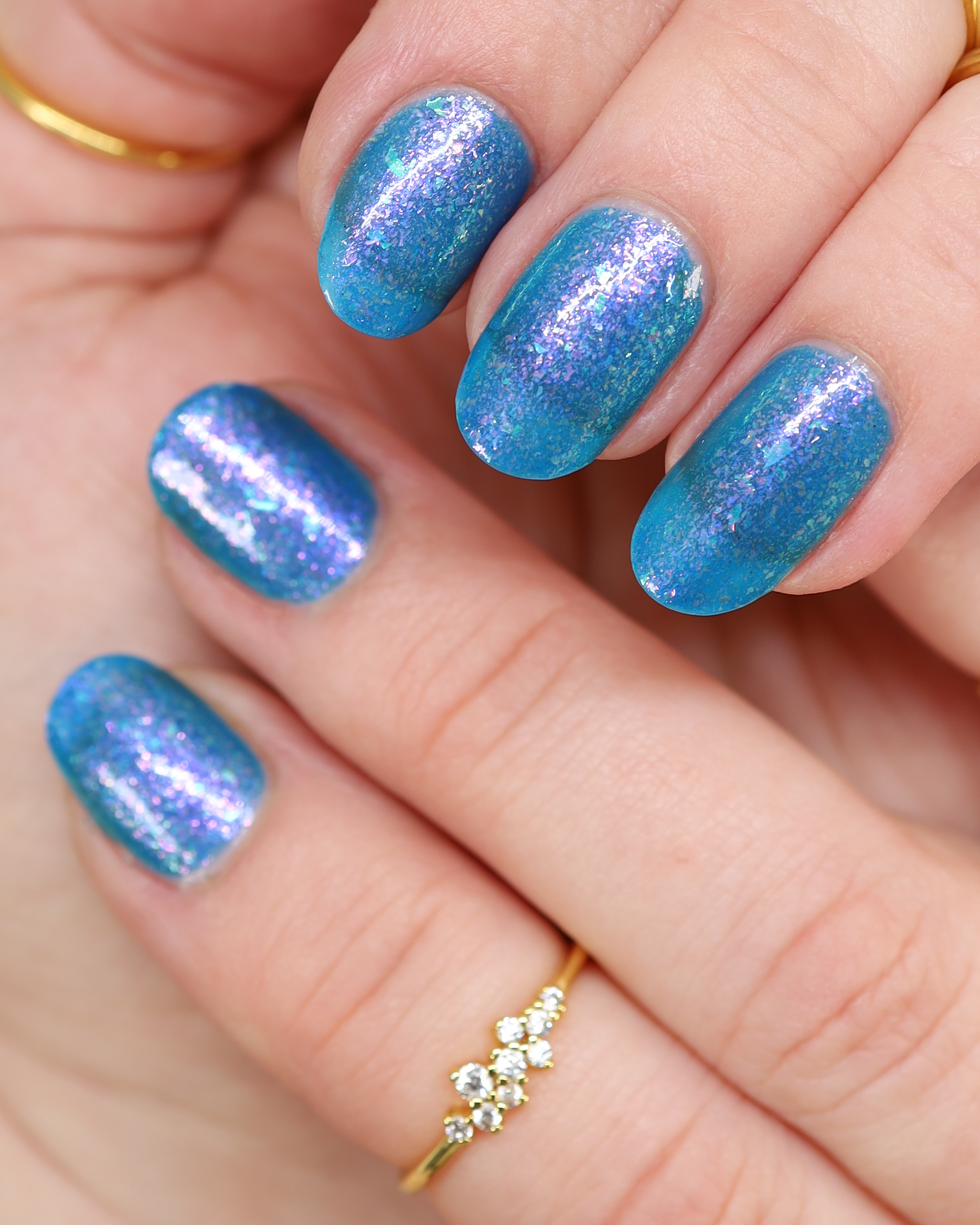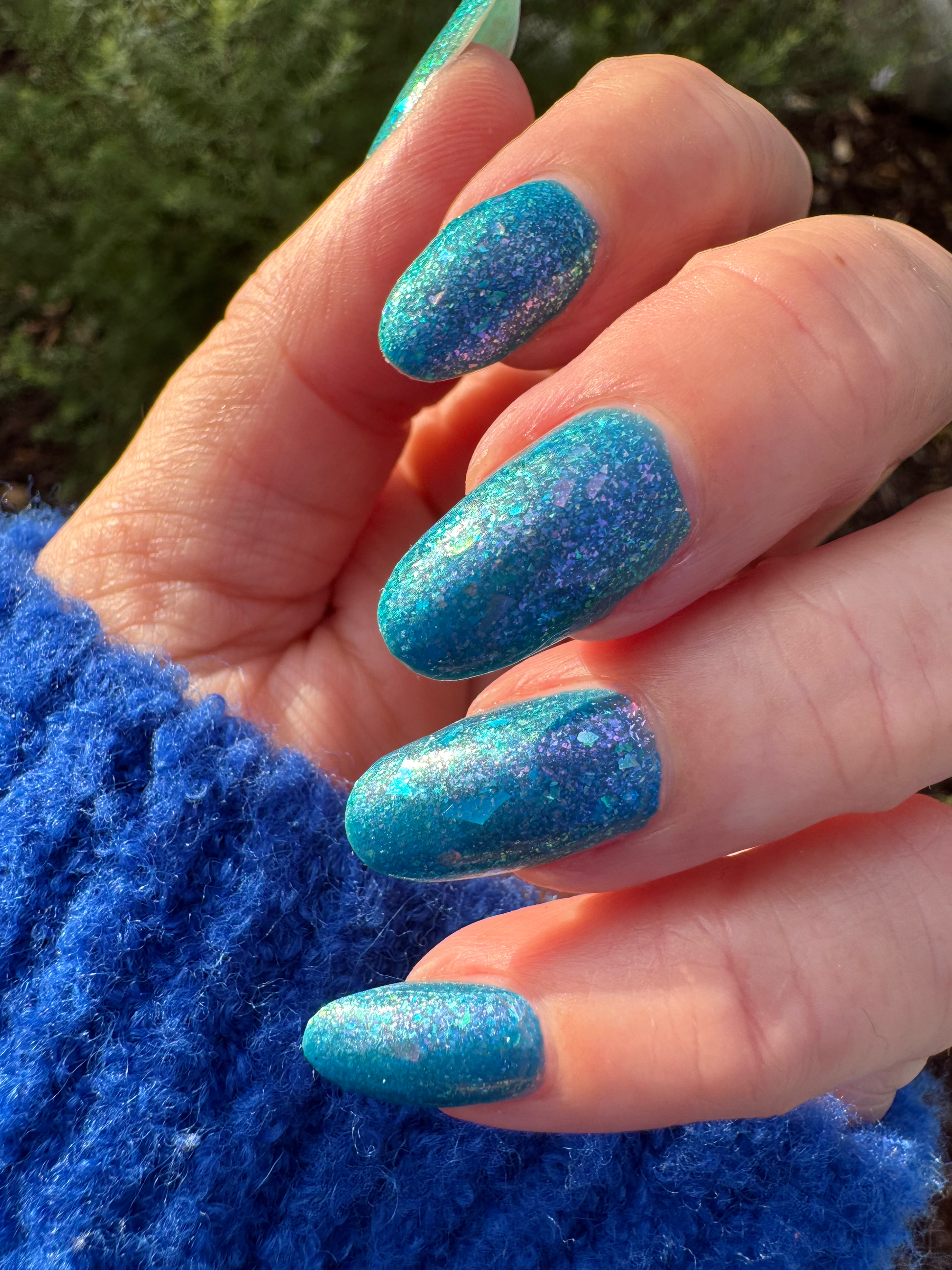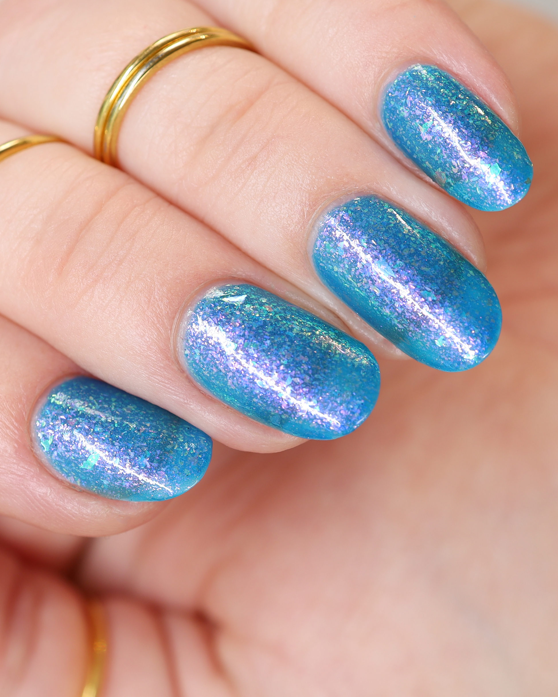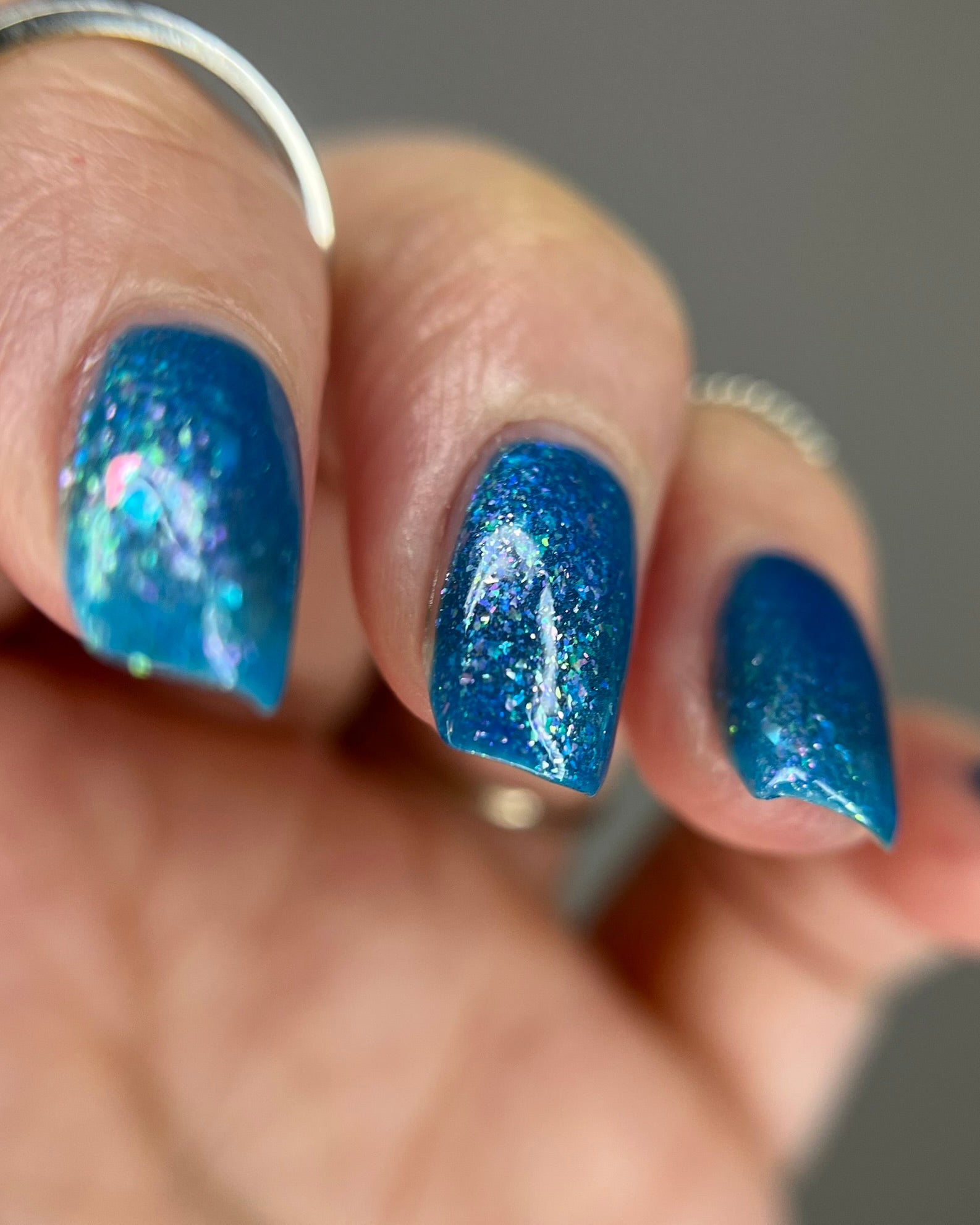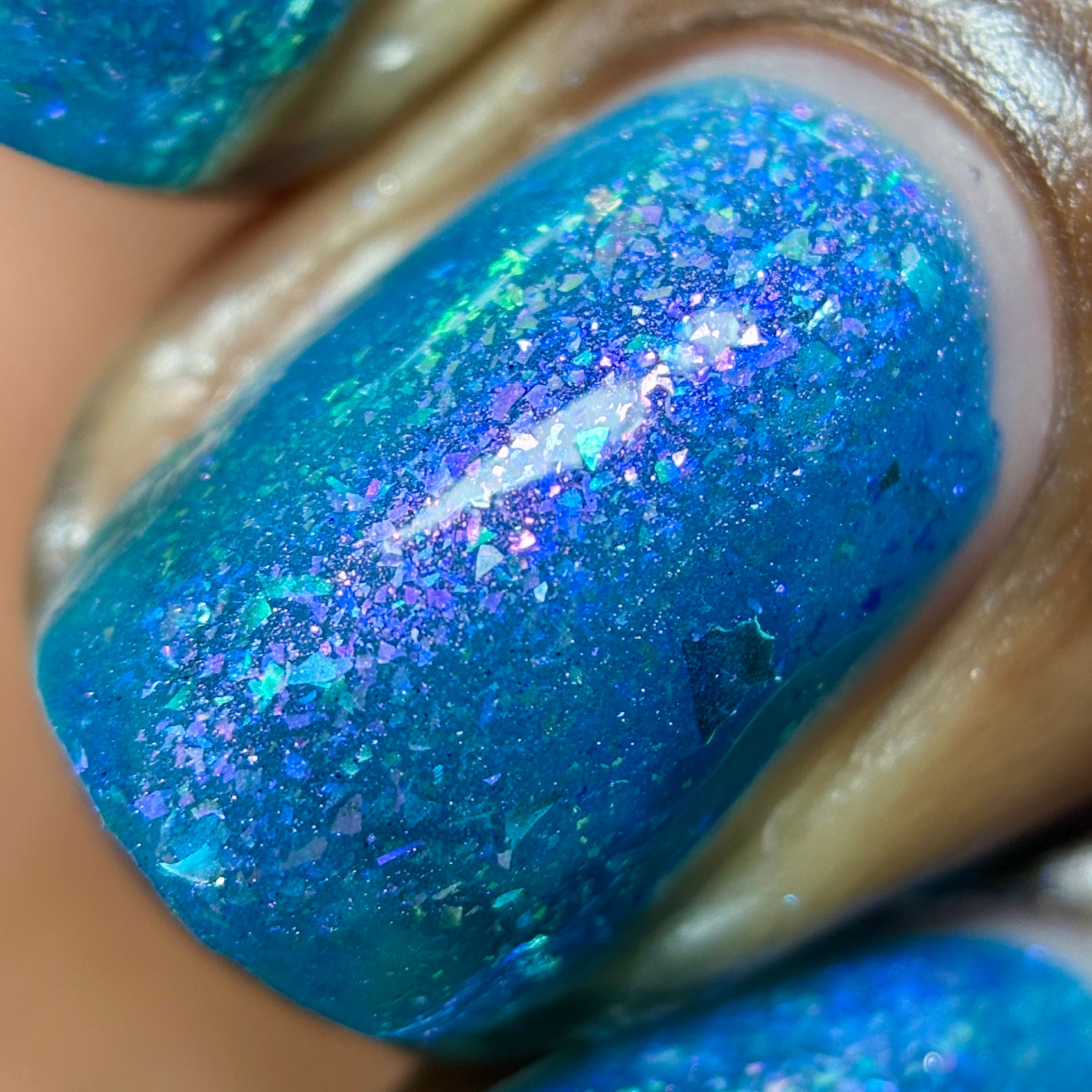 Brynhildr has a bright blue base with pink to yellow large particle shimmer and green/purple, pink/green, and silver/blue flakes. This one is a flakie bomb!