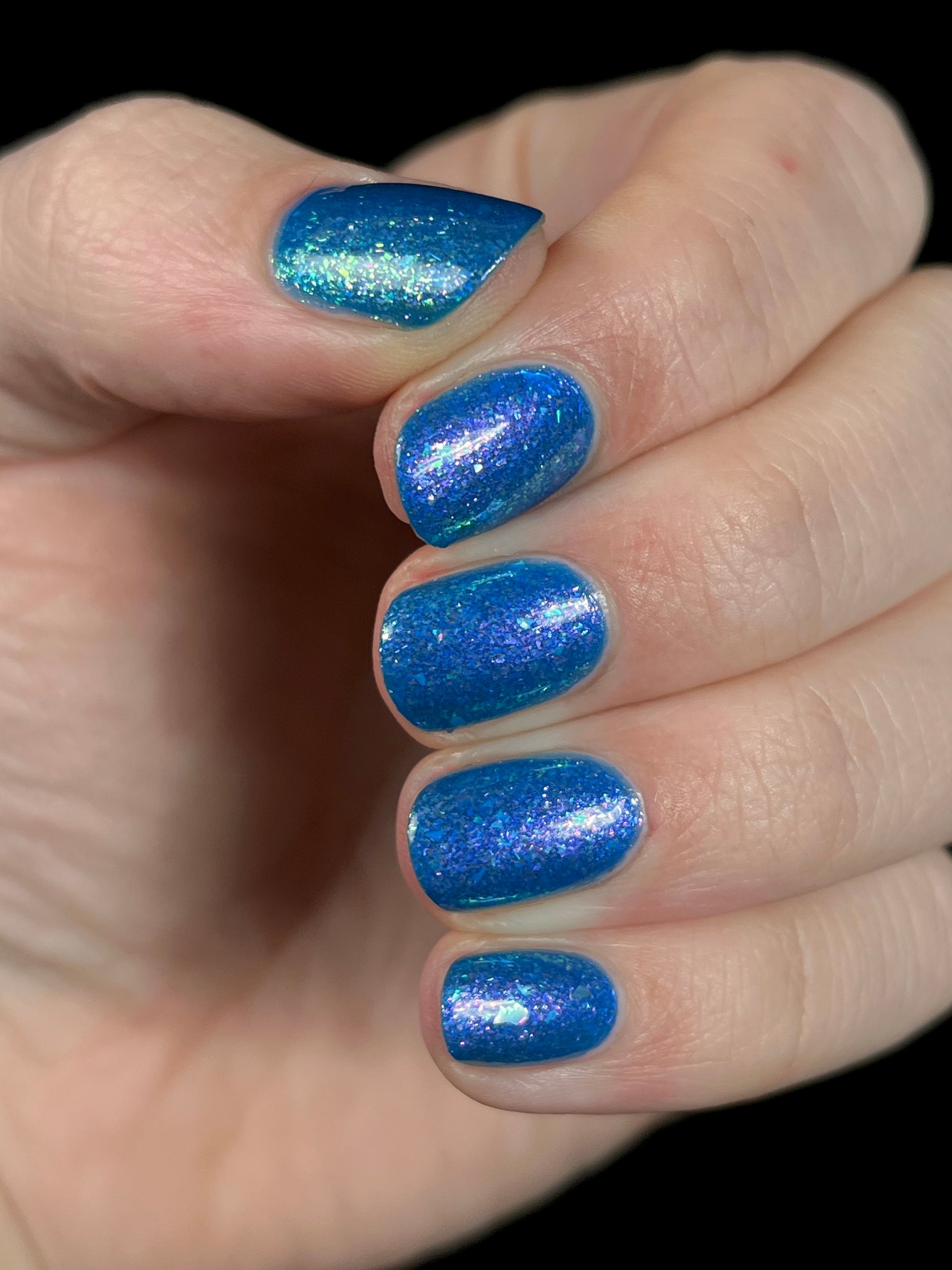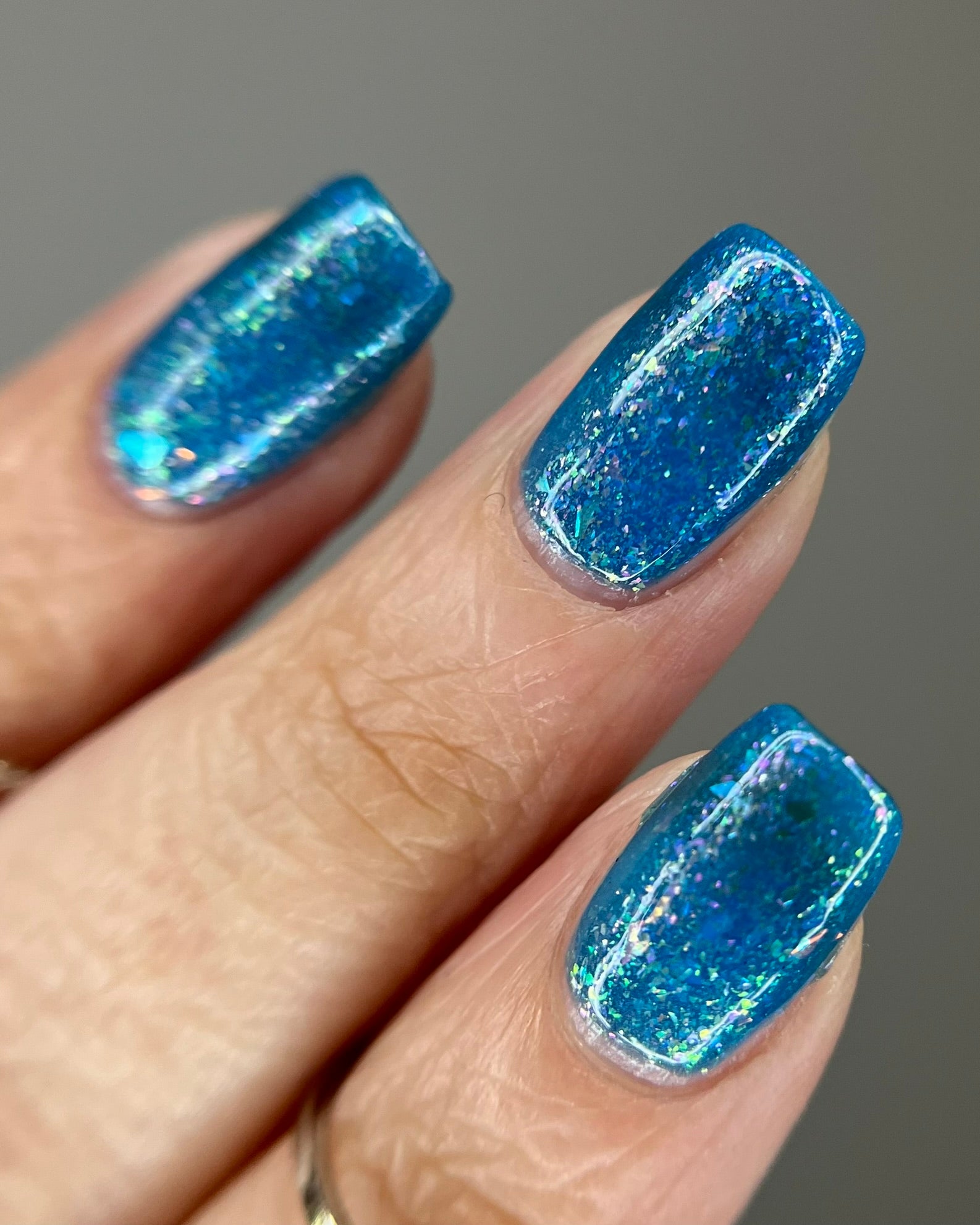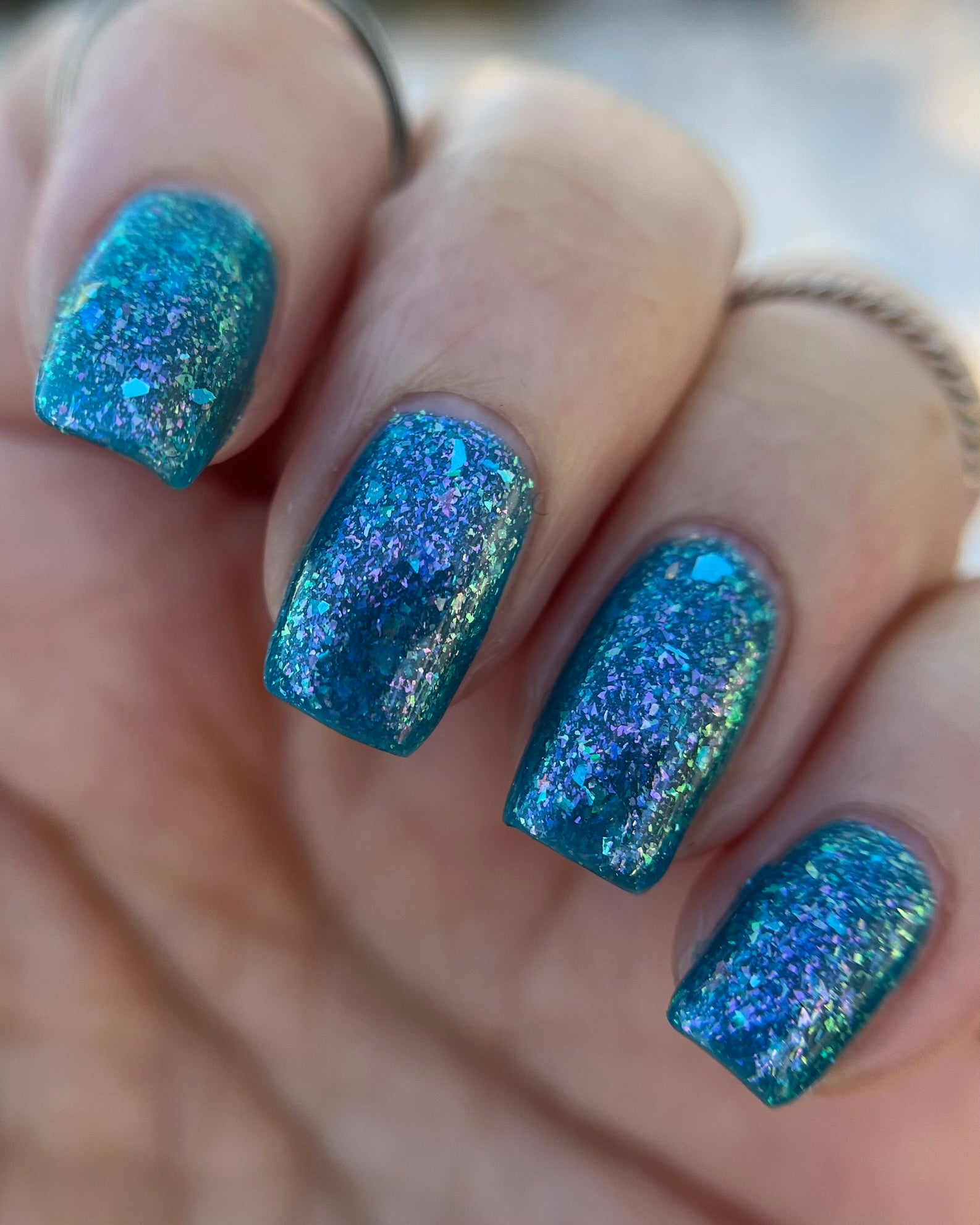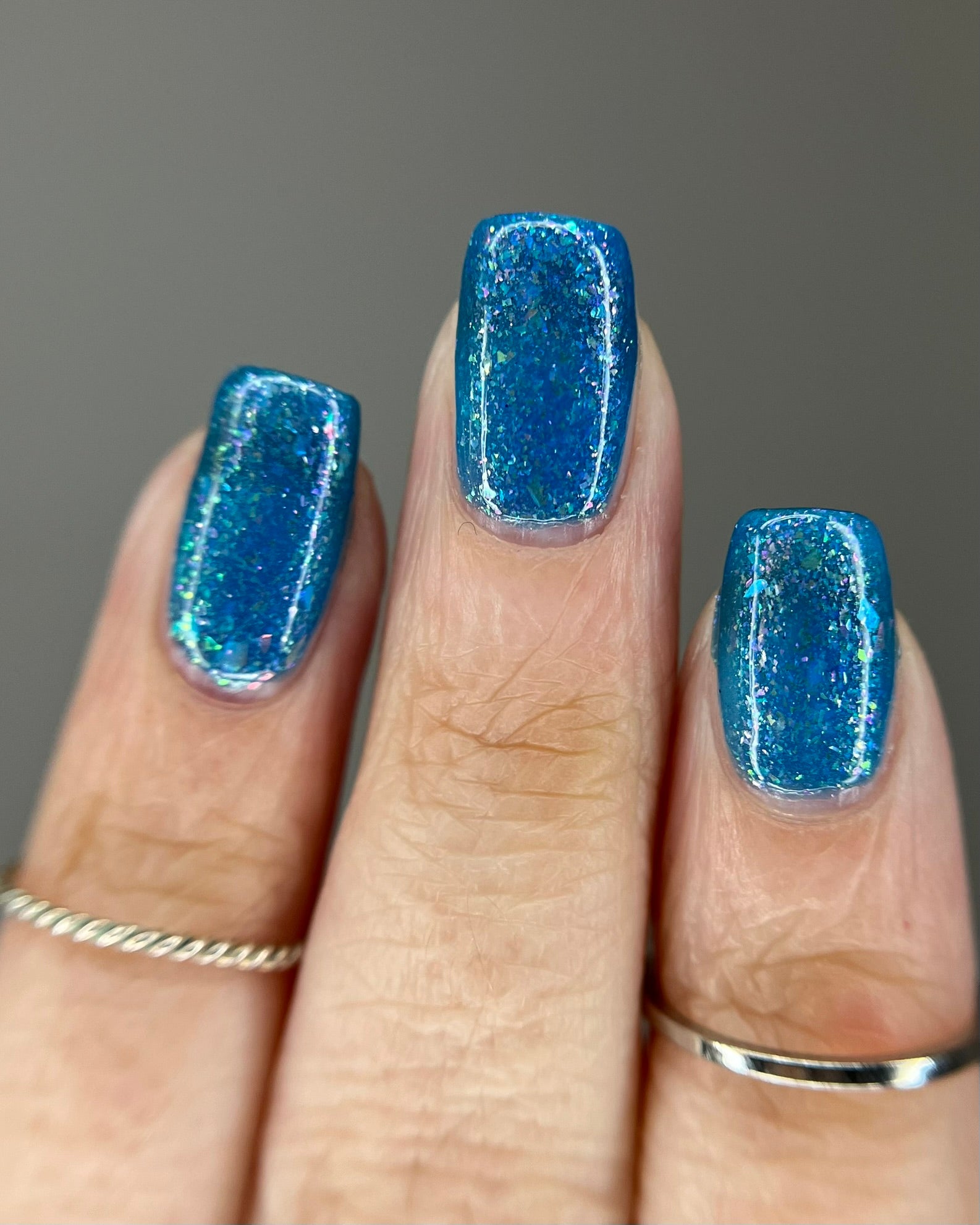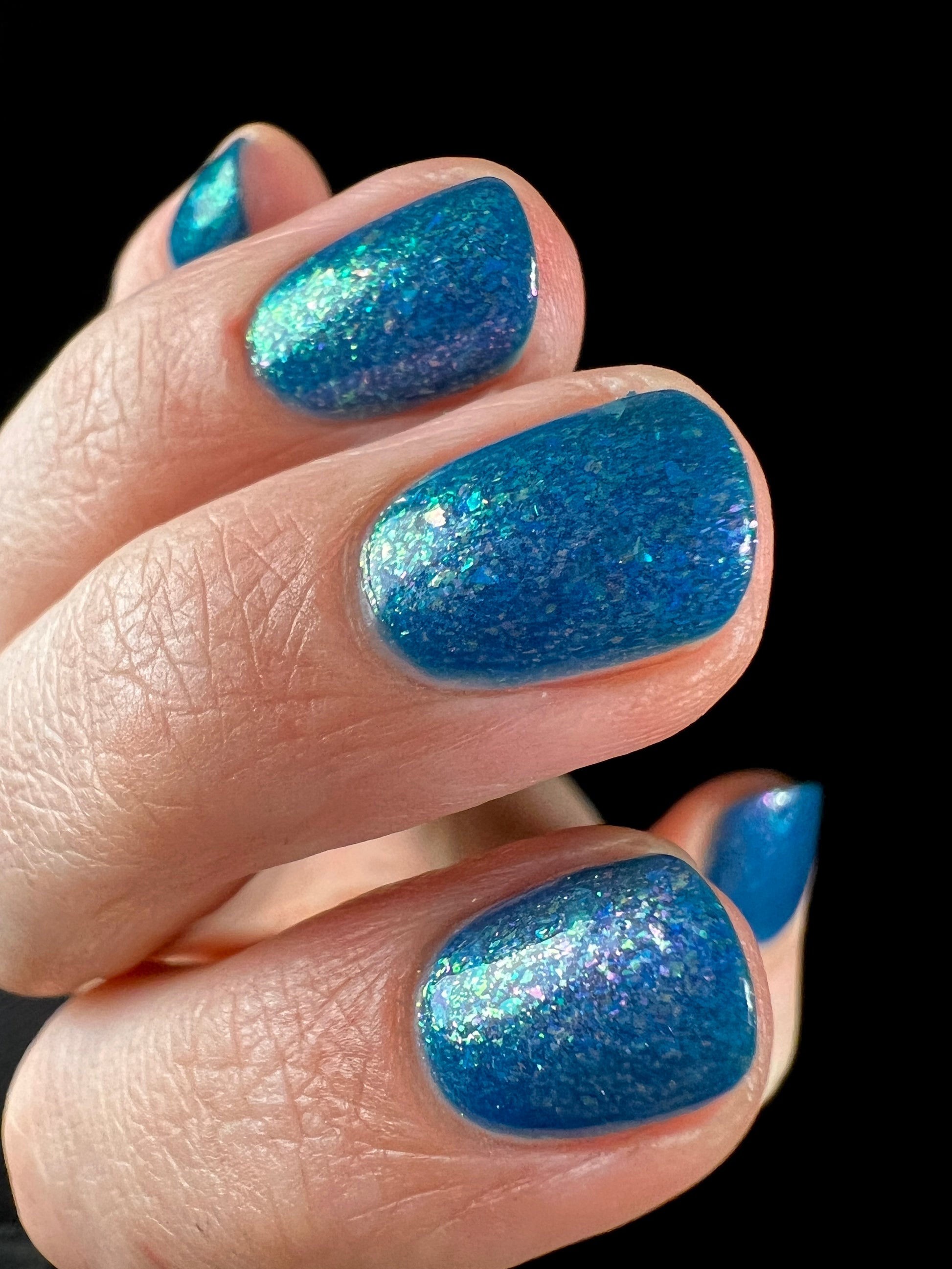 Brynhildr has a bright blue base with pink to yellow large particle shimmer and green/purple, pink/green, and silver/blue flakes. This one is a flakie bomb!