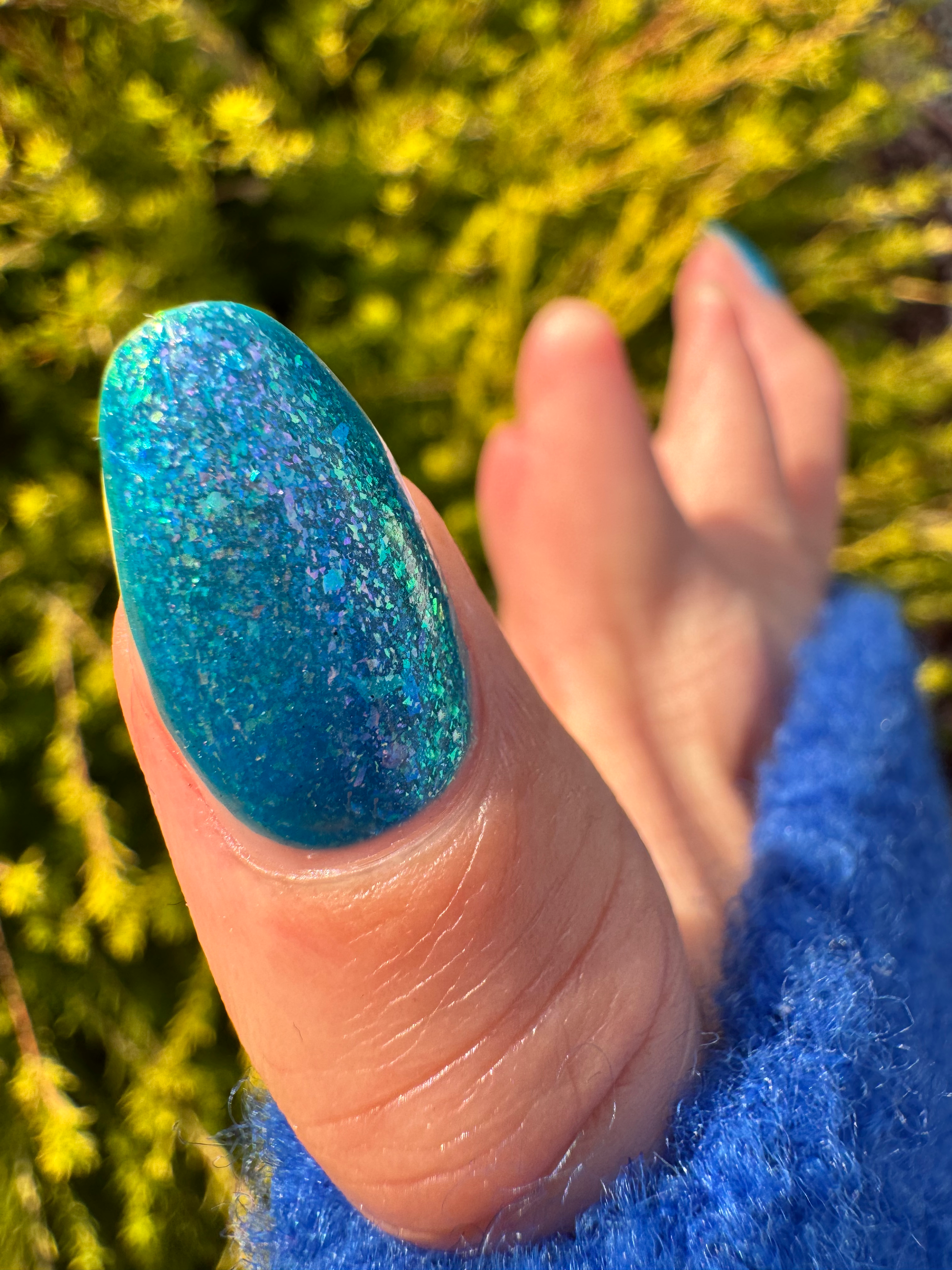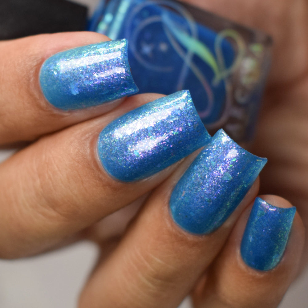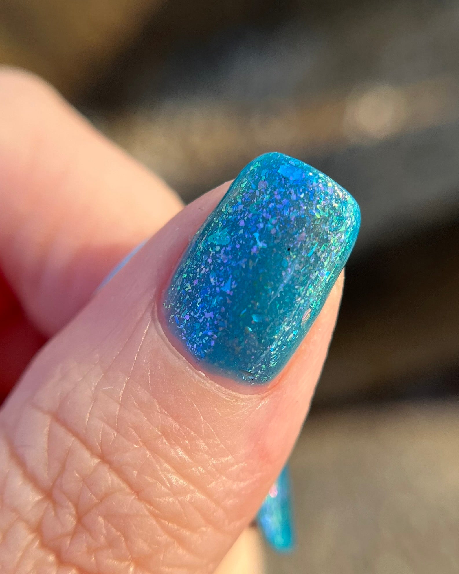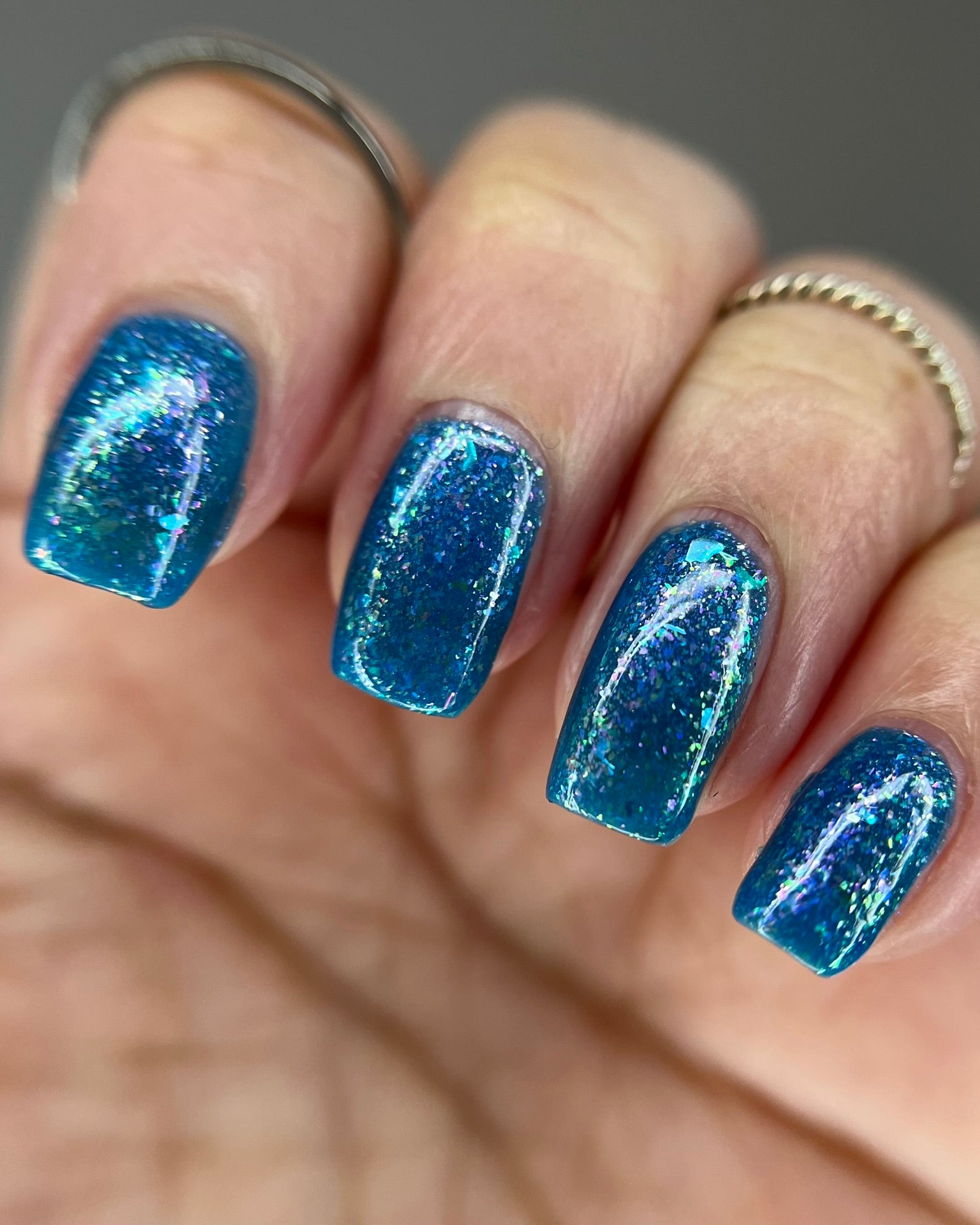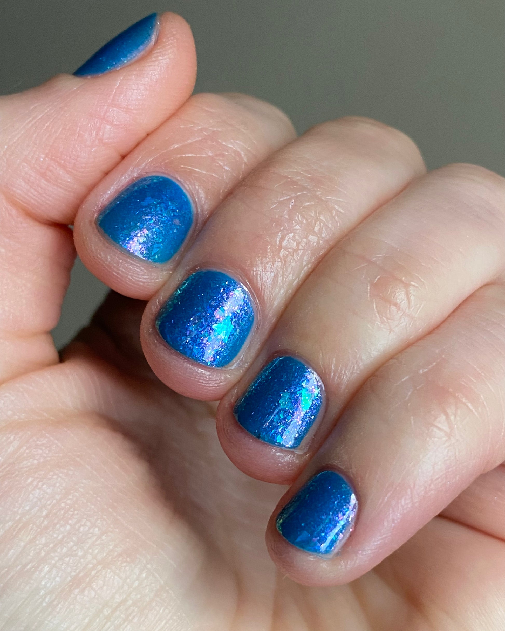 Brynhildr has a bright blue base with pink to yellow large particle shimmer and green/purple, pink/green, and silver/blue flakes. This one is a flakie bomb!