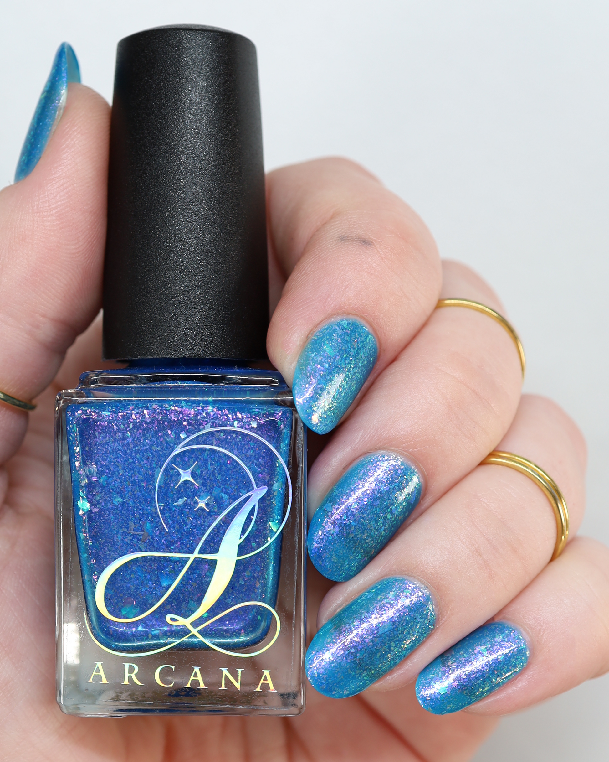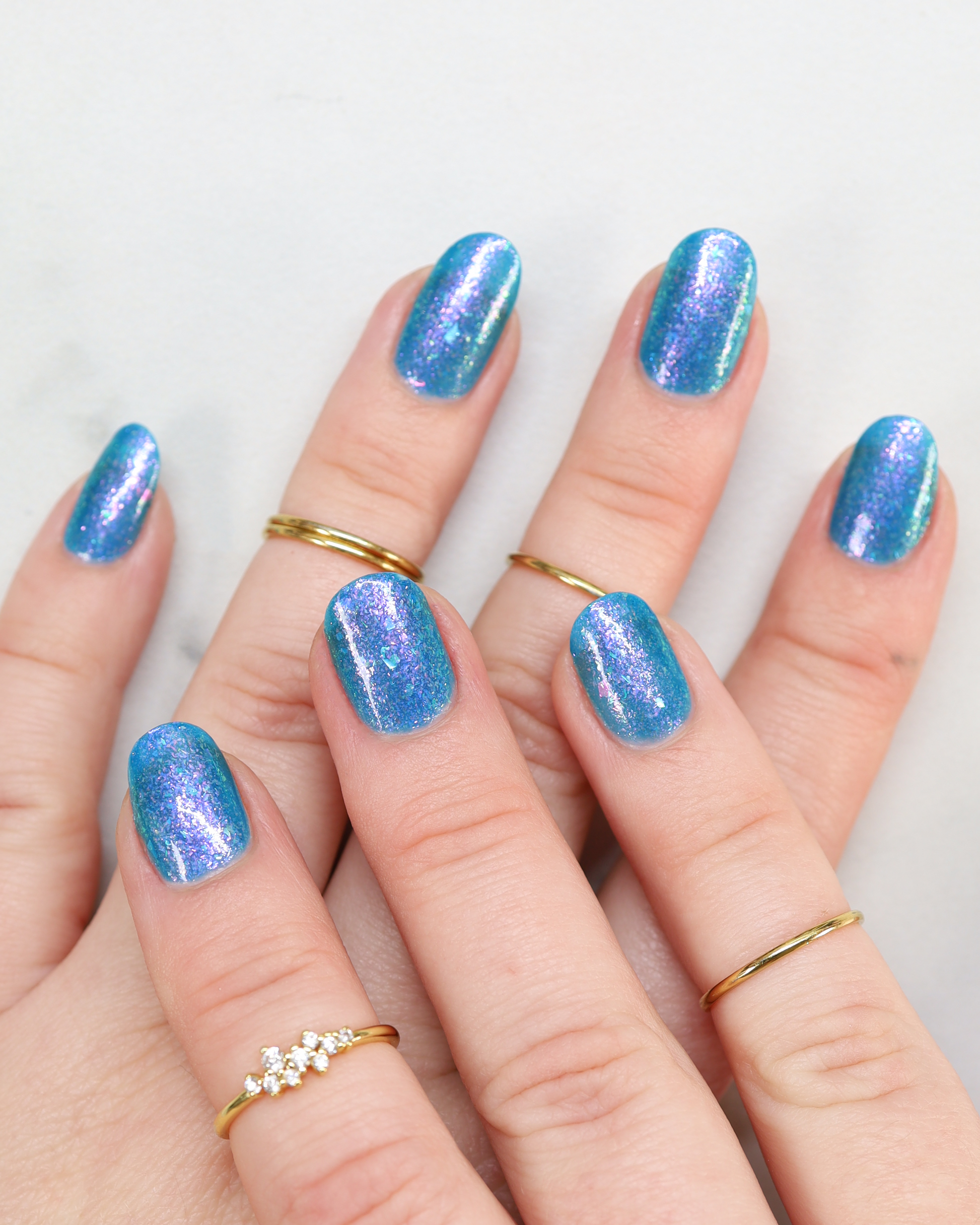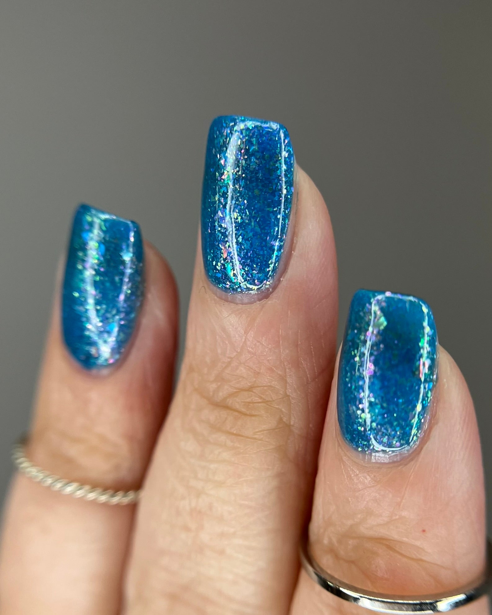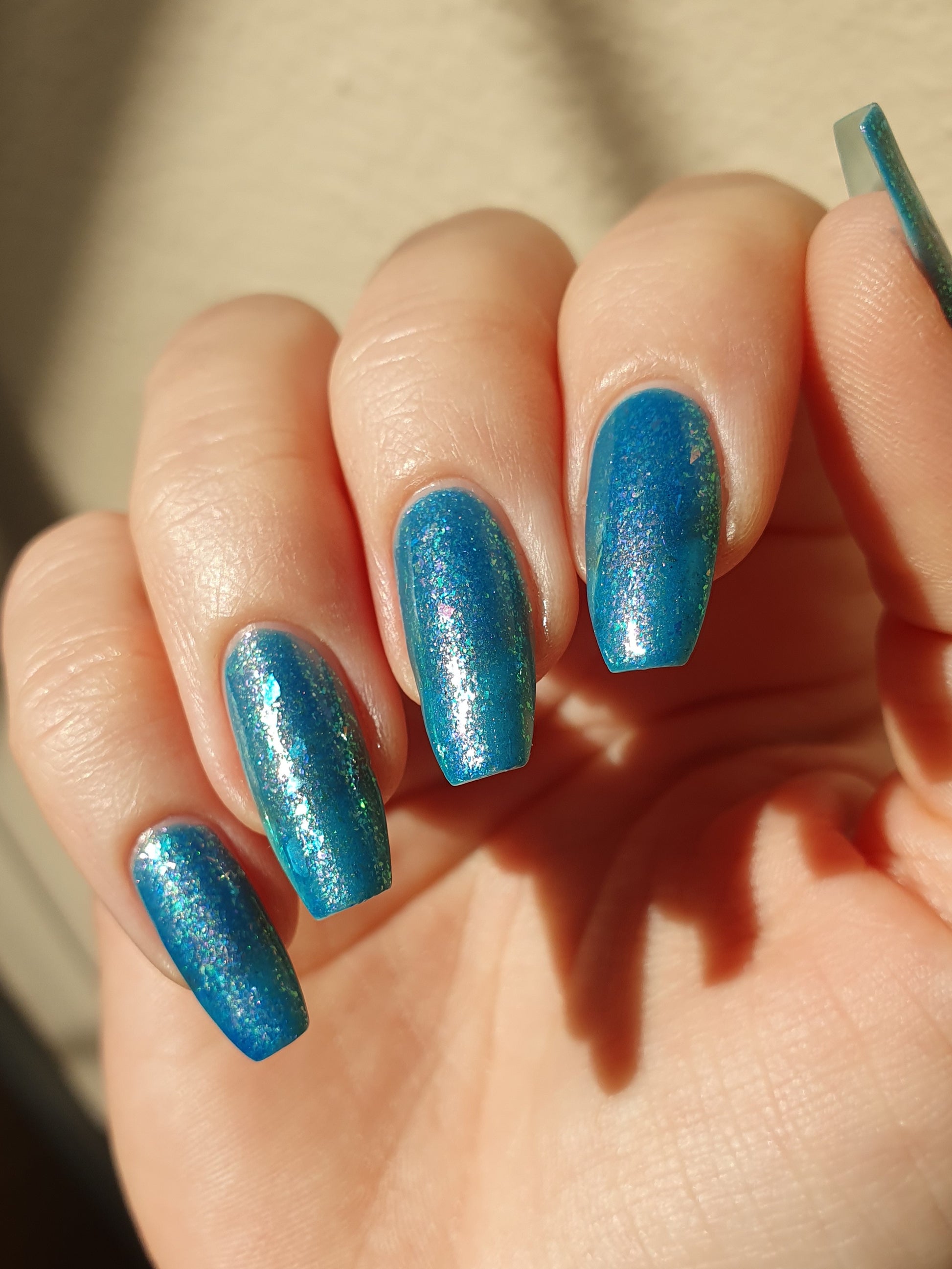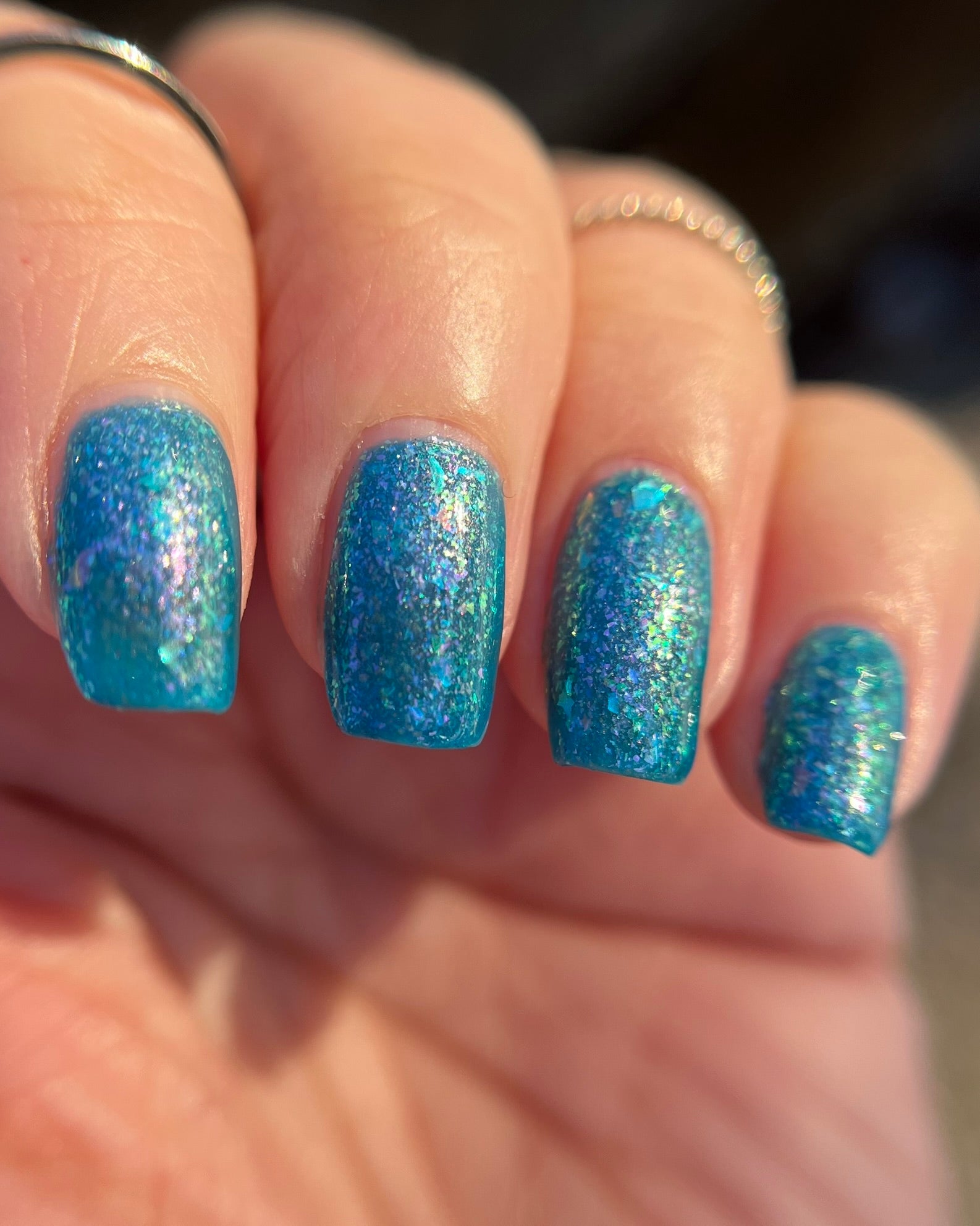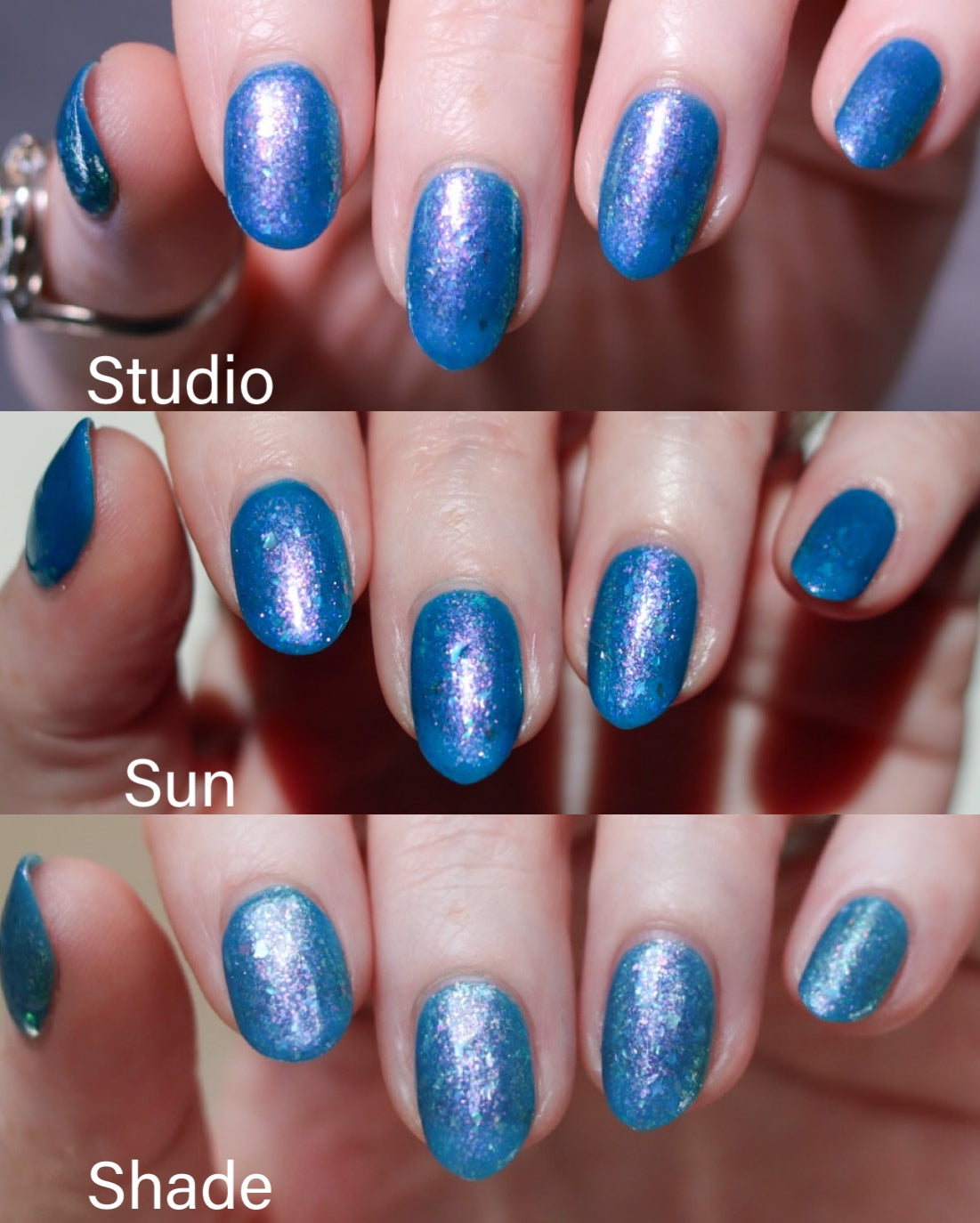 Brynhildr has a bright blue base with pink to yellow large particle shimmer and green/purple, pink/green, and silver/blue flakes. This one is a flakie bomb!