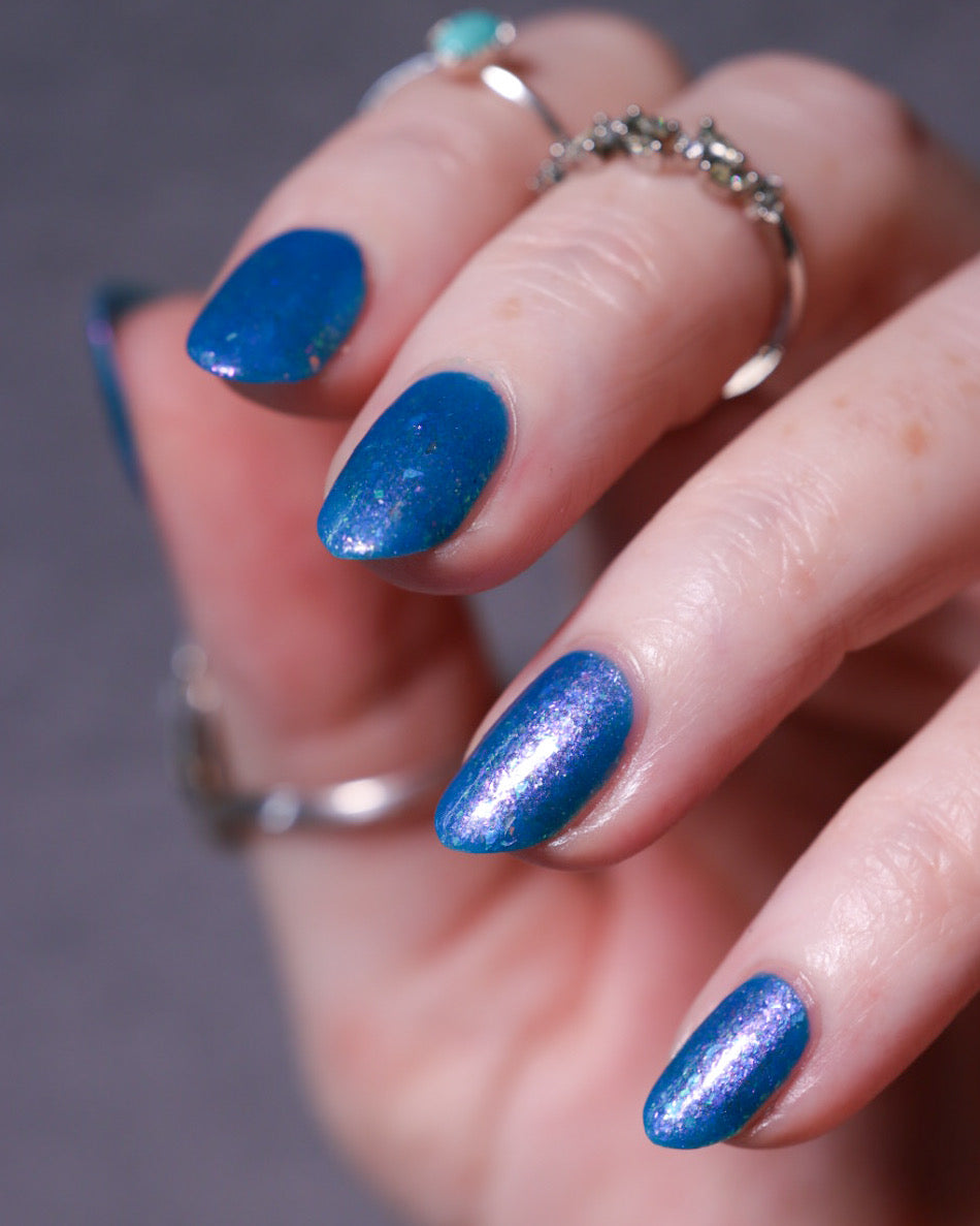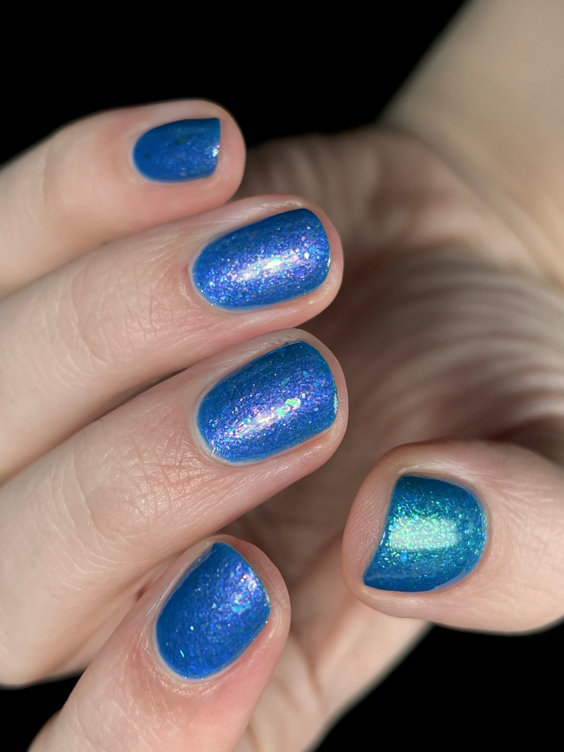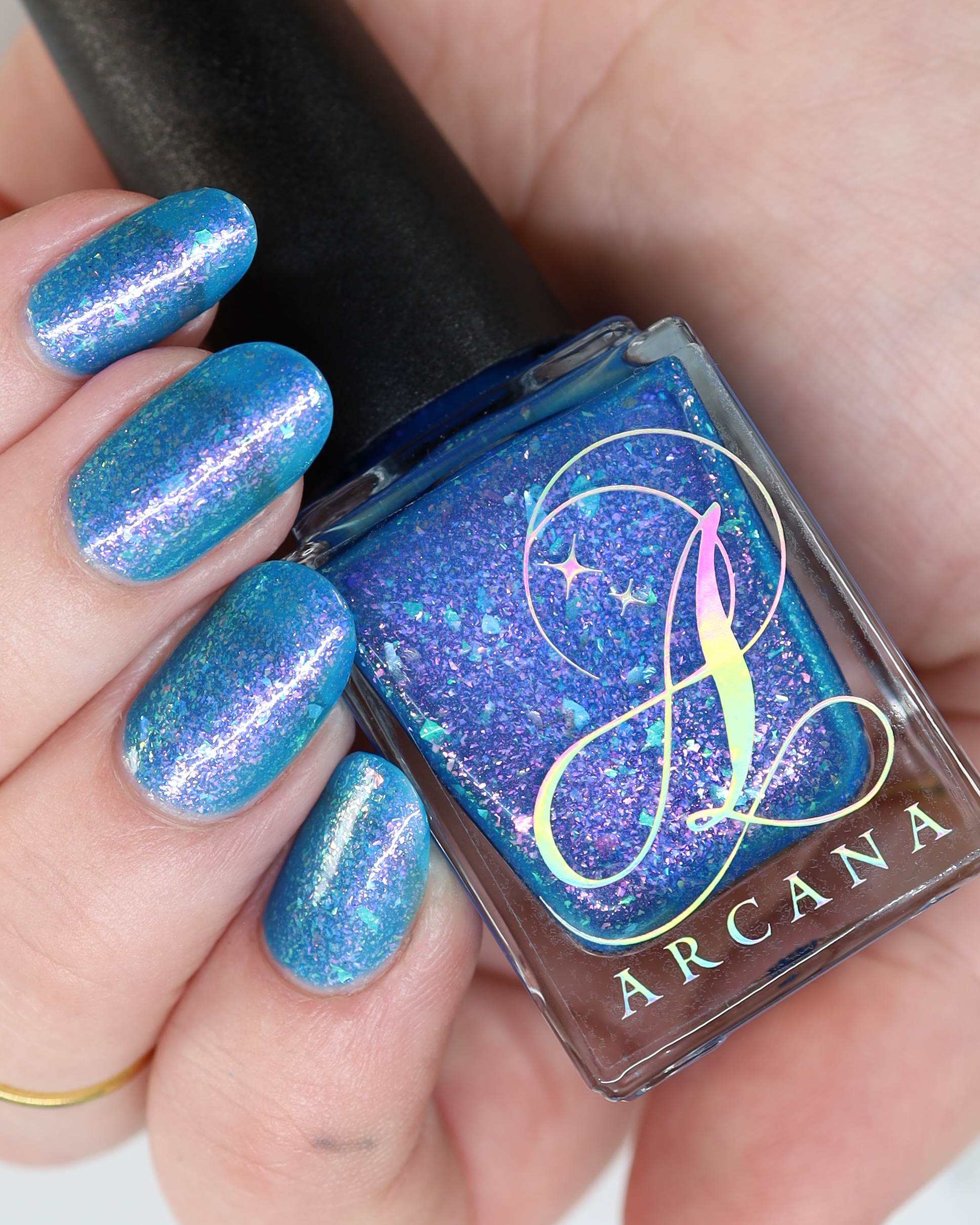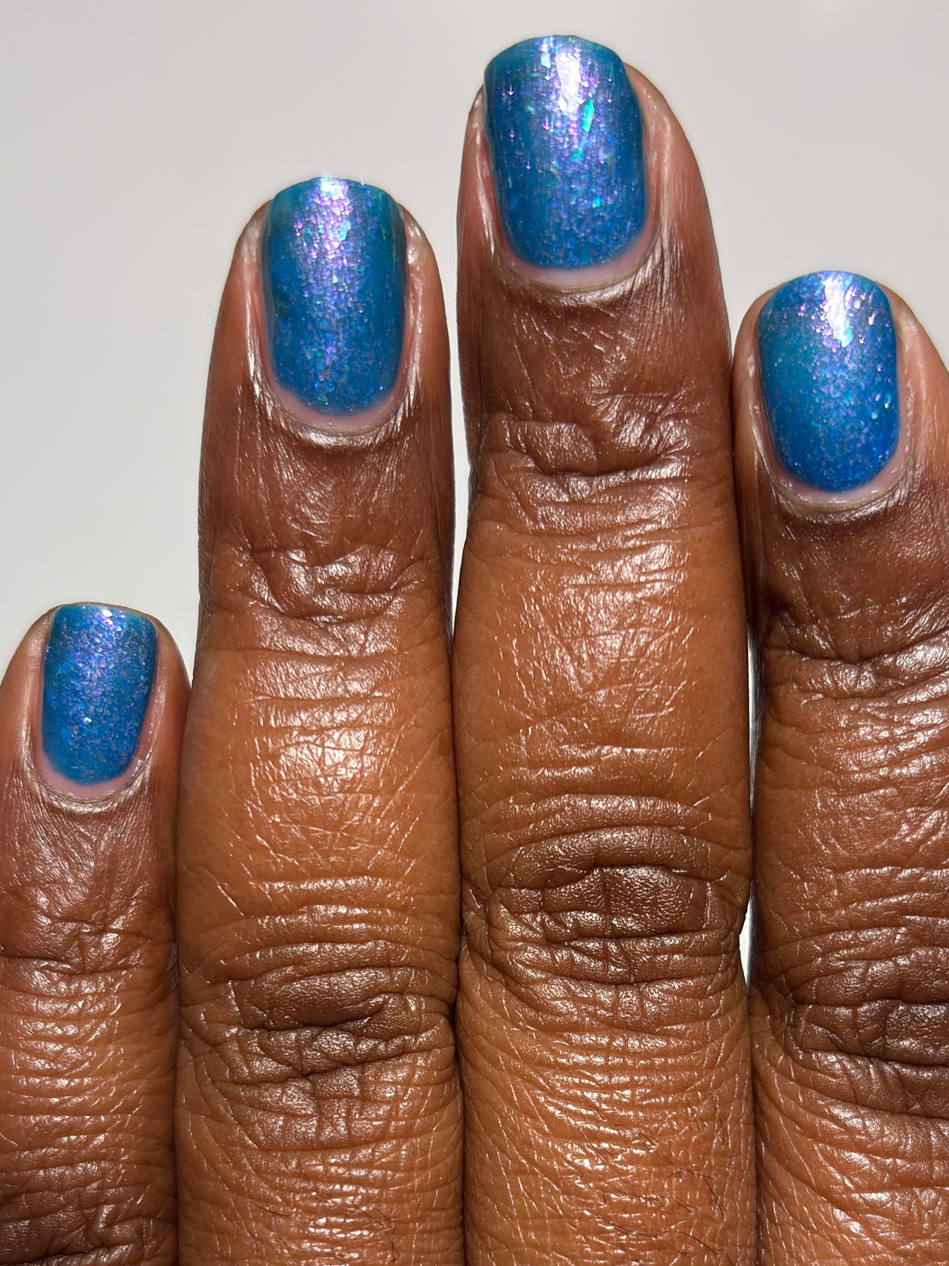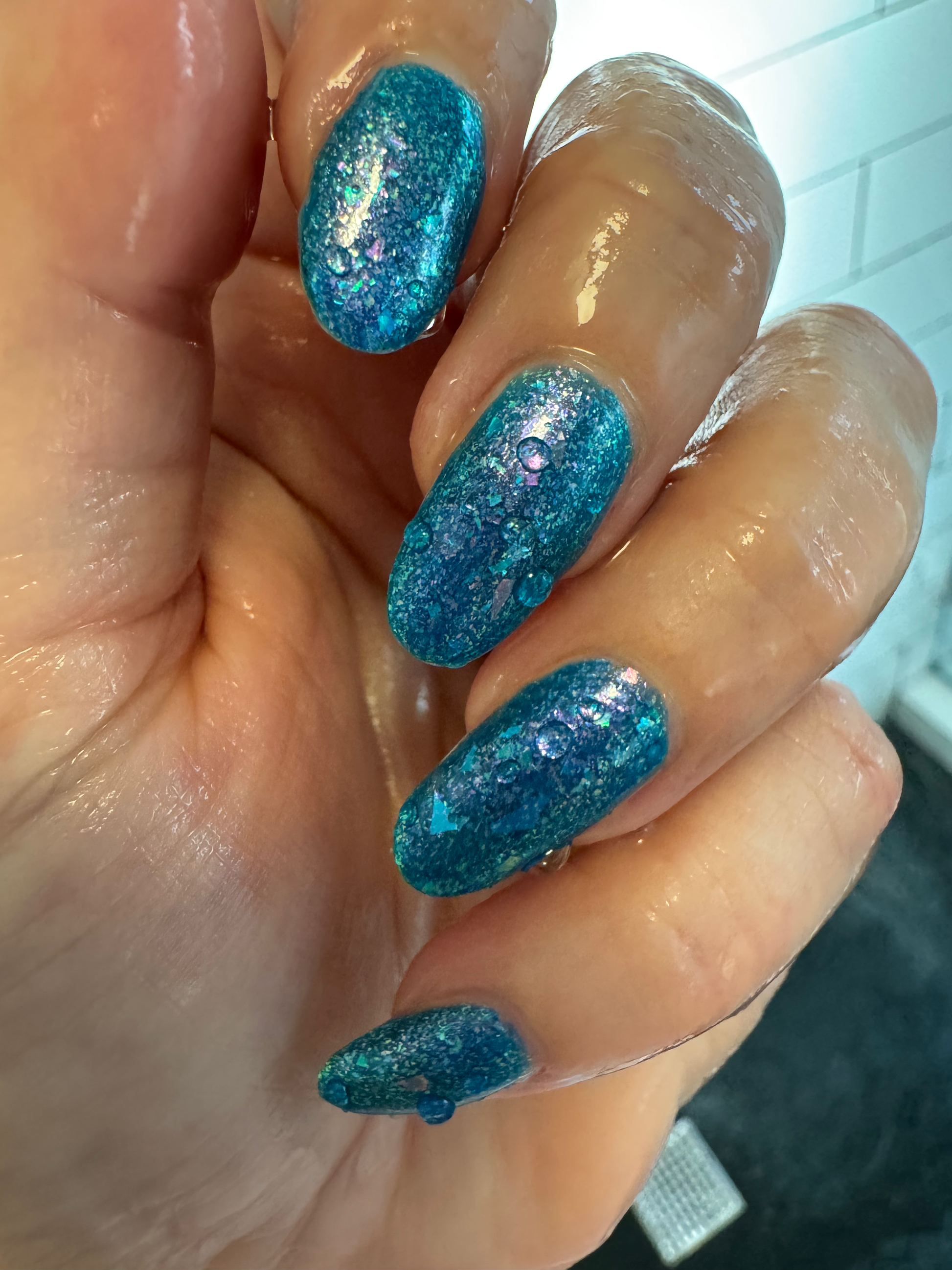 Brynhildr has a bright blue base with pink to yellow large particle shimmer and green/purple, pink/green, and silver/blue flakes. This one is a flakie bomb!