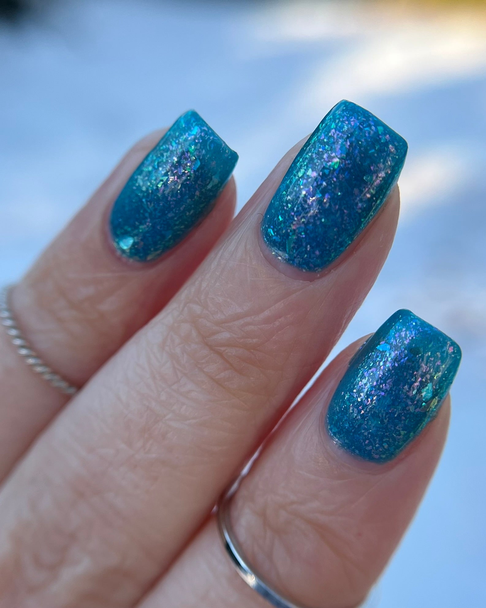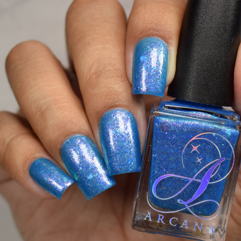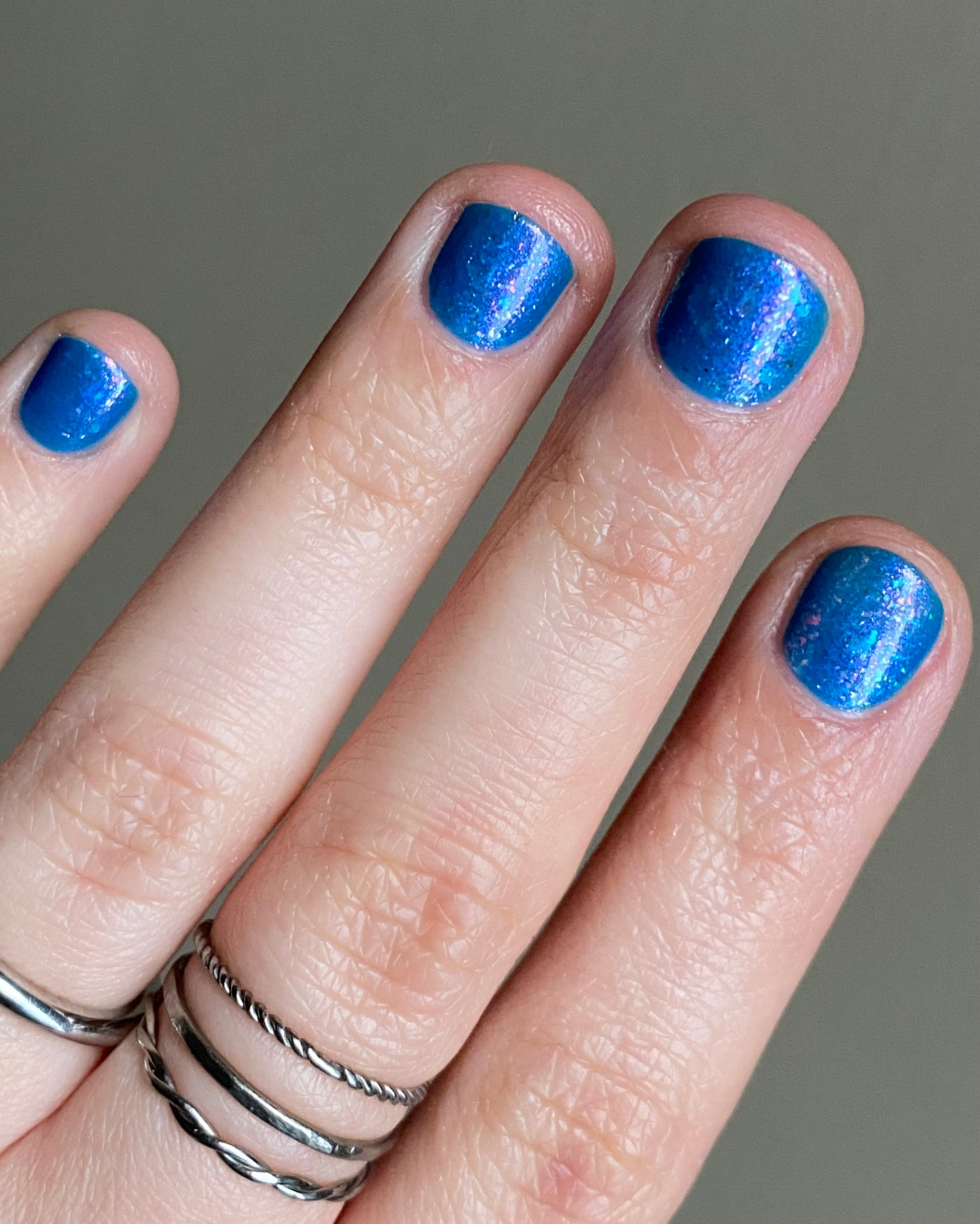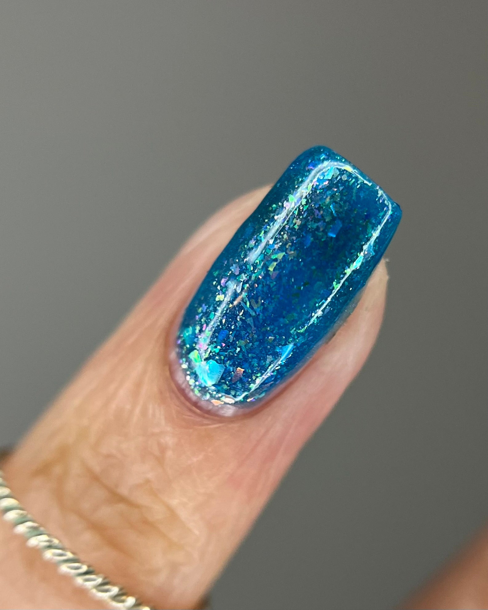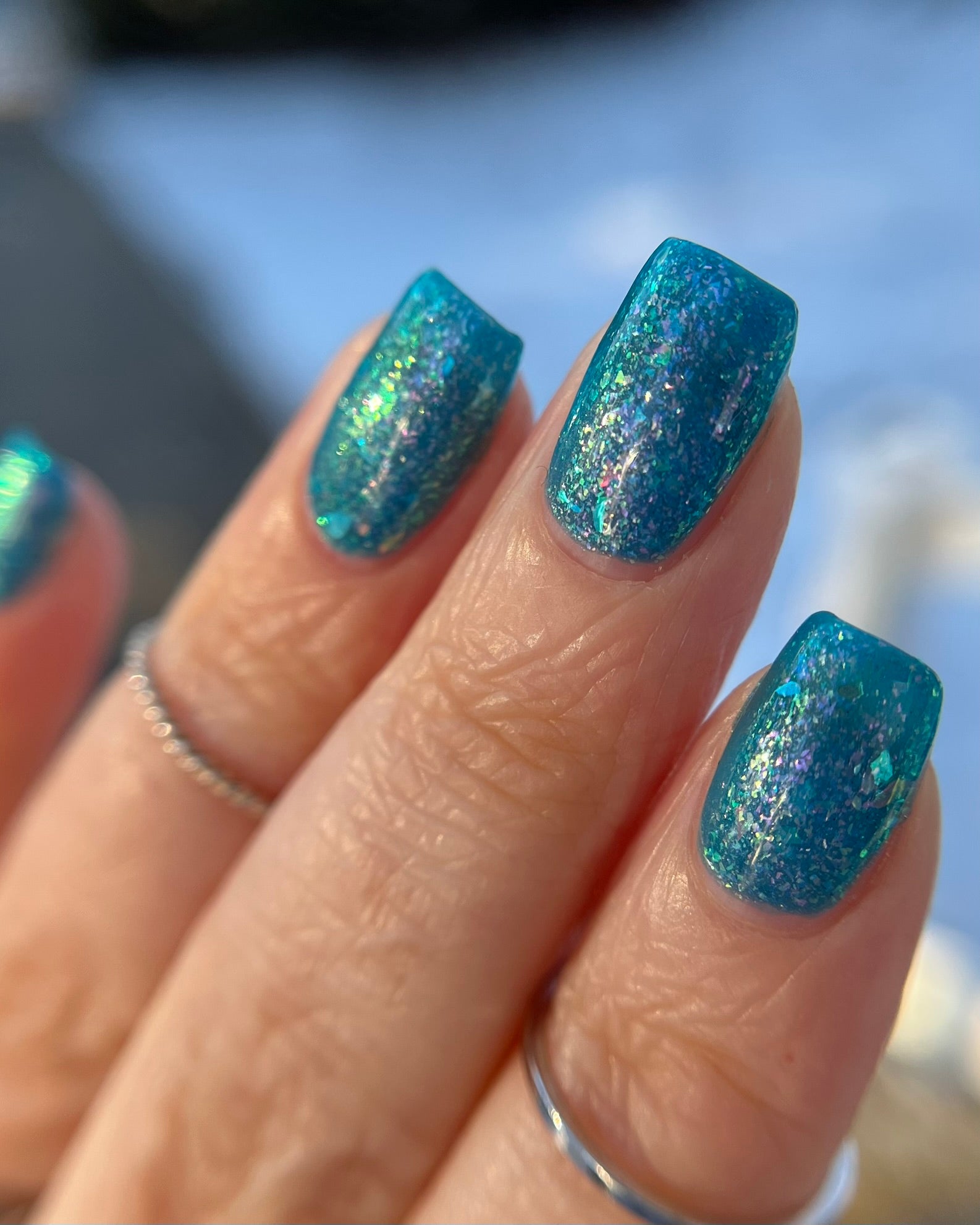 Brynhildr has a bright blue base with pink to yellow large particle shimmer and green/purple, pink/green, and silver/blue flakes. This one is a flakie bomb!