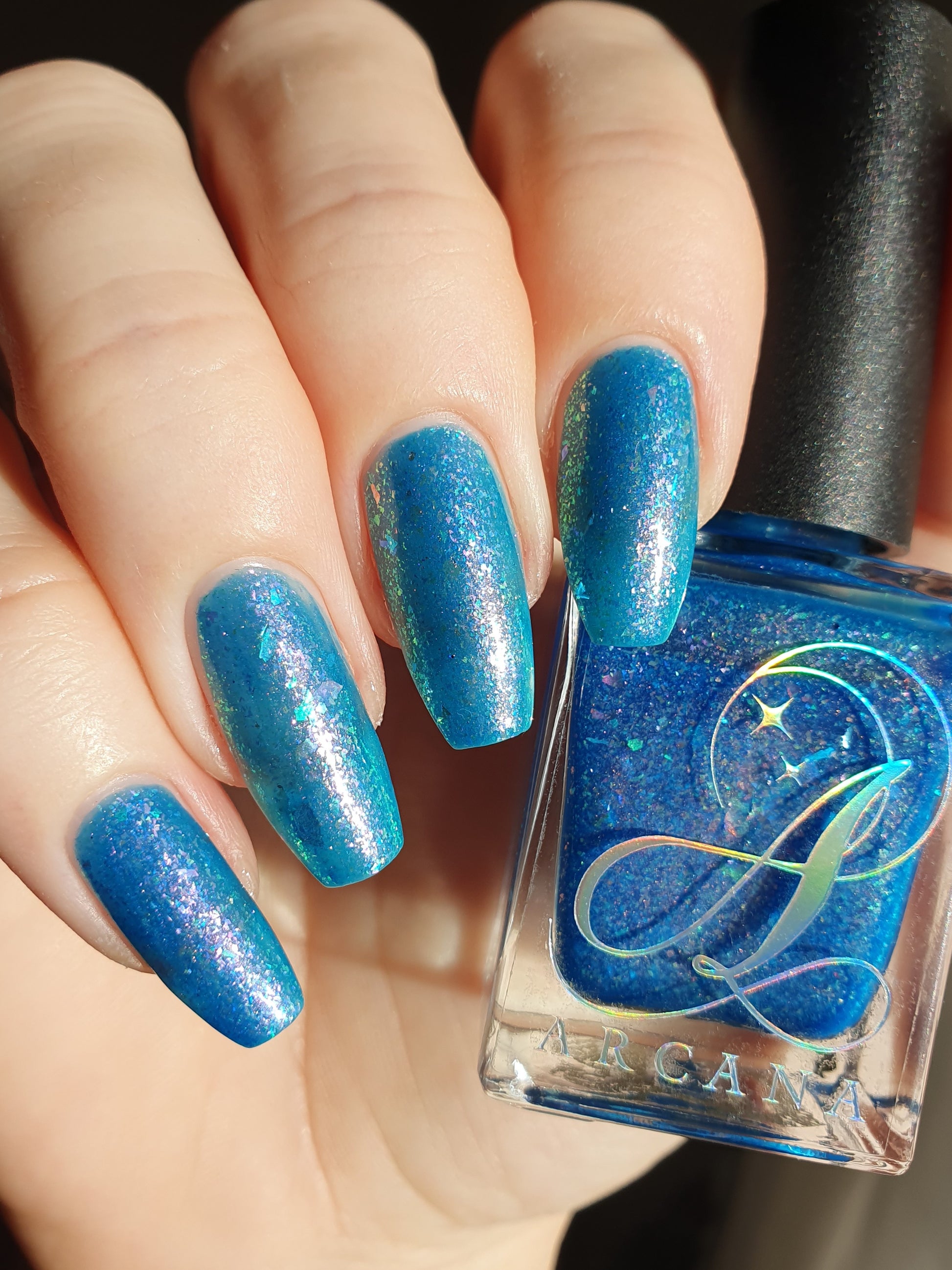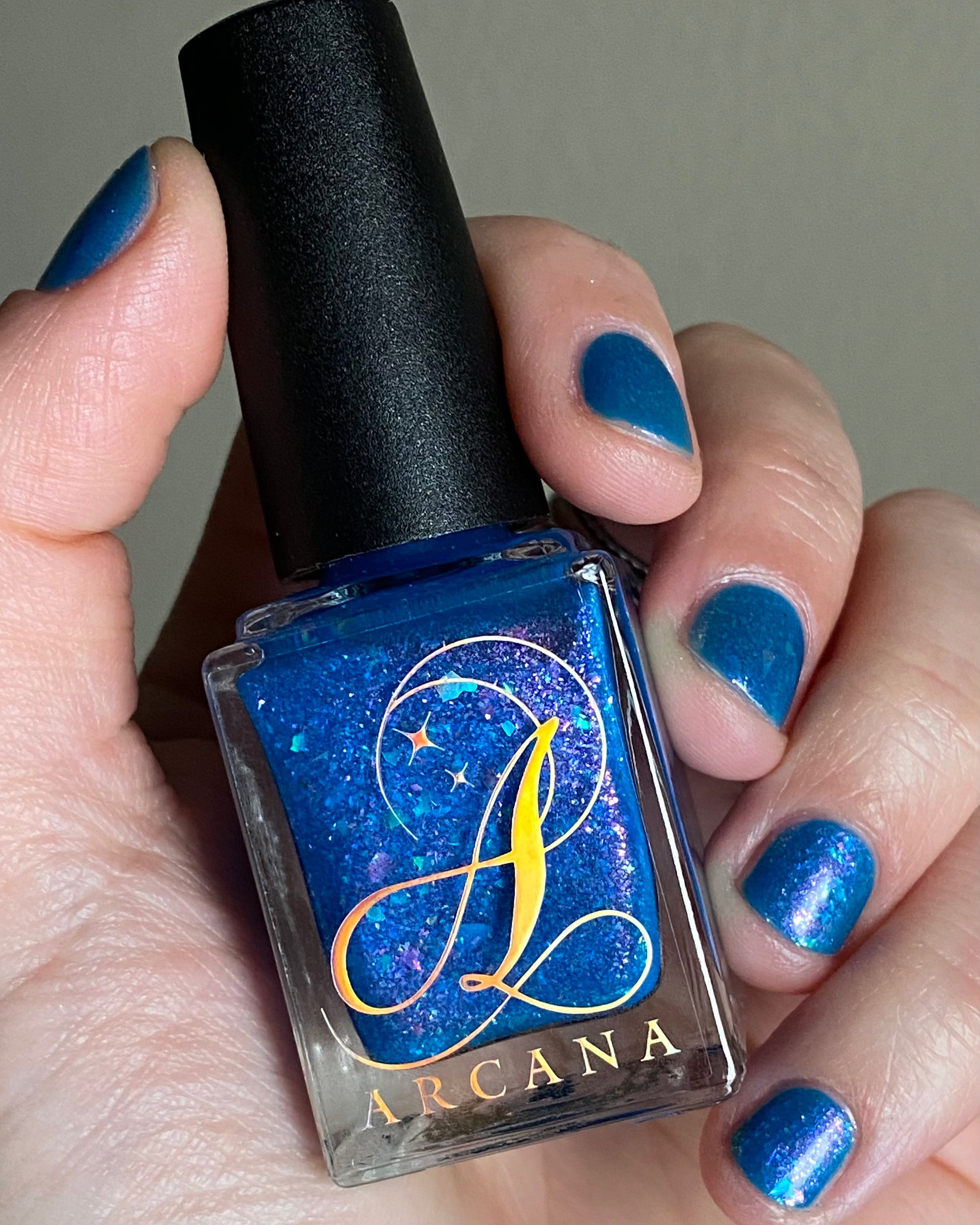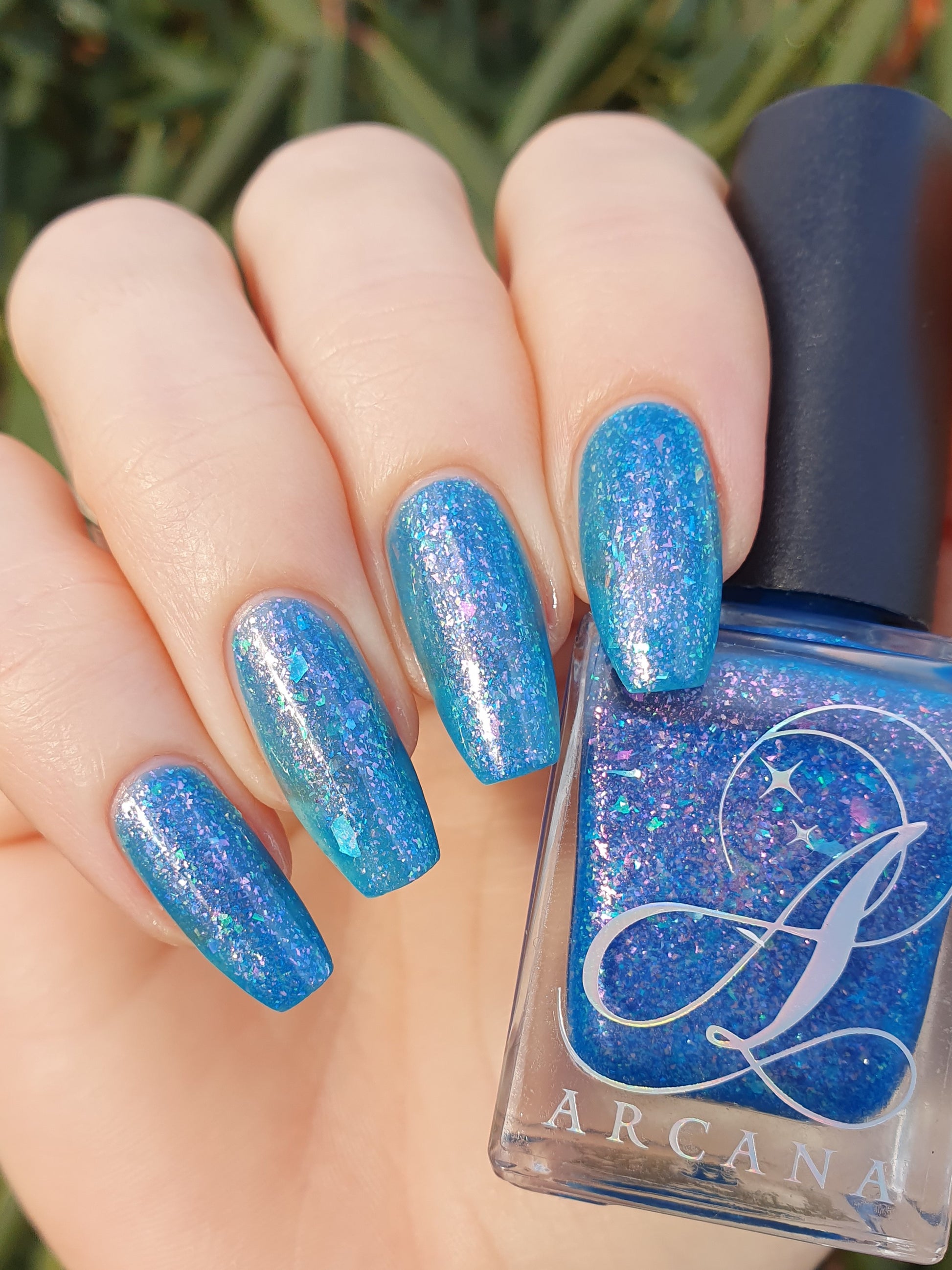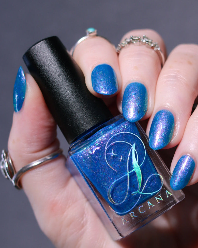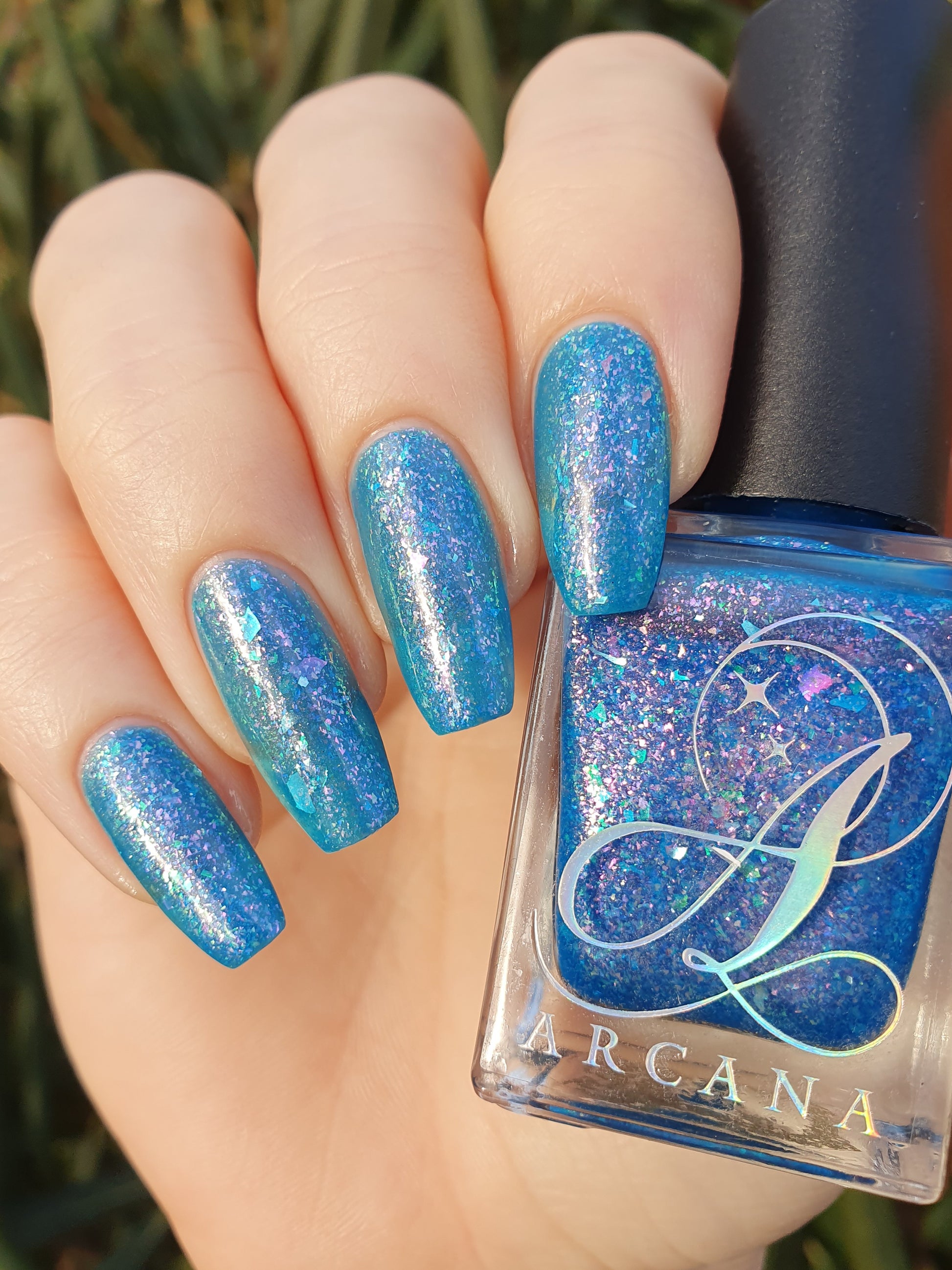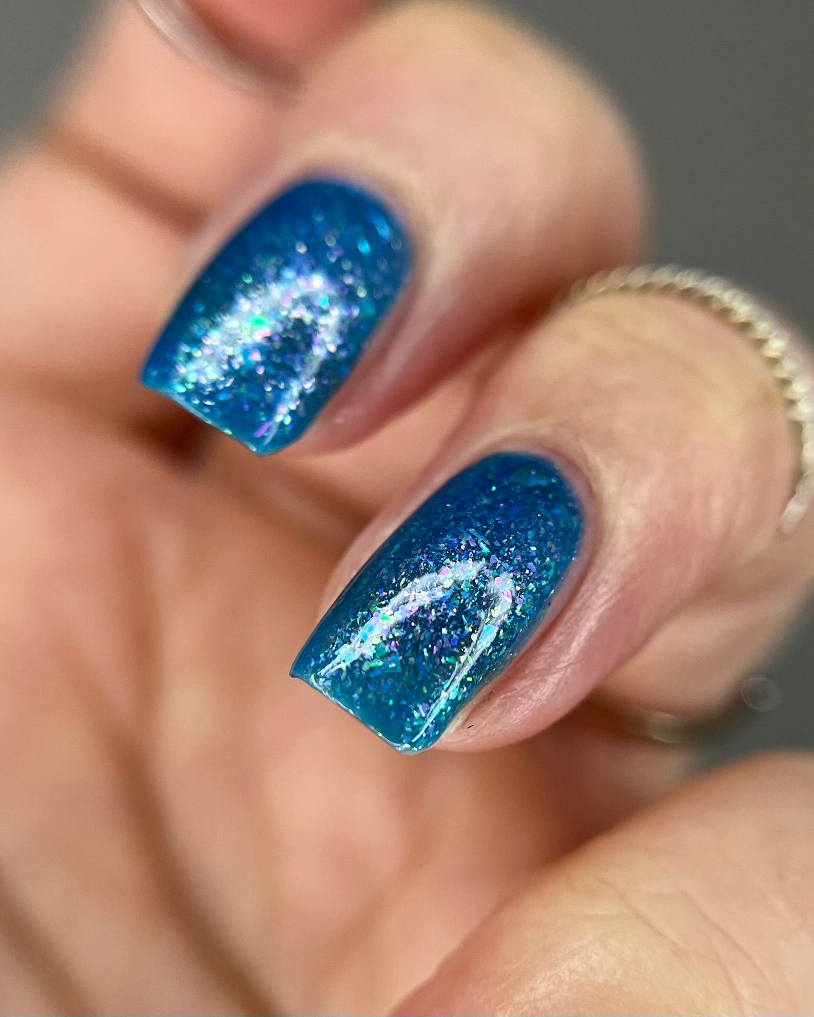 Brynhildr has a bright blue base with pink to yellow large particle shimmer and green/purple, pink/green, and silver/blue flakes. This one is a flakie bomb!
