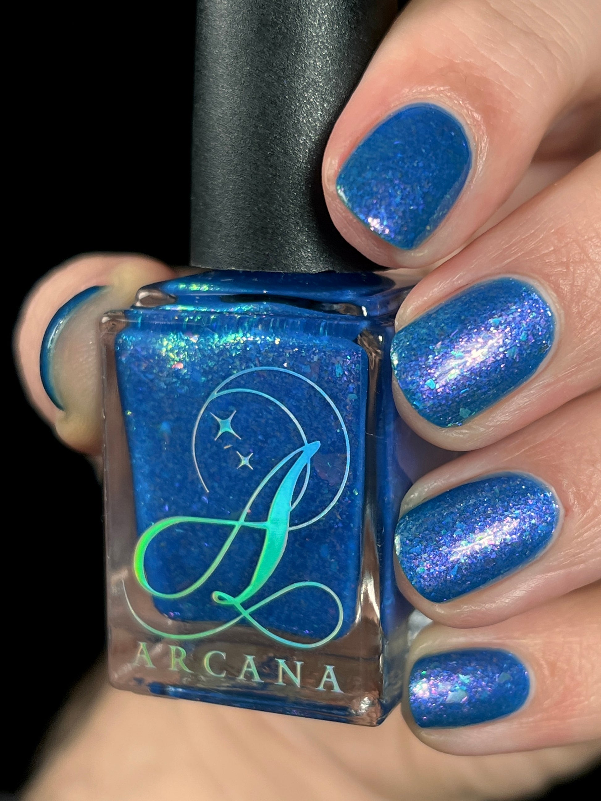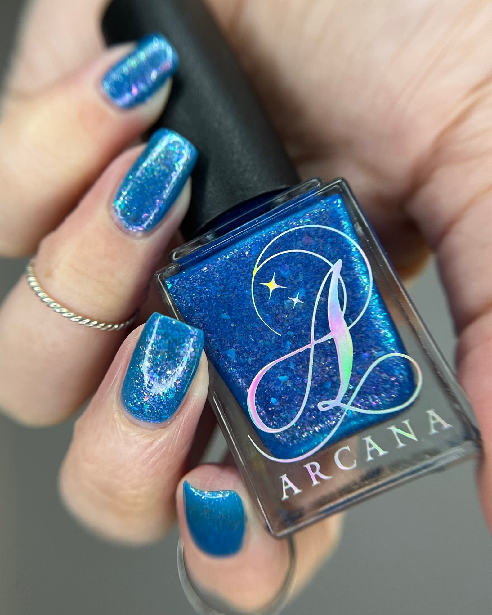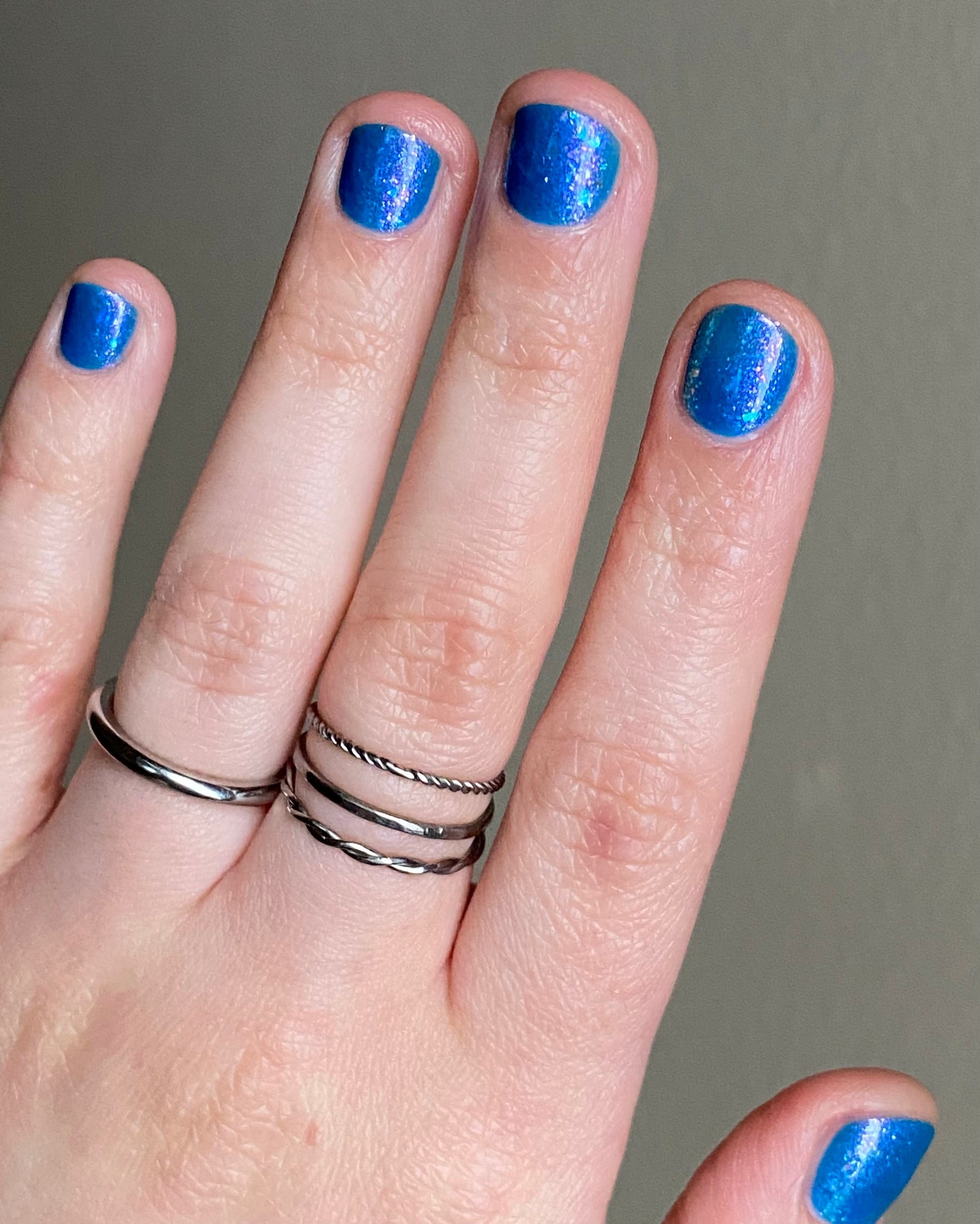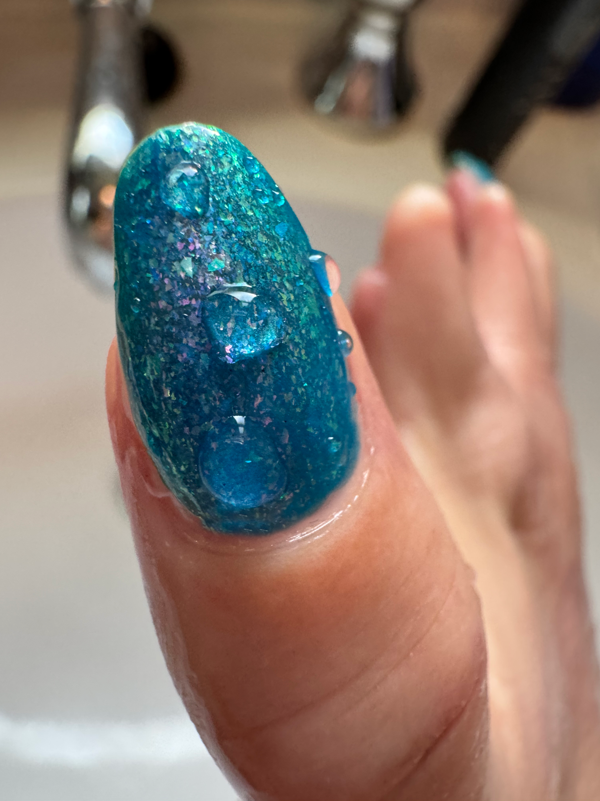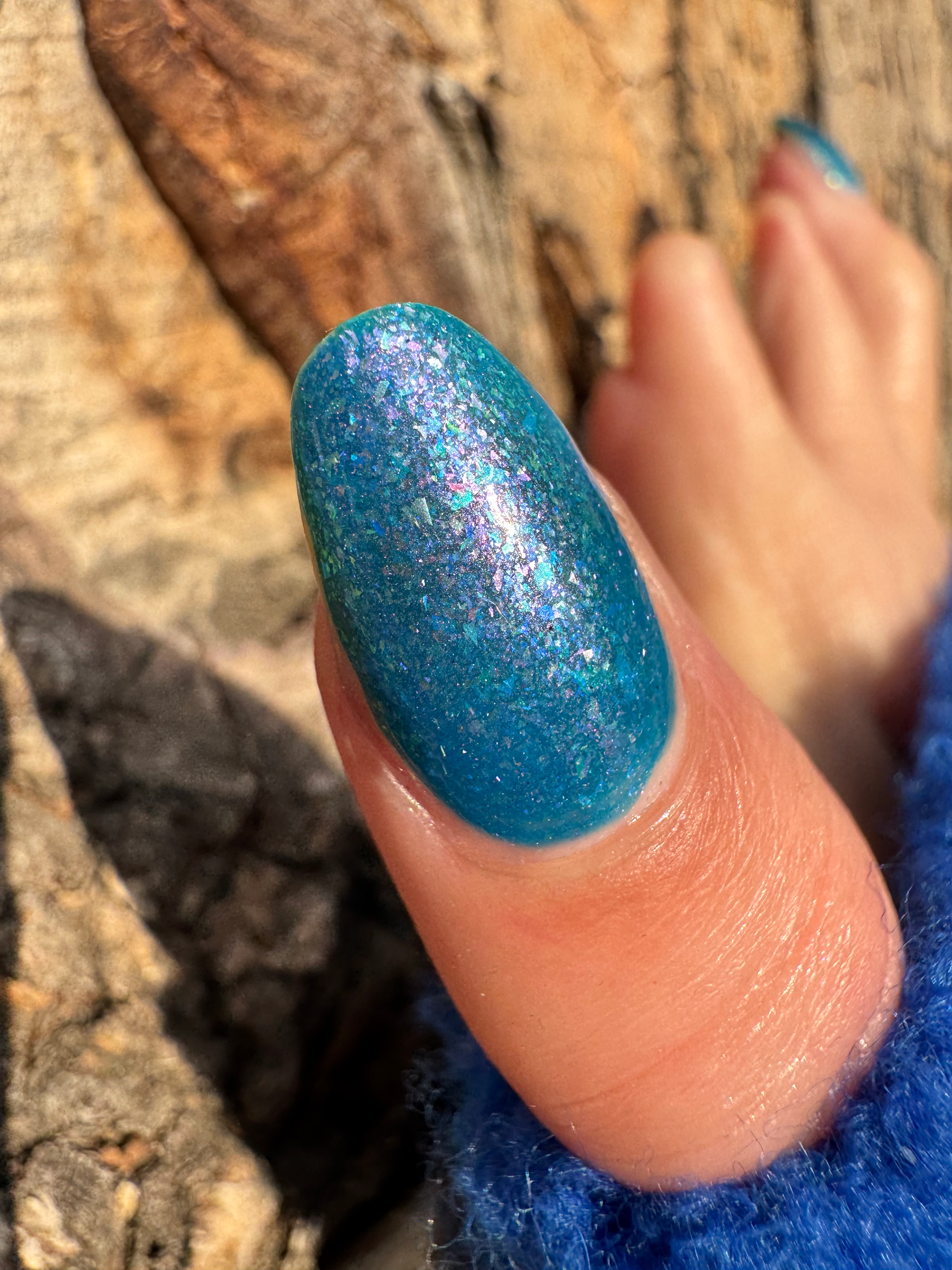 Brynhildr has a bright blue base with pink to yellow large particle shimmer and green/purple, pink/green, and silver/blue flakes. This one is a flakie bomb!