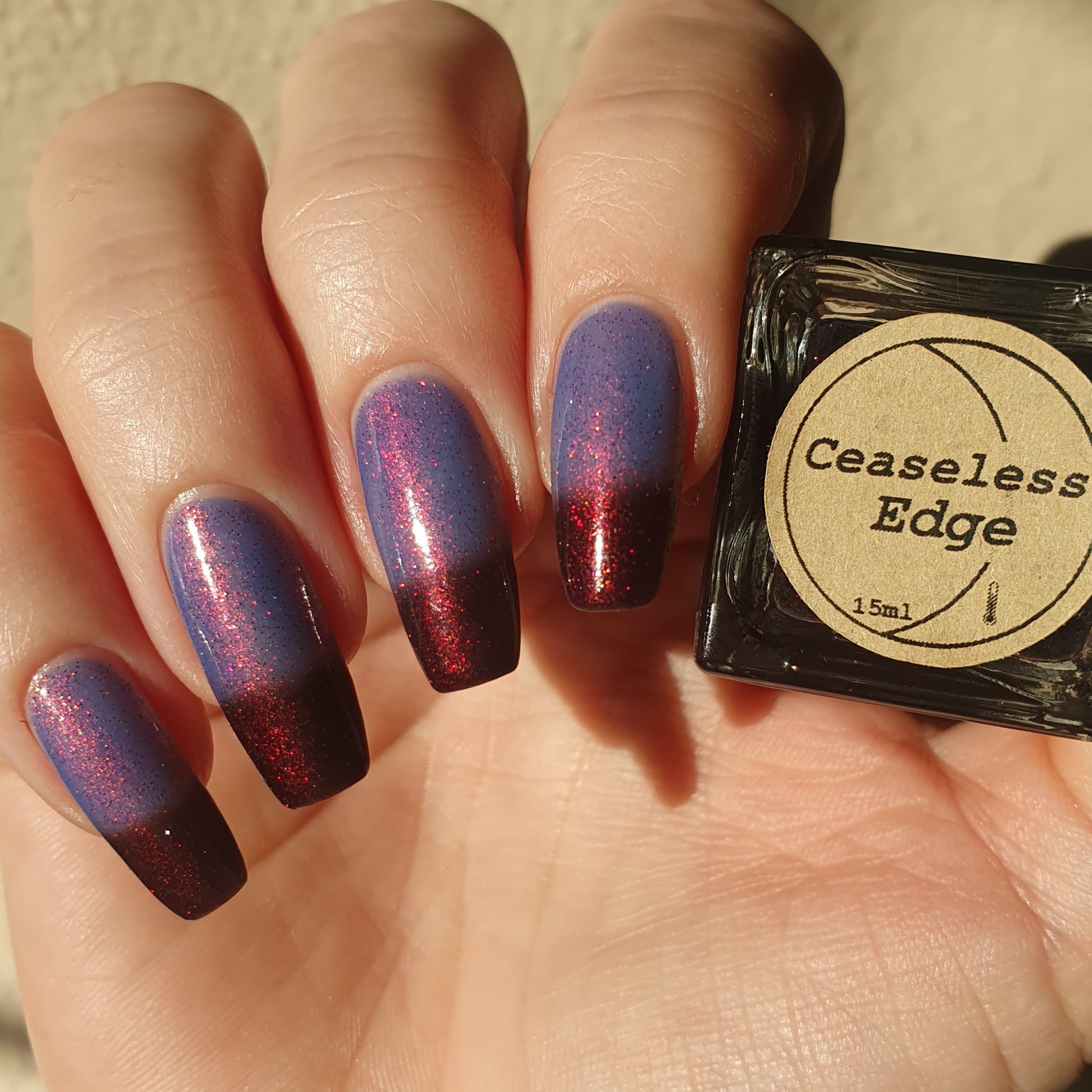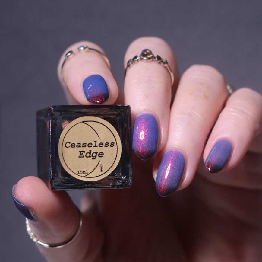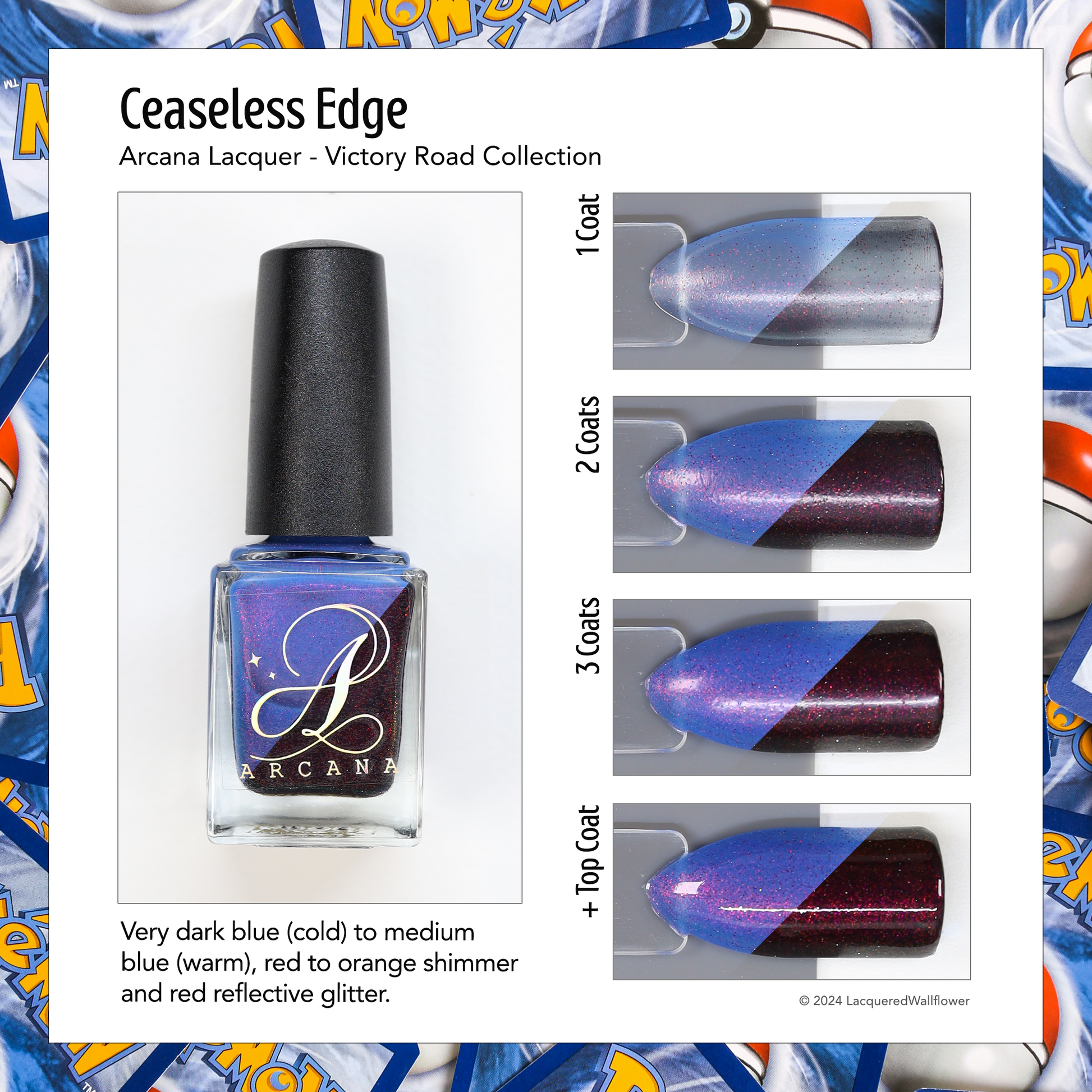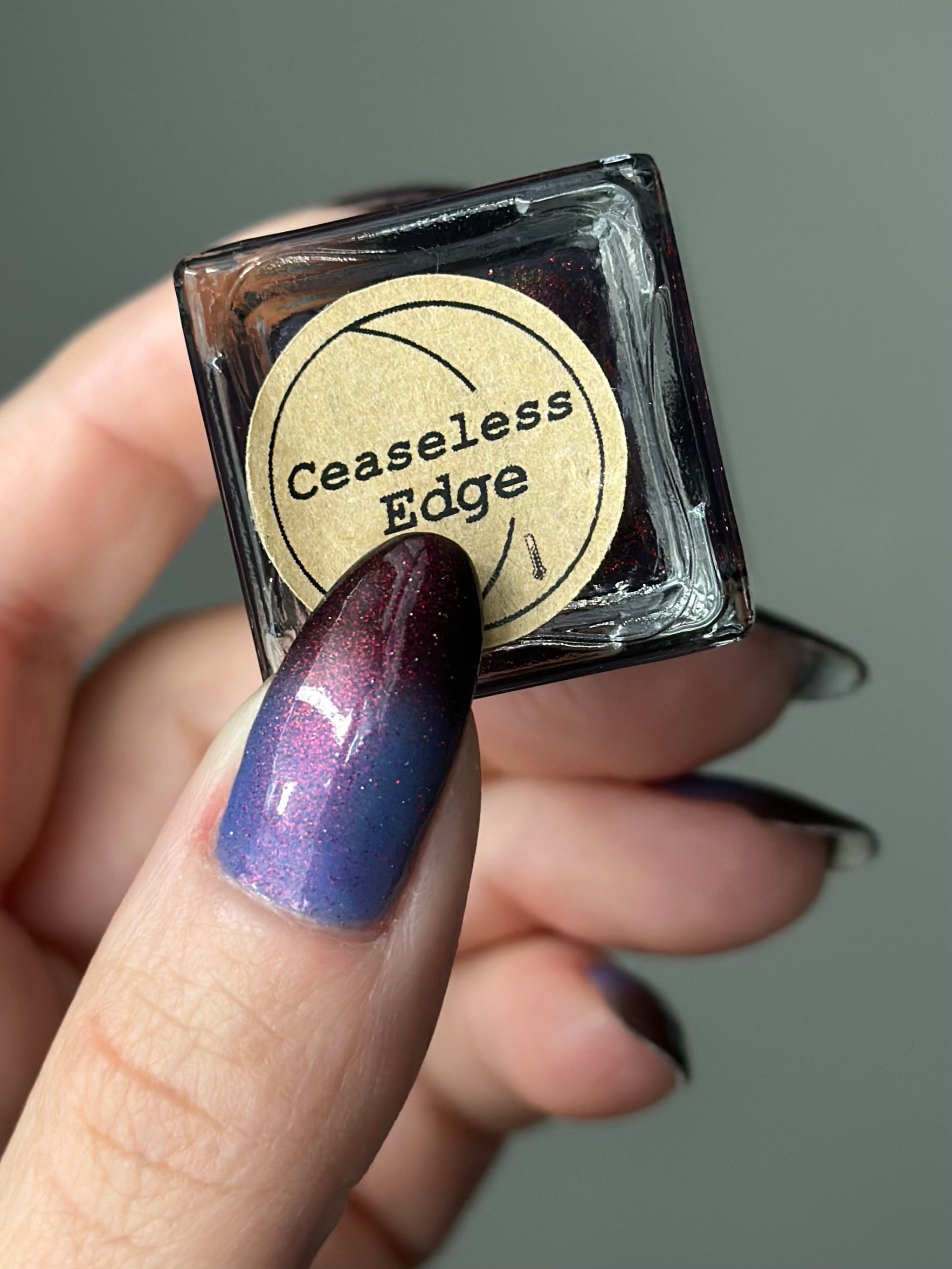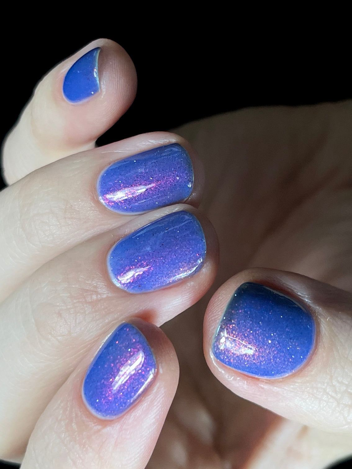Ceaseless Edge is a very dark blue (cold) to medium blue (warm) with red to orange shimmer and red reflective glitter inspired by the water/dark starter pokemon Hisuian Samurott!
