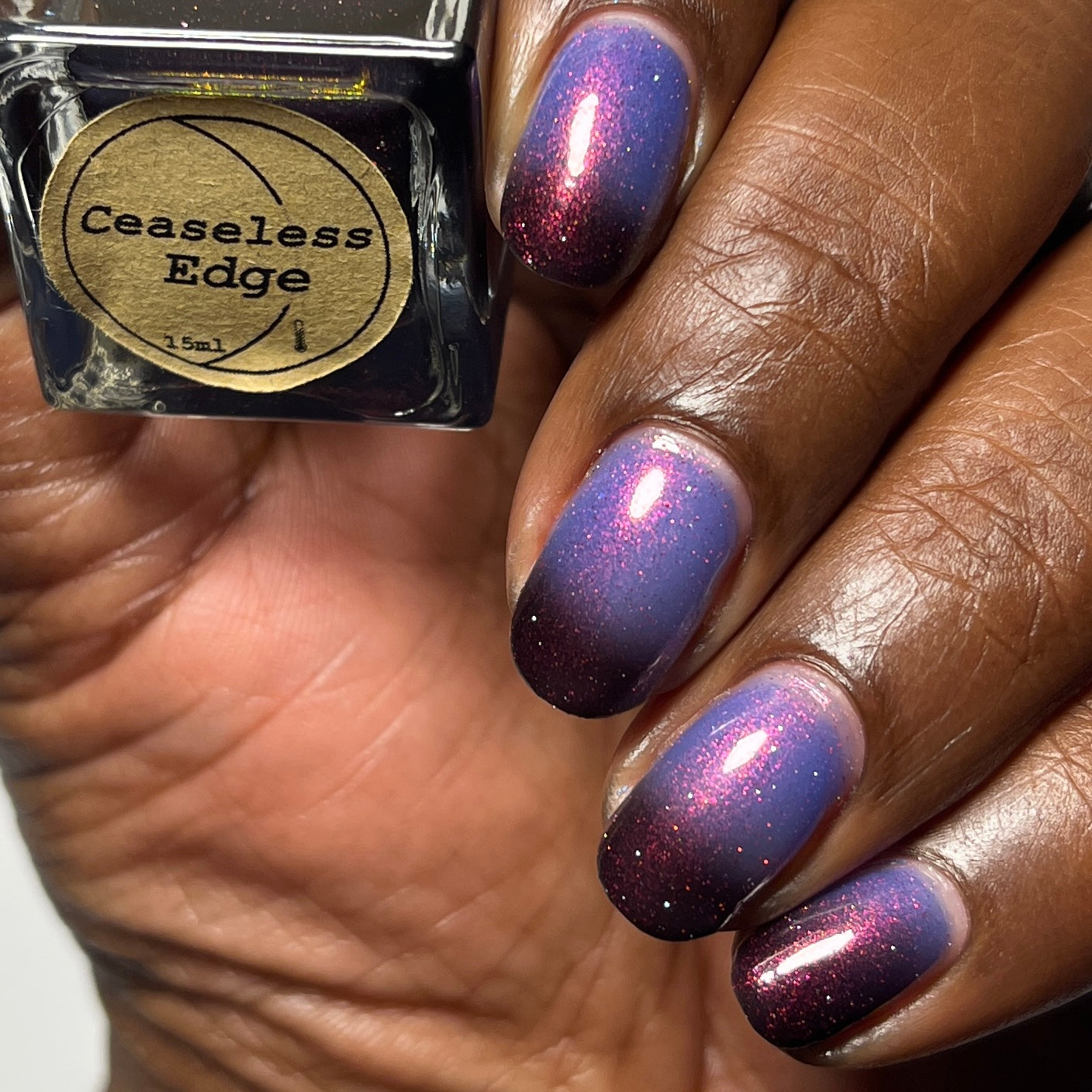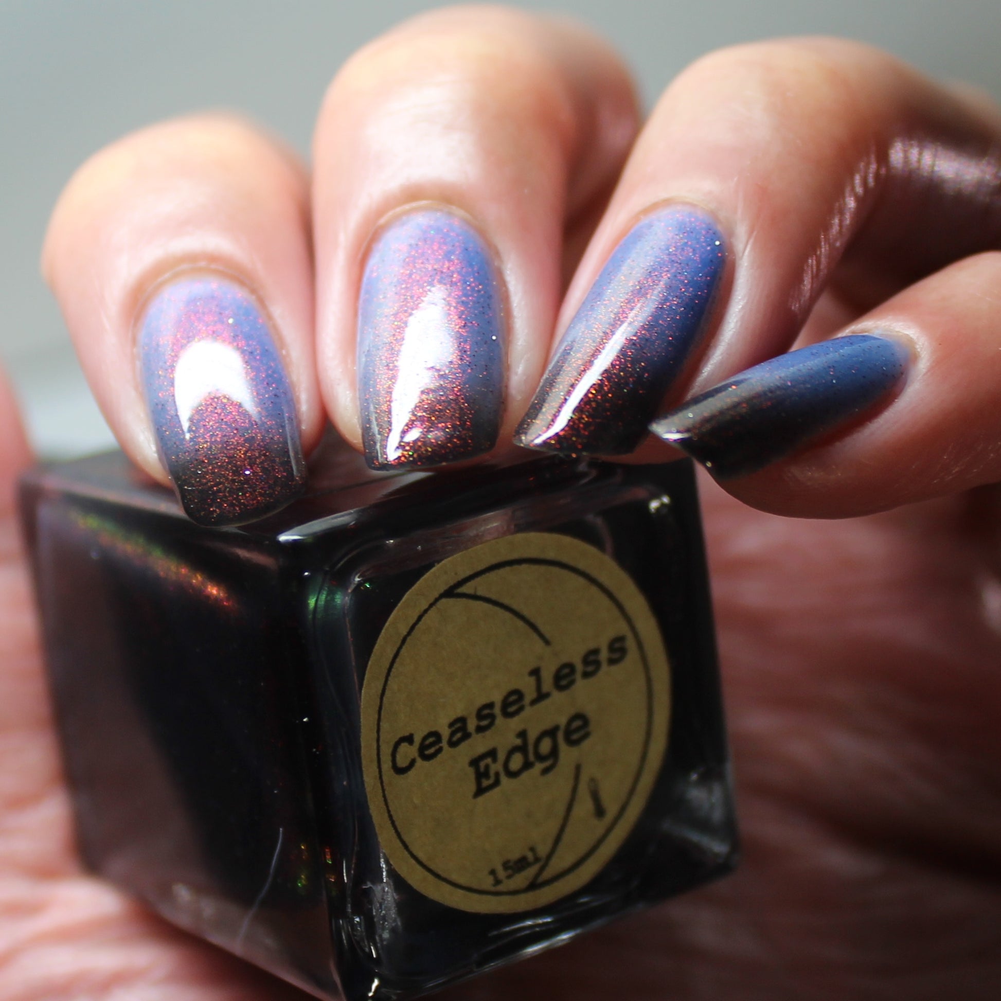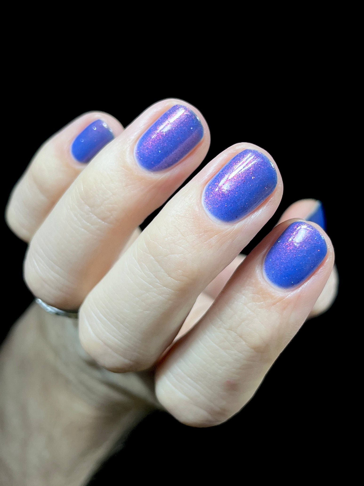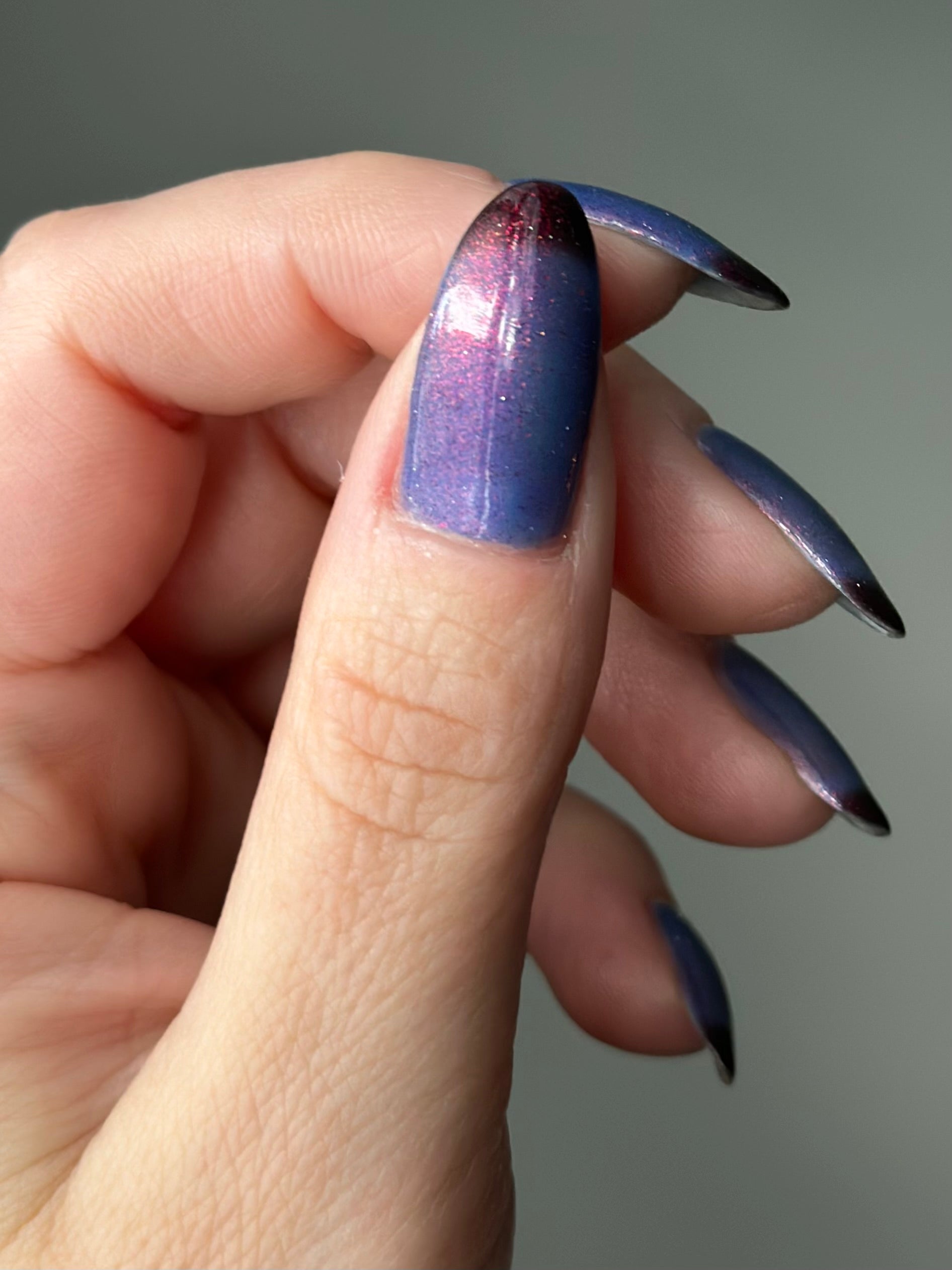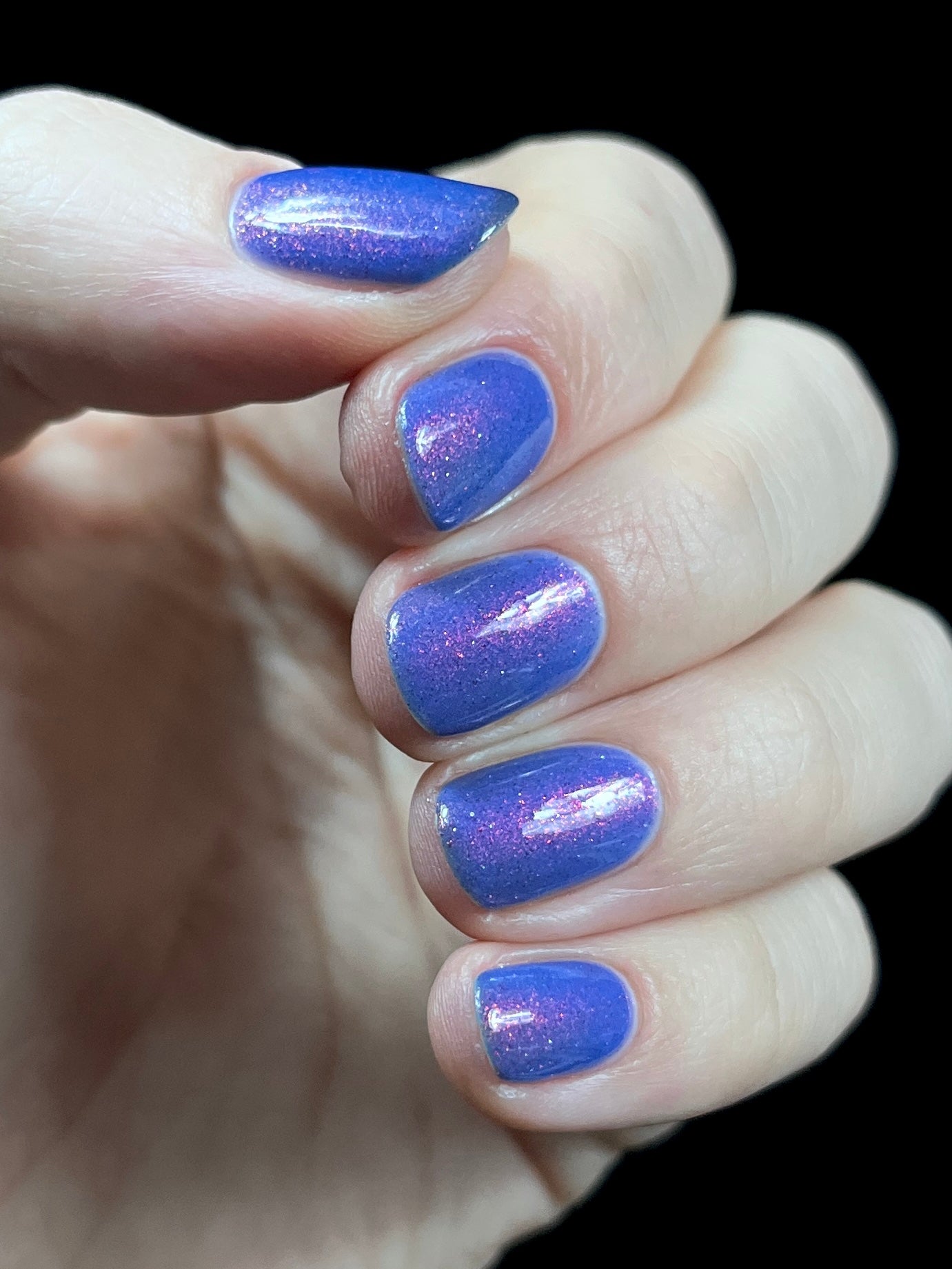 Ceaseless Edge is a very dark blue (cold) to medium blue (warm) with red to orange shimmer and red reflective glitter inspired by the water/dark starter pokemon Hisuian Samurott!