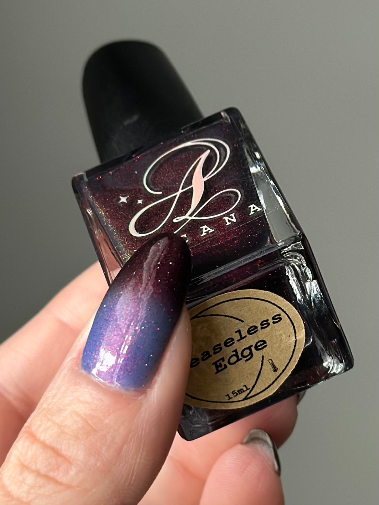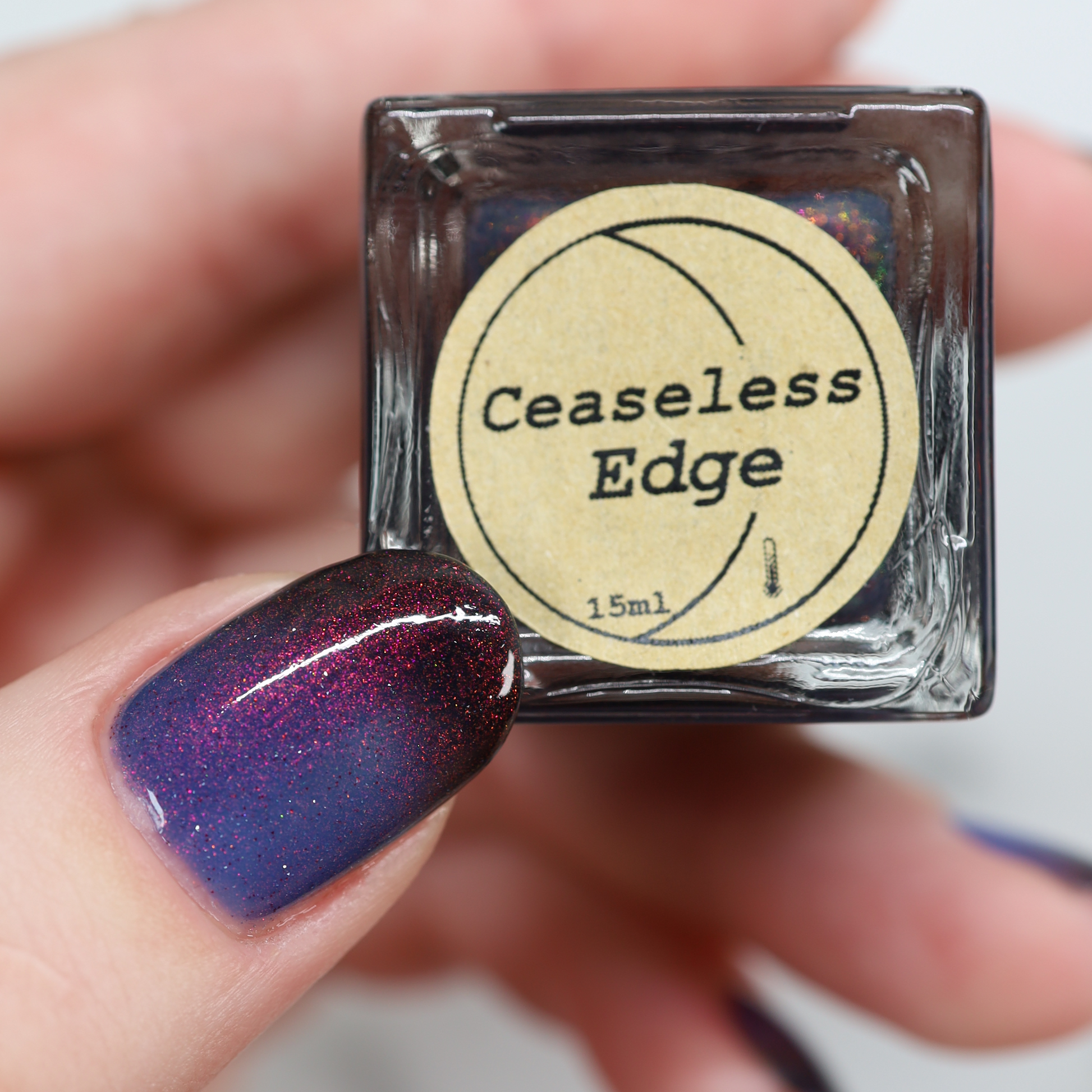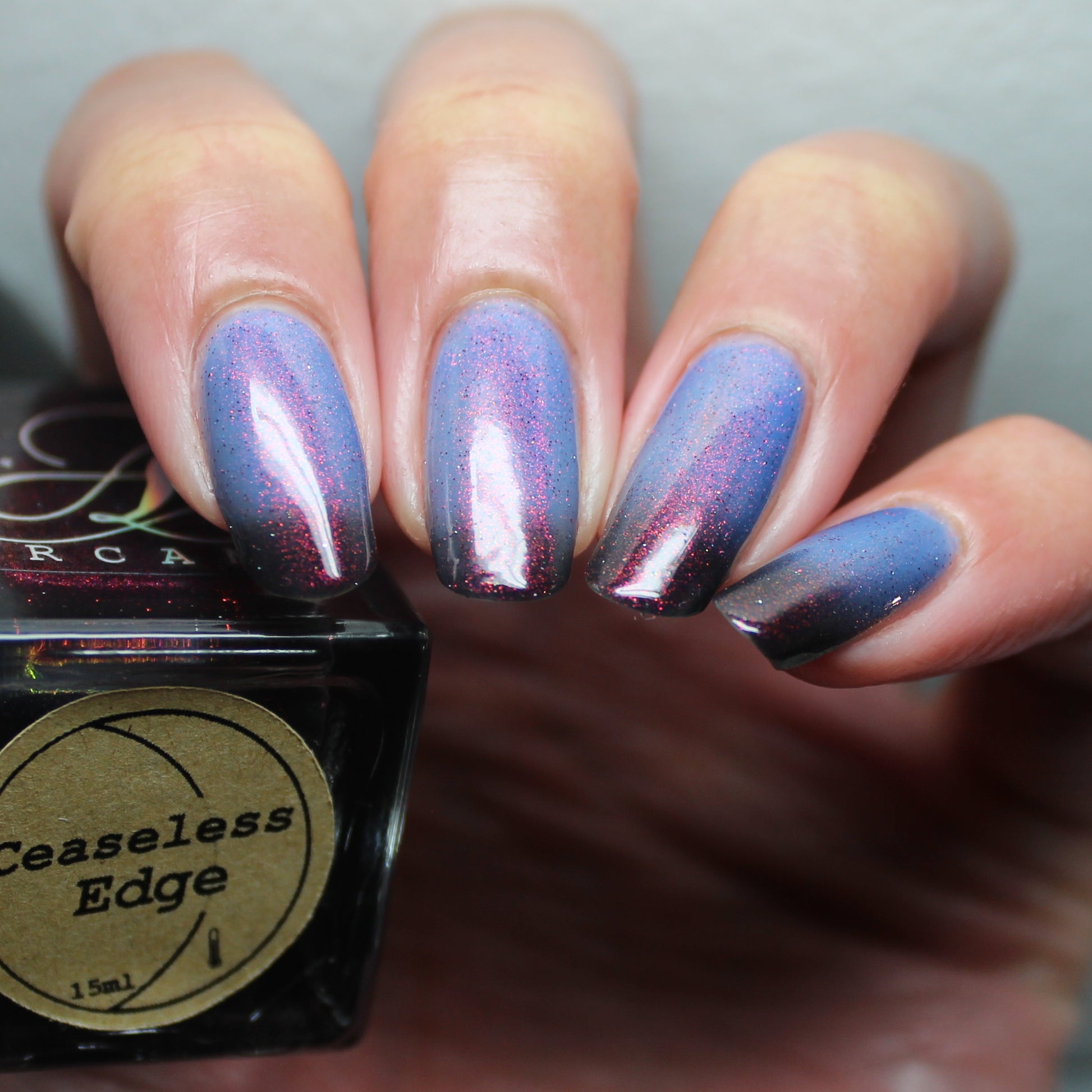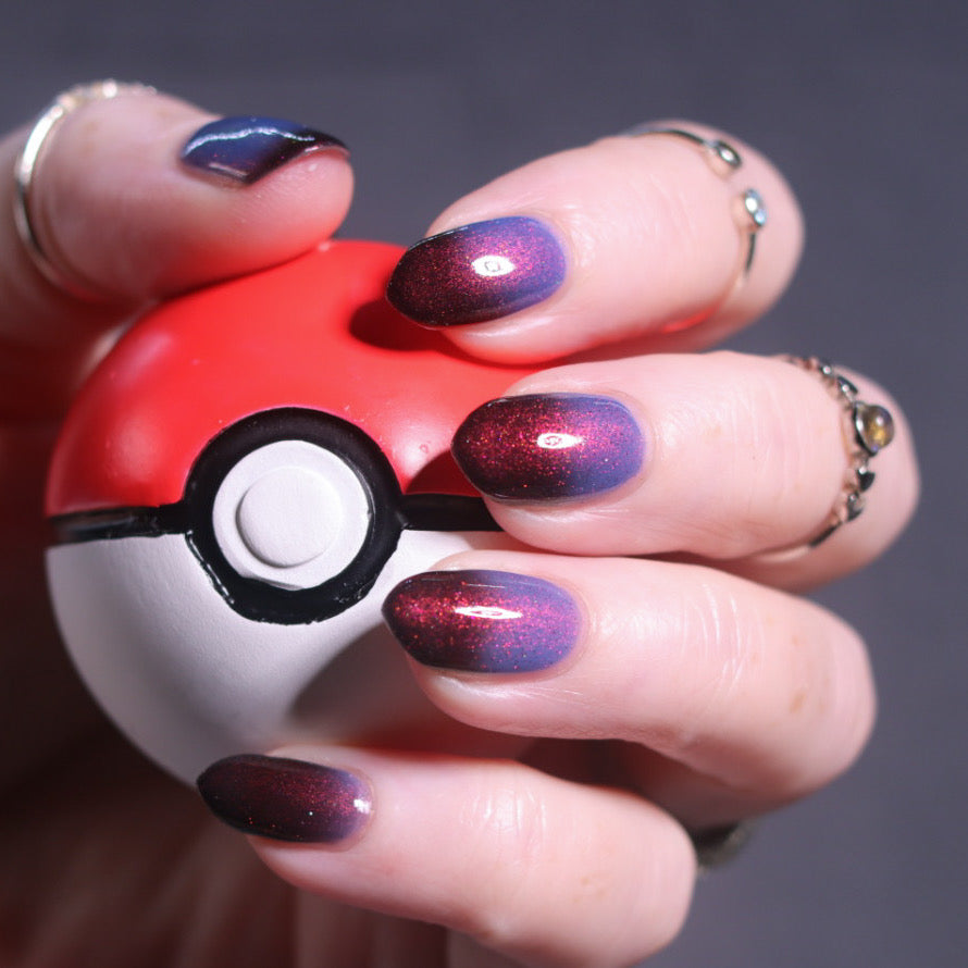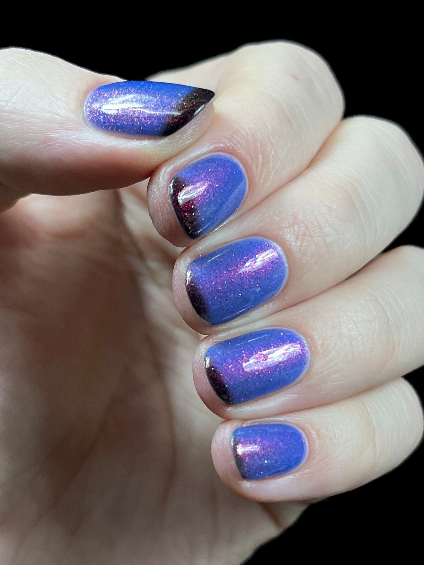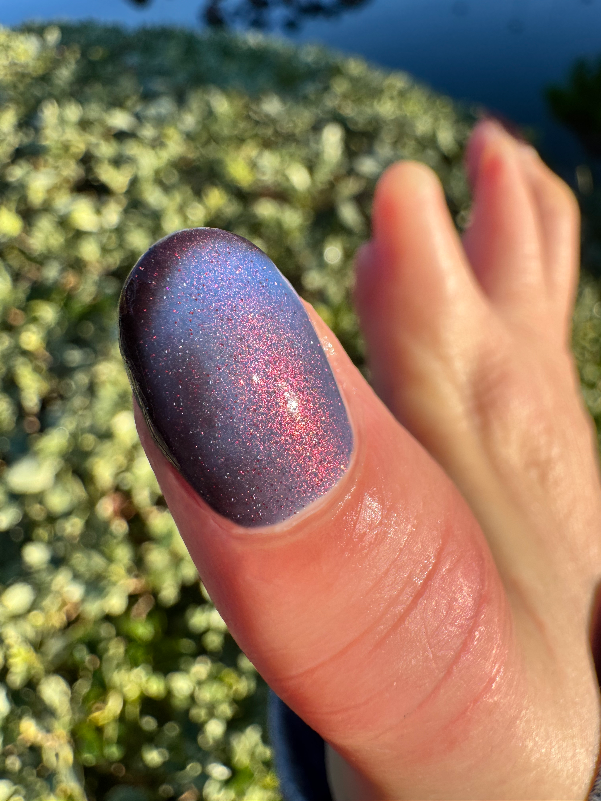 Ceaseless Edge is a very dark blue (cold) to medium blue (warm) with red to orange shimmer and red reflective glitter inspired by the water/dark starter pokemon Hisuian Samurott!