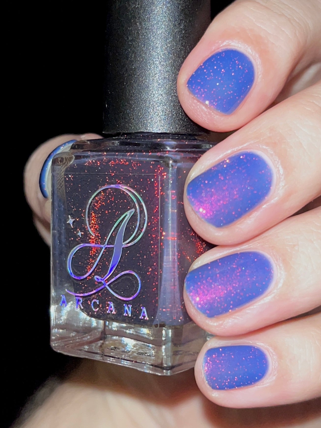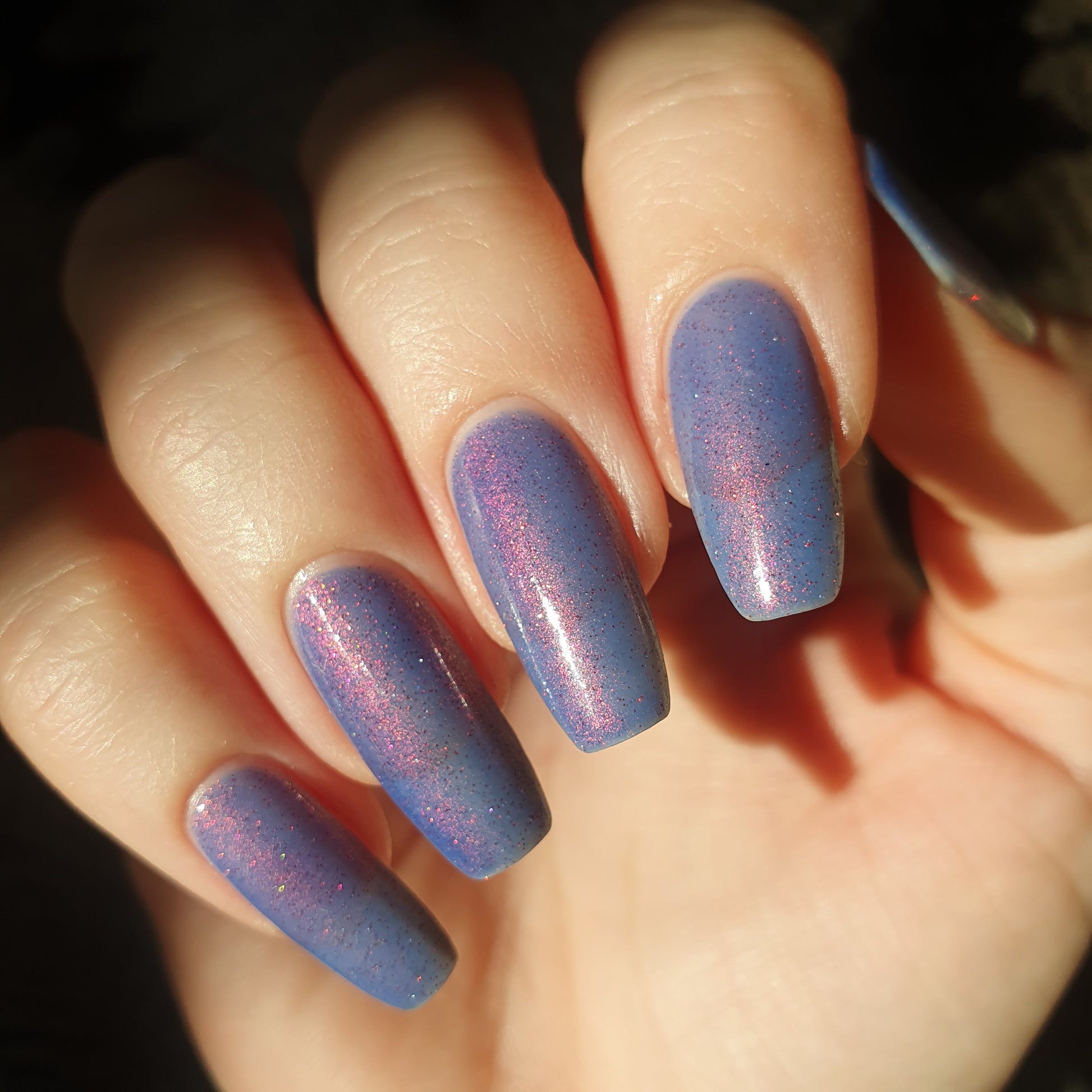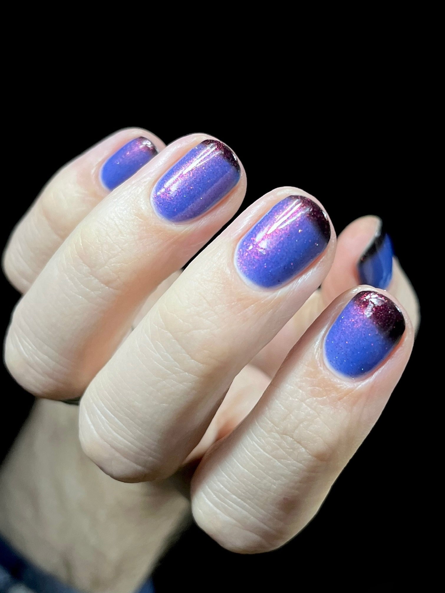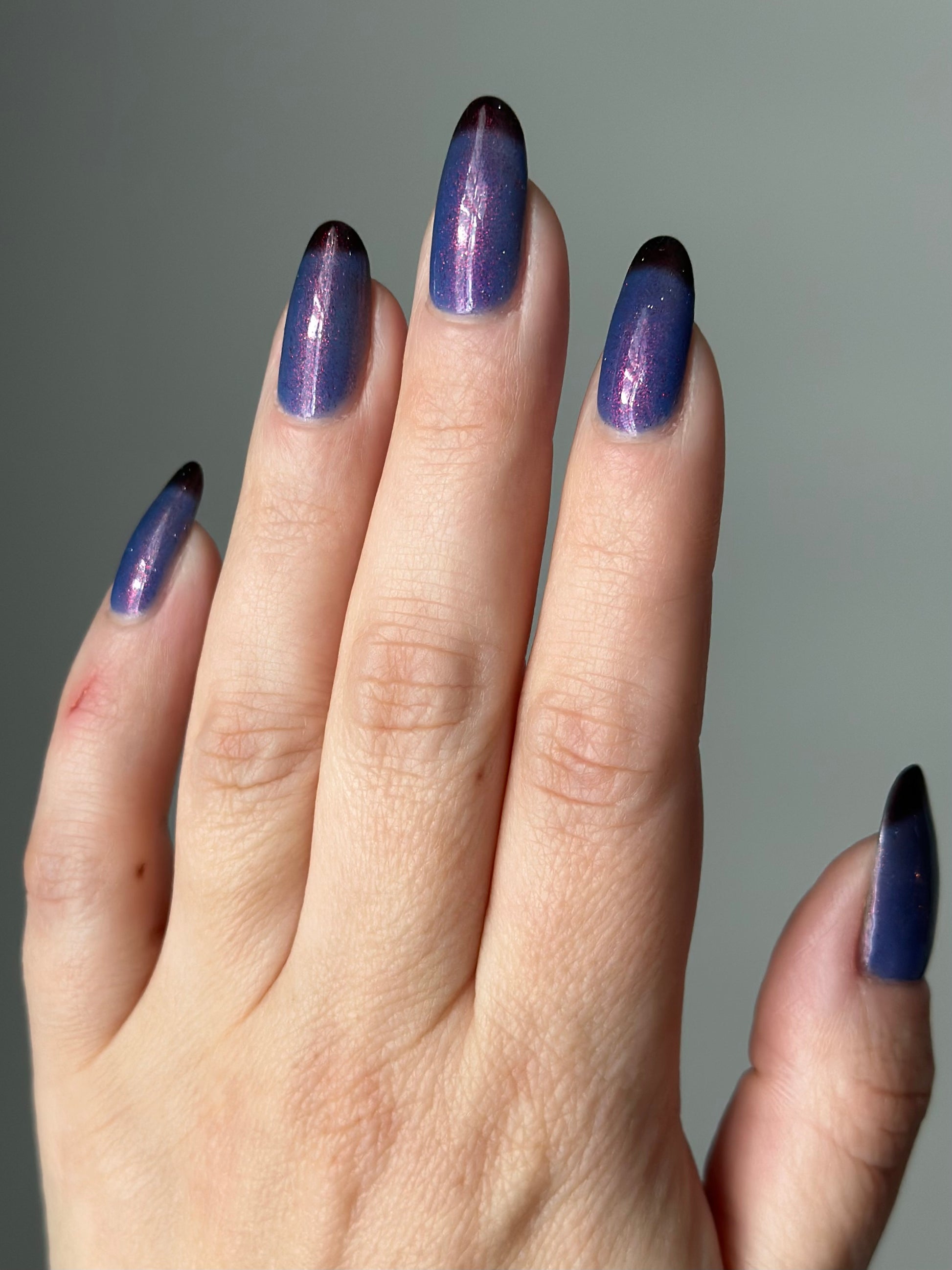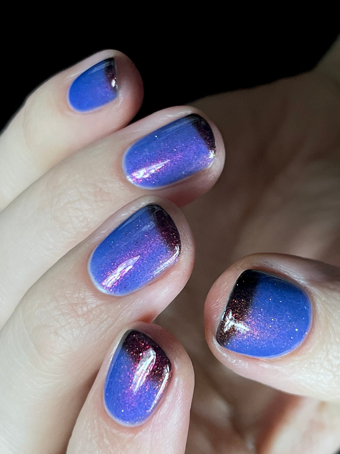 Ceaseless Edge is a very dark blue (cold) to medium blue (warm) with red to orange shimmer and red reflective glitter inspired by the water/dark starter pokemon Hisuian Samurott!