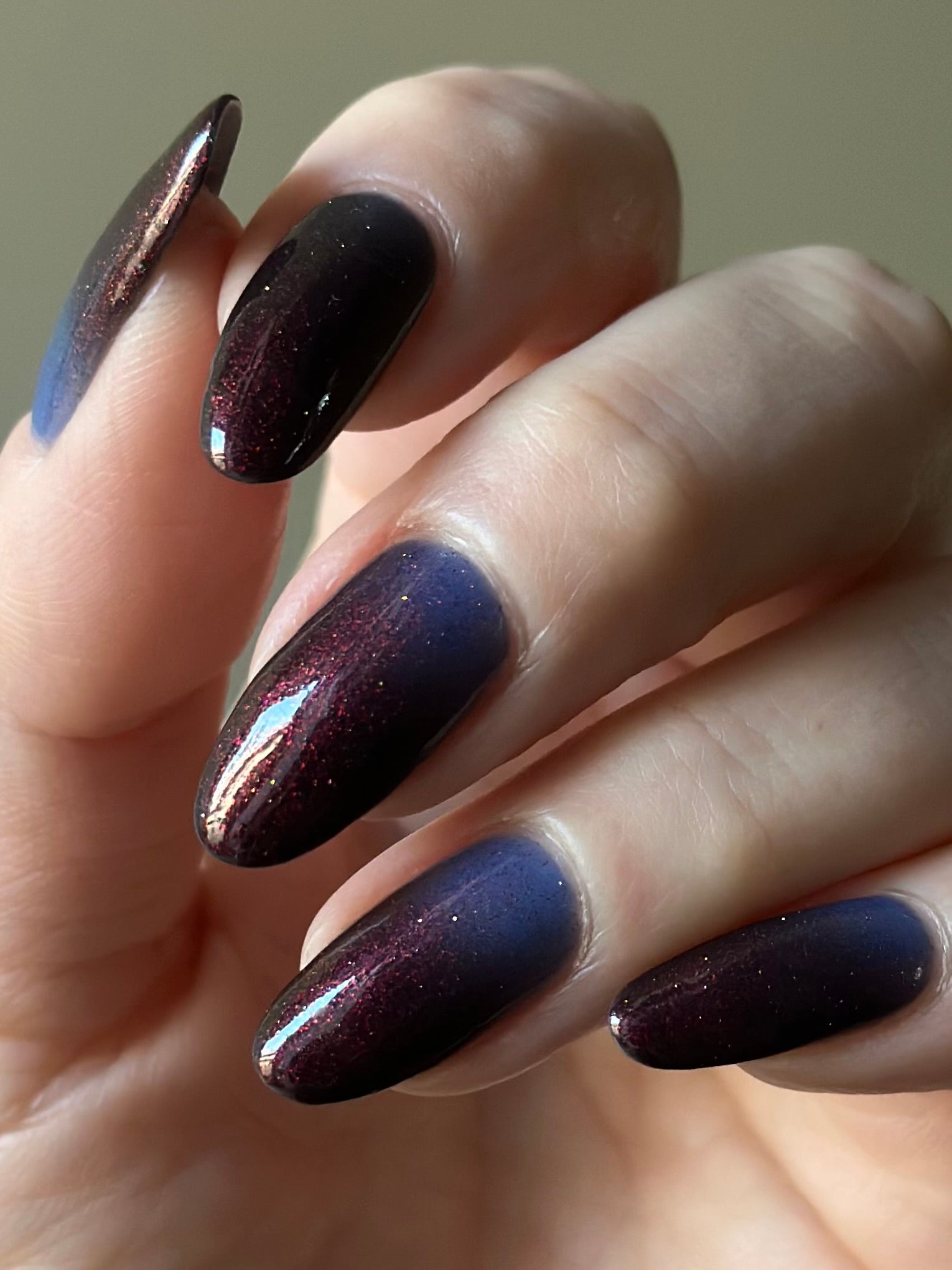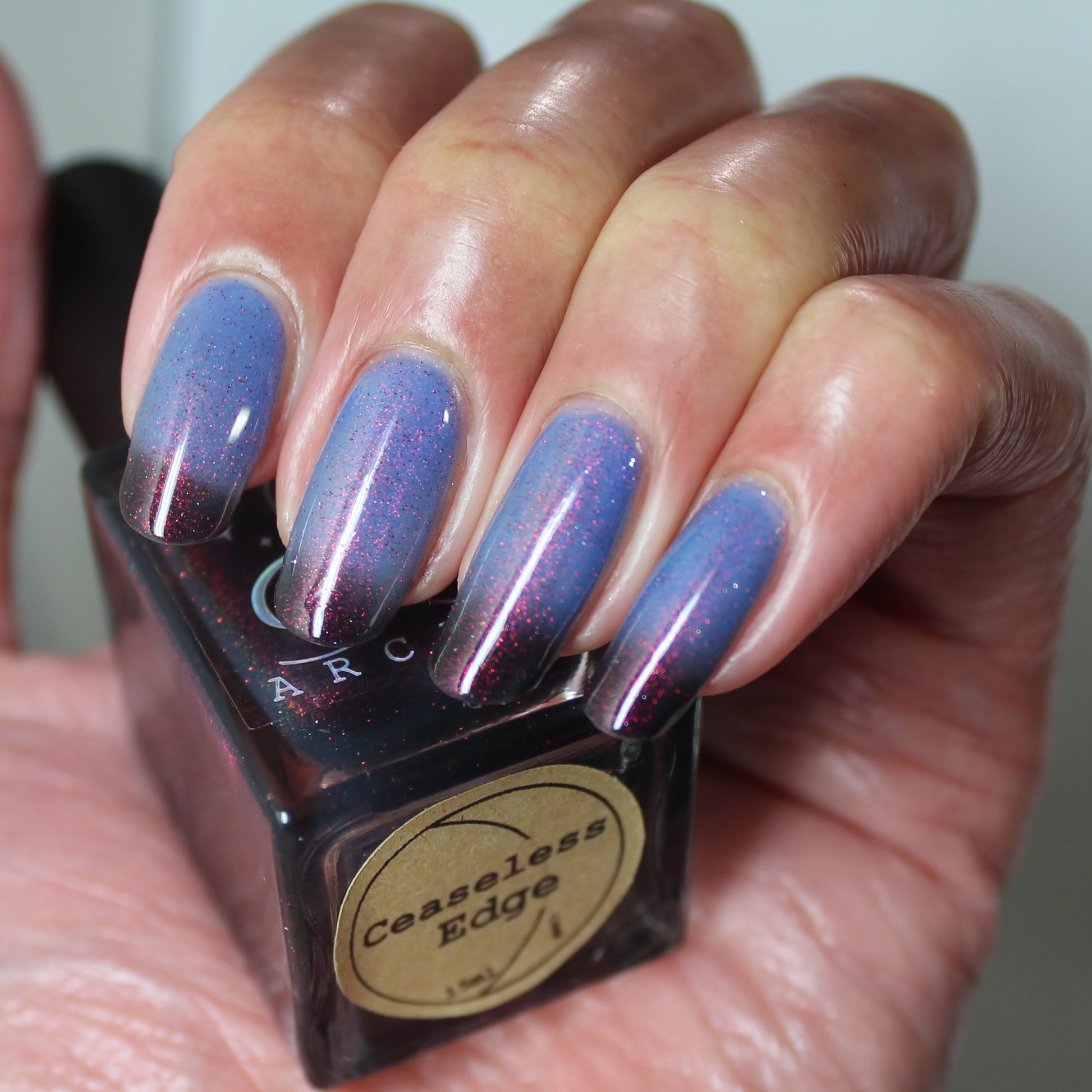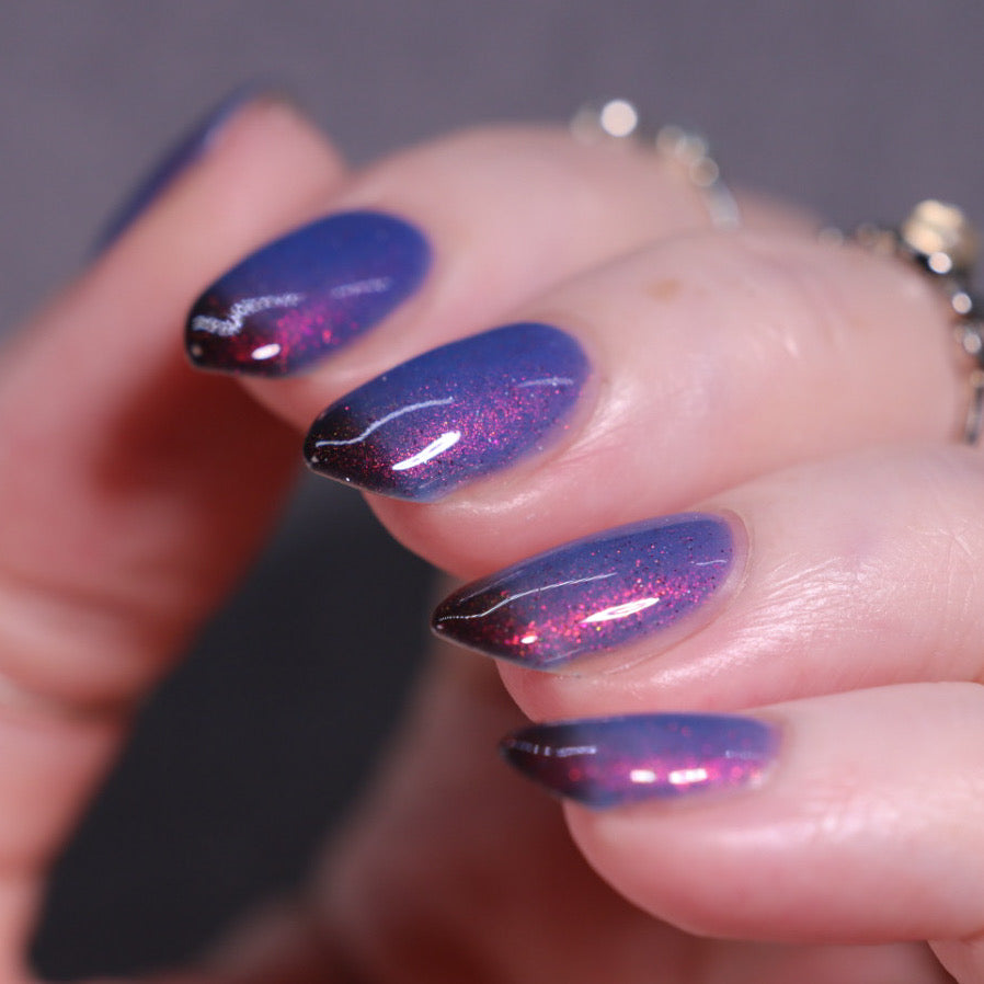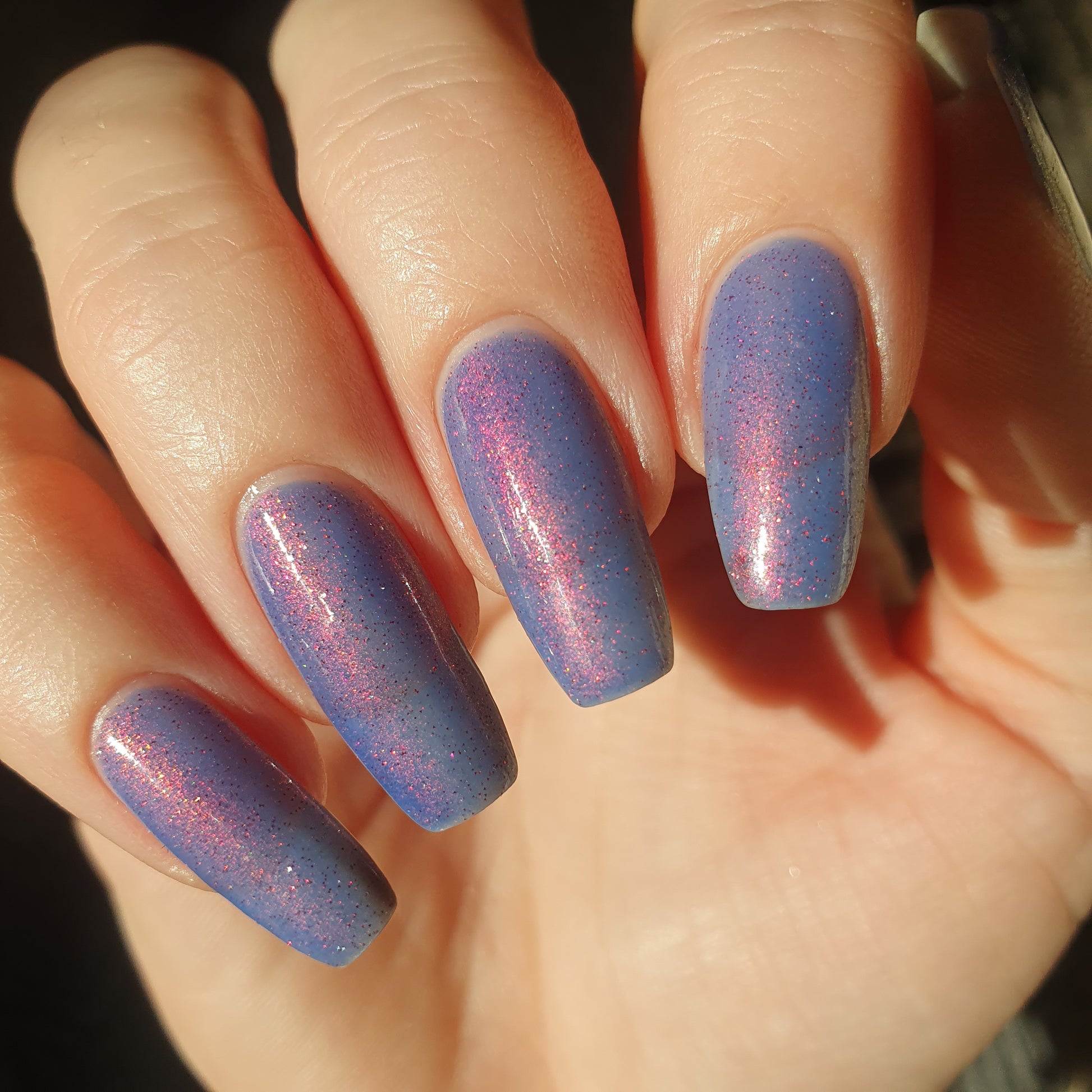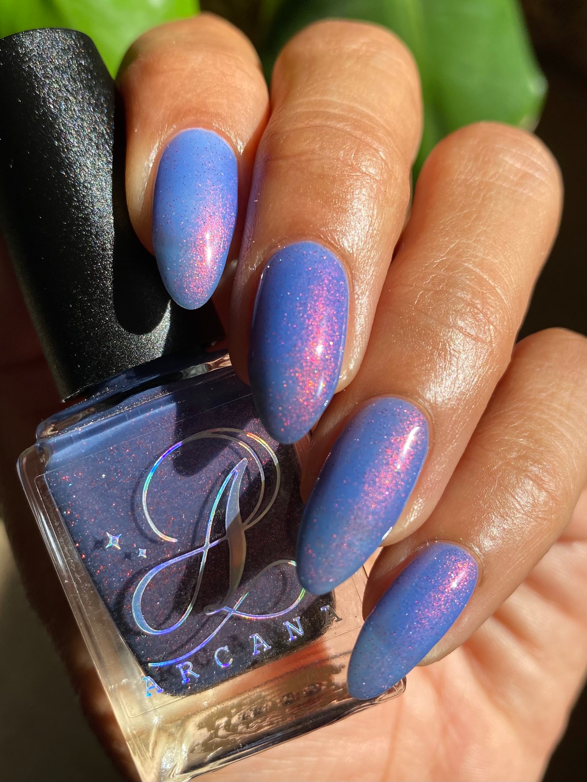 Ceaseless Edge is a very dark blue (cold) to medium blue (warm) with red to orange shimmer and red reflective glitter inspired by the water/dark starter pokemon Hisuian Samurott!