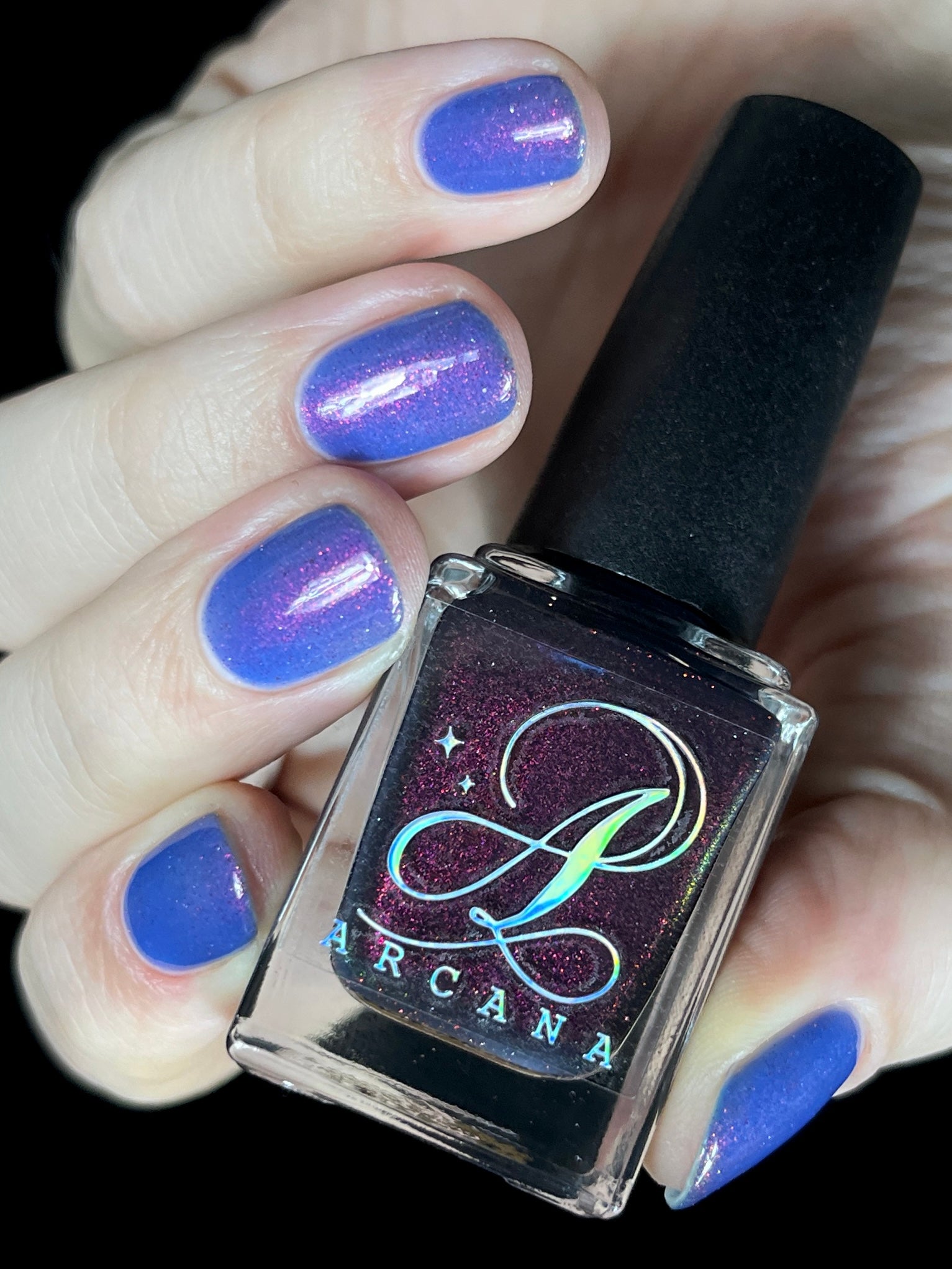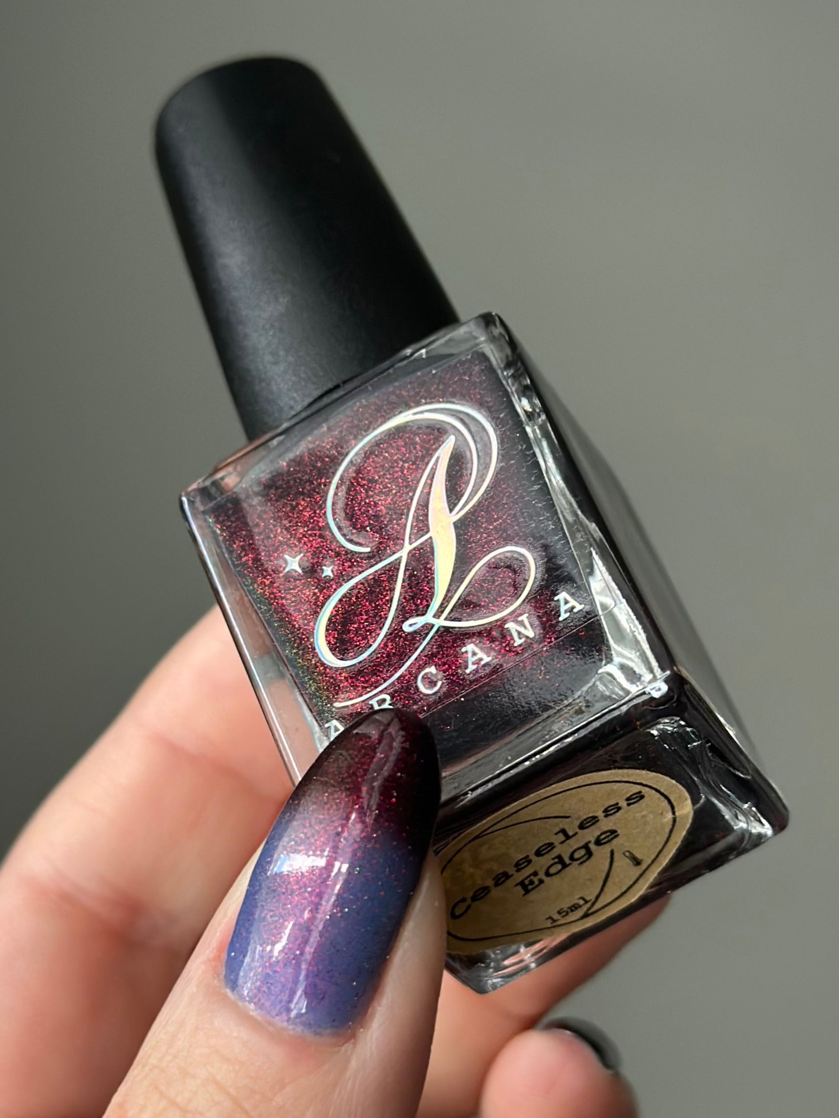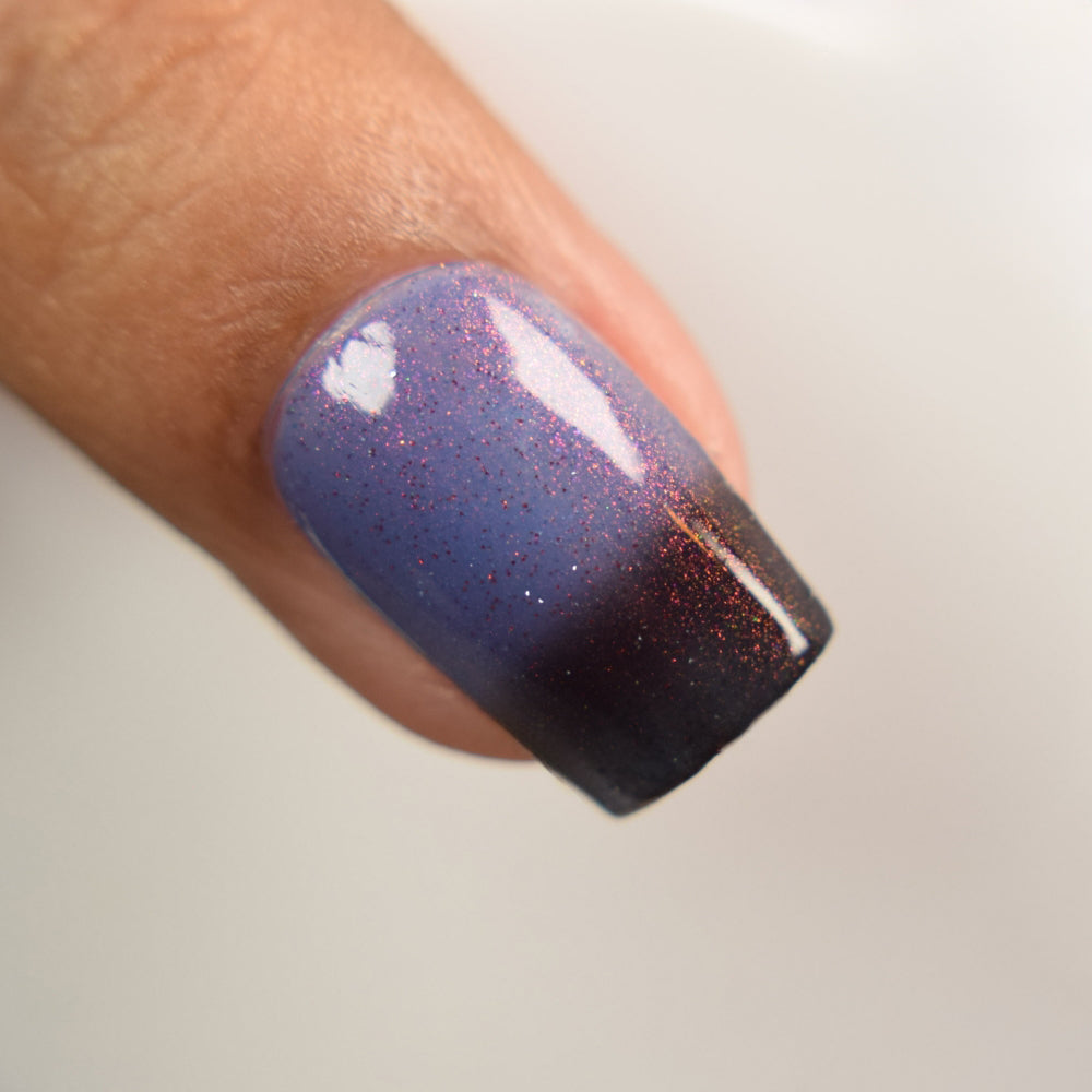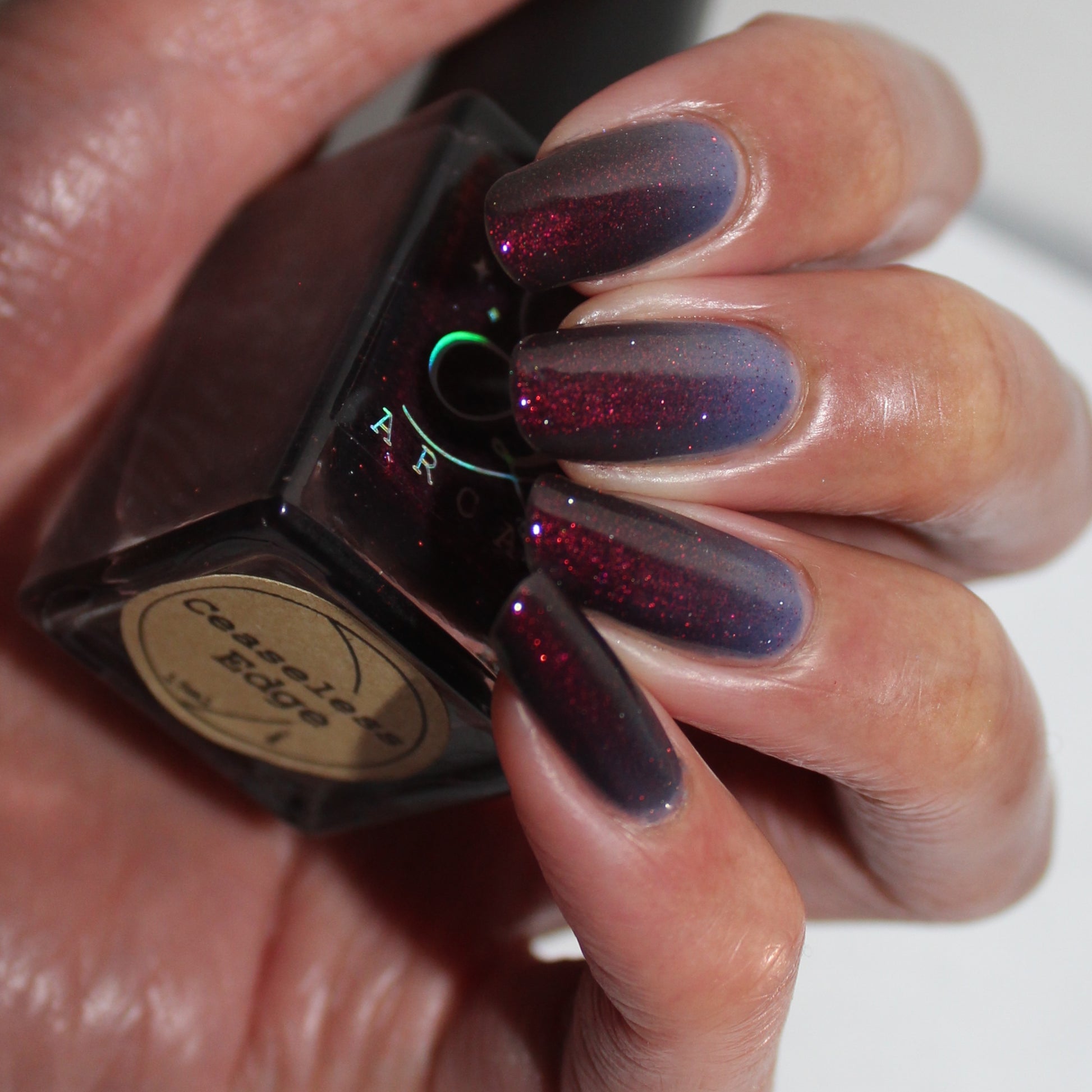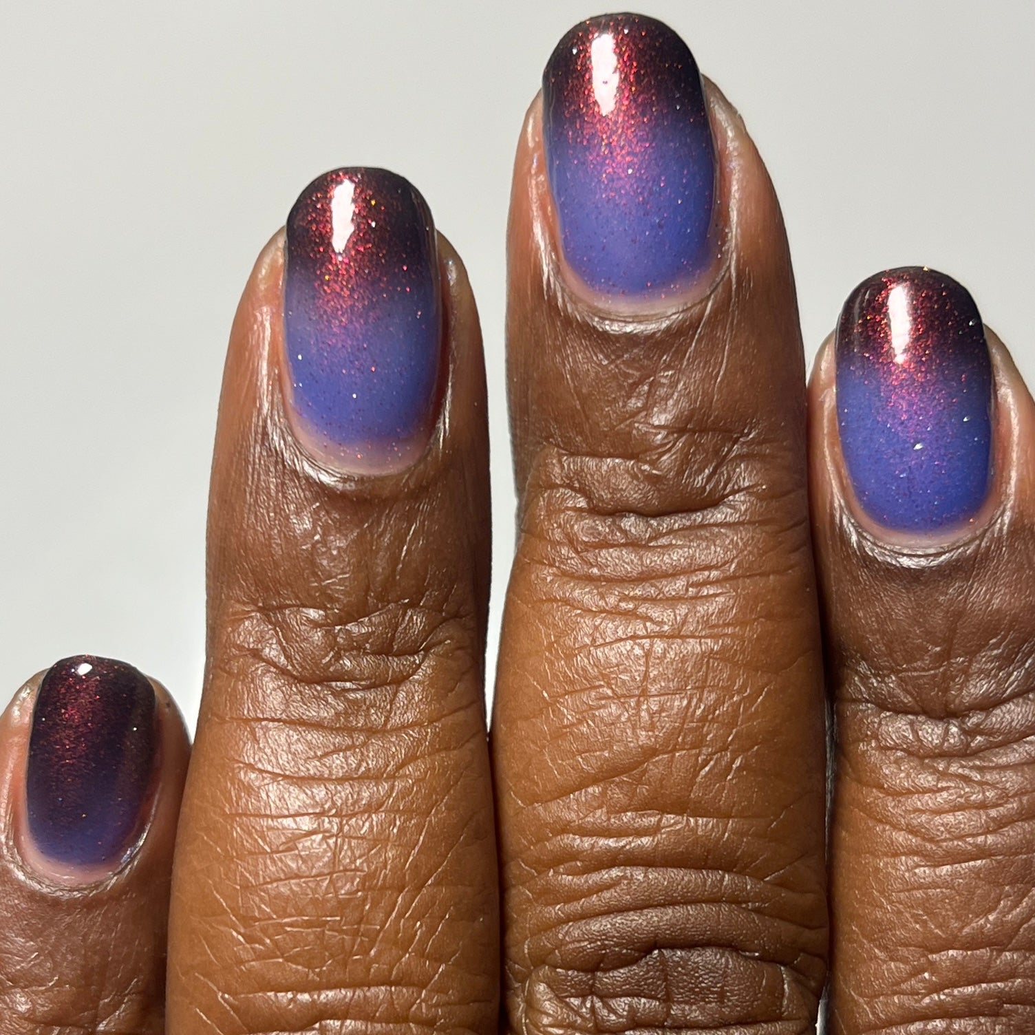 Ceaseless Edge is a very dark blue (cold) to medium blue (warm) with red to orange shimmer and red reflective glitter inspired by the water/dark starter pokemon Hisuian Samurott!