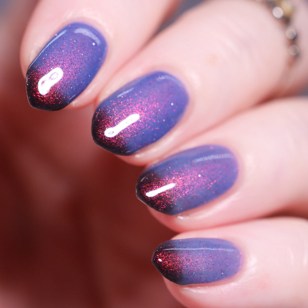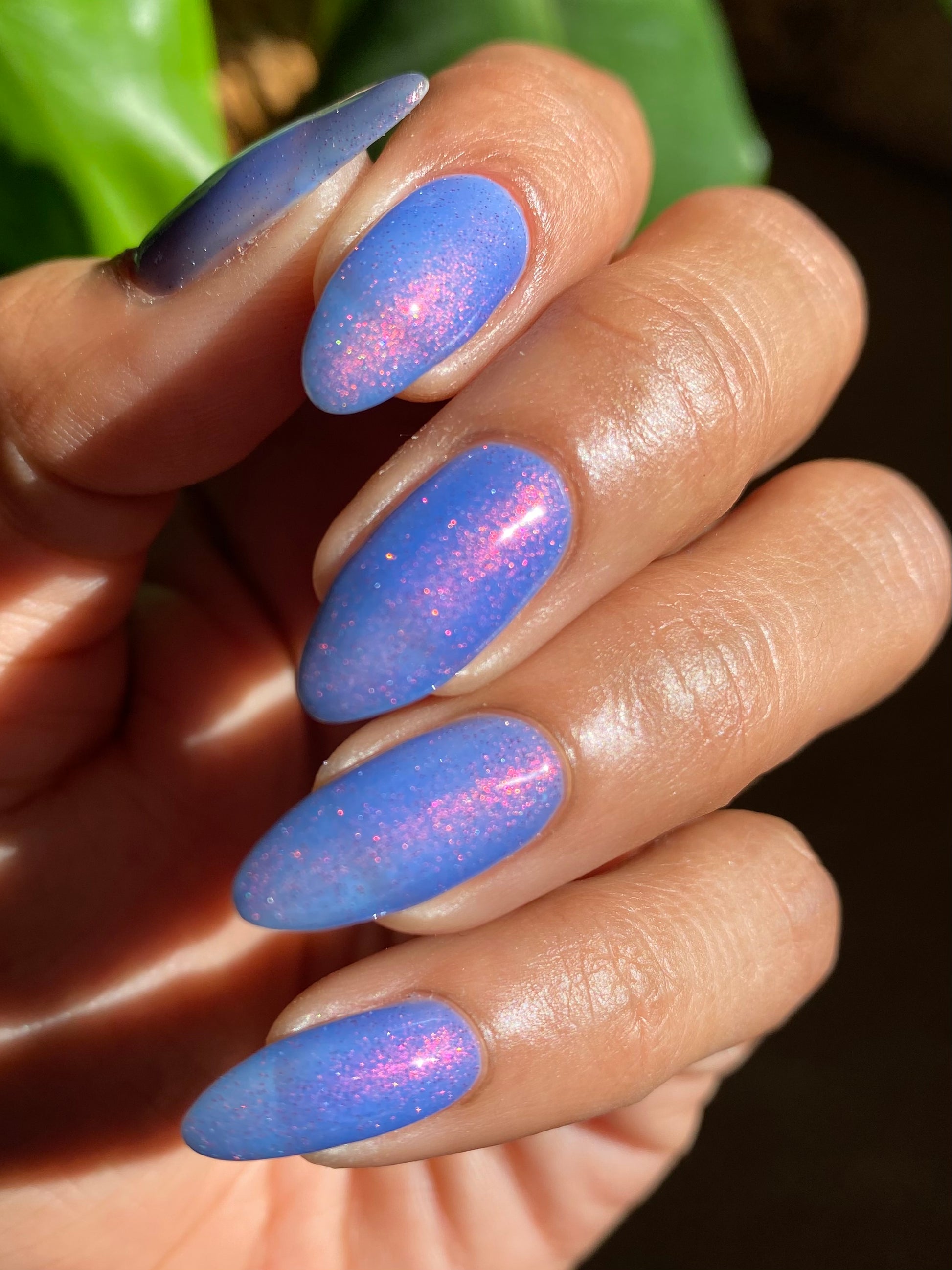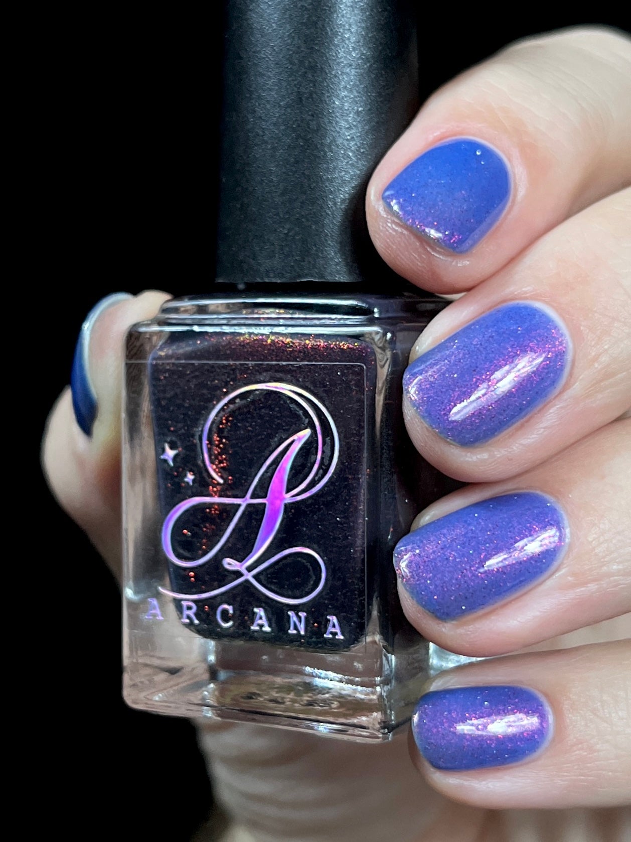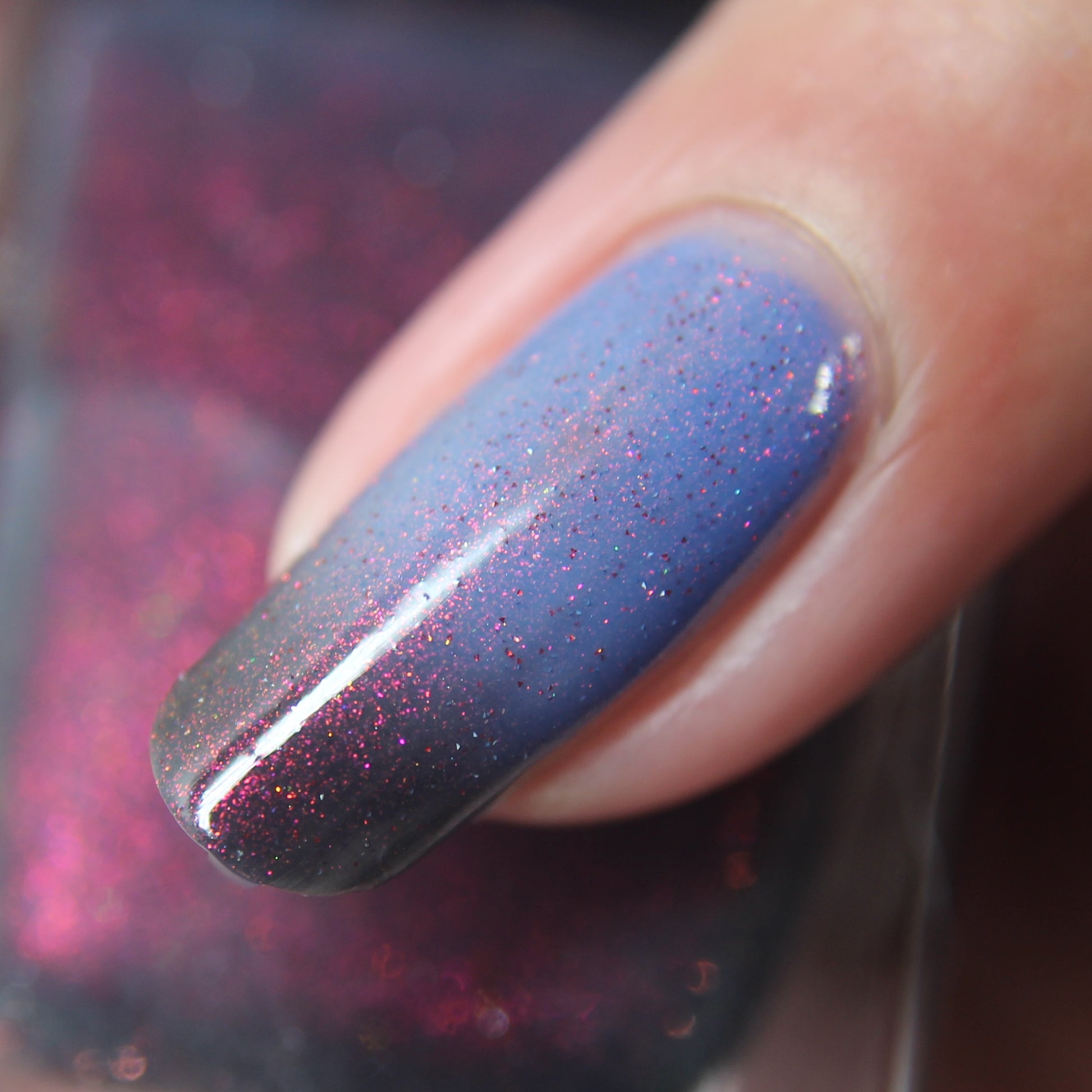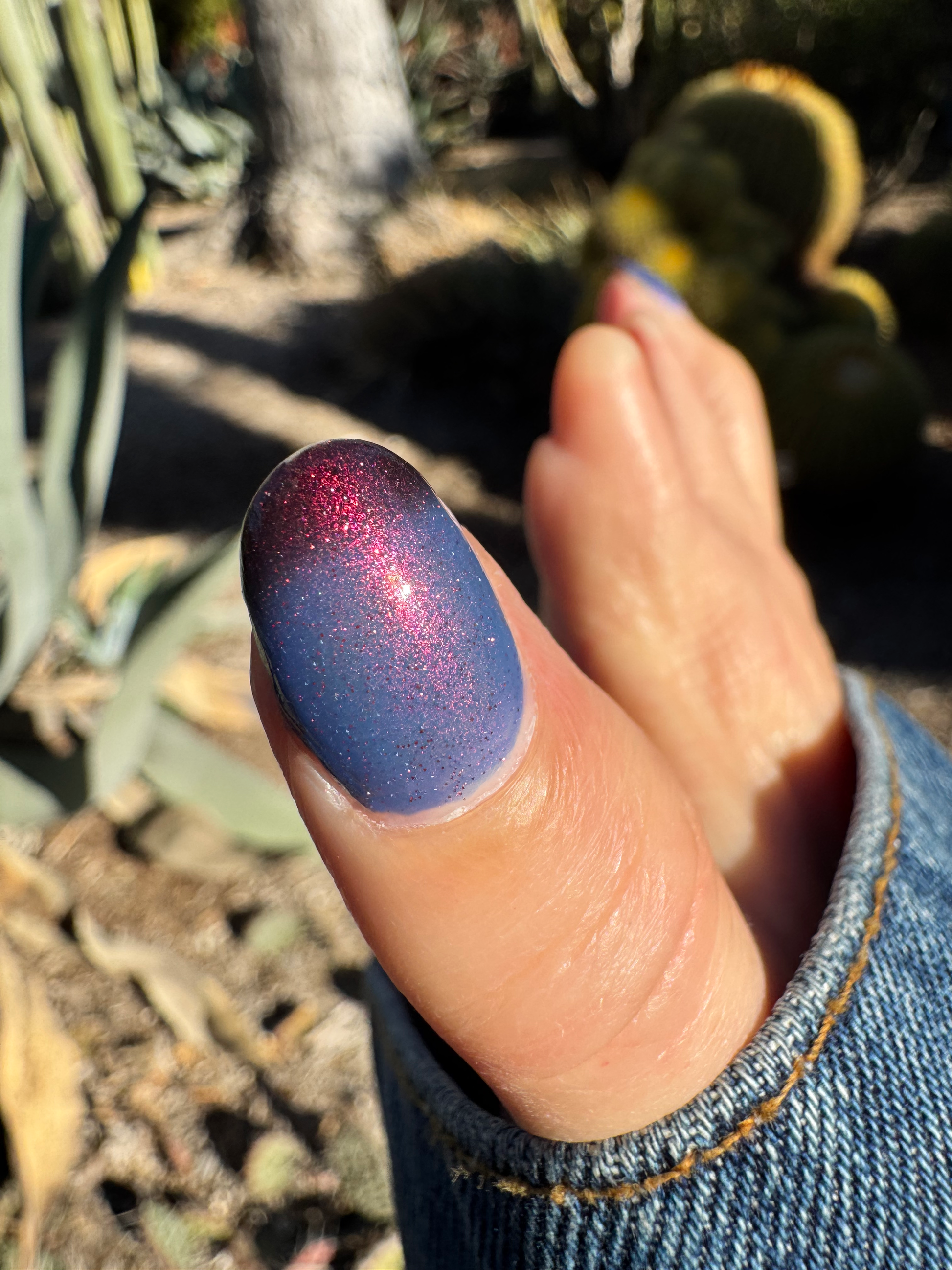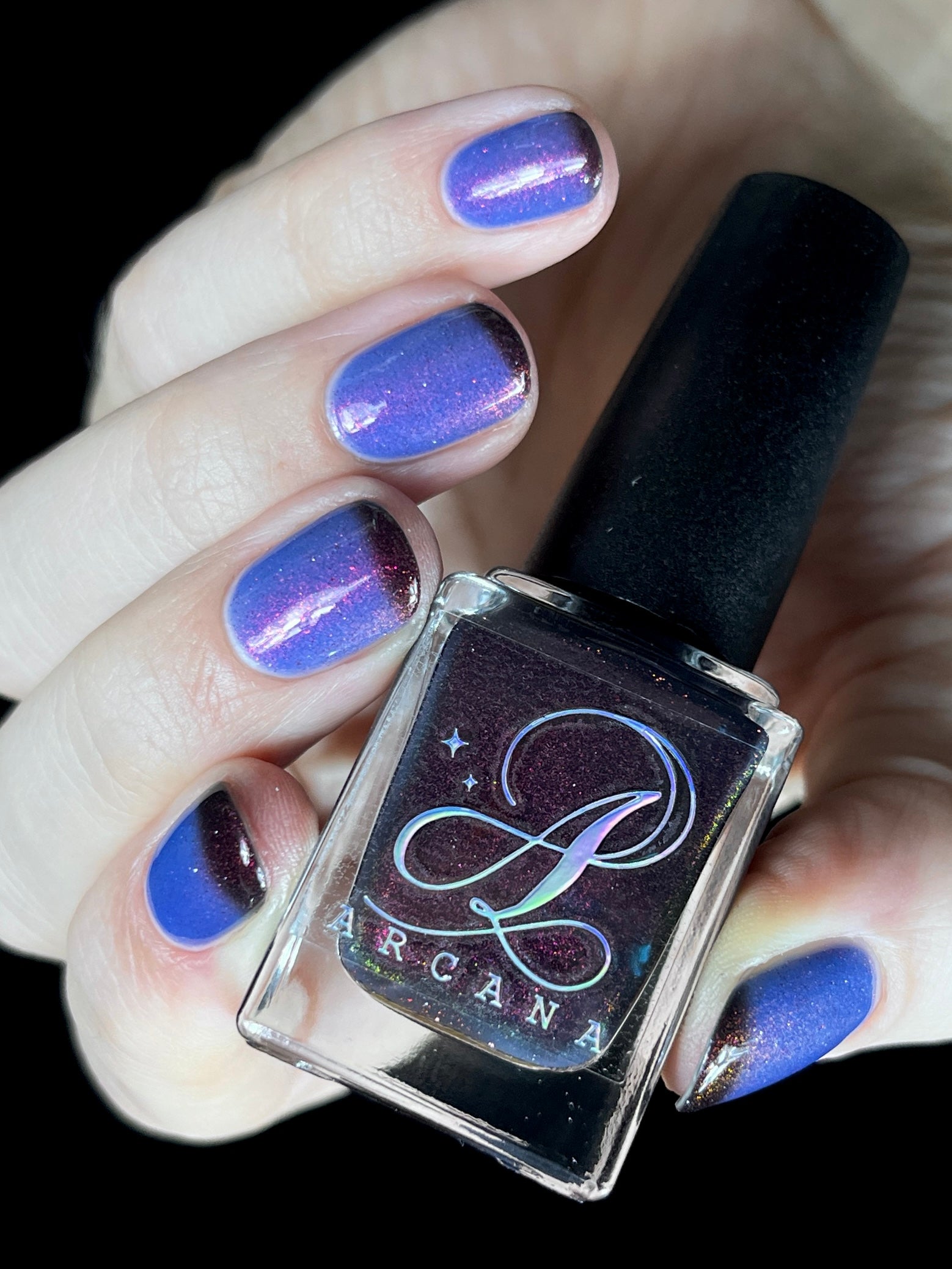 Ceaseless Edge is a very dark blue (cold) to medium blue (warm) with red to orange shimmer and red reflective glitter inspired by the water/dark starter pokemon Hisuian Samurott!