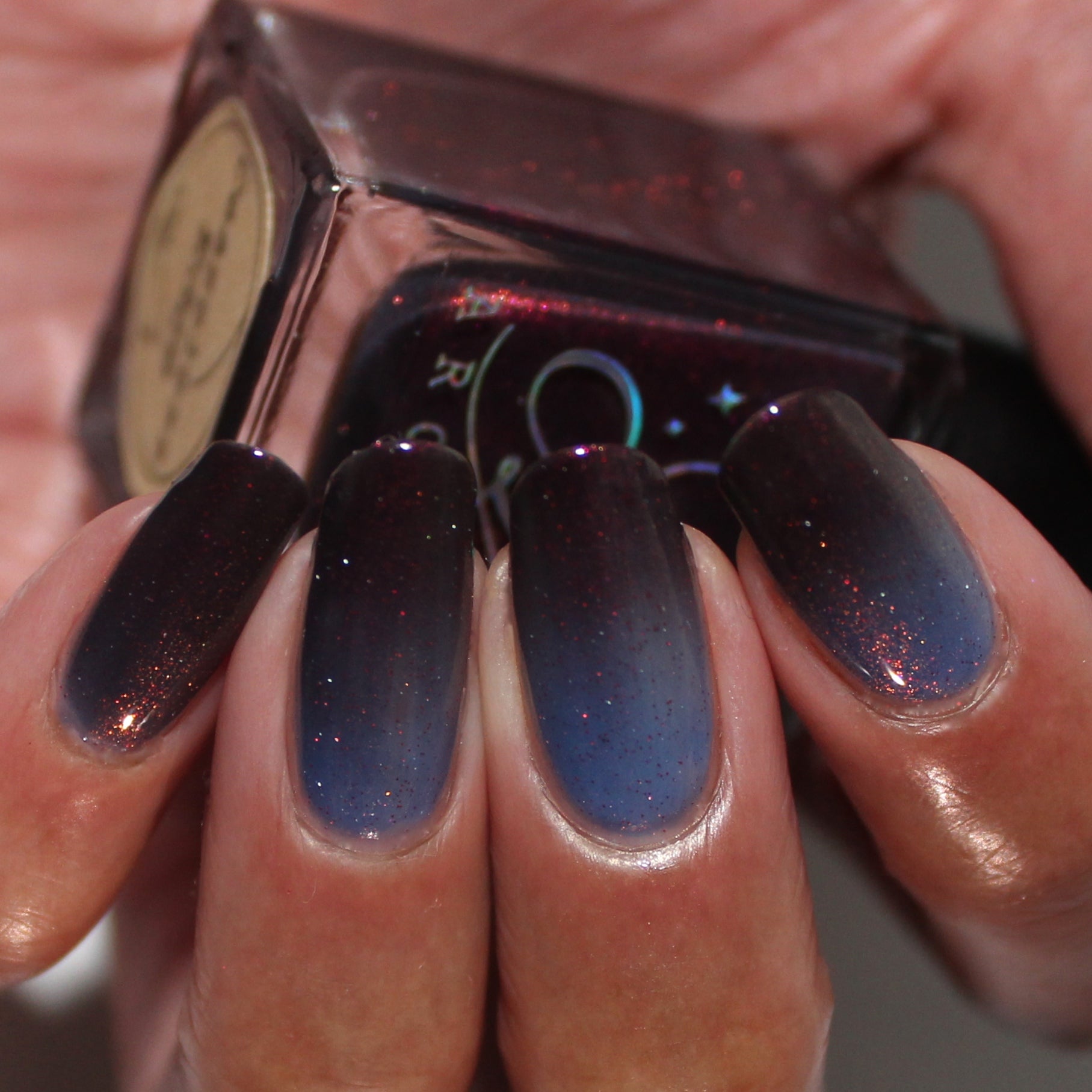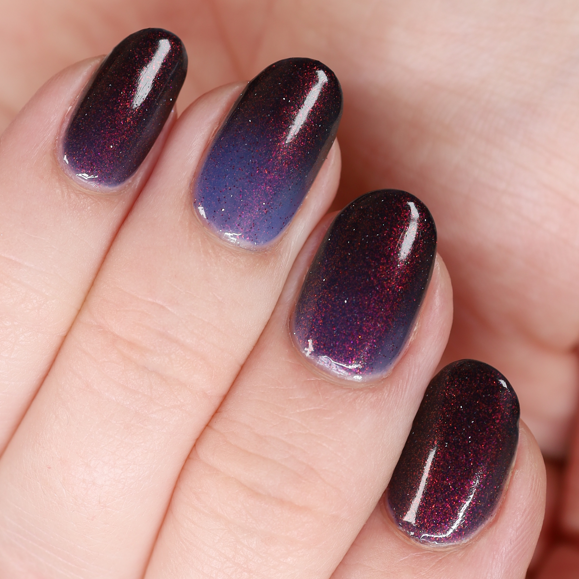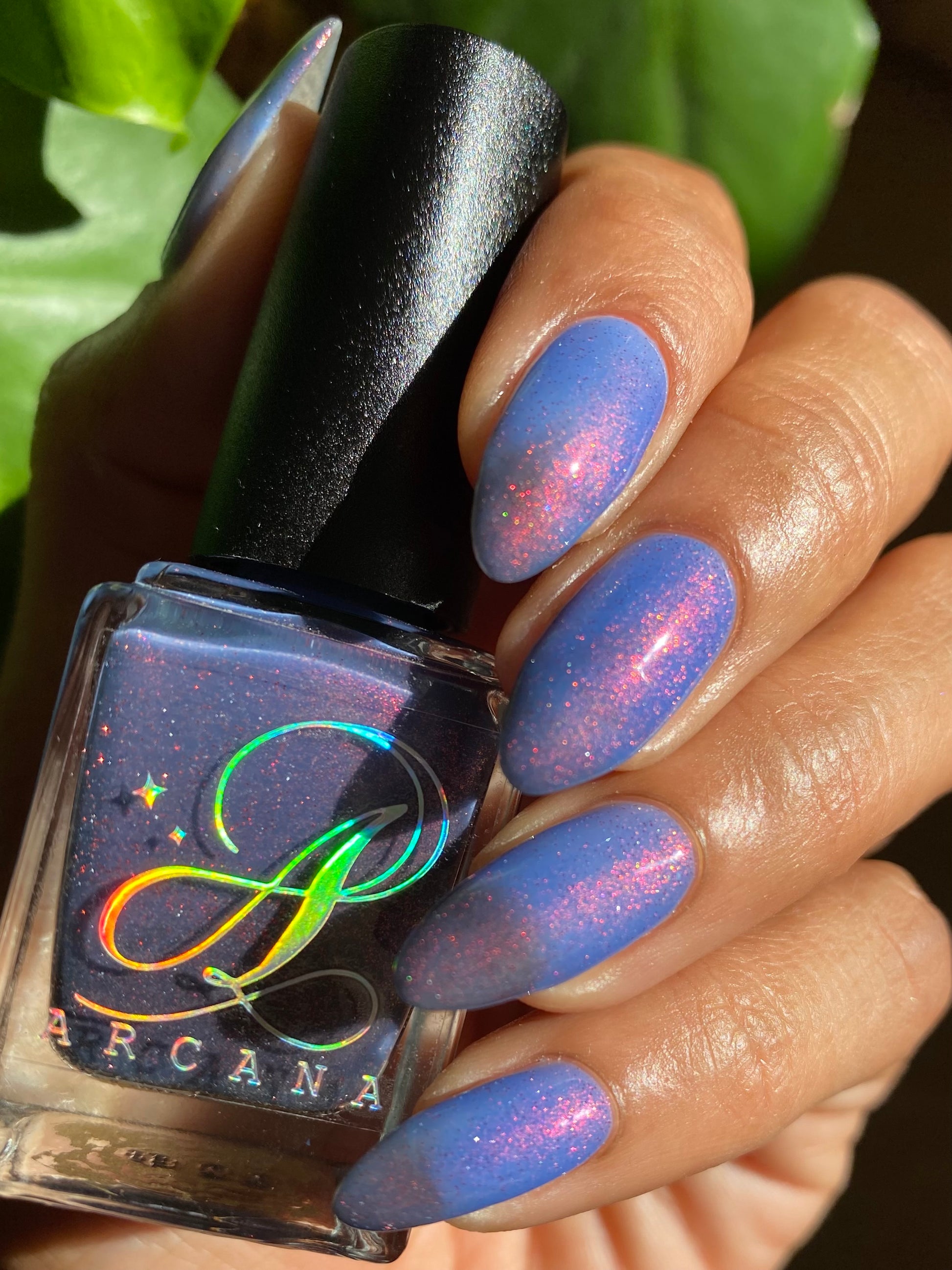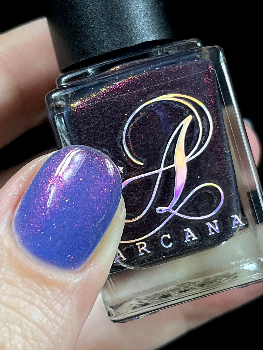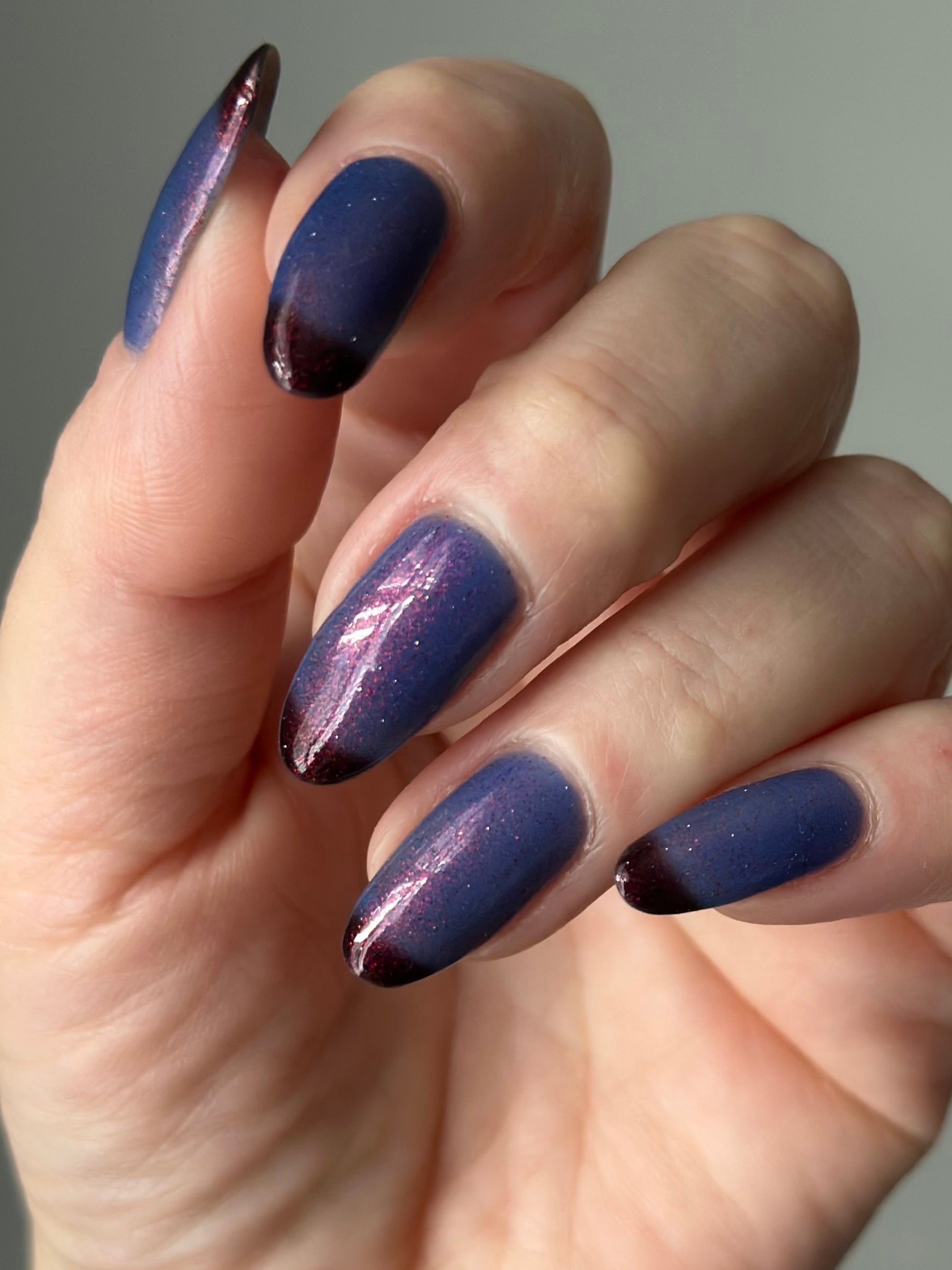 Ceaseless Edge is a very dark blue (cold) to medium blue (warm) with red to orange shimmer and red reflective glitter inspired by the water/dark starter pokemon Hisuian Samurott!