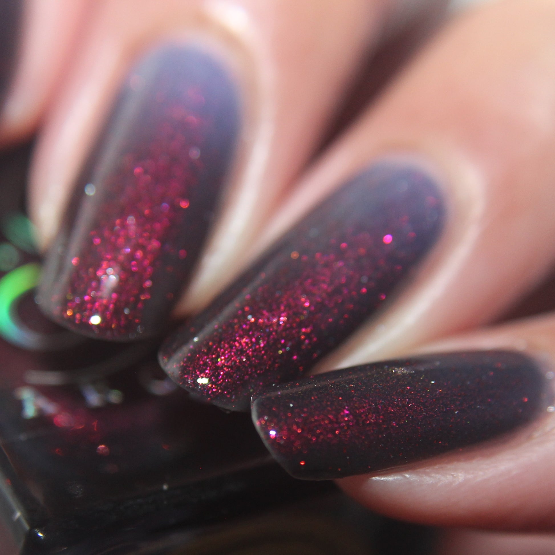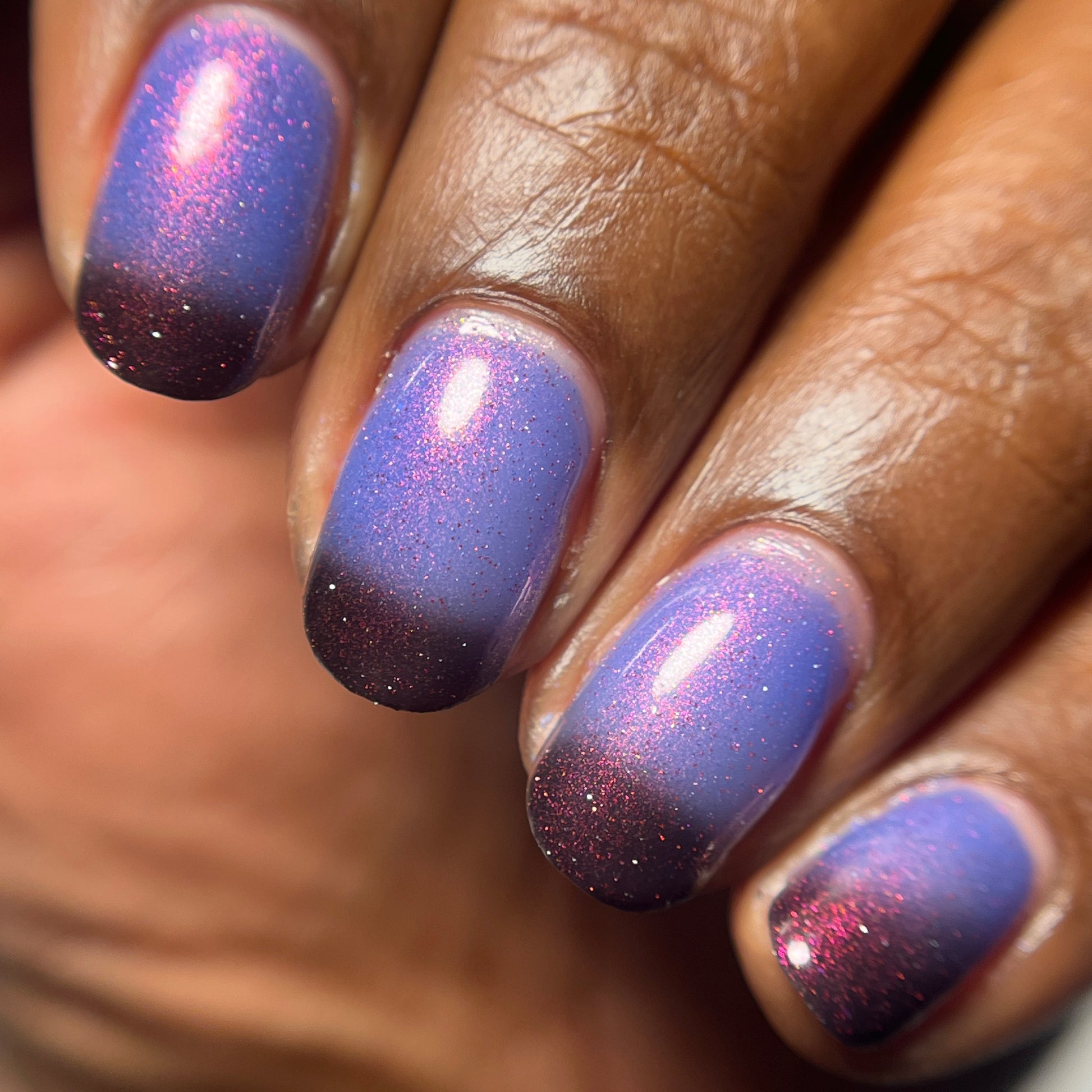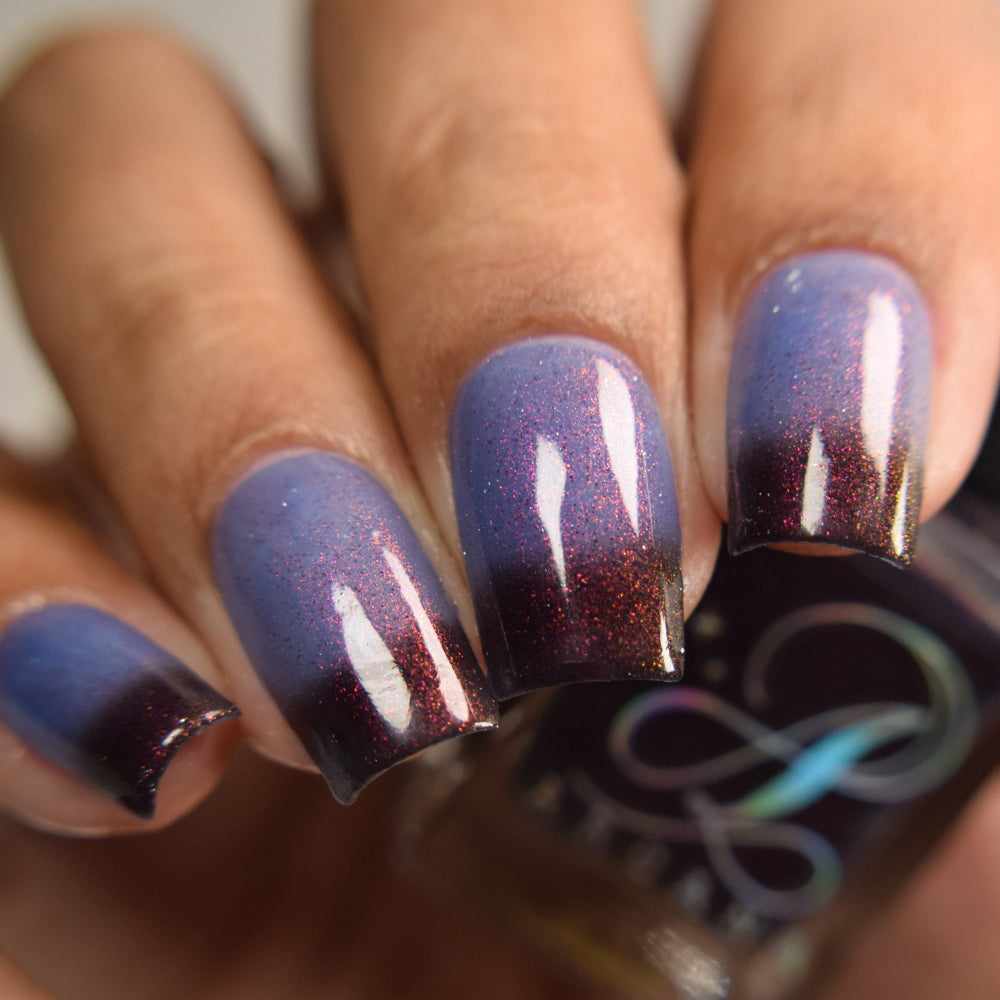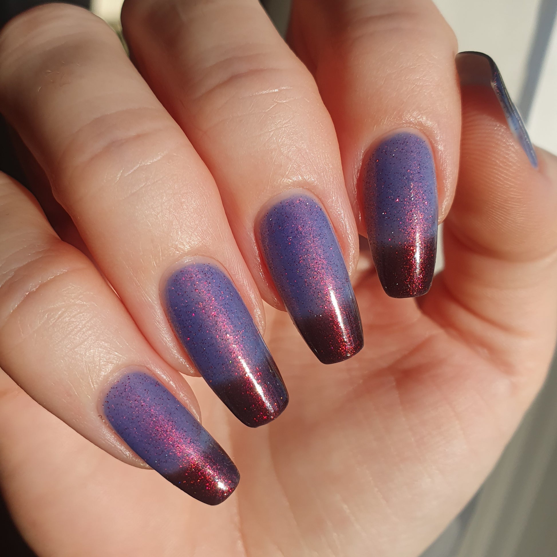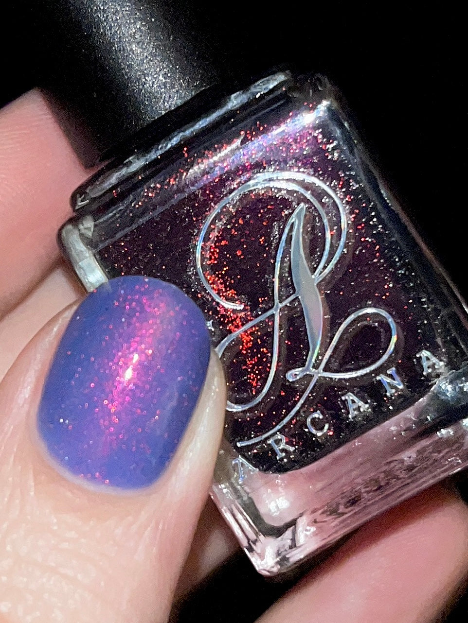 Ceaseless Edge is a very dark blue (cold) to medium blue (warm) with red to orange shimmer and red reflective glitter inspired by the water/dark starter pokemon Hisuian Samurott!