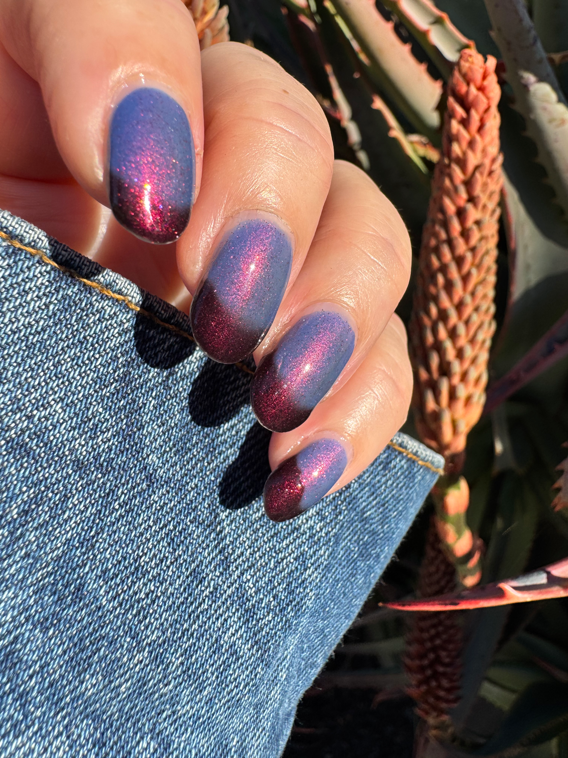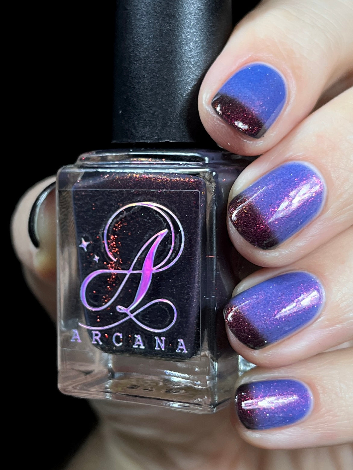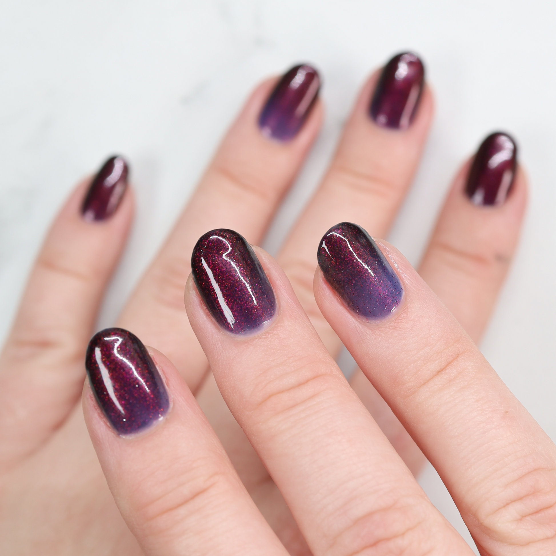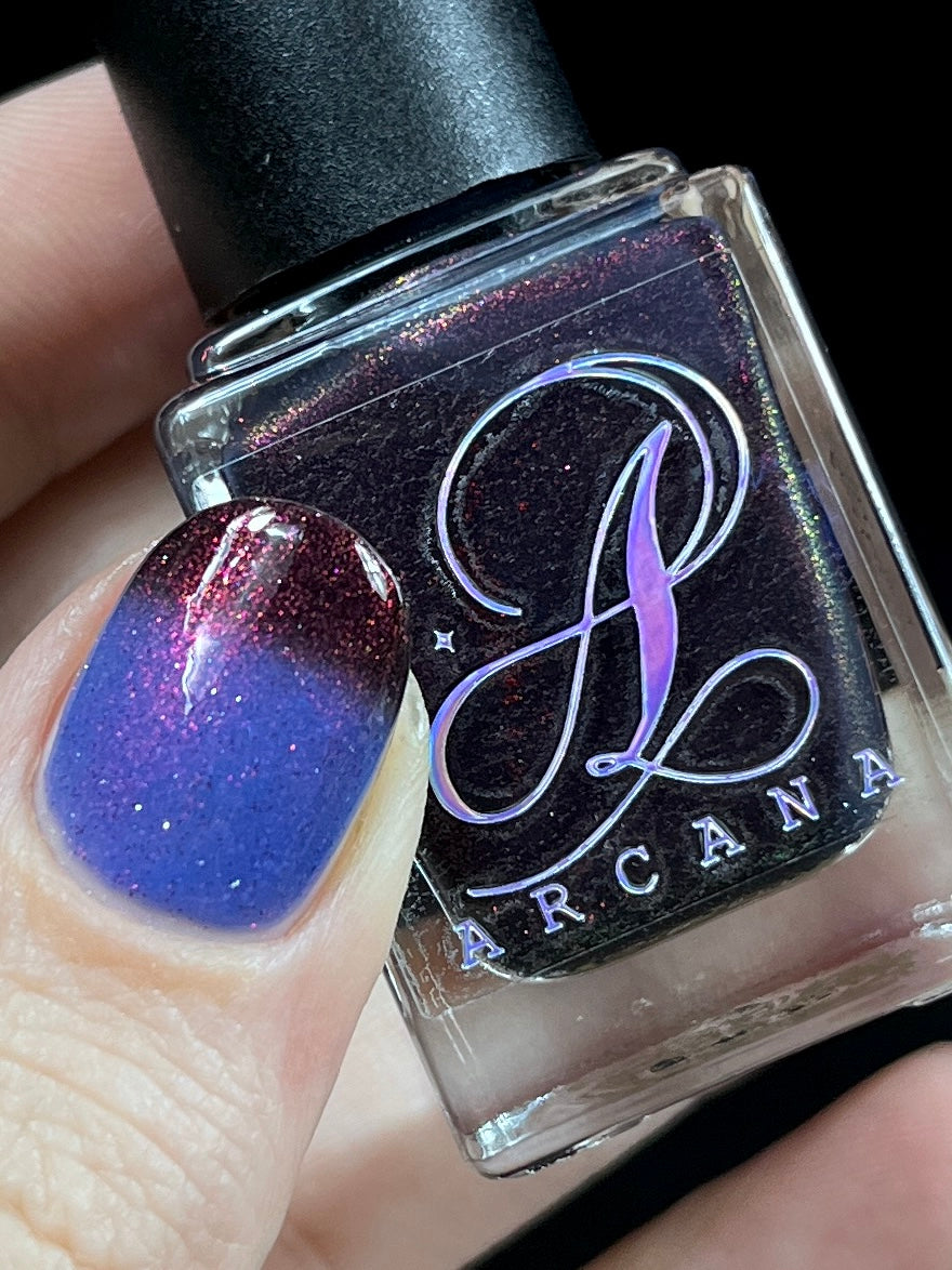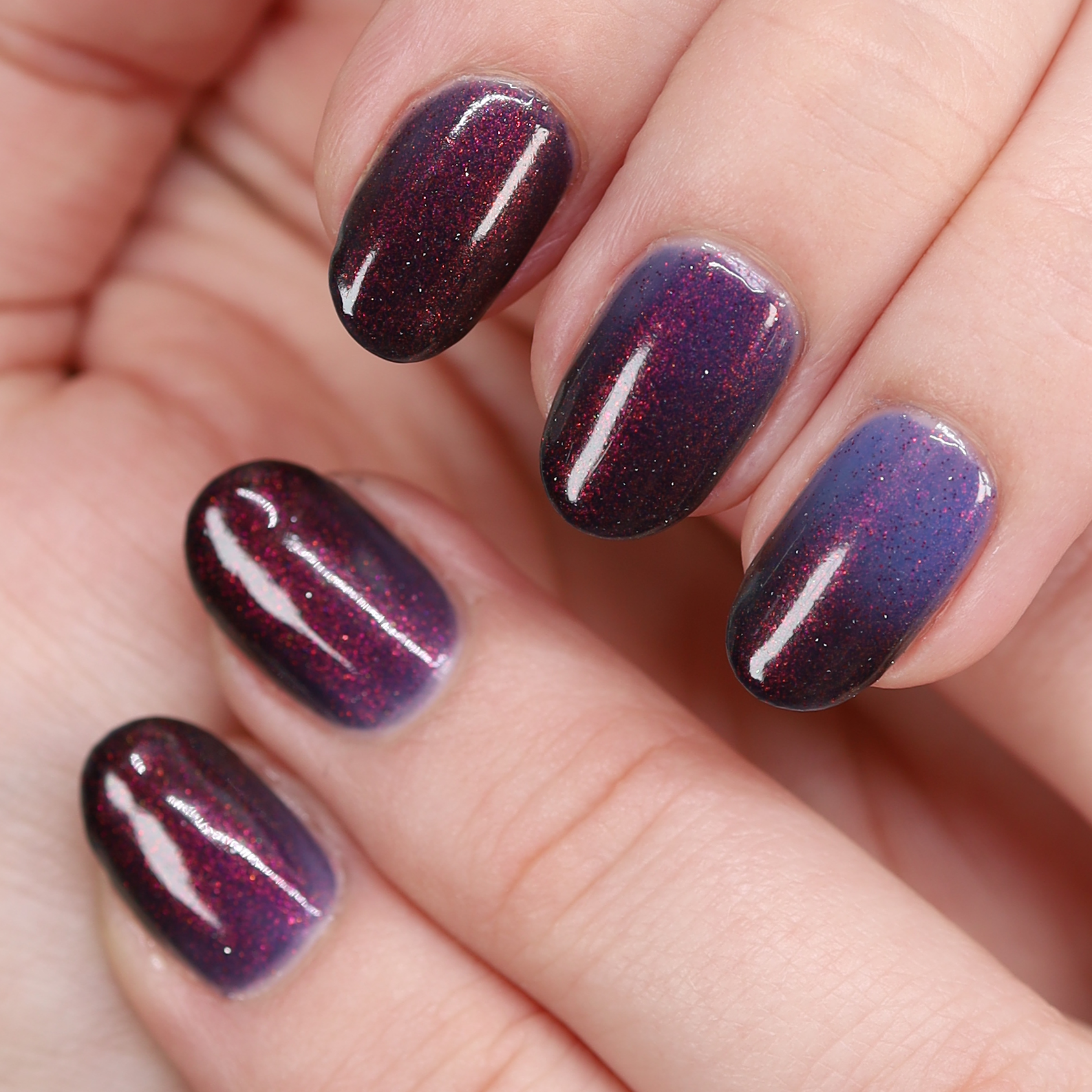 Ceaseless Edge is a very dark blue (cold) to medium blue (warm) with red to orange shimmer and red reflective glitter inspired by the water/dark starter pokemon Hisuian Samurott!