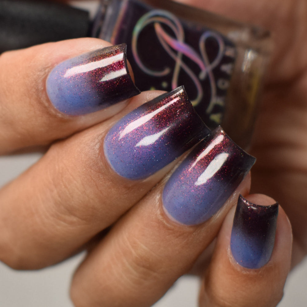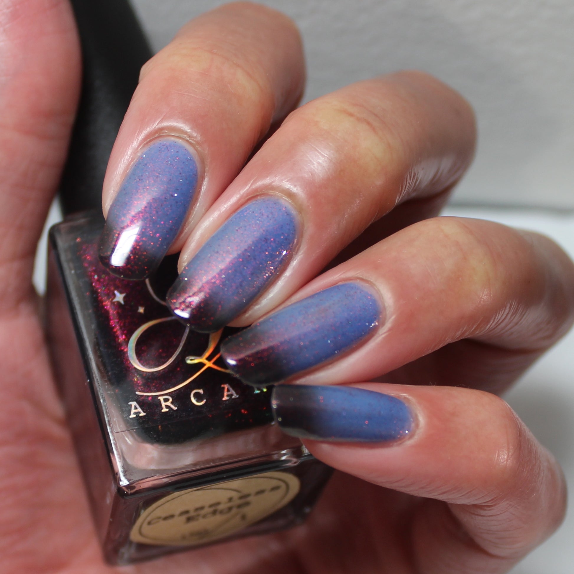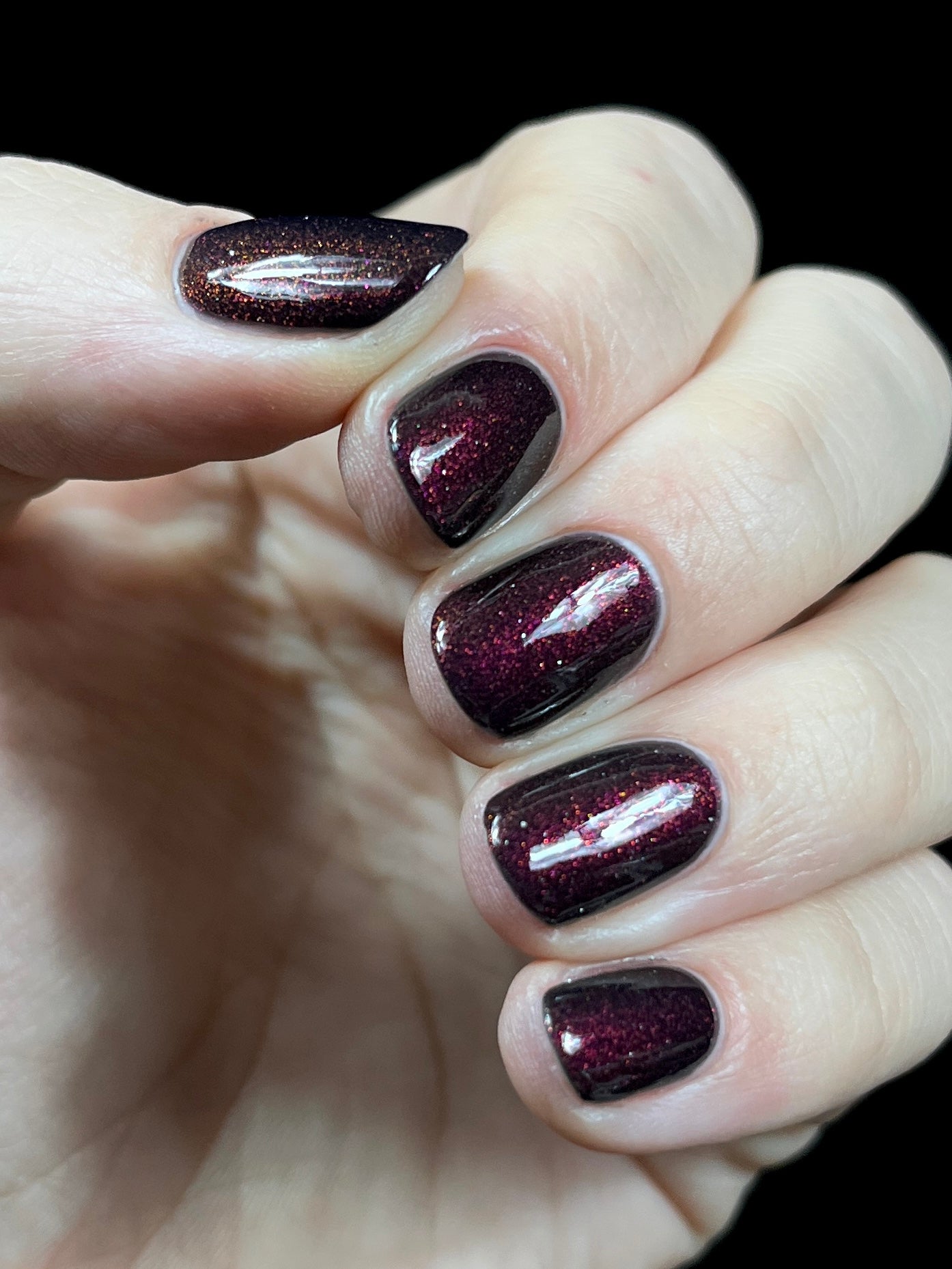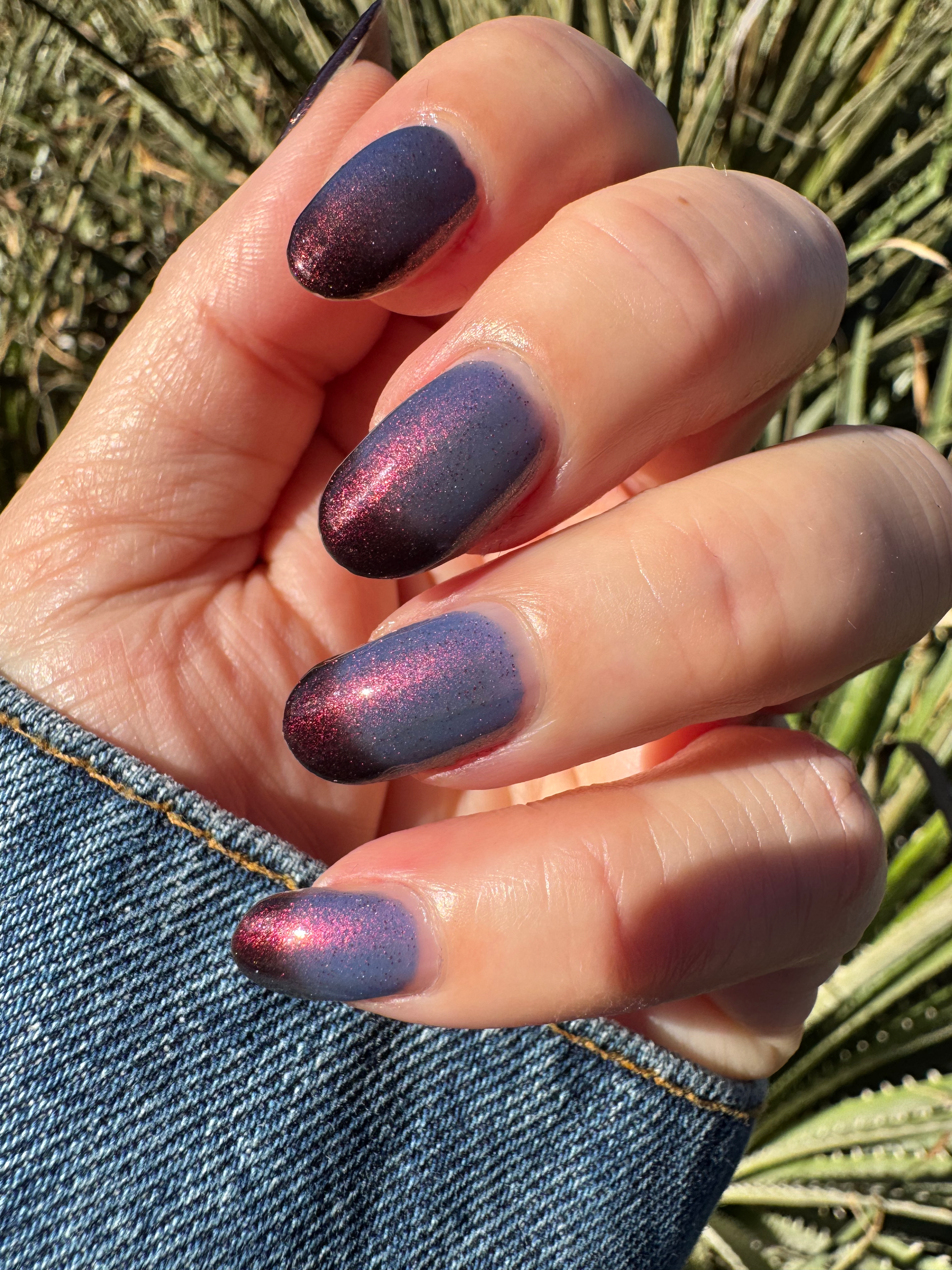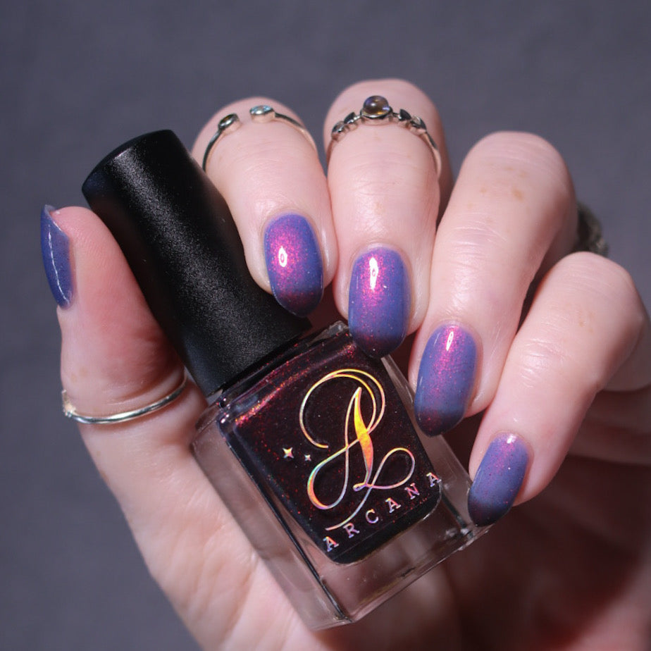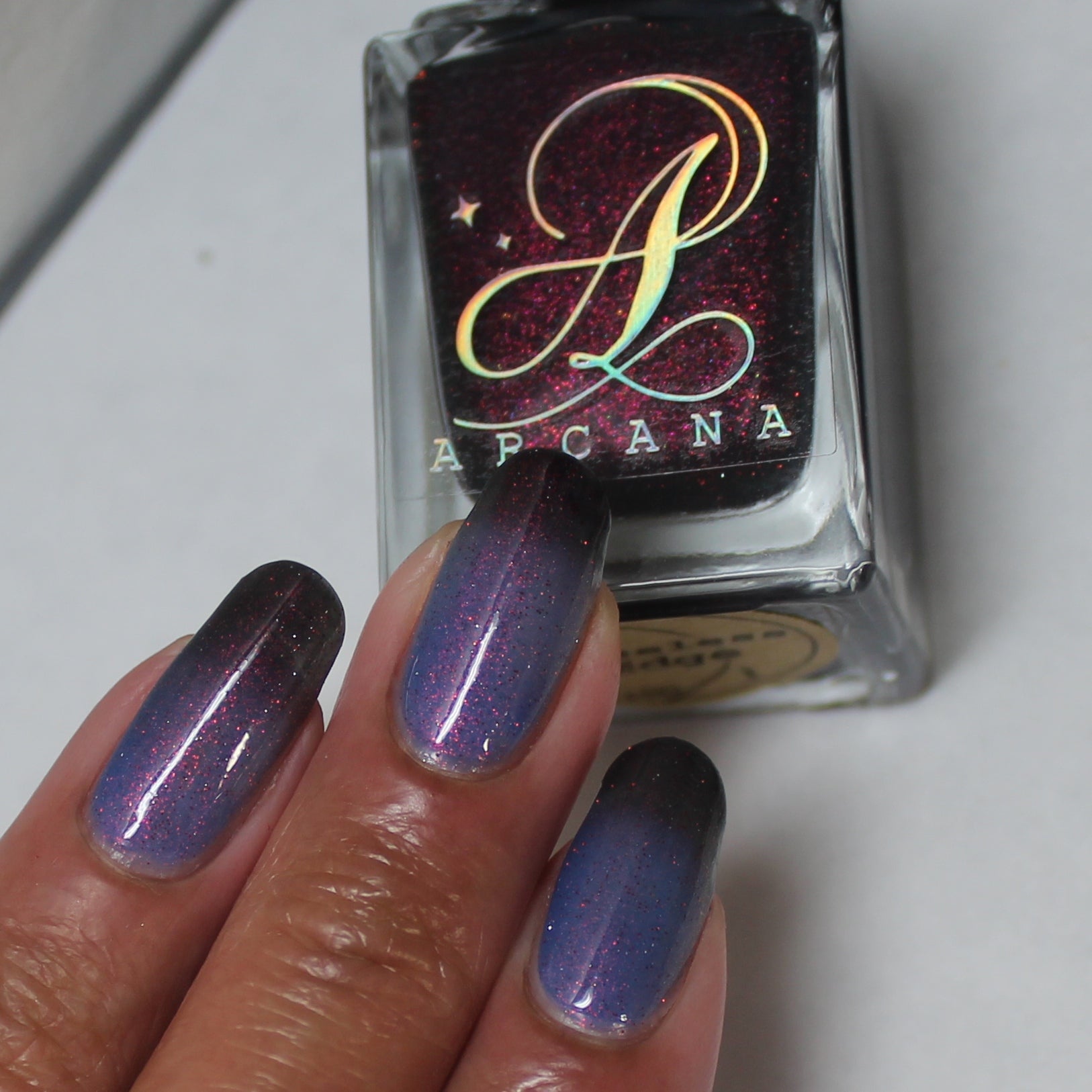 Ceaseless Edge is a very dark blue (cold) to medium blue (warm) with red to orange shimmer and red reflective glitter inspired by the water/dark starter pokemon Hisuian Samurott!