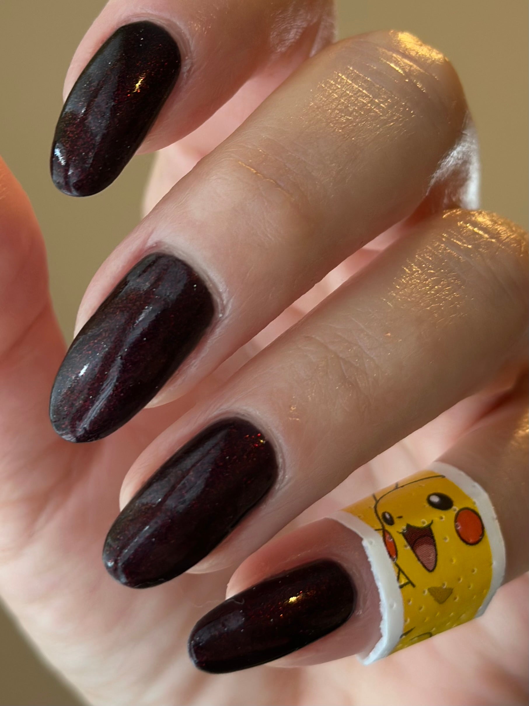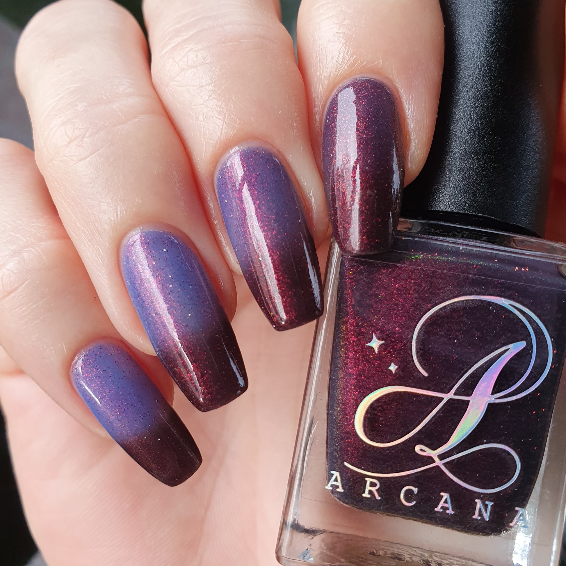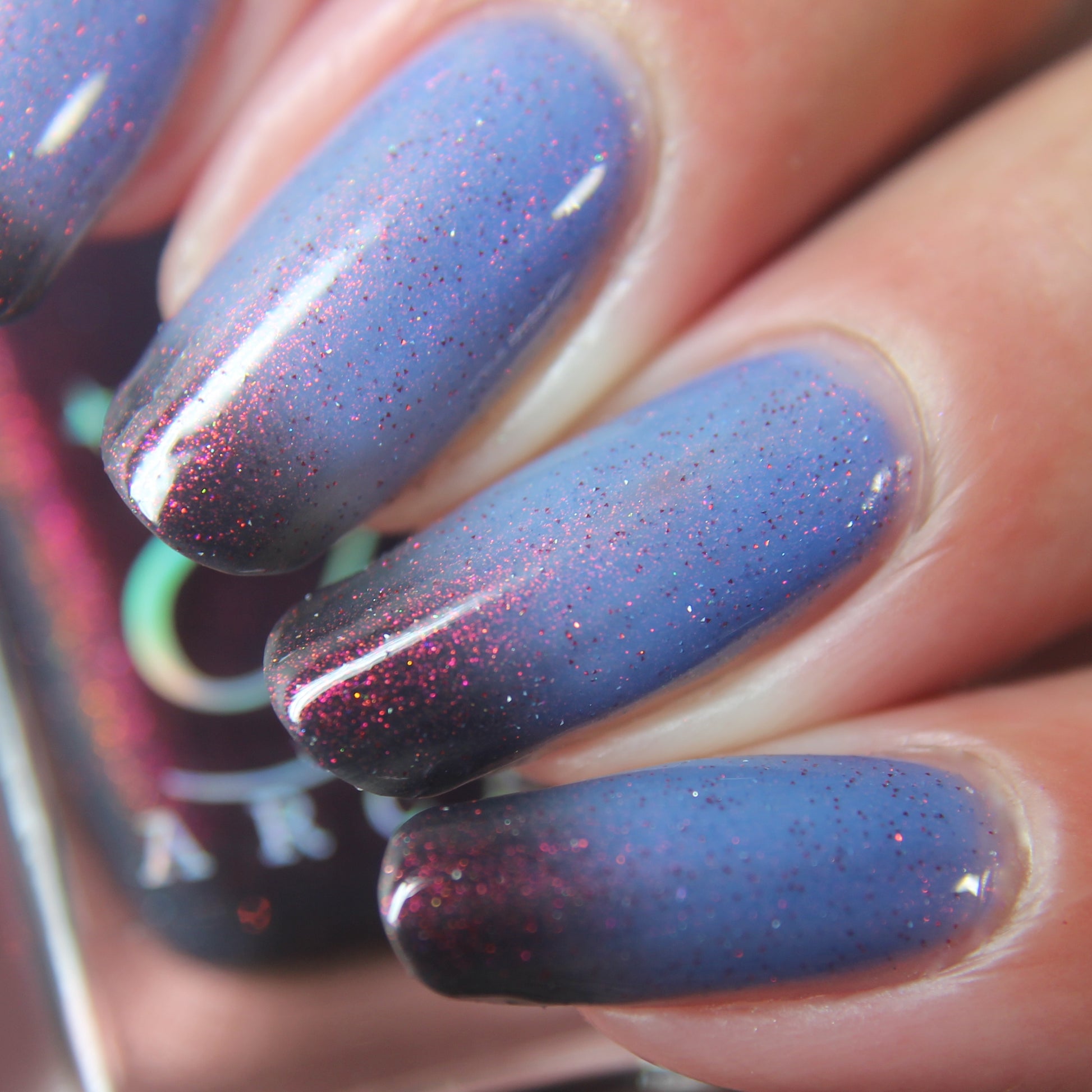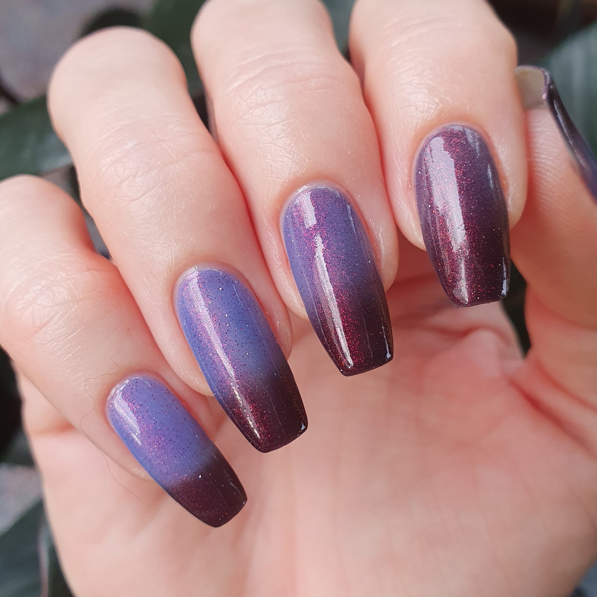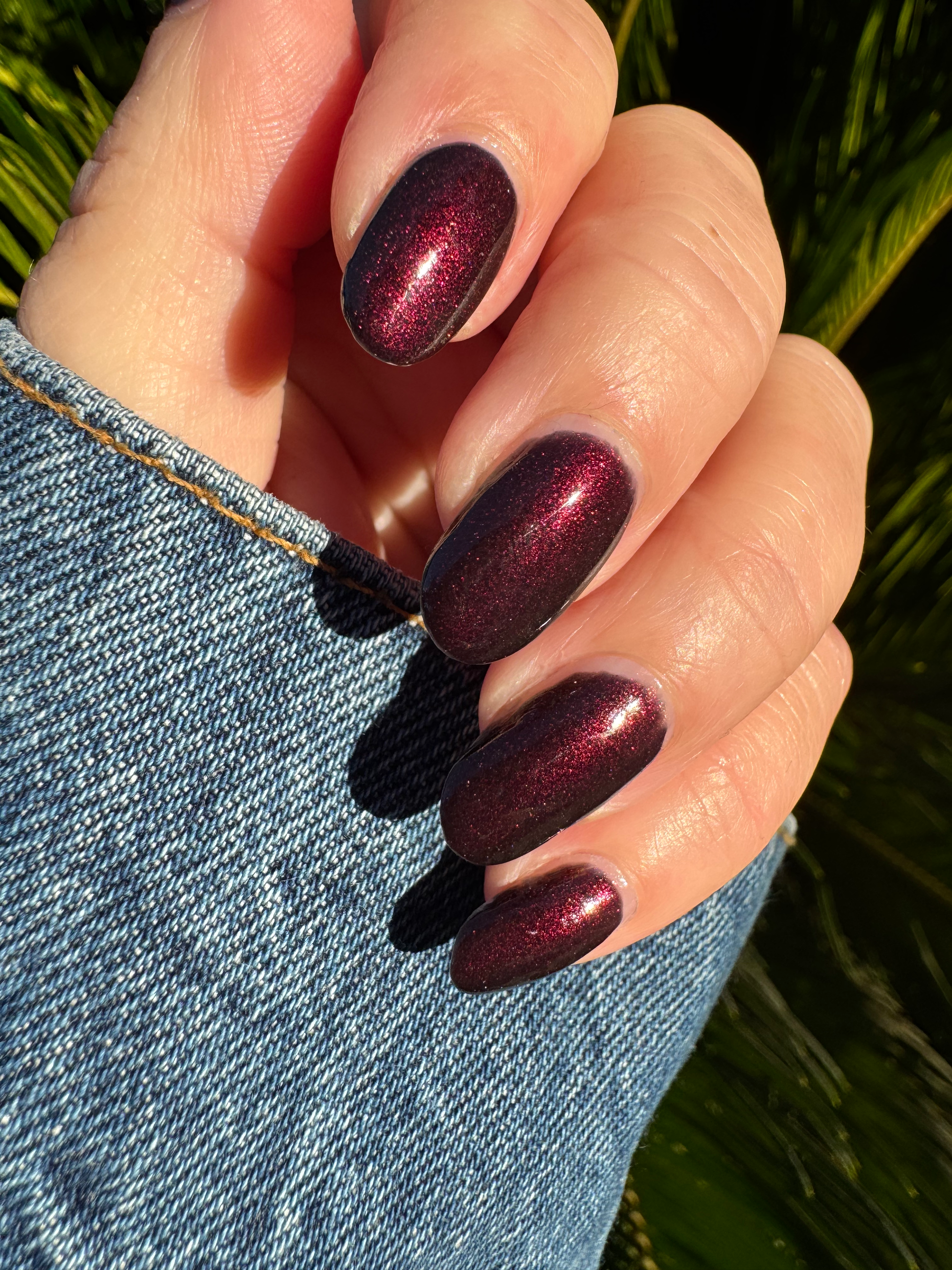 Ceaseless Edge is a very dark blue (cold) to medium blue (warm) with red to orange shimmer and red reflective glitter inspired by the water/dark starter pokemon Hisuian Samurott!