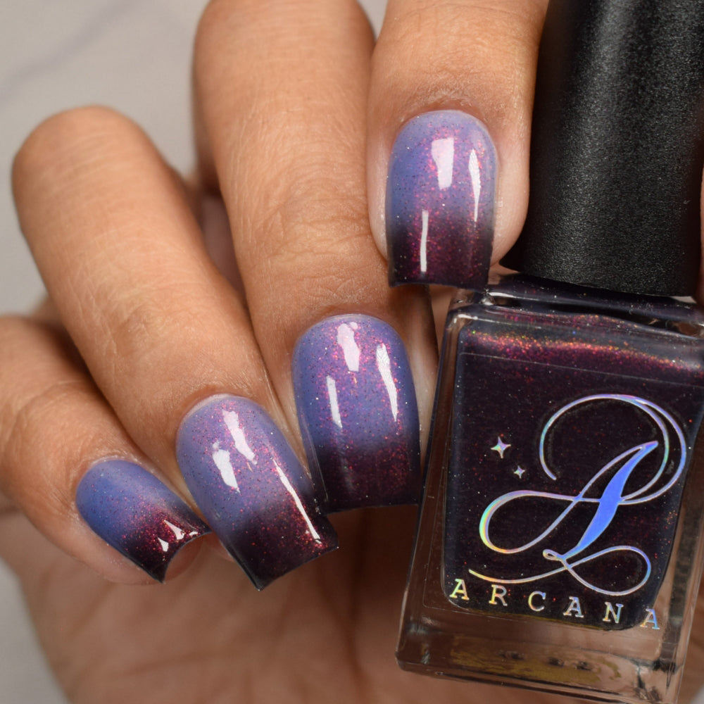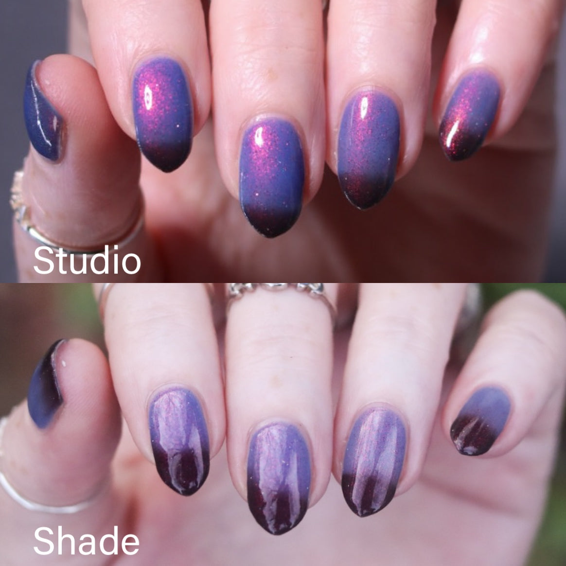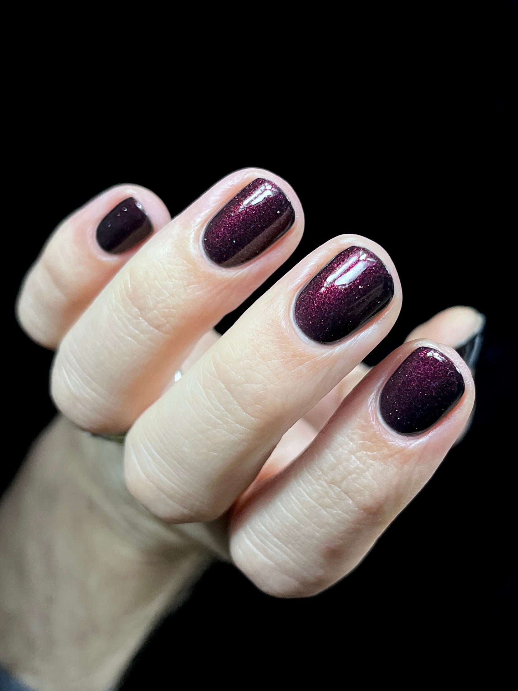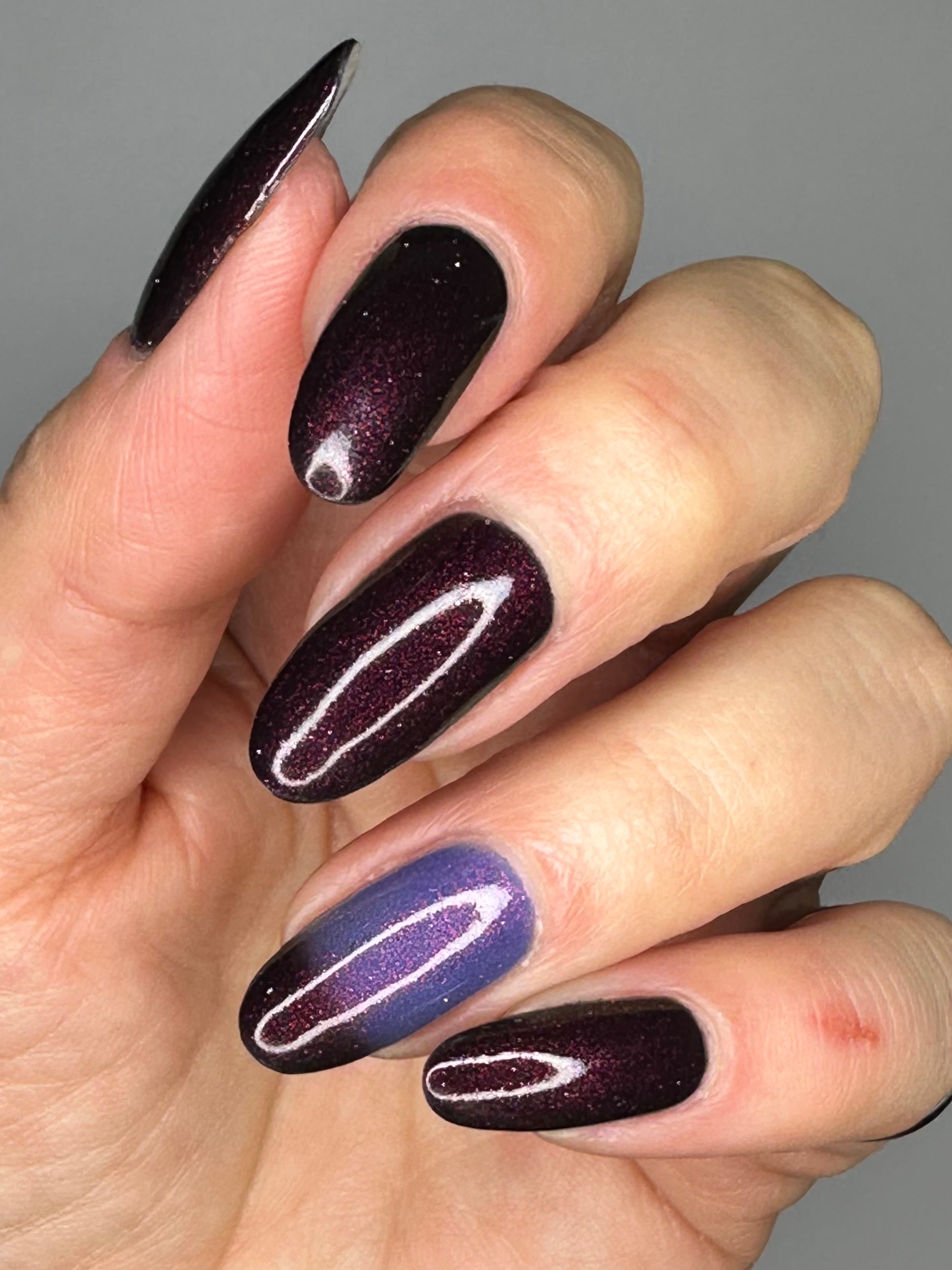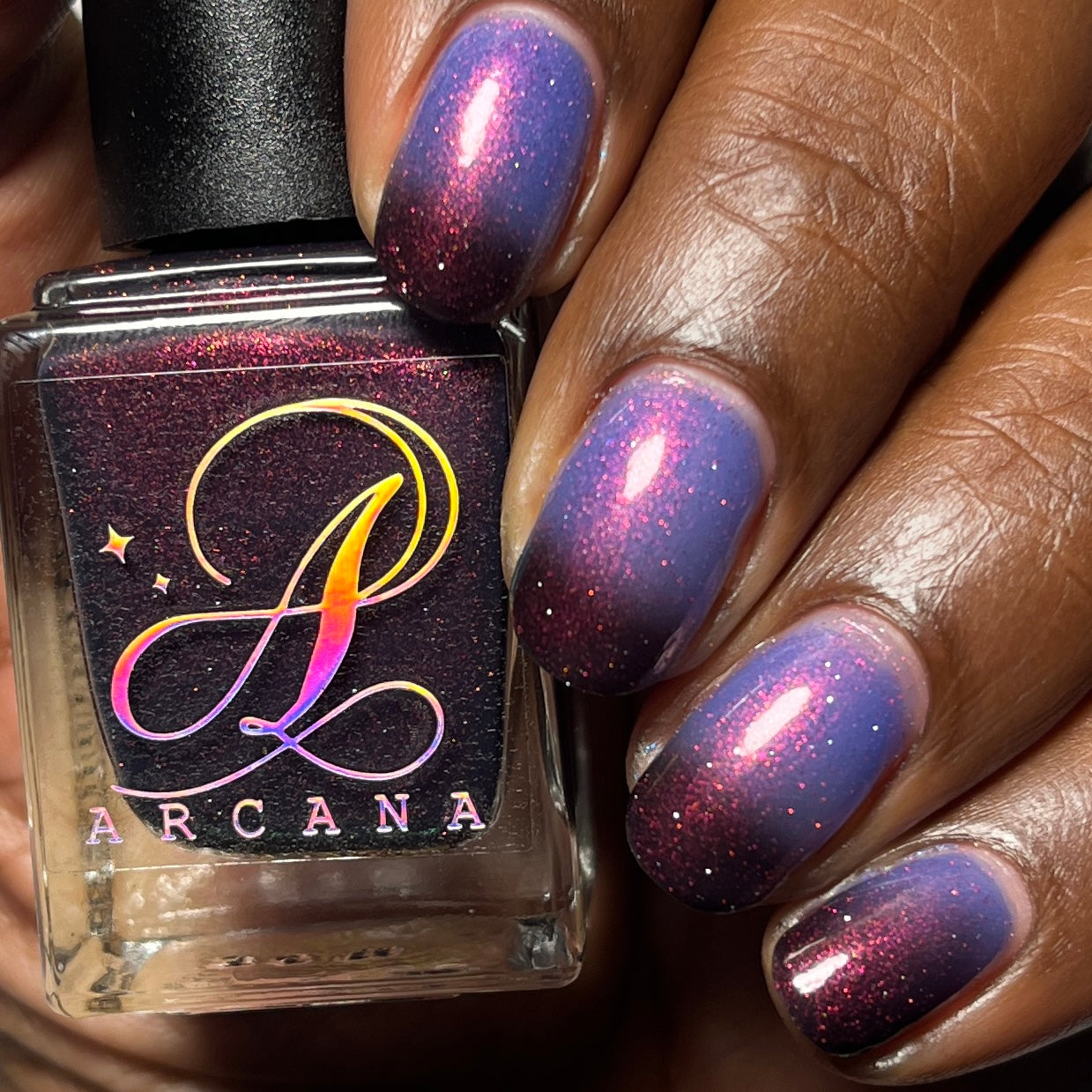 Ceaseless Edge is a very dark blue (cold) to medium blue (warm) with red to orange shimmer and red reflective glitter inspired by the water/dark starter pokemon Hisuian Samurott!