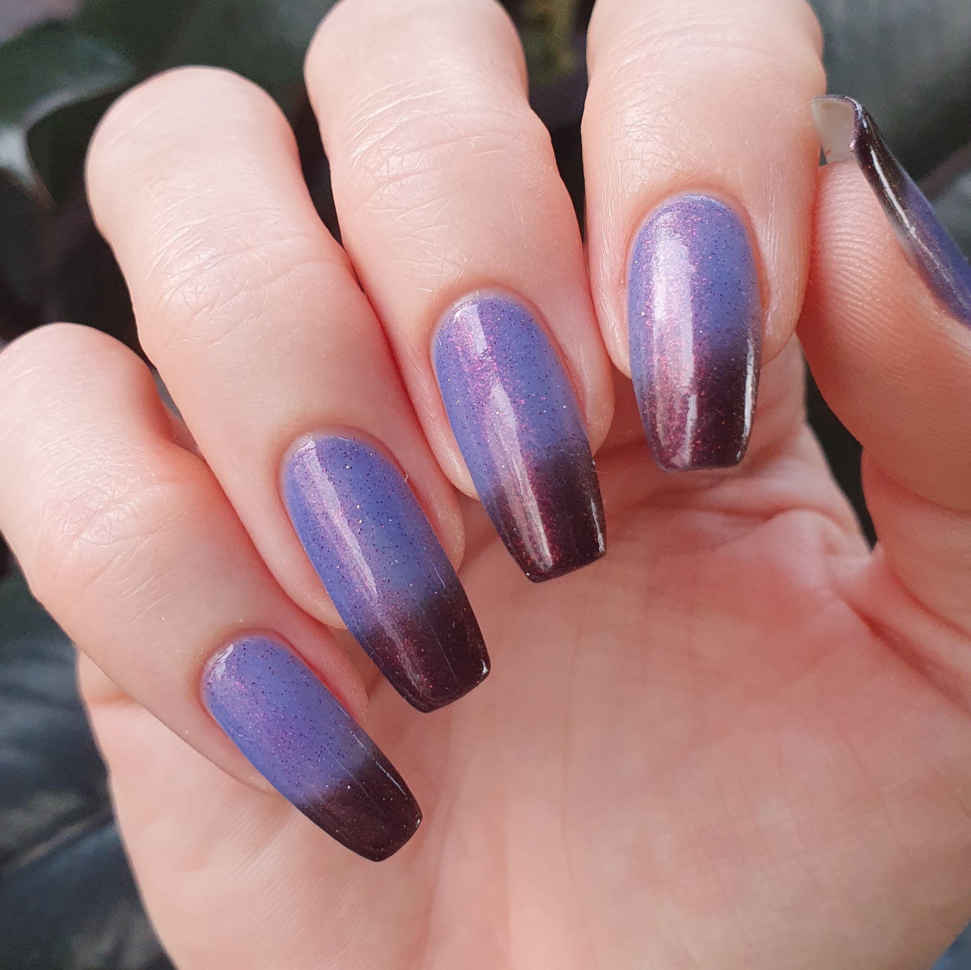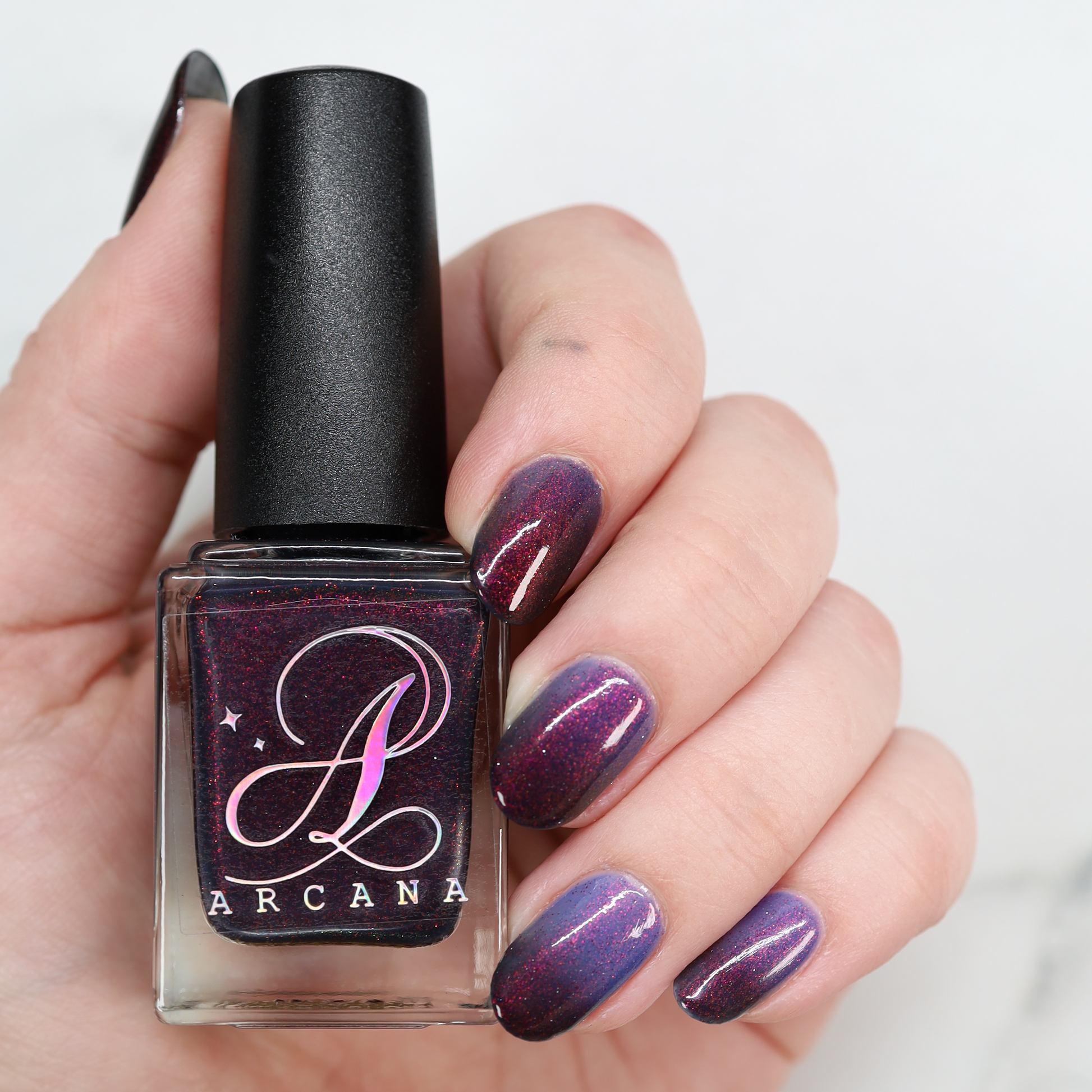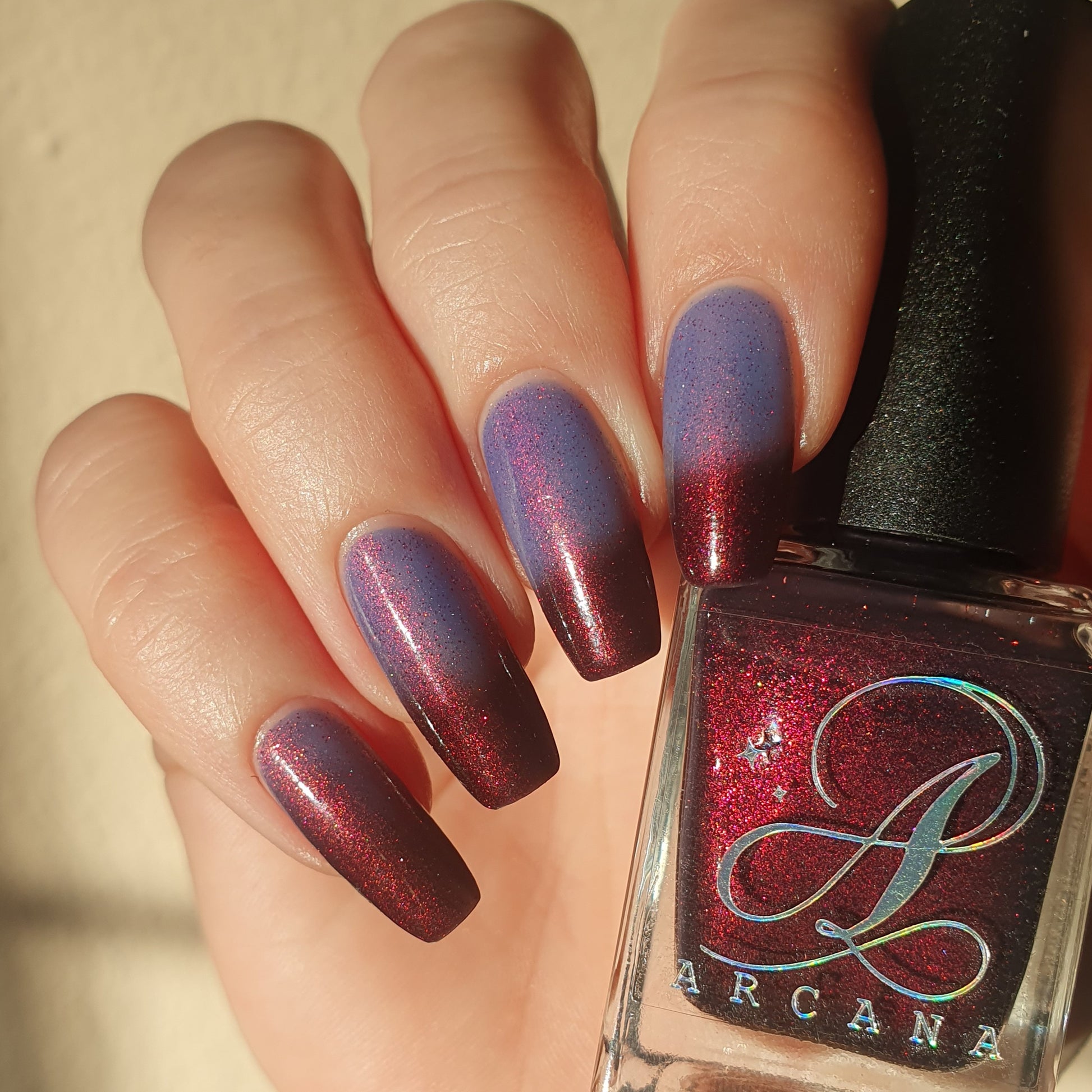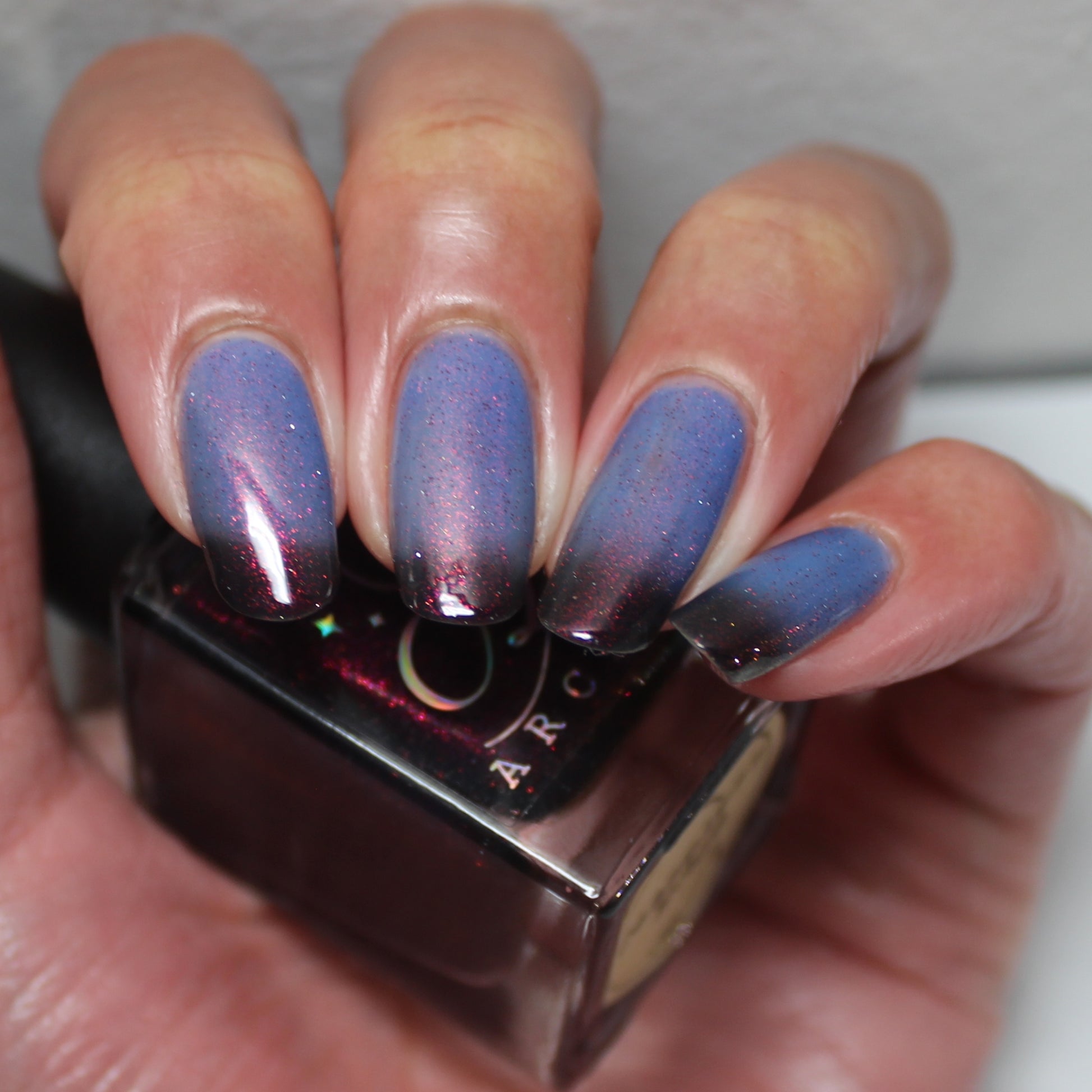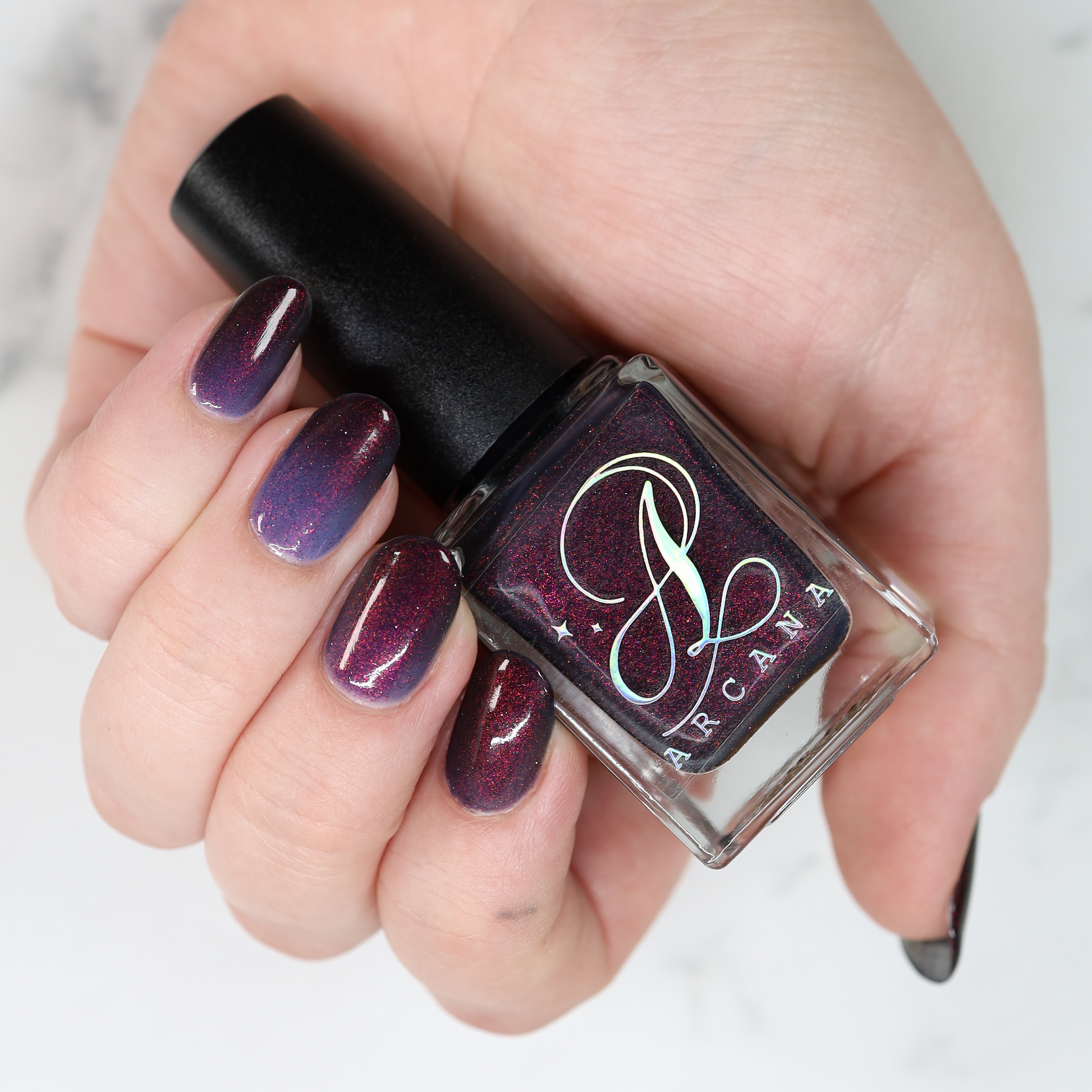 Ceaseless Edge is a very dark blue (cold) to medium blue (warm) with red to orange shimmer and red reflective glitter inspired by the water/dark starter pokemon Hisuian Samurott!