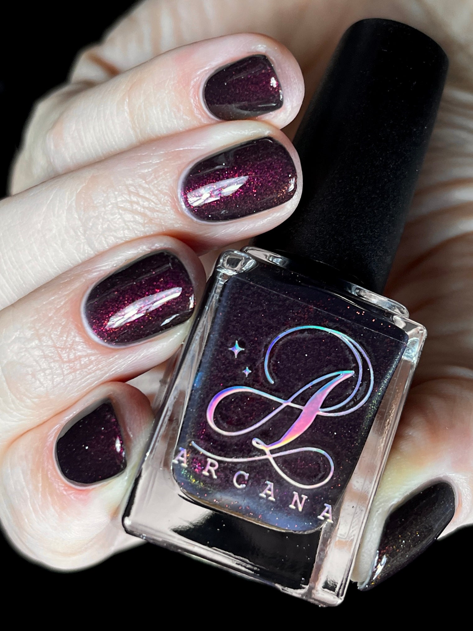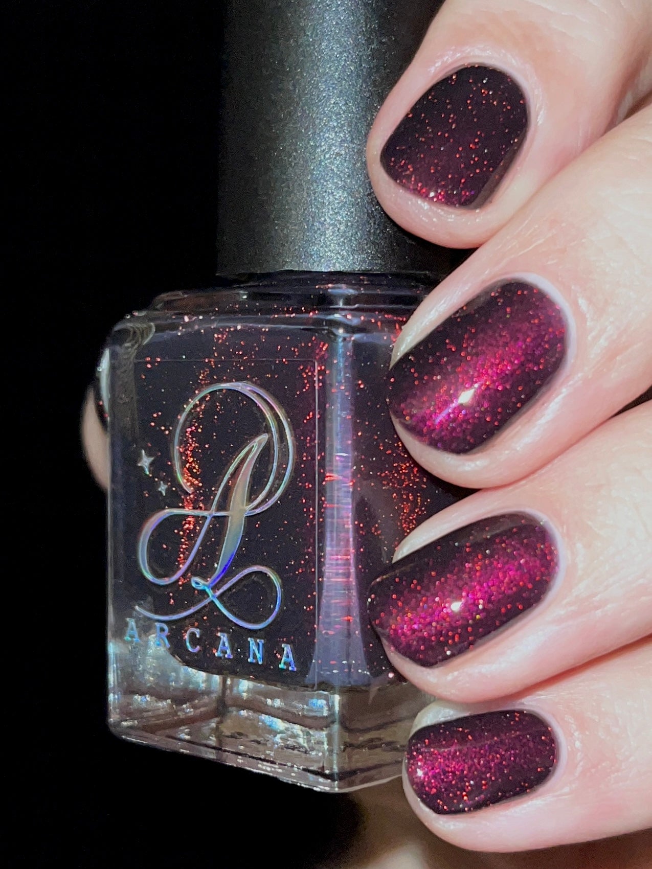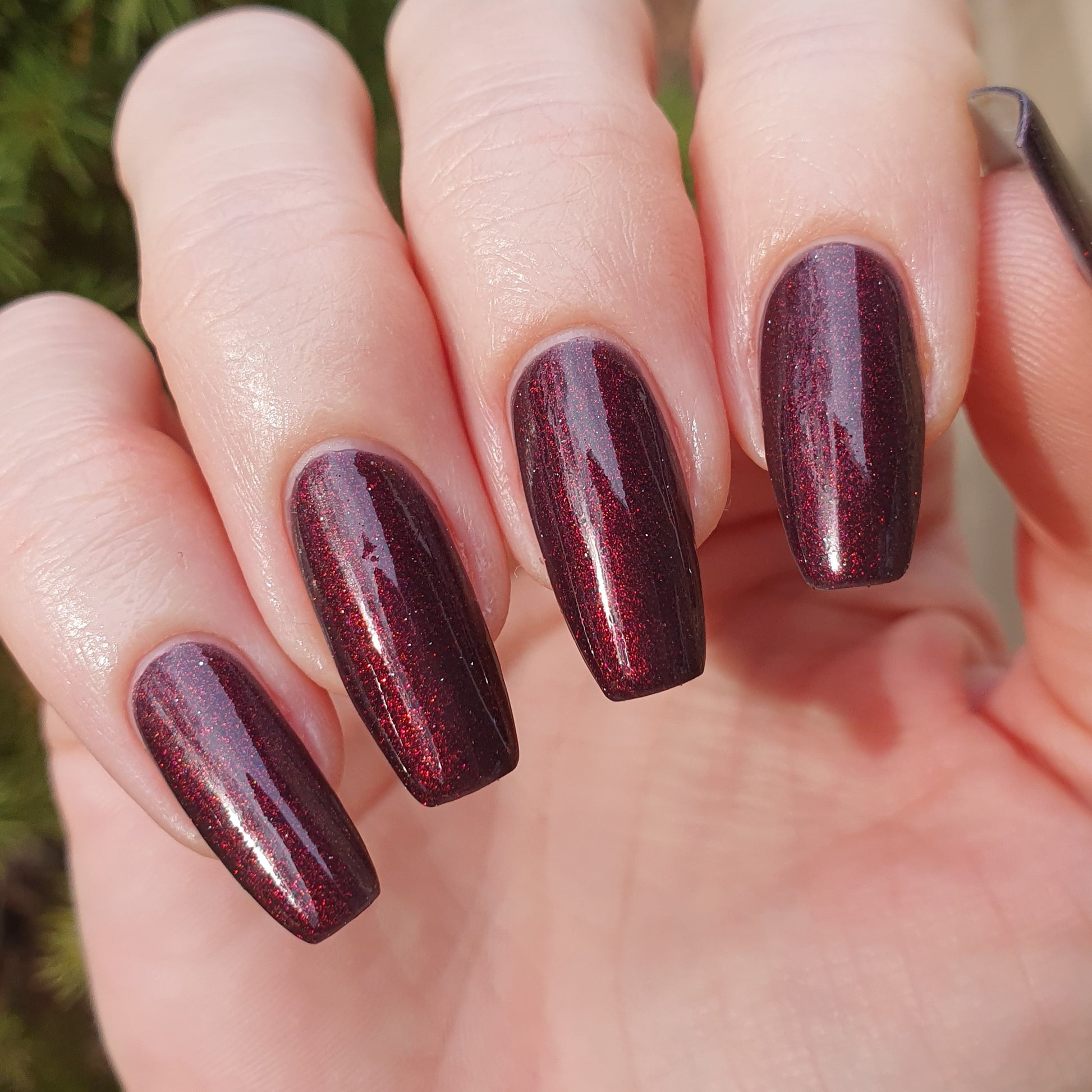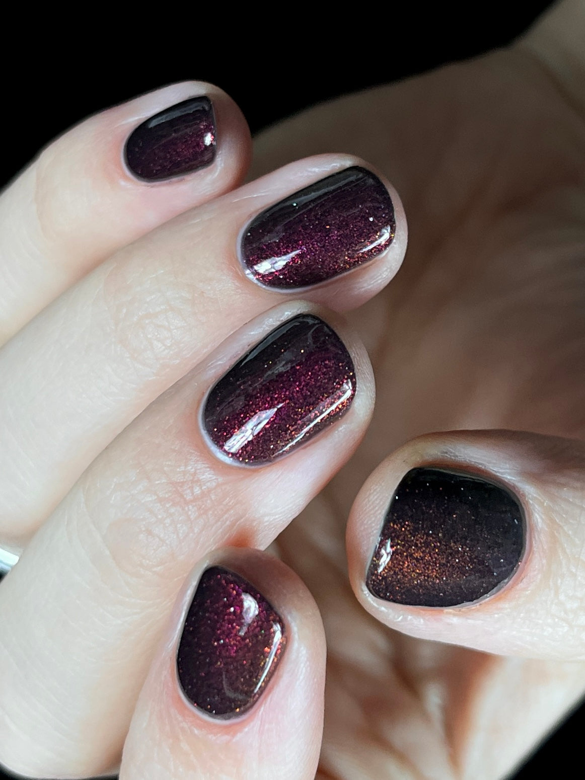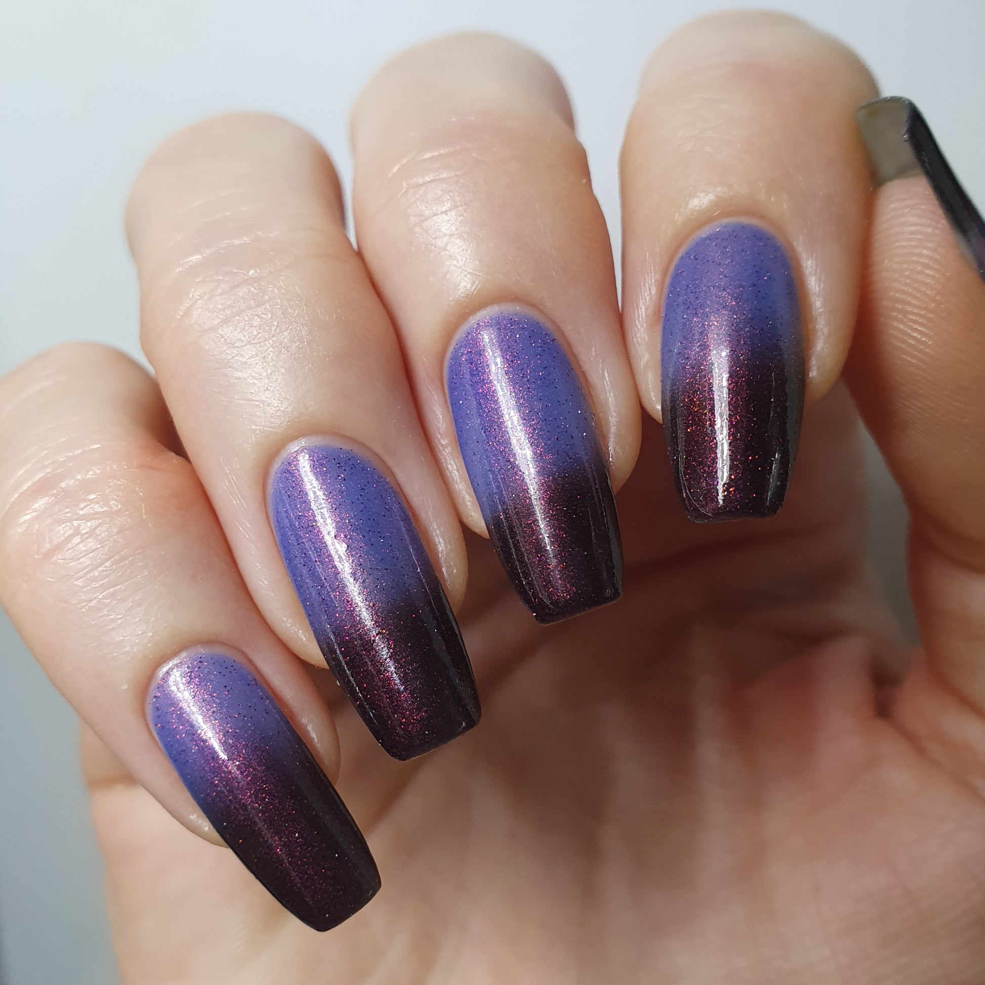 Ceaseless Edge is a very dark blue (cold) to medium blue (warm) with red to orange shimmer and red reflective glitter inspired by the water/dark starter pokemon Hisuian Samurott!