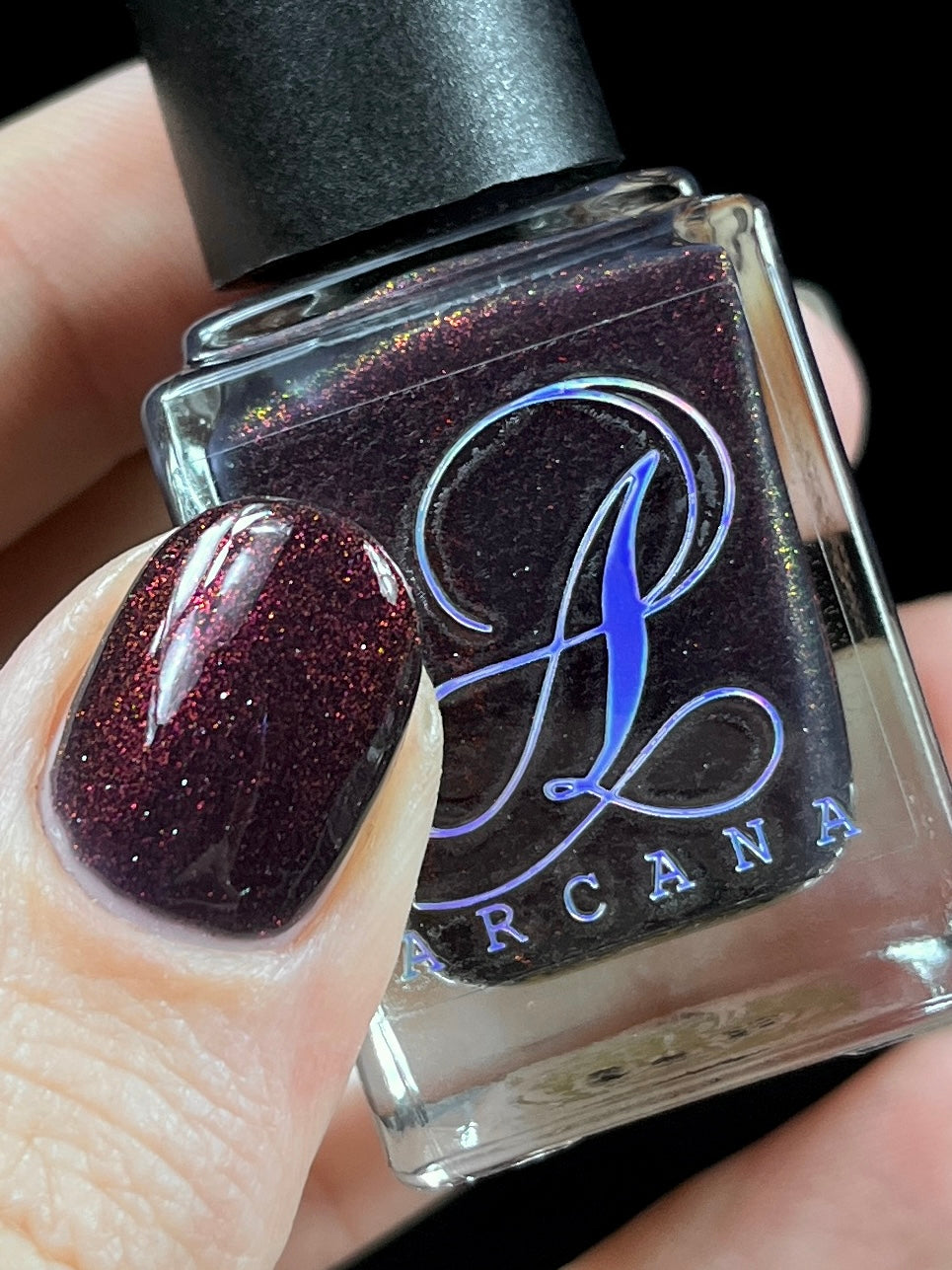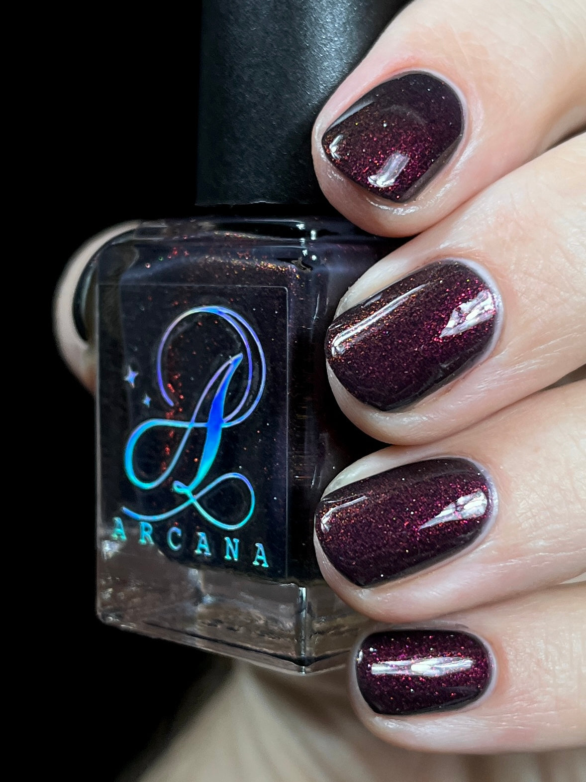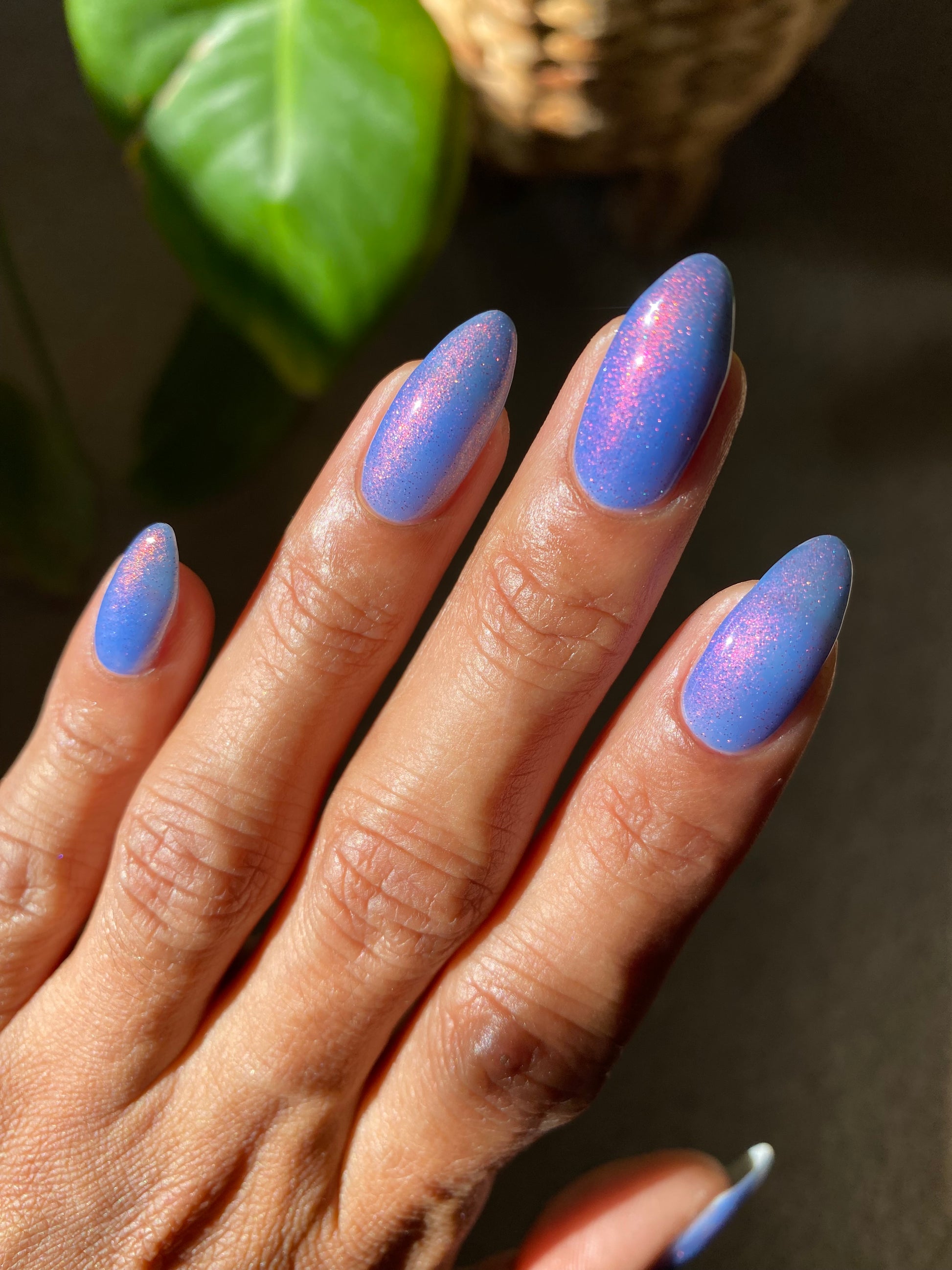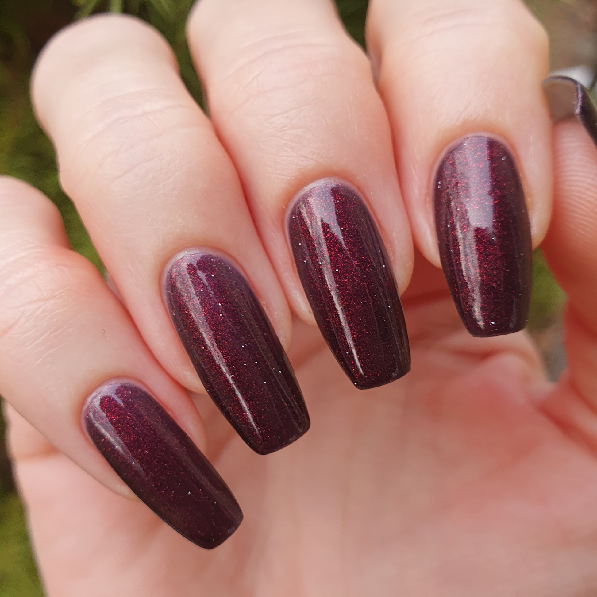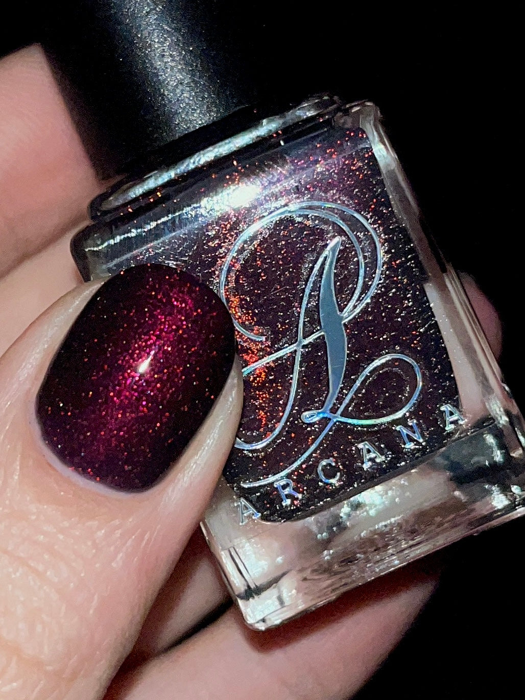 Ceaseless Edge is a very dark blue (cold) to medium blue (warm) with red to orange shimmer and red reflective glitter inspired by the water/dark starter pokemon Hisuian Samurott!