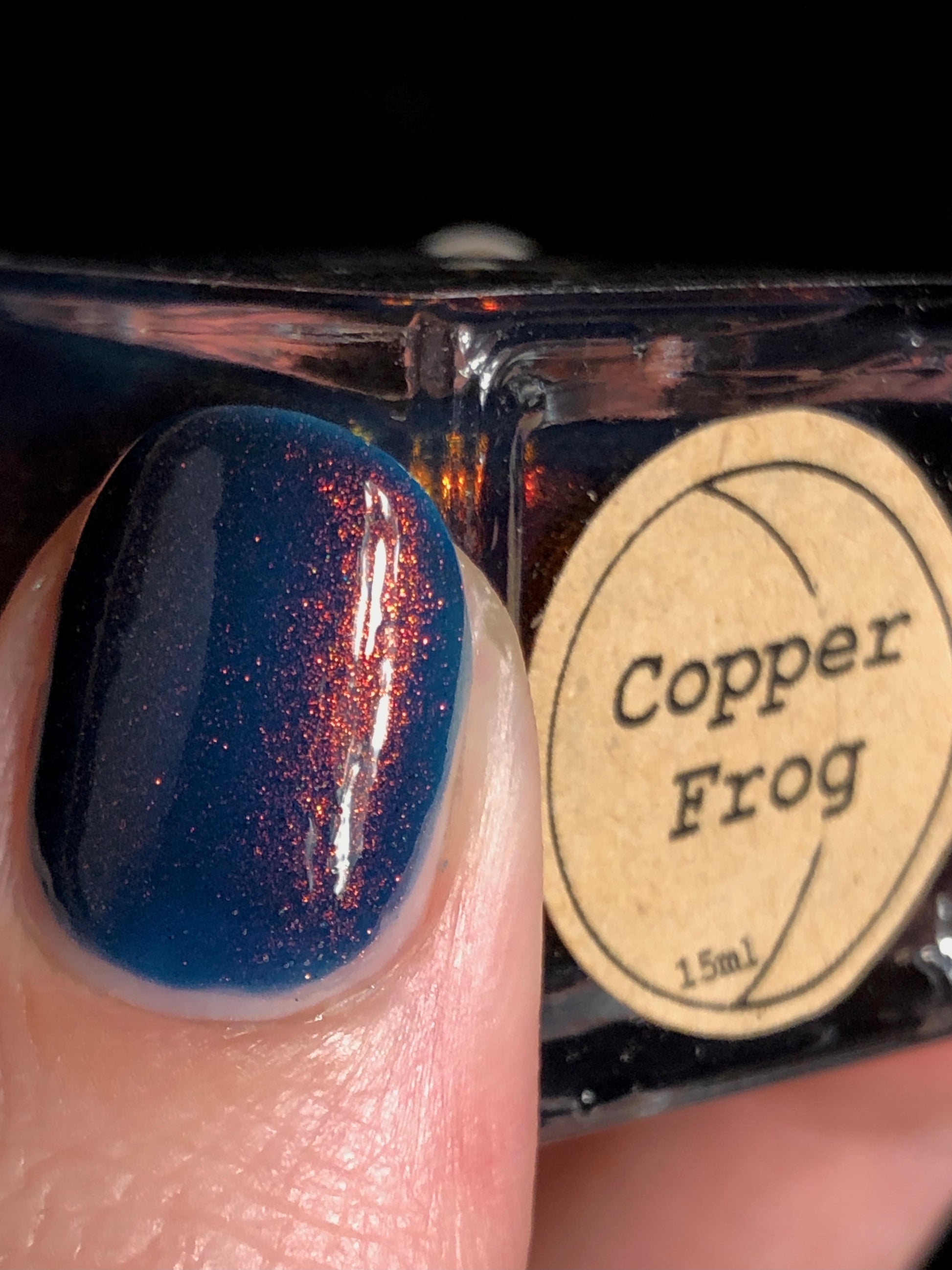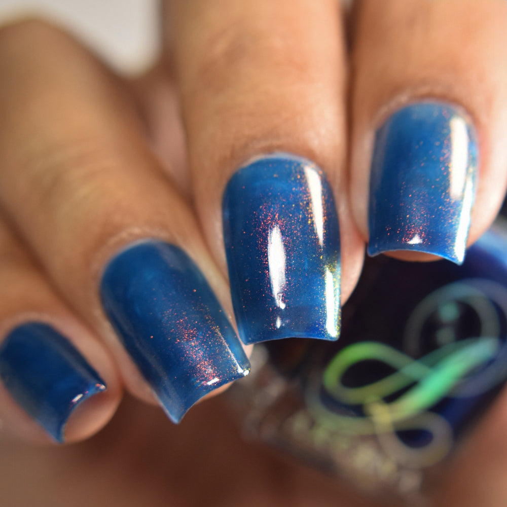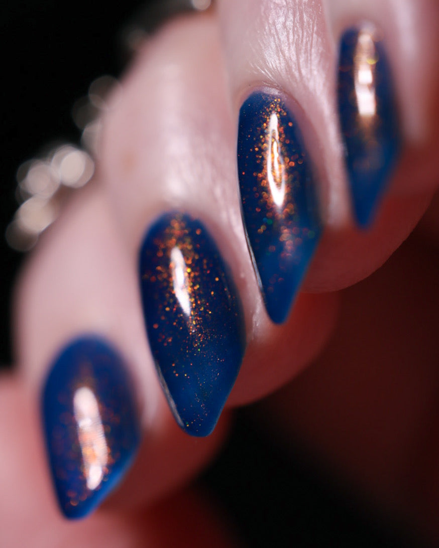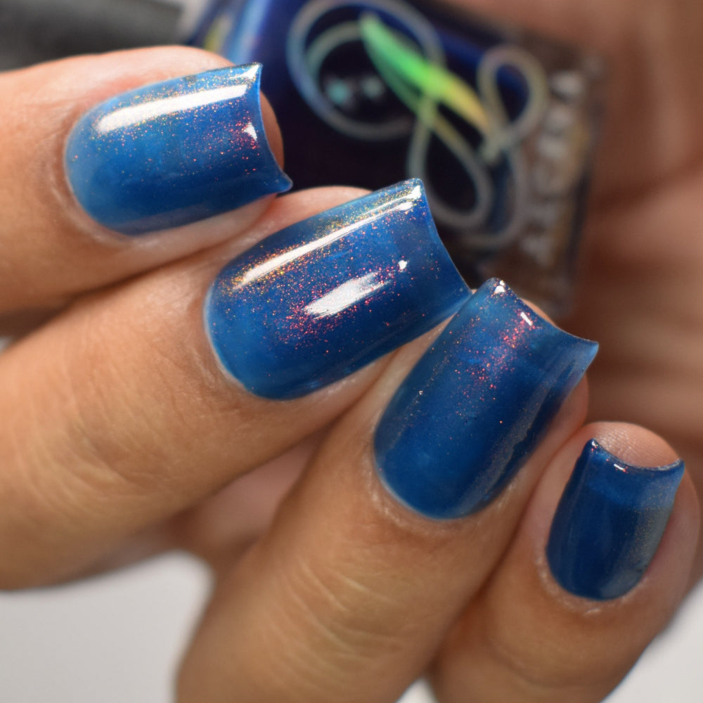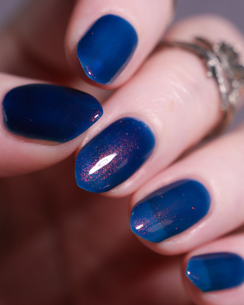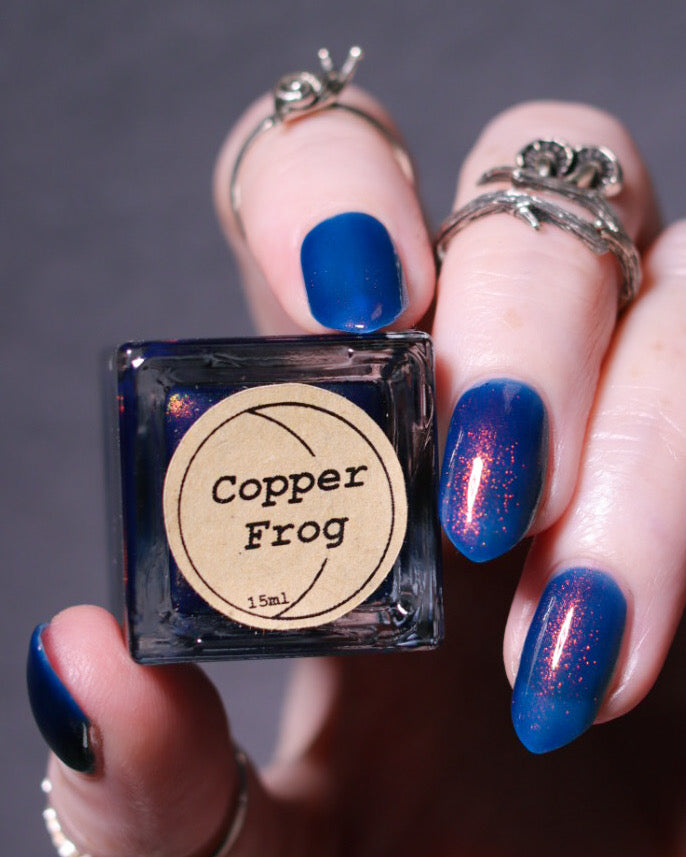 Copper Frog is a sibling to Golden Toad! This polish has a denim blue jelly base with copper to gold shimmer.