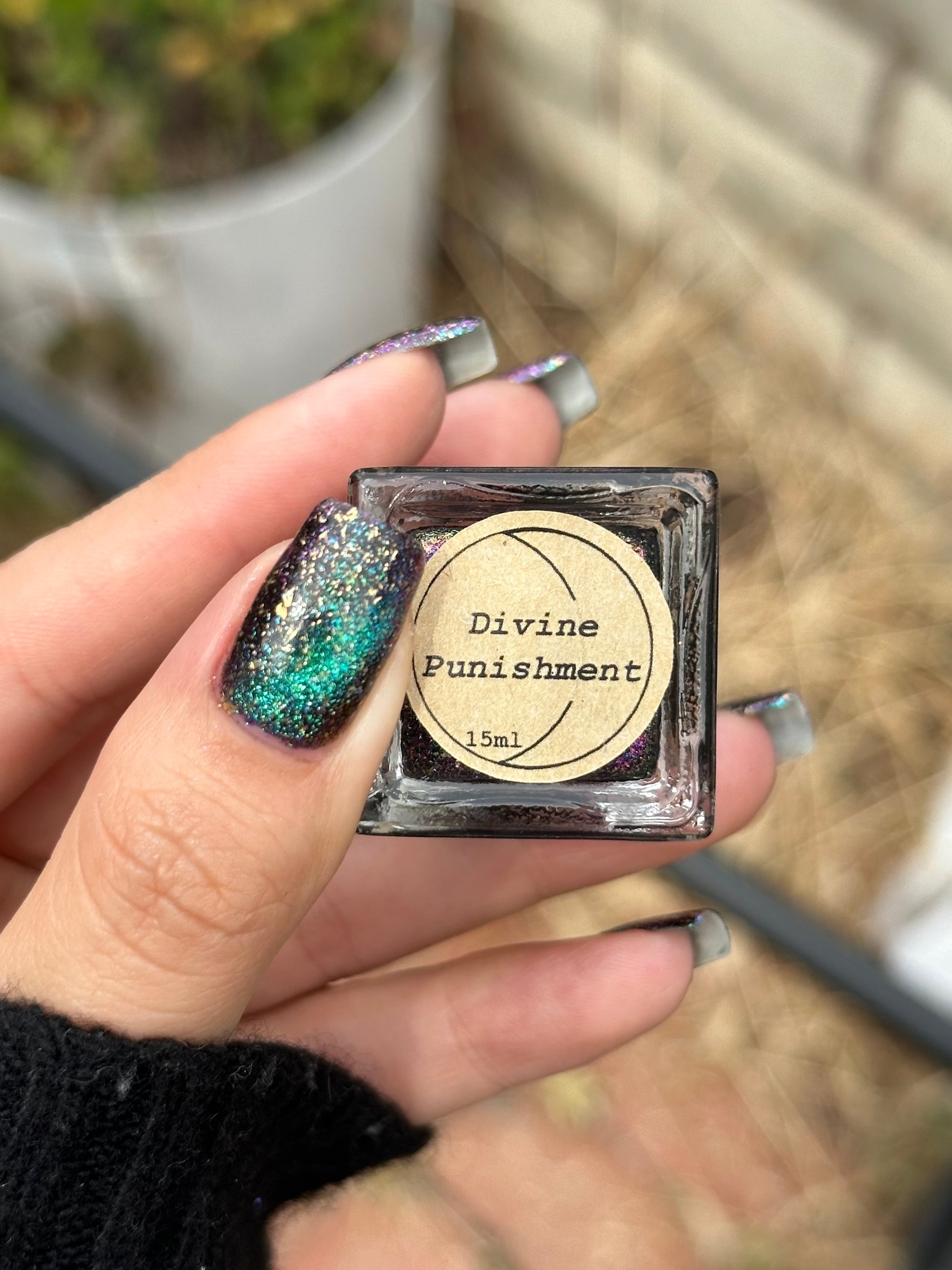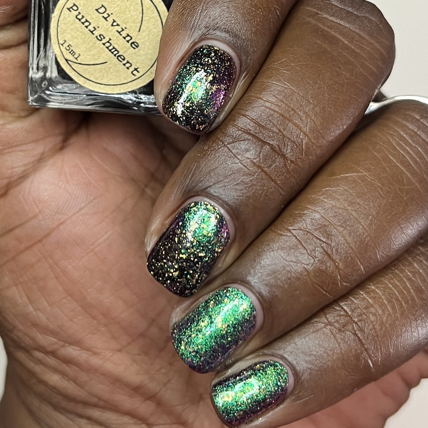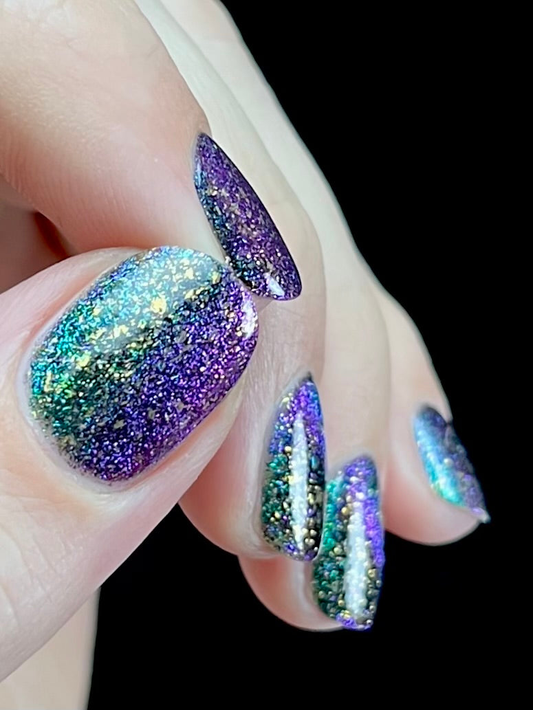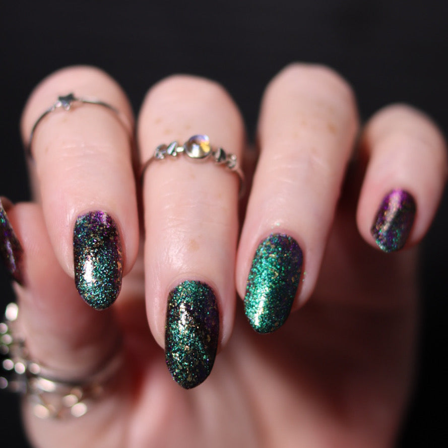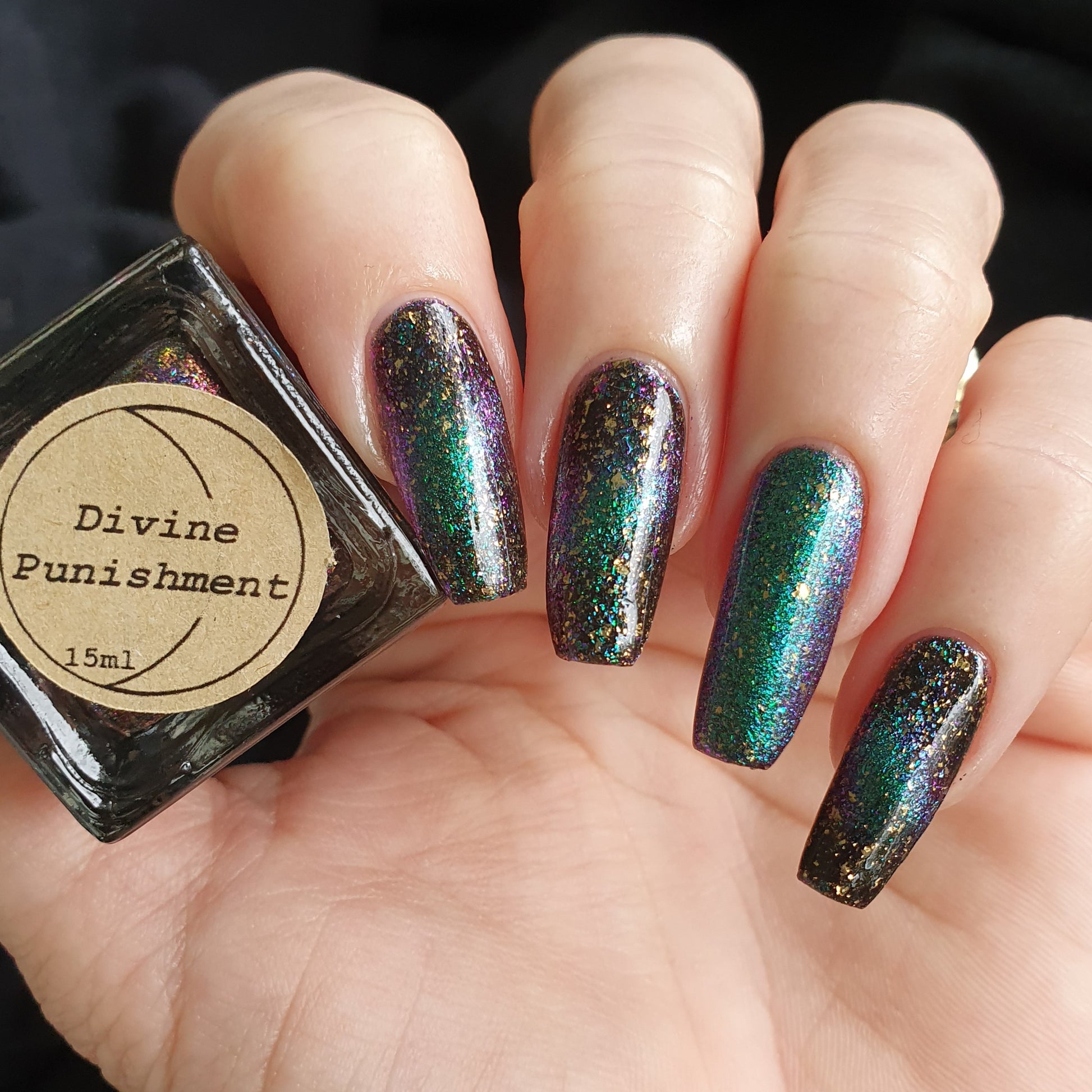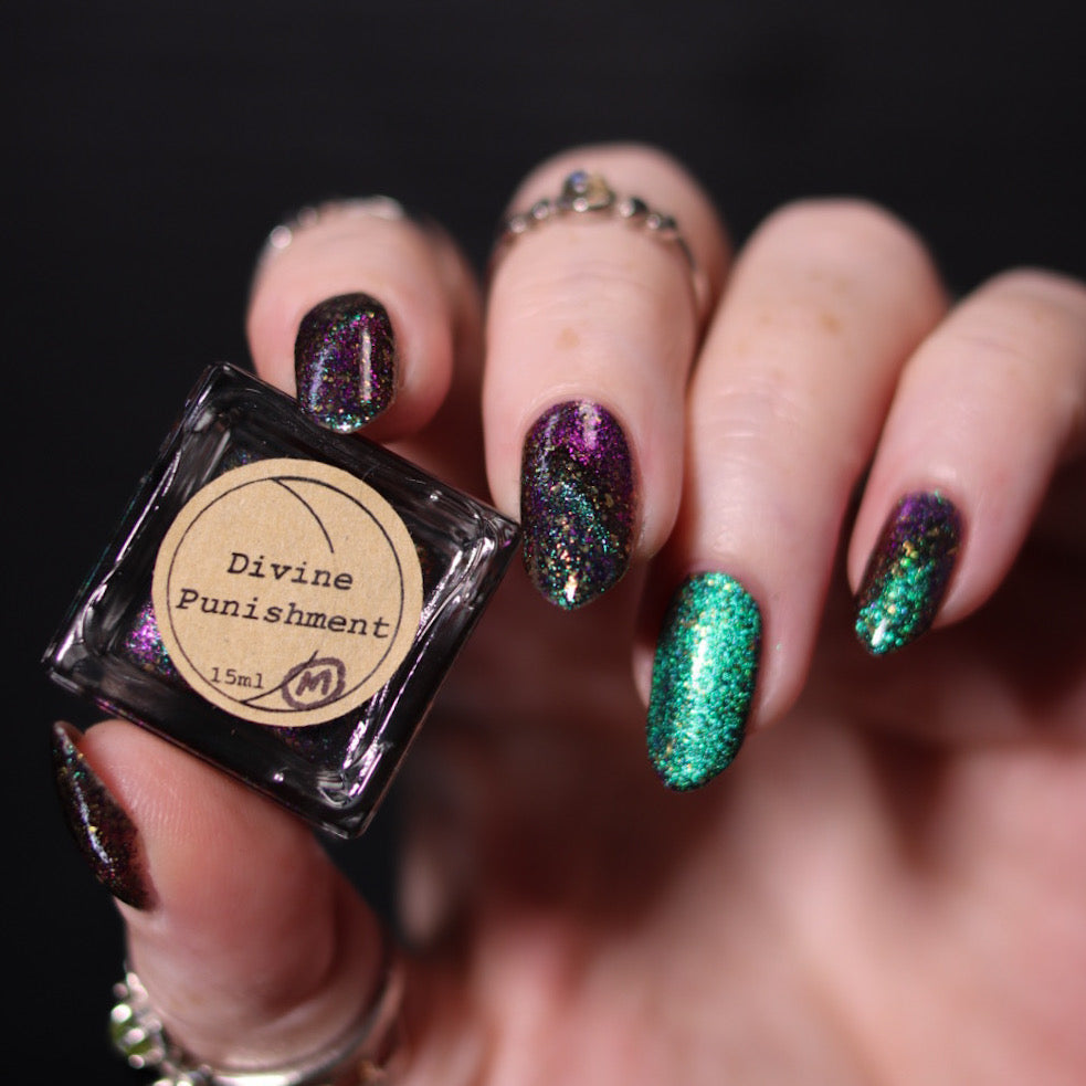 Divine Punishment has a black jelly base with green & purple magnetic shimmer and gold metallic flakes. The larger particle size of the magnetic shimmer creates stunning shifts from green to purple regardless of magnetizing technique!