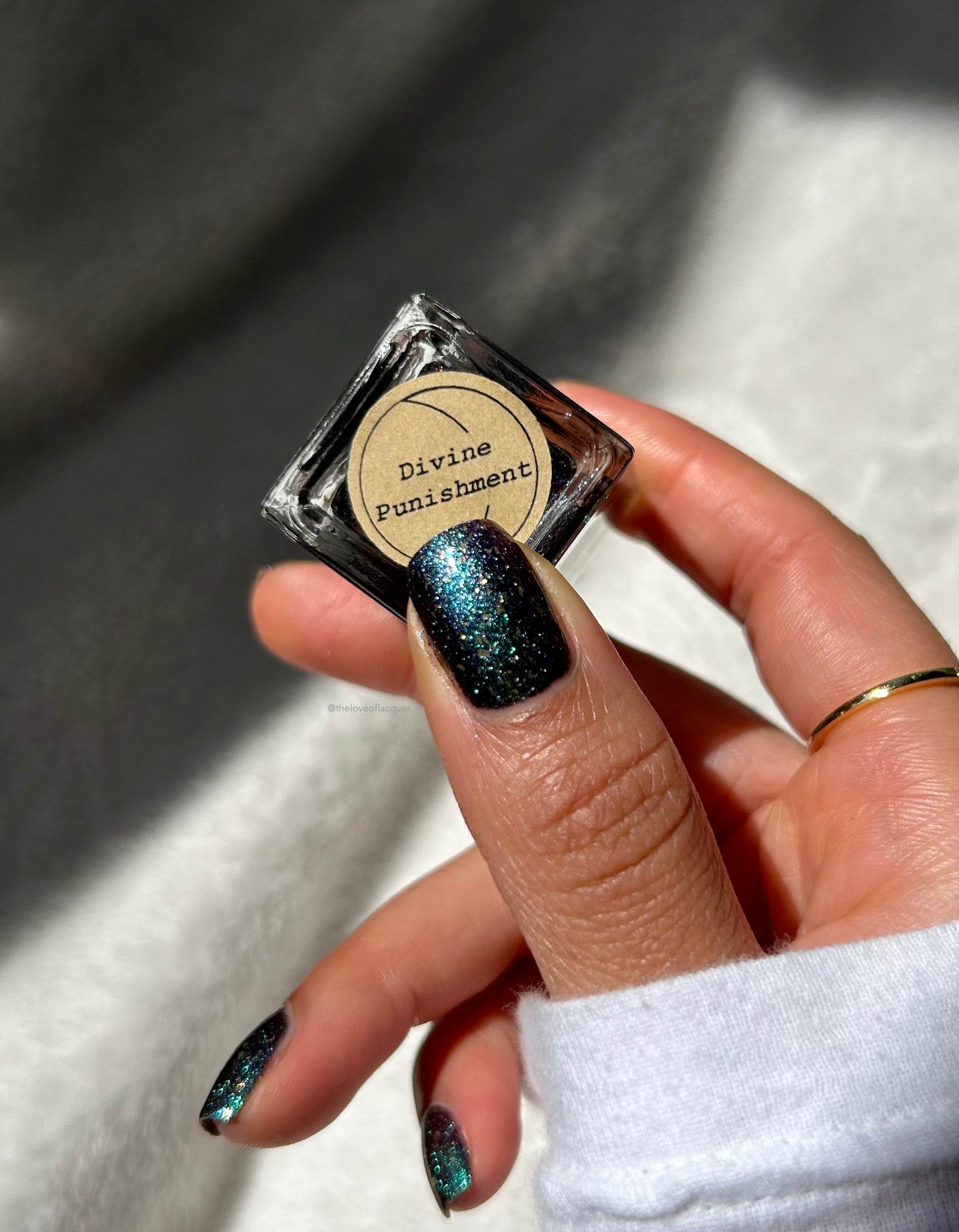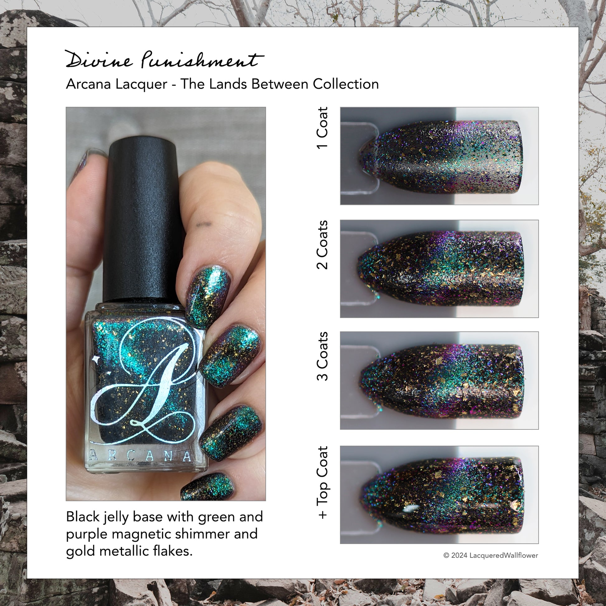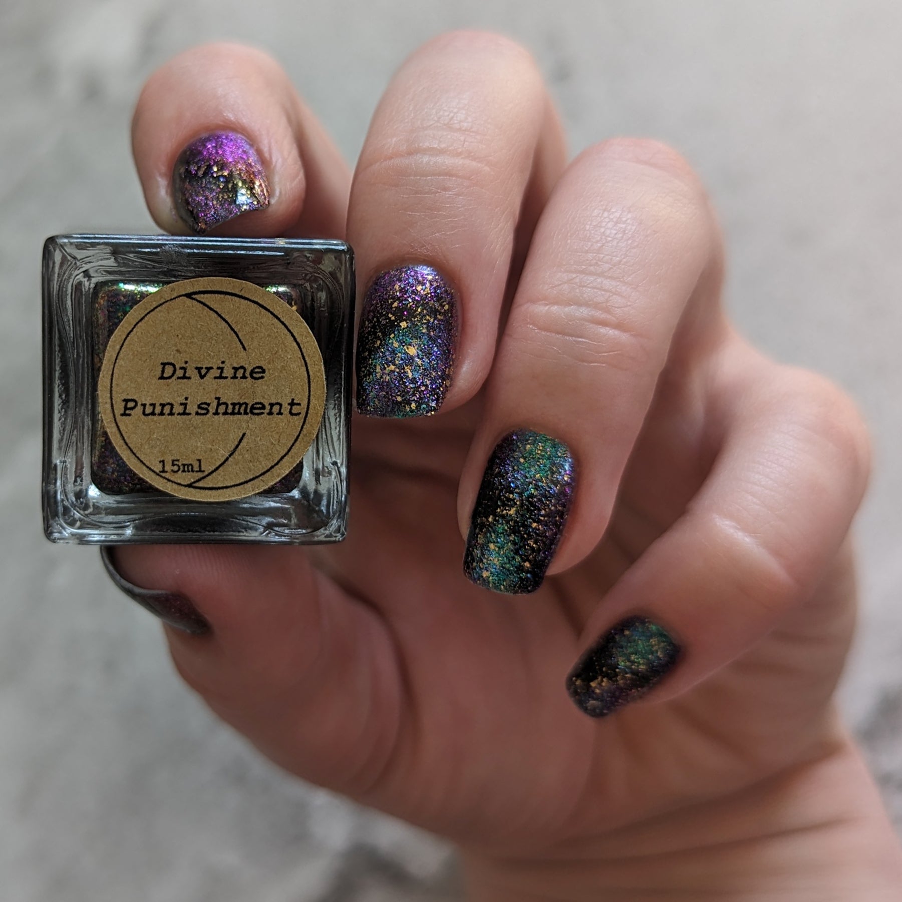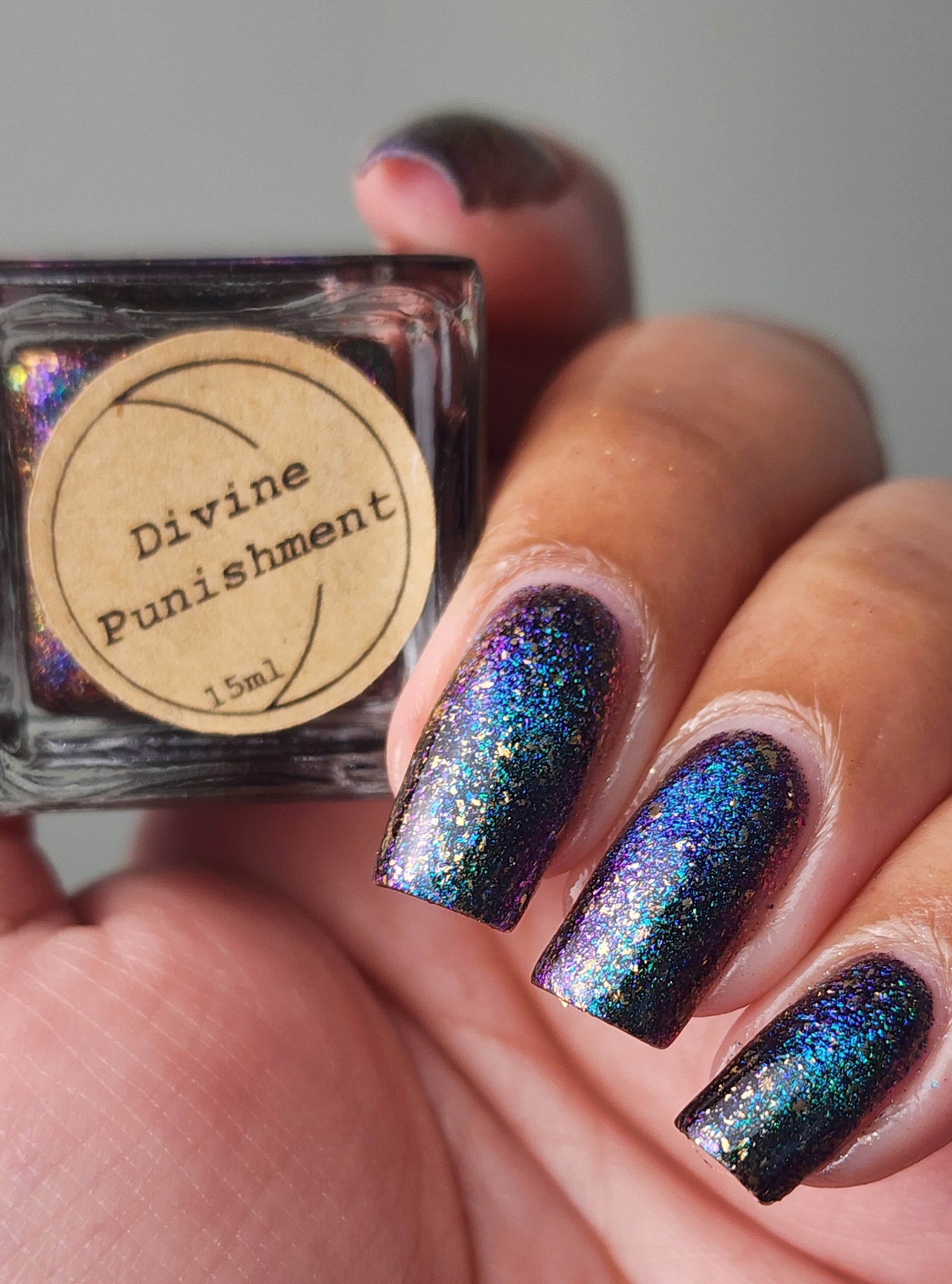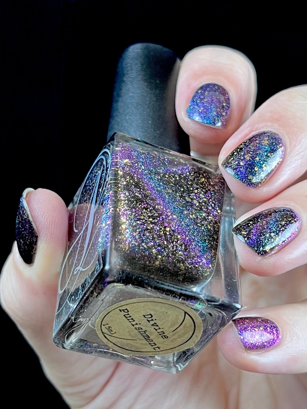 Divine Punishment has a black jelly base with green & purple magnetic shimmer and gold metallic flakes. The larger particle size of the magnetic shimmer creates stunning shifts from green to purple regardless of magnetizing technique!